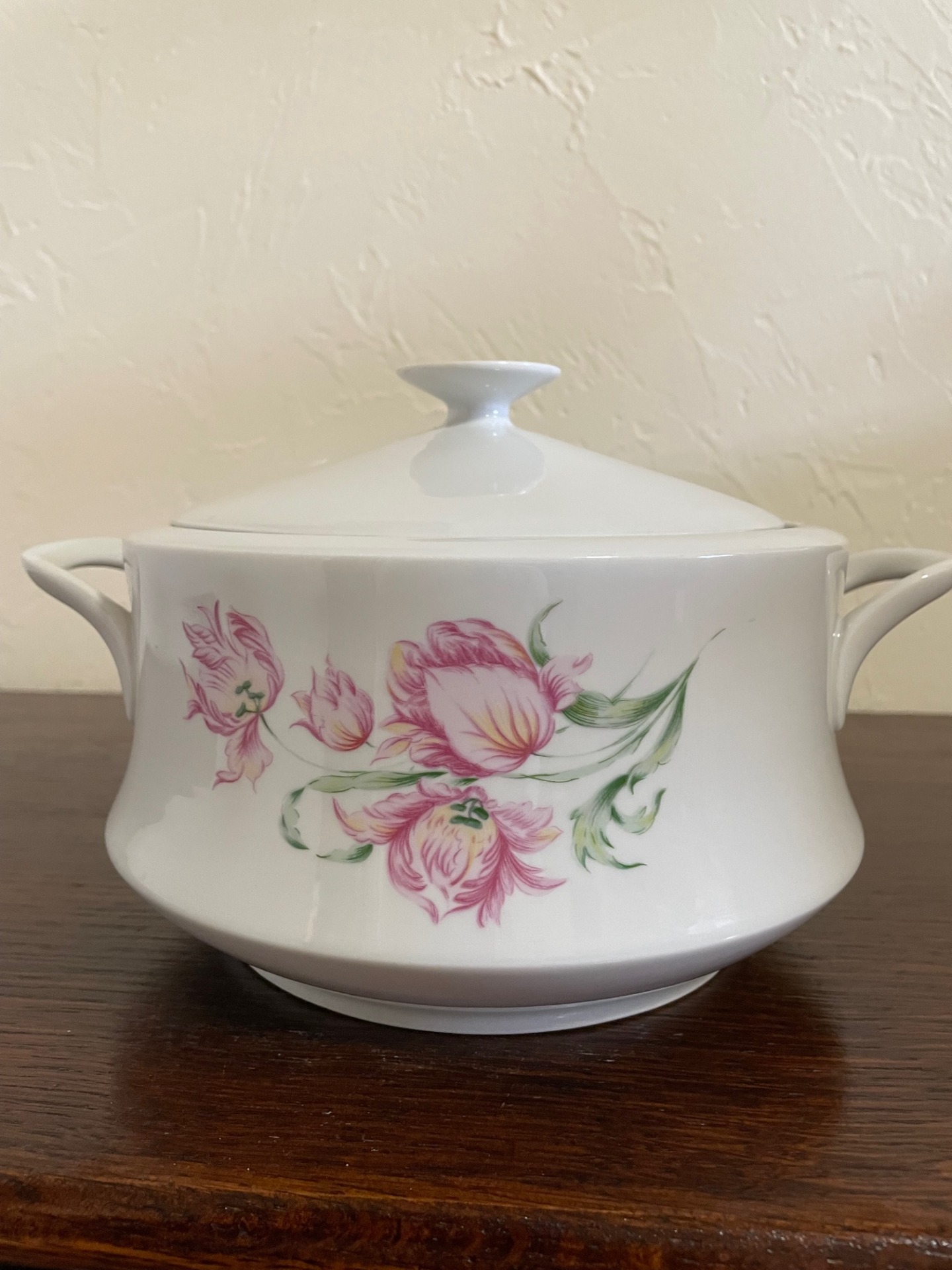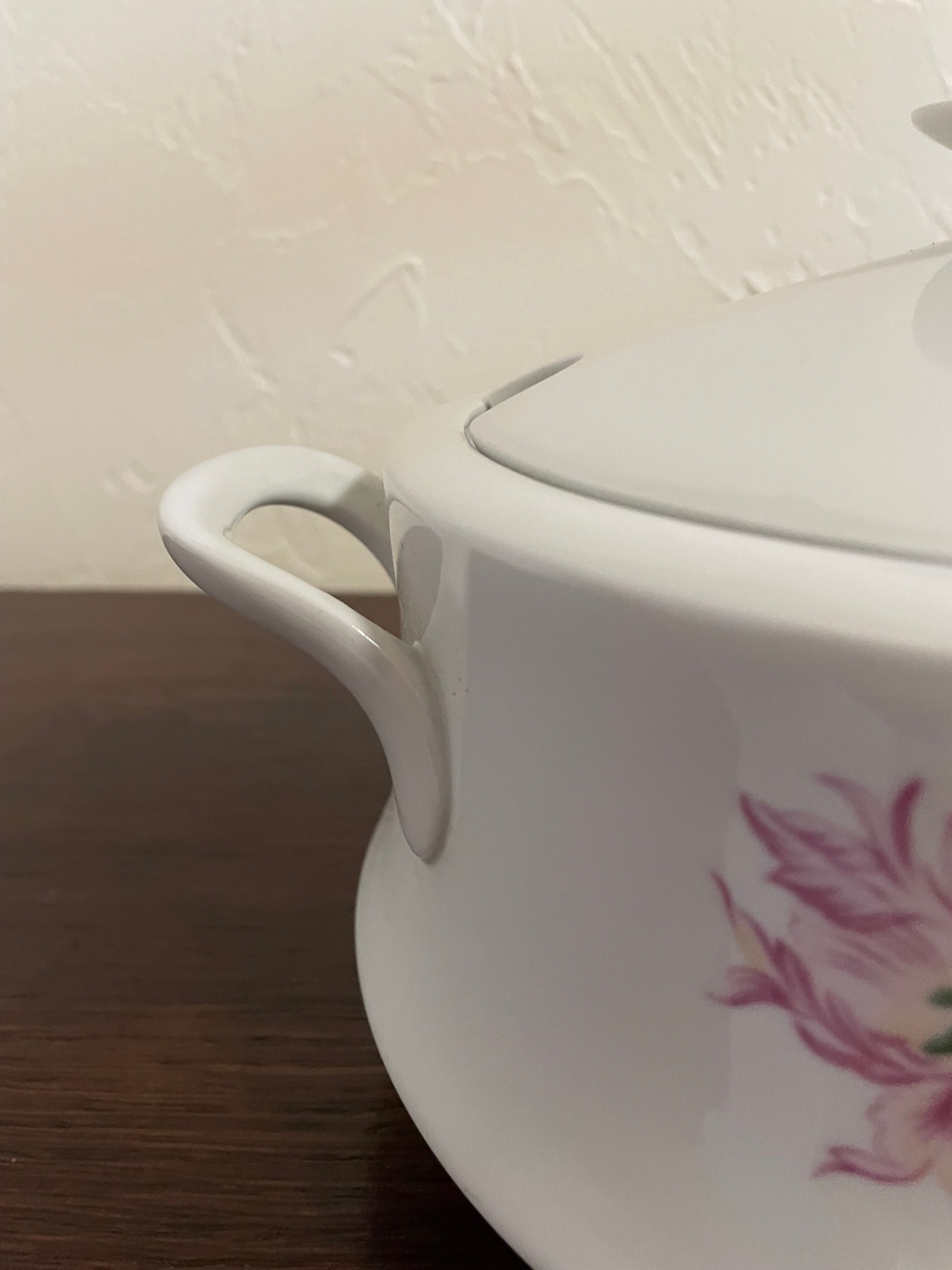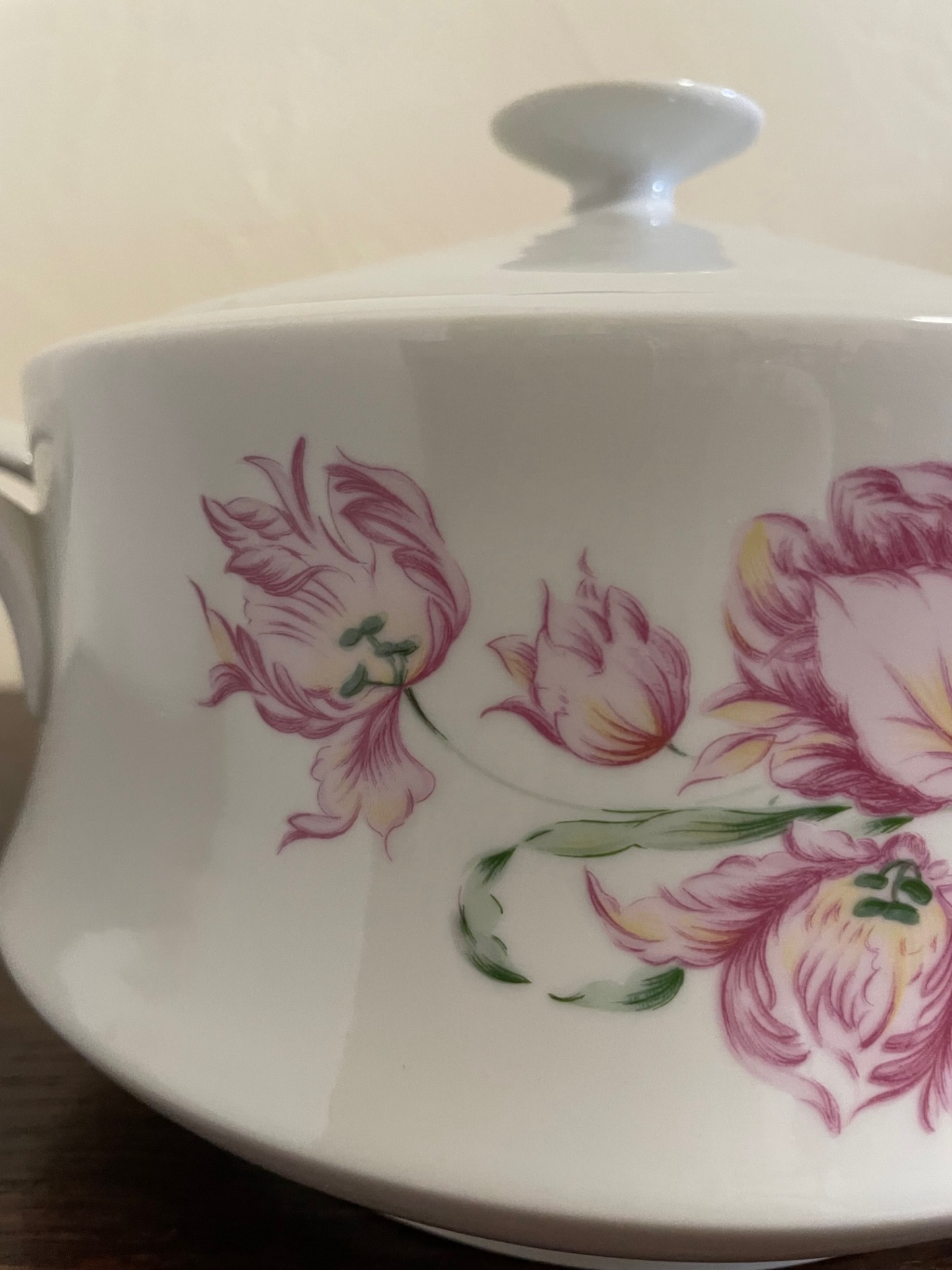 Mályvaszínű virágokkal díszített levesestál, fedővel az Alföldi Porcelángyárból.