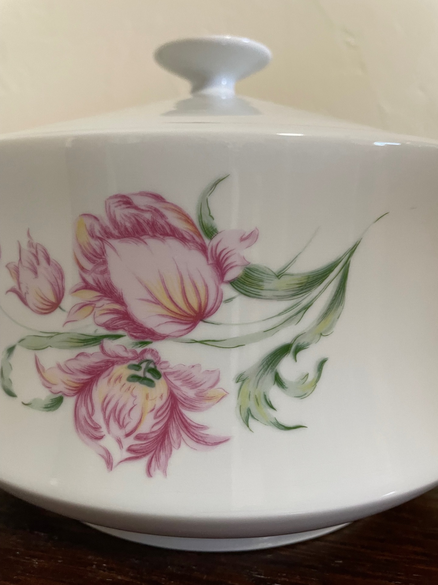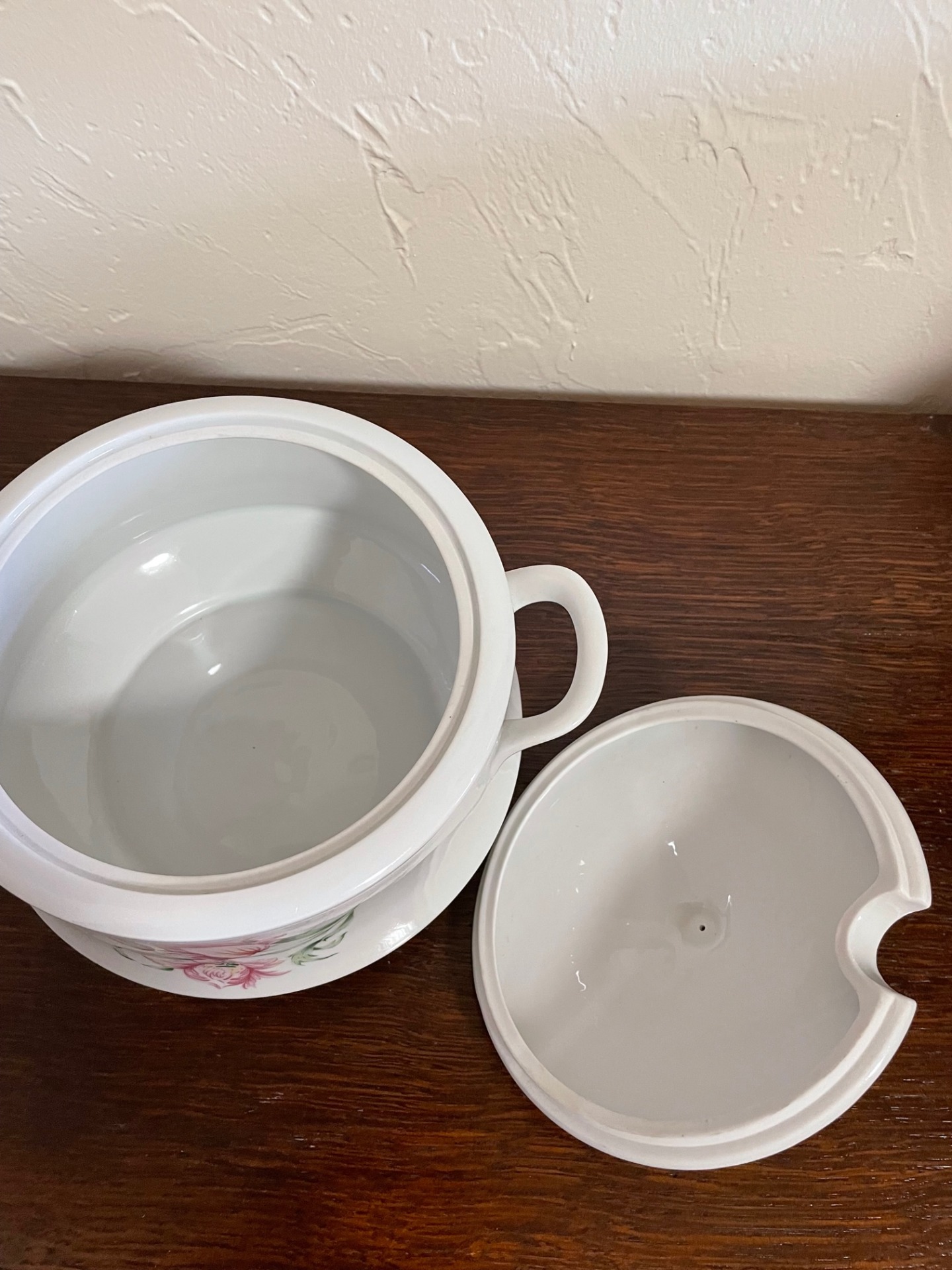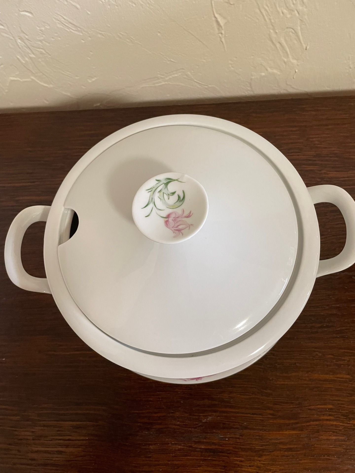 Mályvaszínű virágokkal díszített levesestál, fedővel az Alföldi Porcelángyárból.