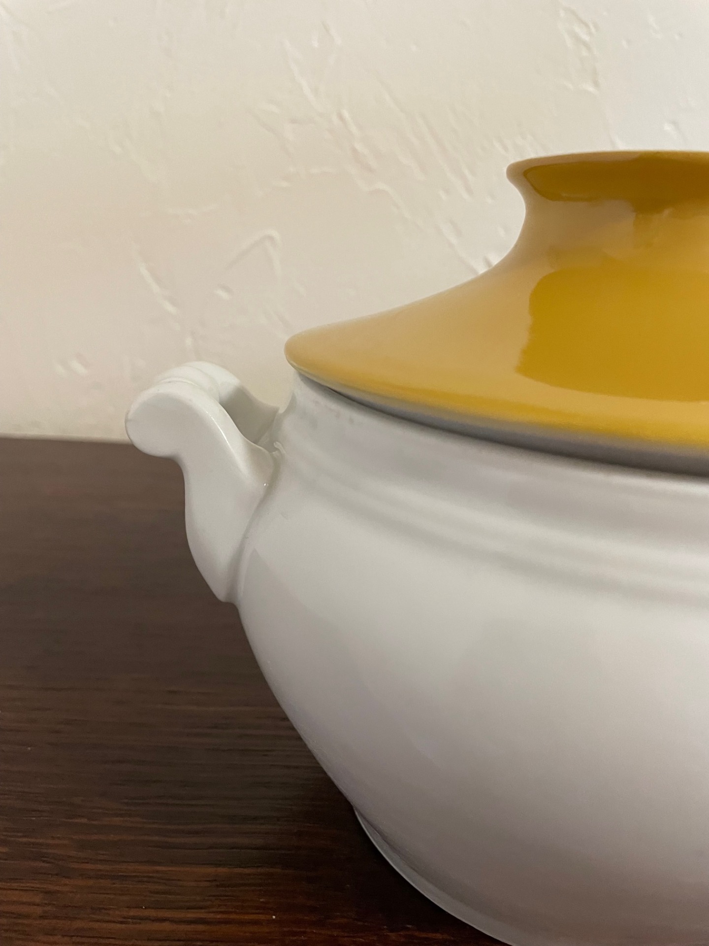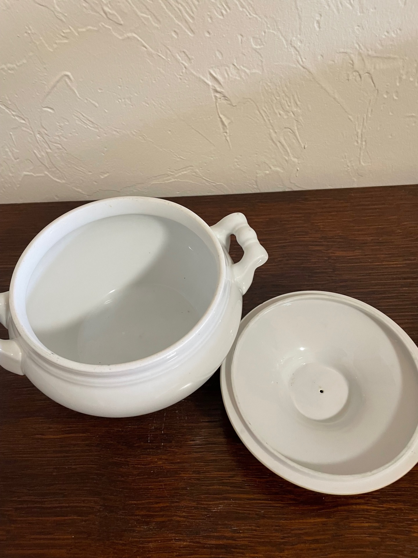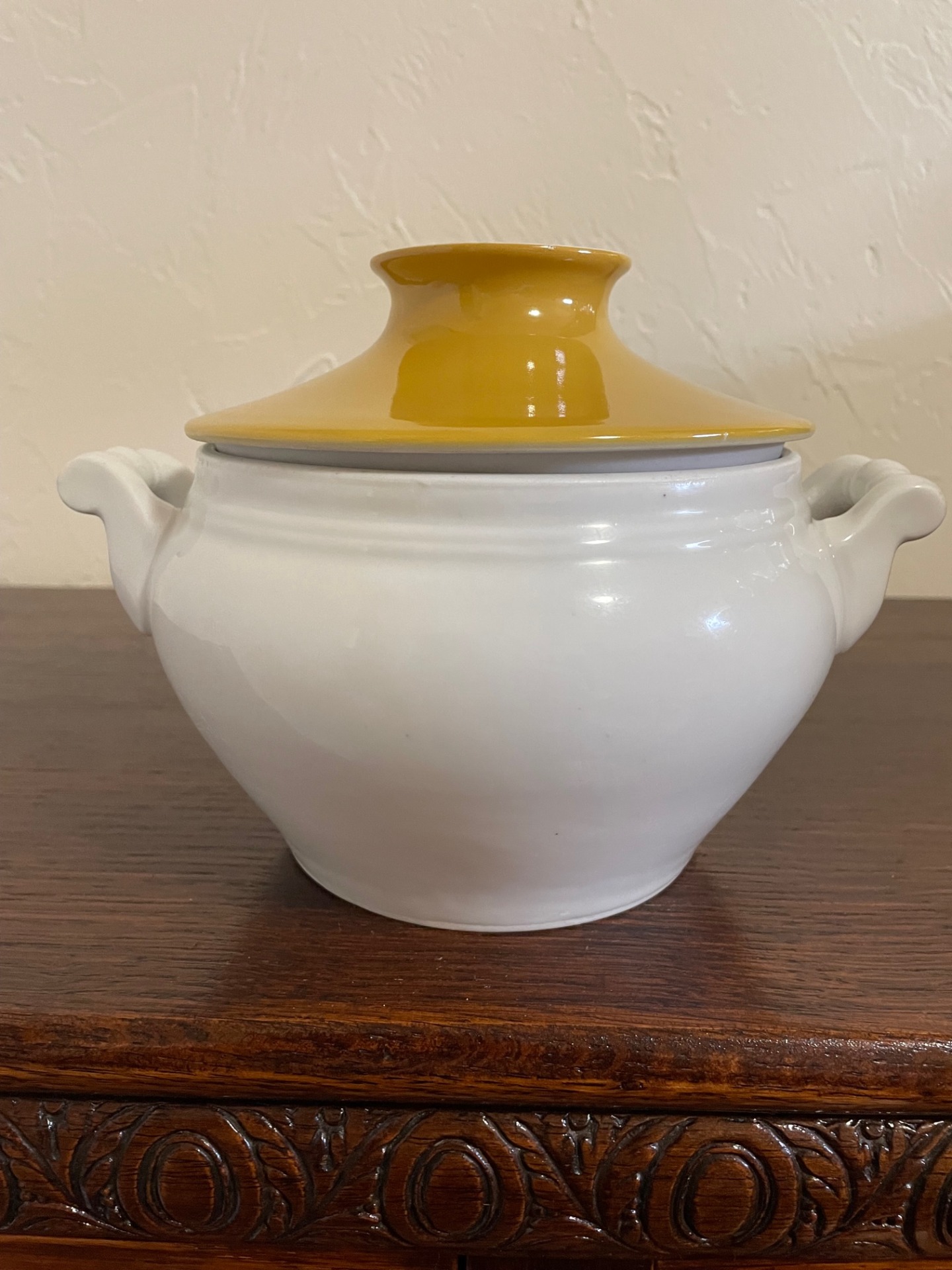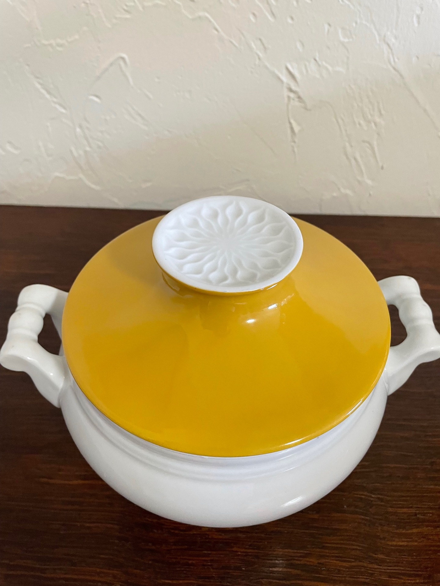 A fedele fölső része önmagában mintás. Hófehér tál, barna-fehér fedővel.