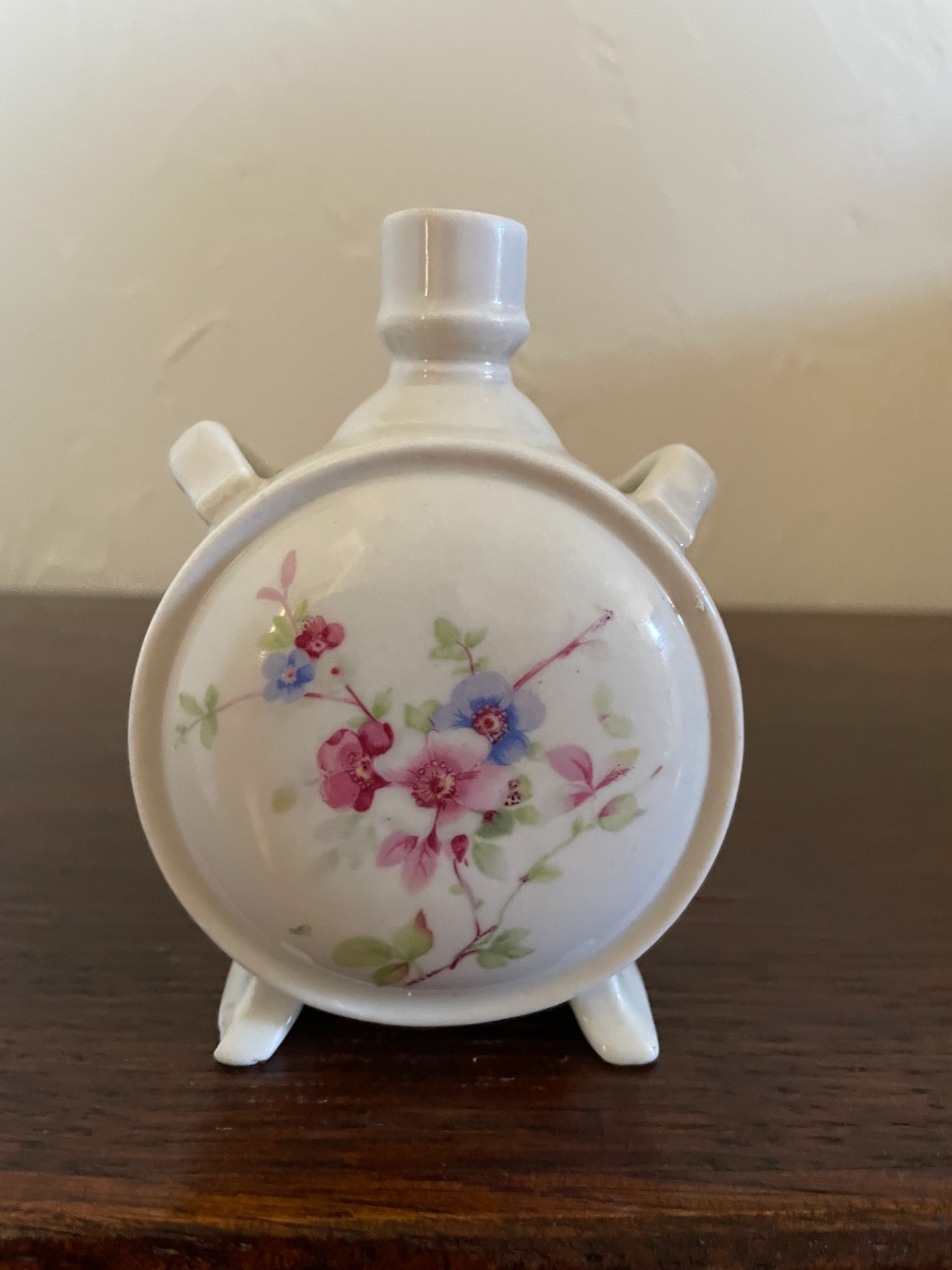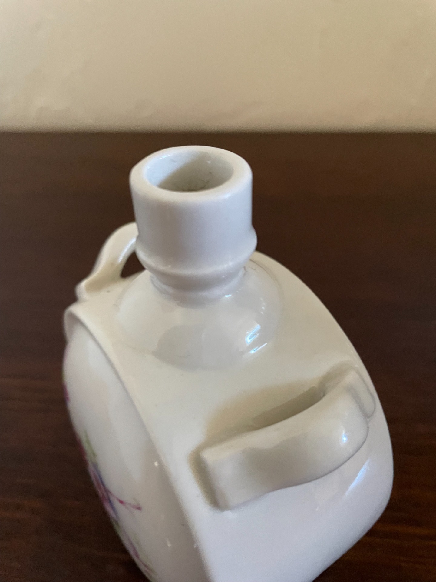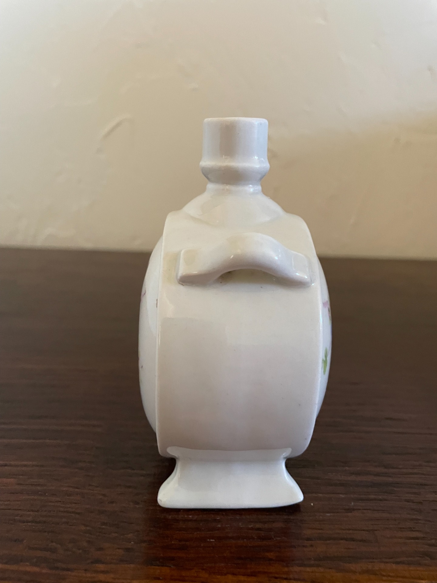 Nemesen egyszerű, fehérségében is gyönyörű, halvány barackvirágokkal díszített Zsolnay díszbutella.