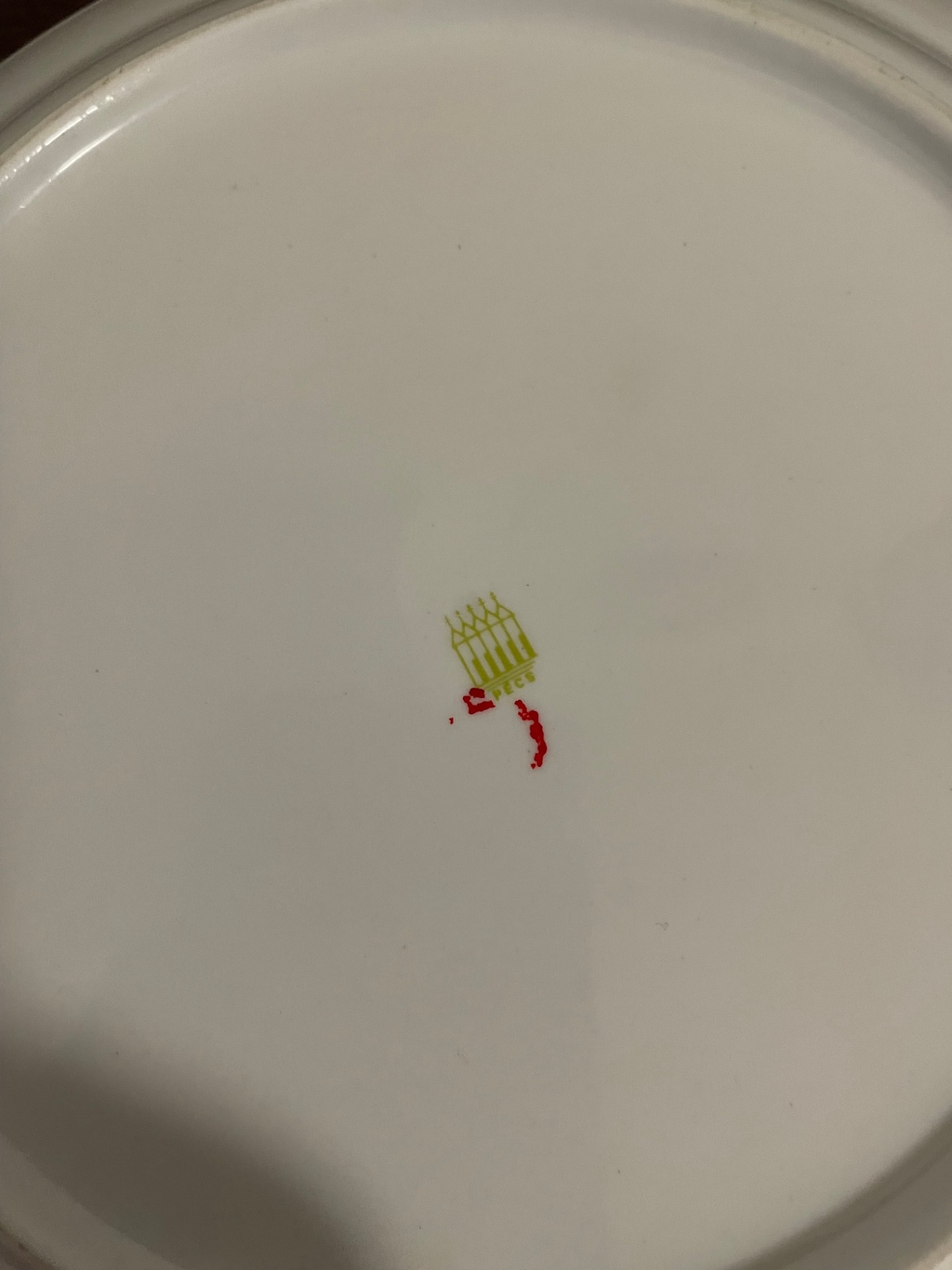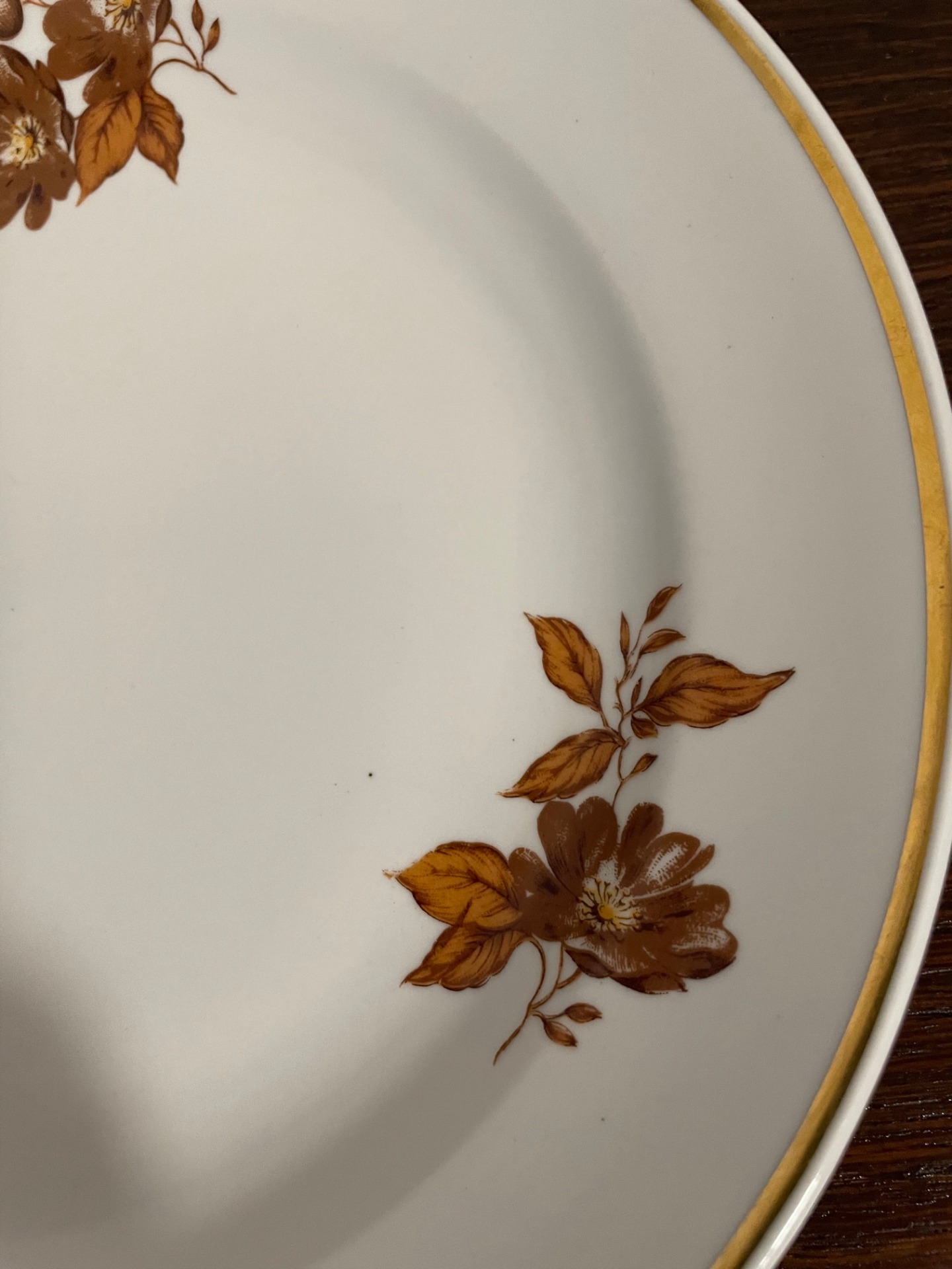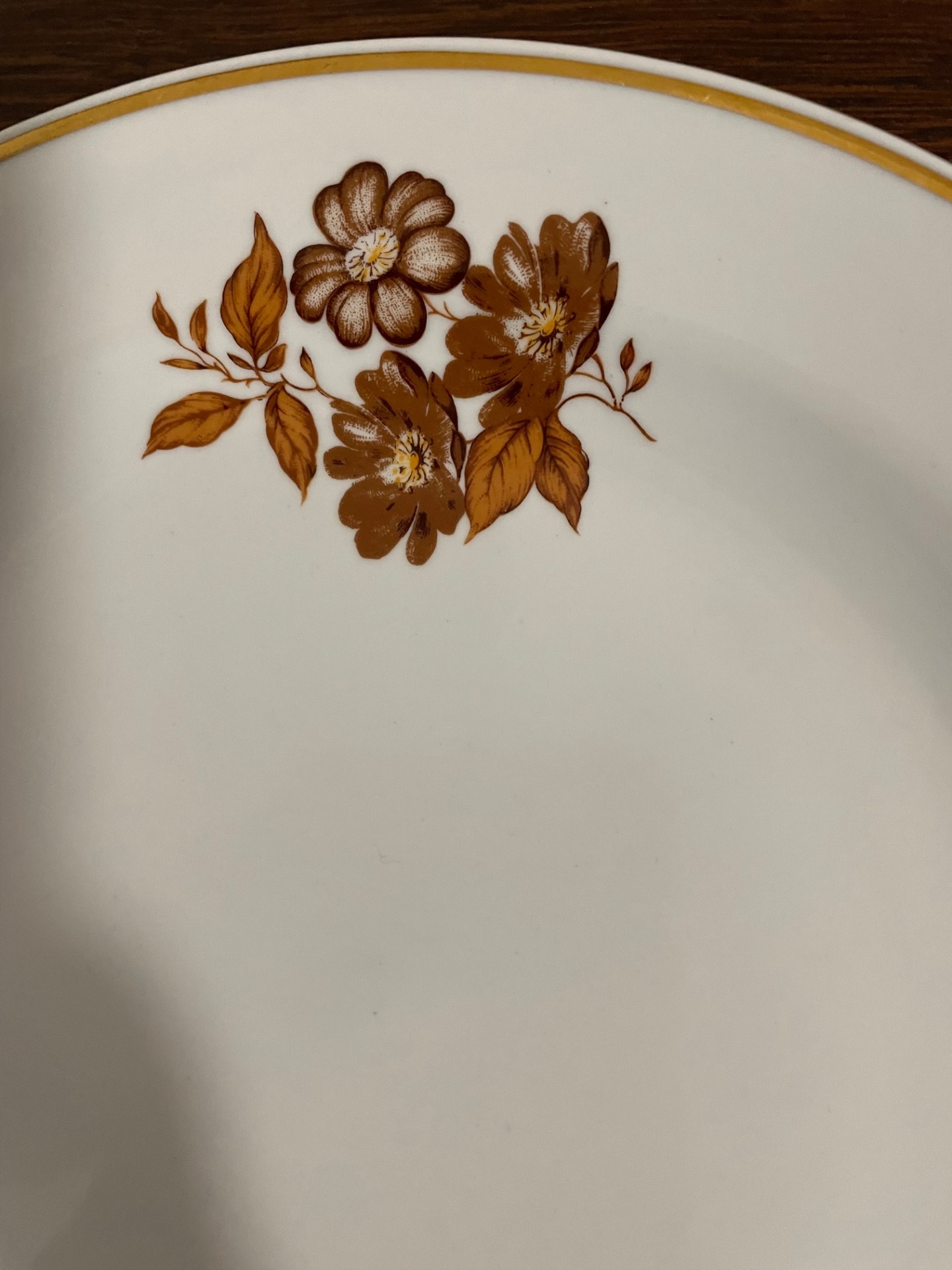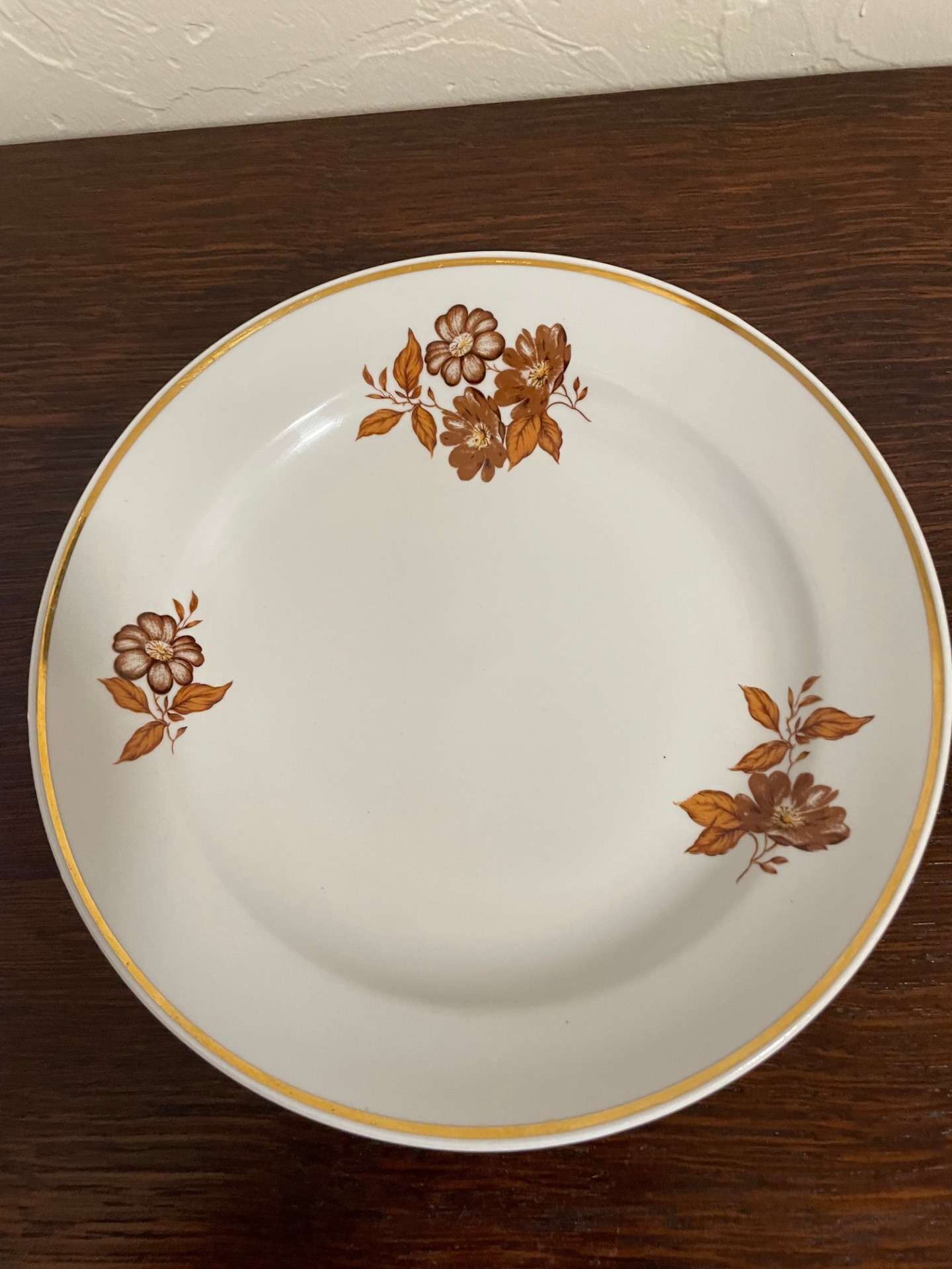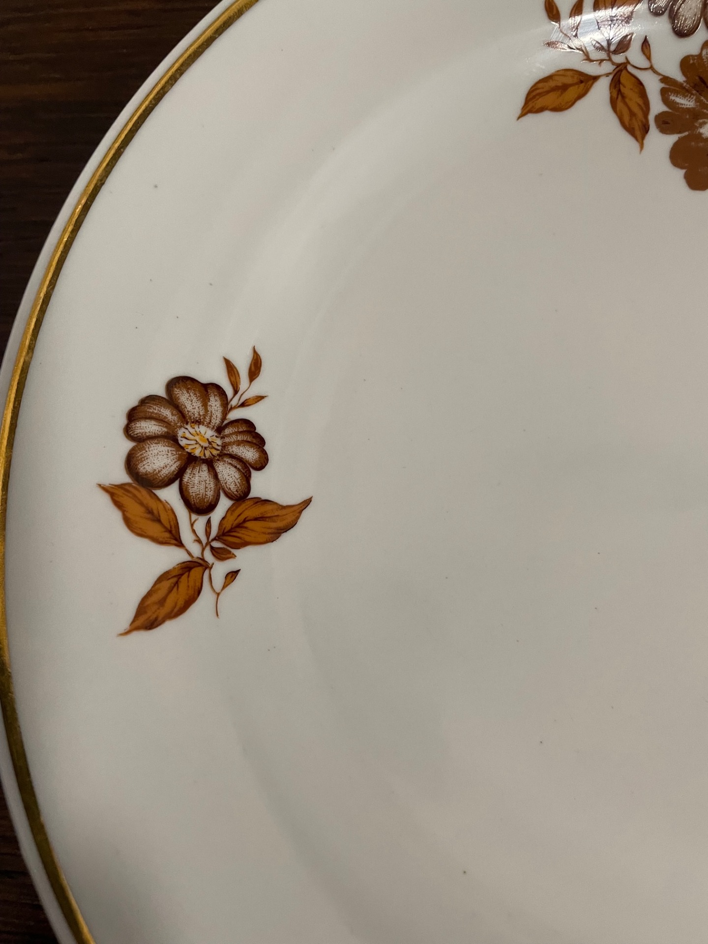 Barna virágos, peremén barna dekorcsíkkal ellátott Zsolnay tányér.