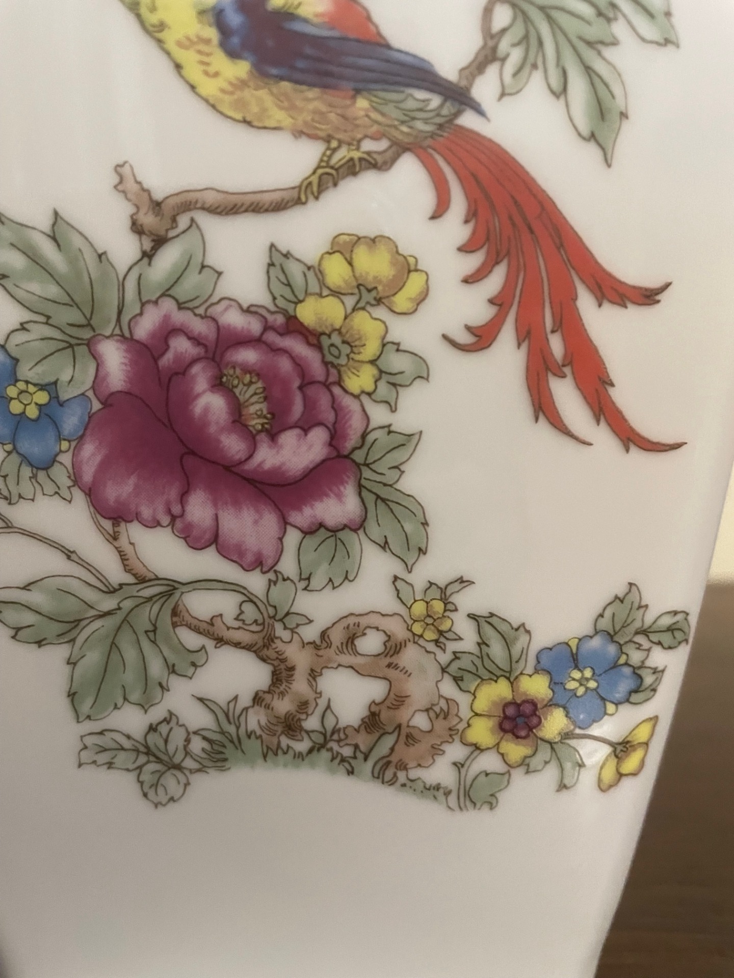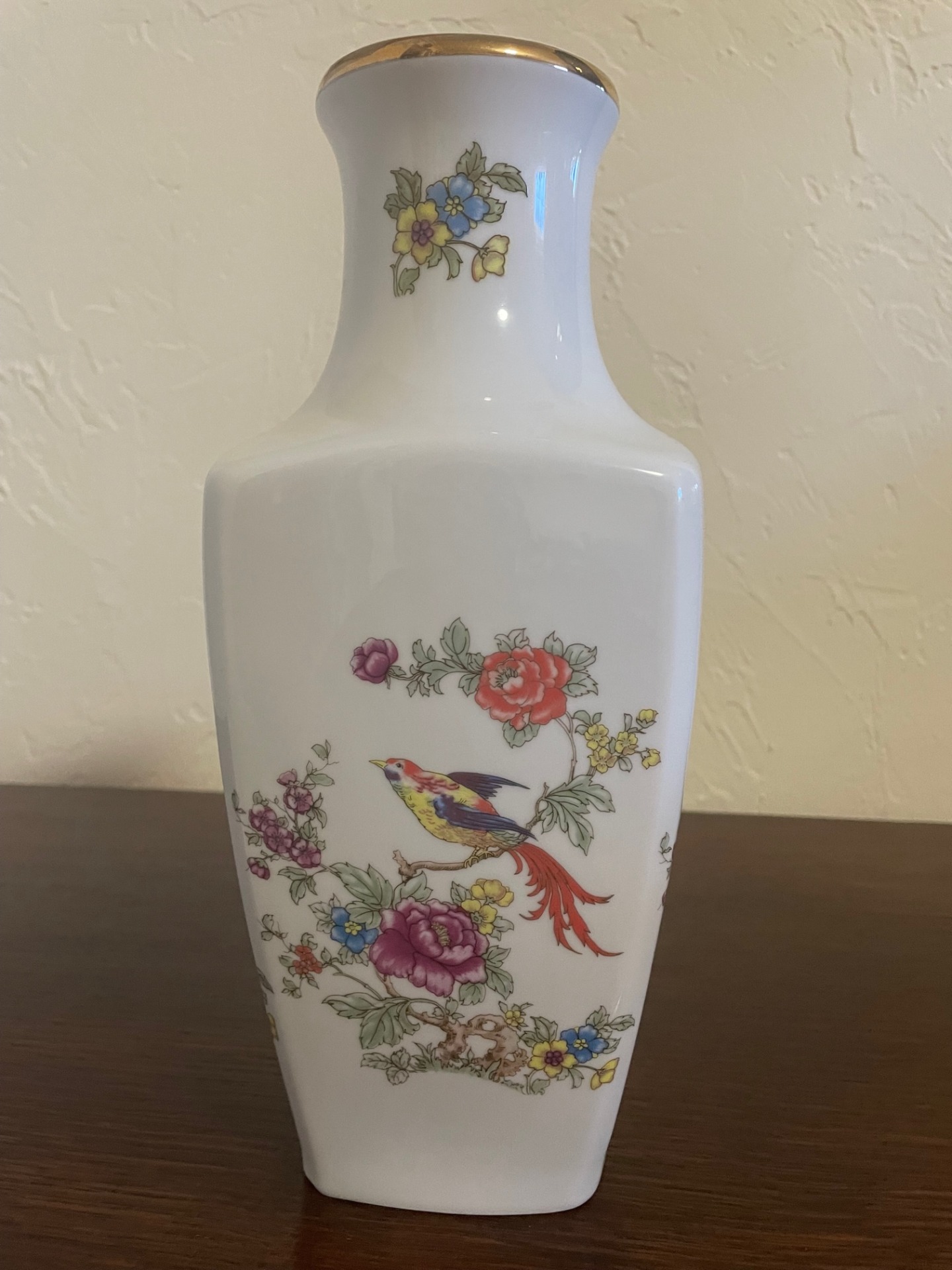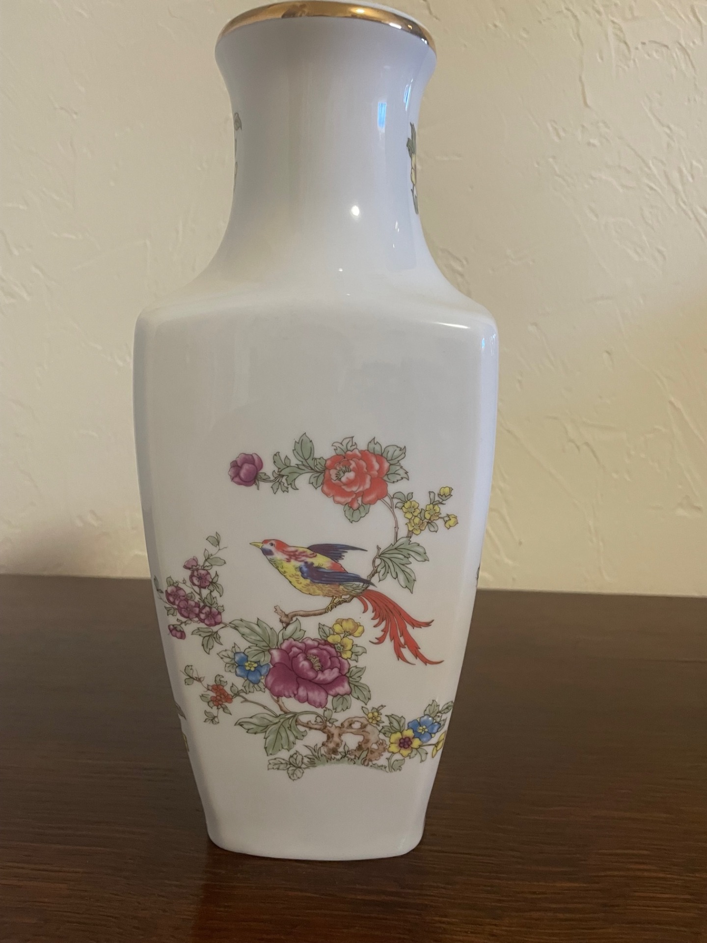 Birds an Flowers kollekció nagy, kocka hasú vázája, Hollóházáról. Díszítése: 21 karátos, vastag aranyszegély a váza szájánál.