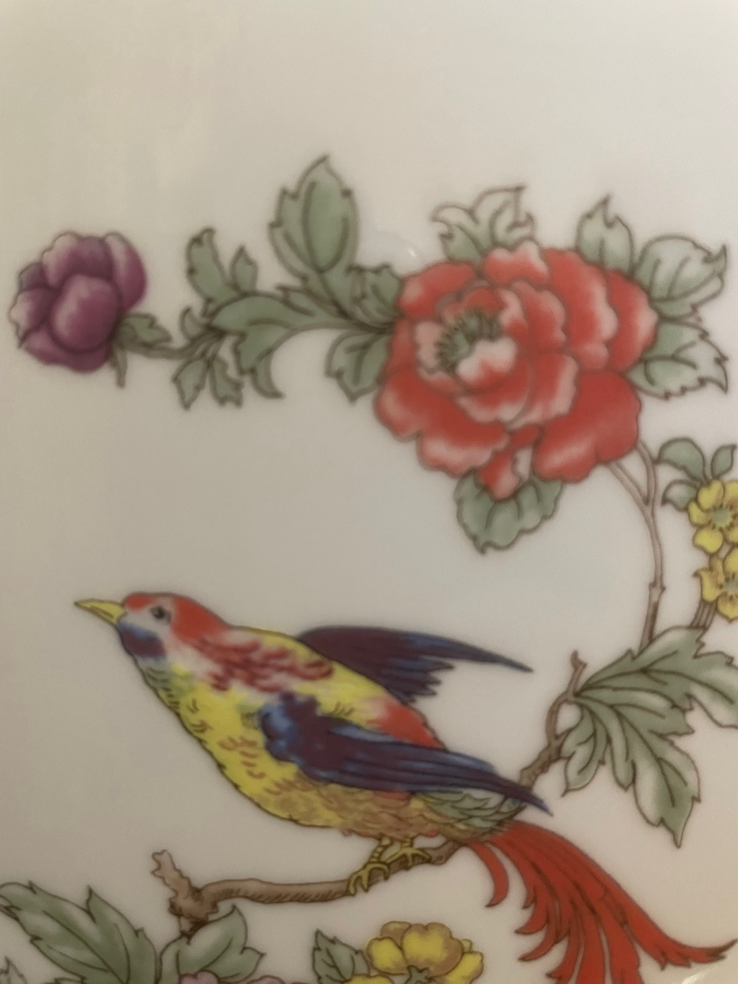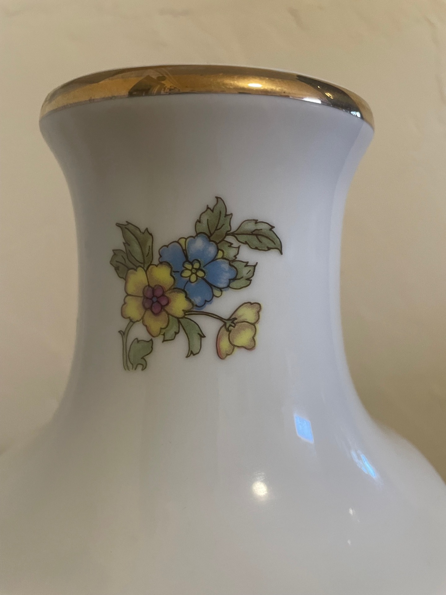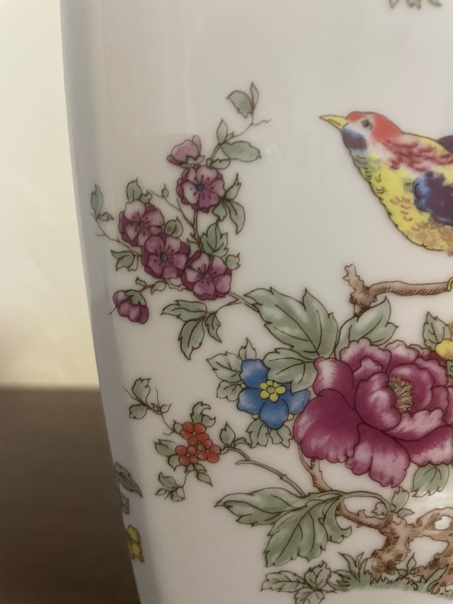 Birds an Flowers kollekció nagy, kocka hasú vázája, Hollóházáról. Díszítése: 21 karátos, vastag aranyszegély a váza szájánál.
