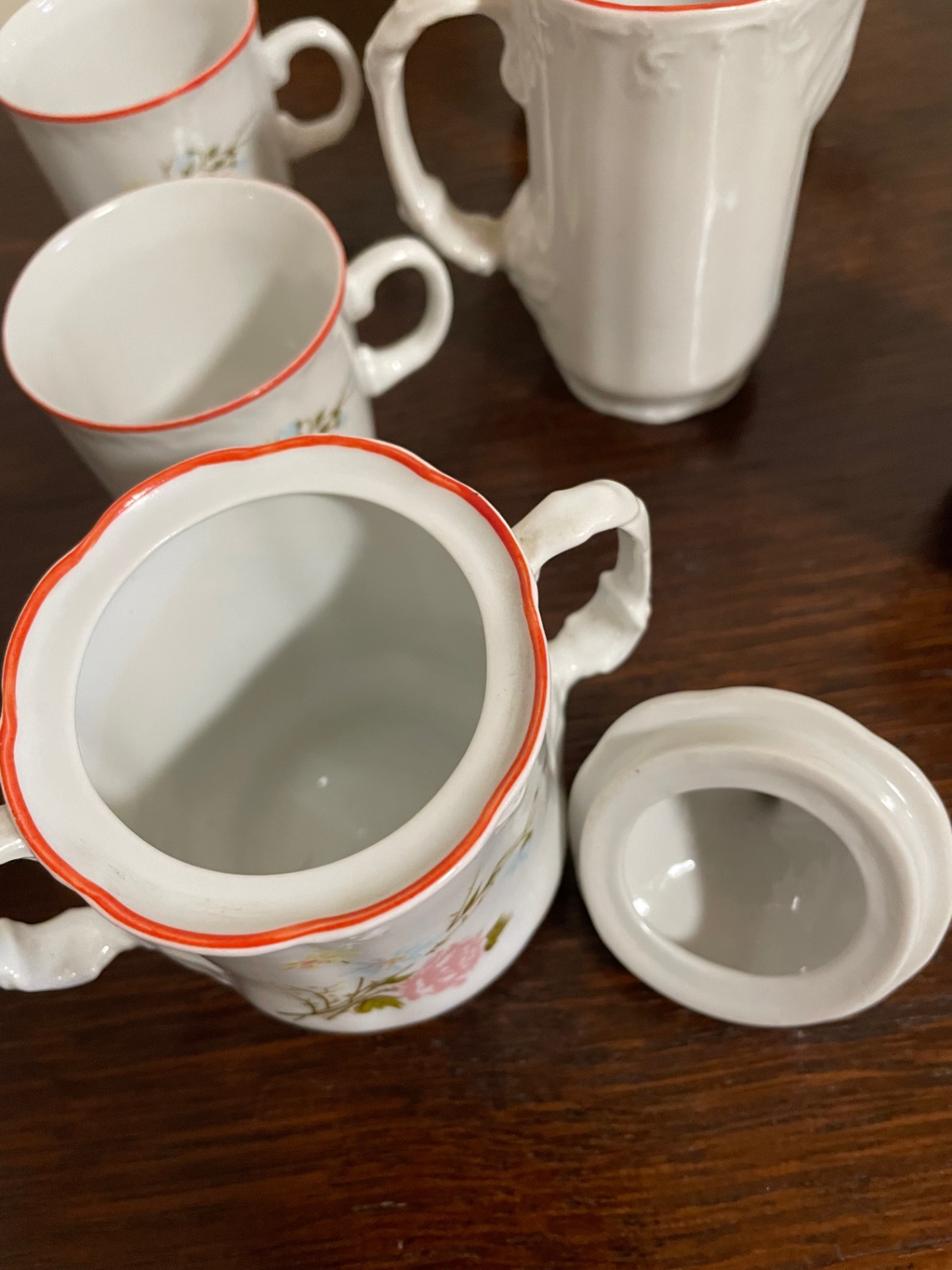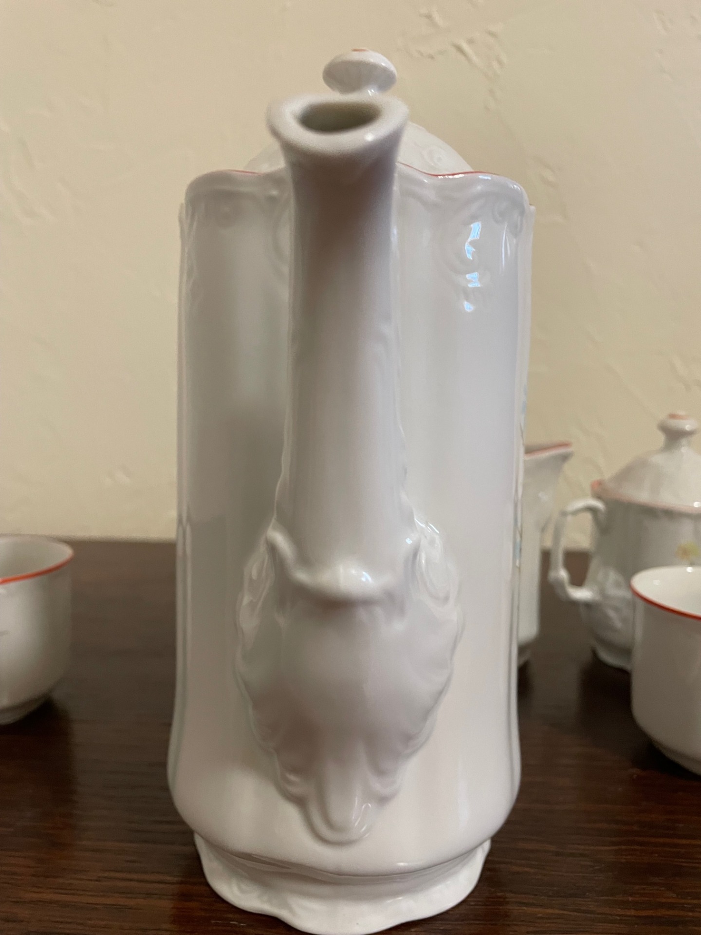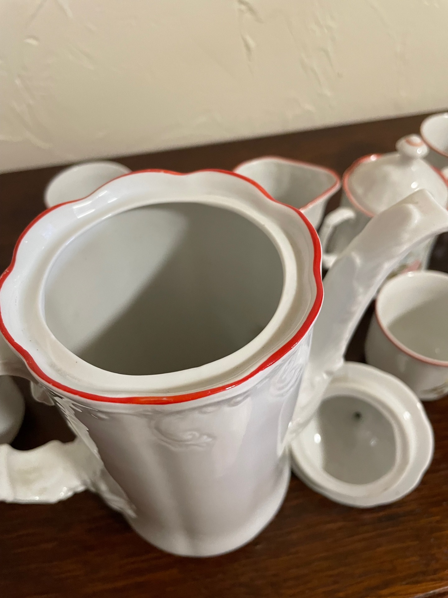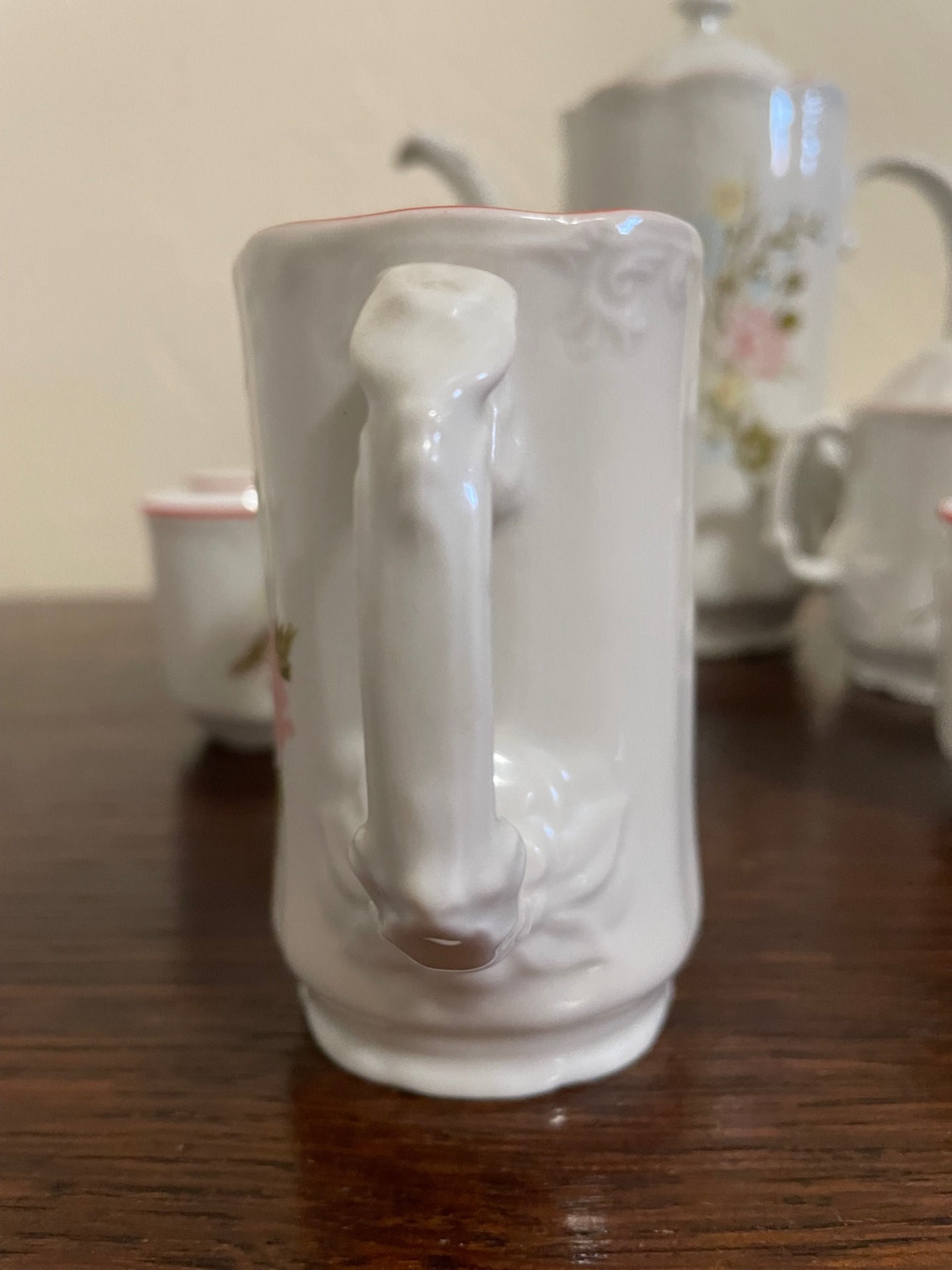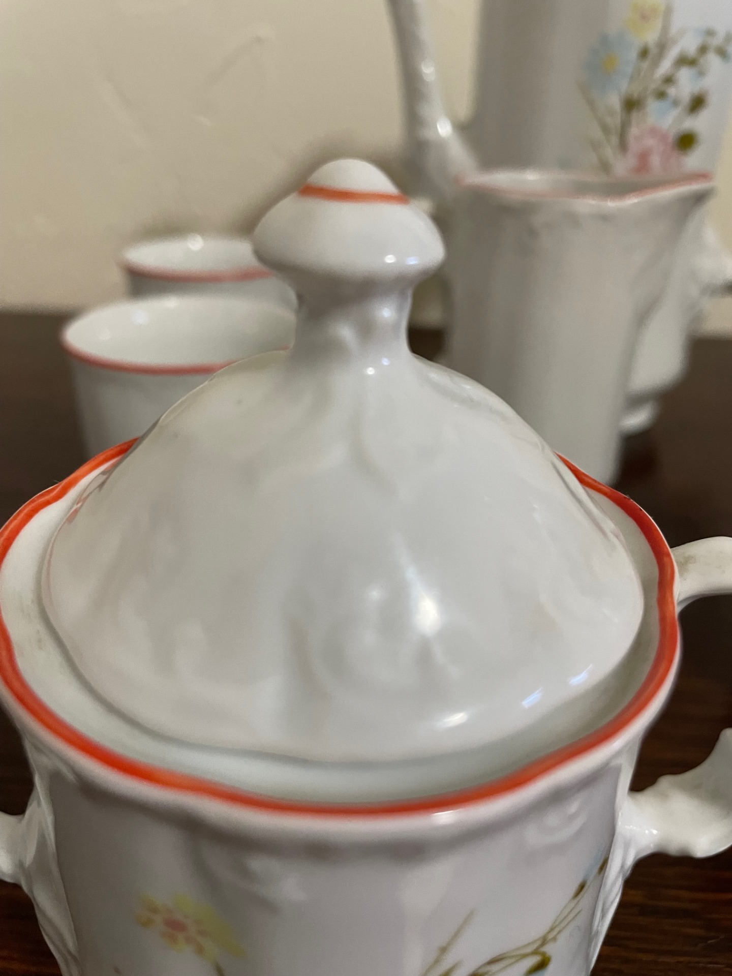 Braz and Braz kávéskészlet, hihetetlen részletek-beli megoldásokkal. A fotókon jól kivehető, hogyan fonódnak egymásba a különféle részek a testekkel. Nemcsak önmagában mintás, hanem külön virágmotívumot is megcsodálhatunk rajta.