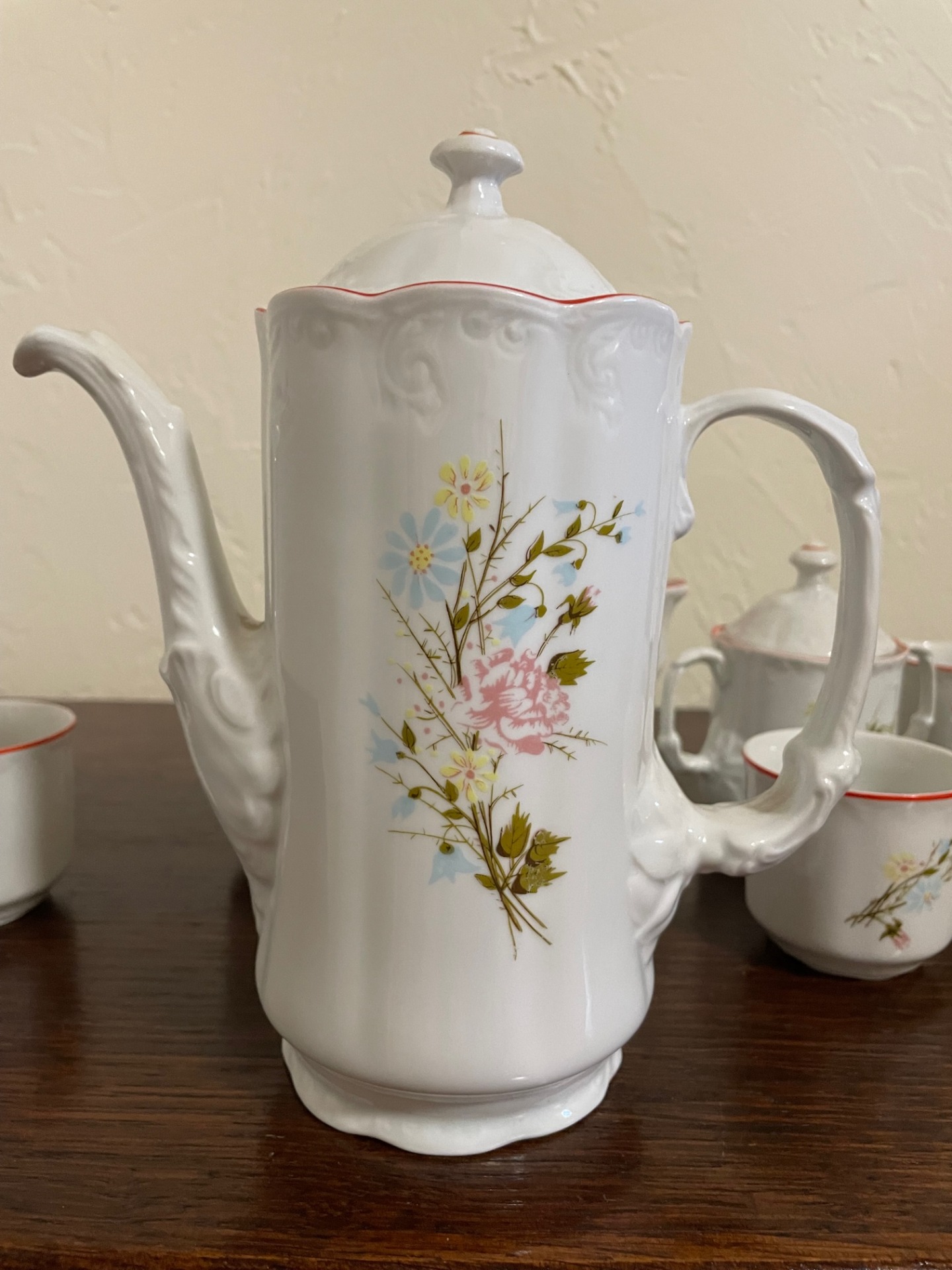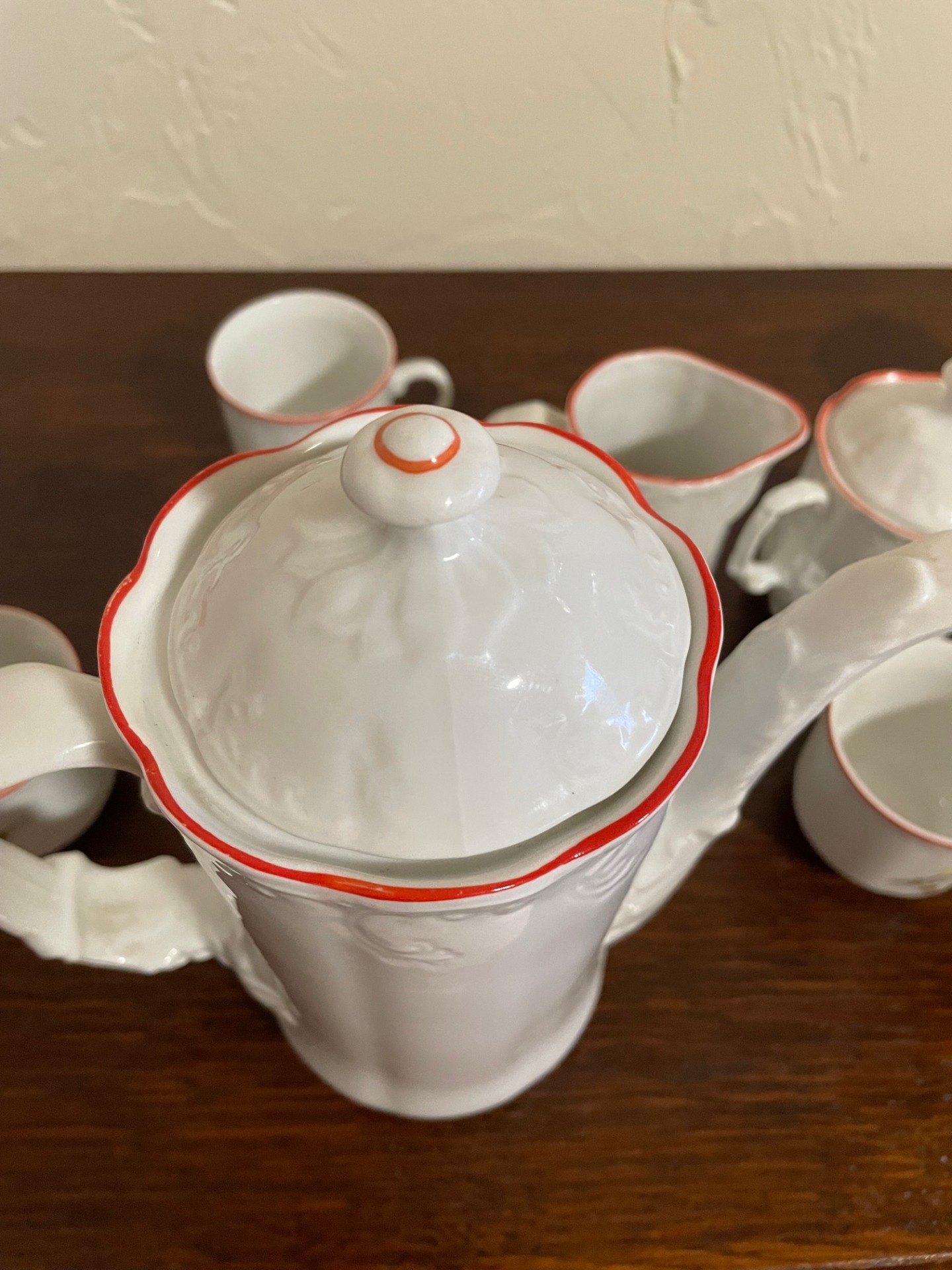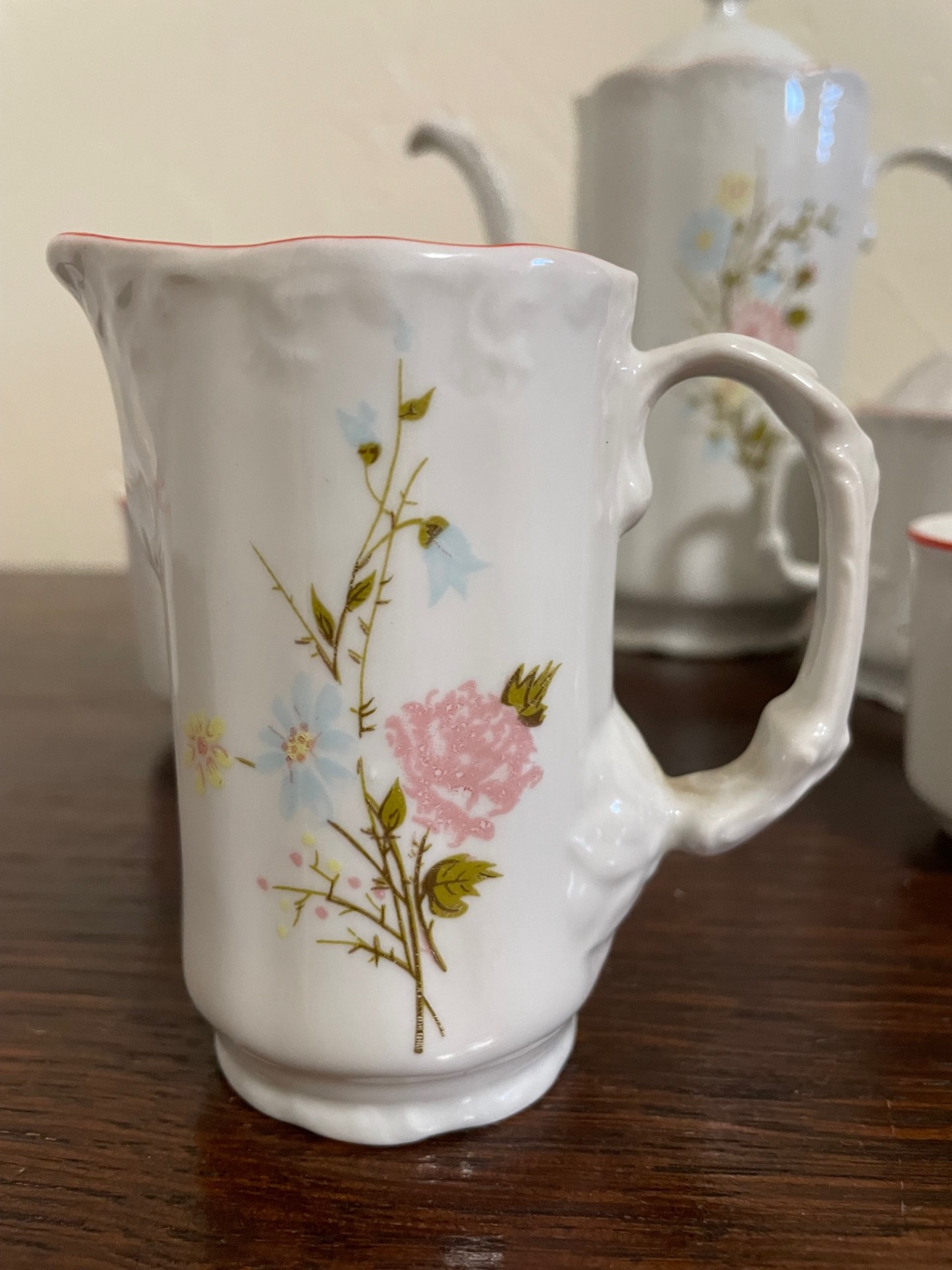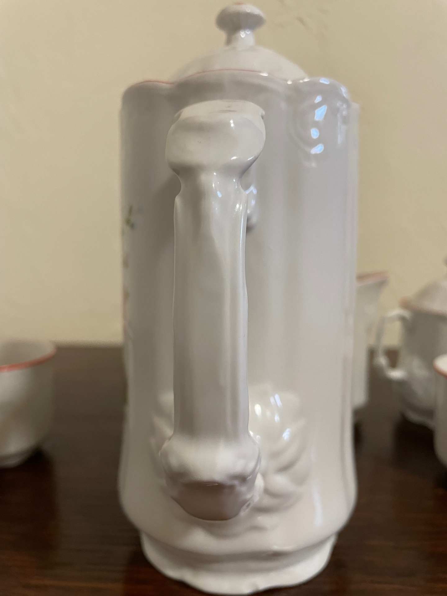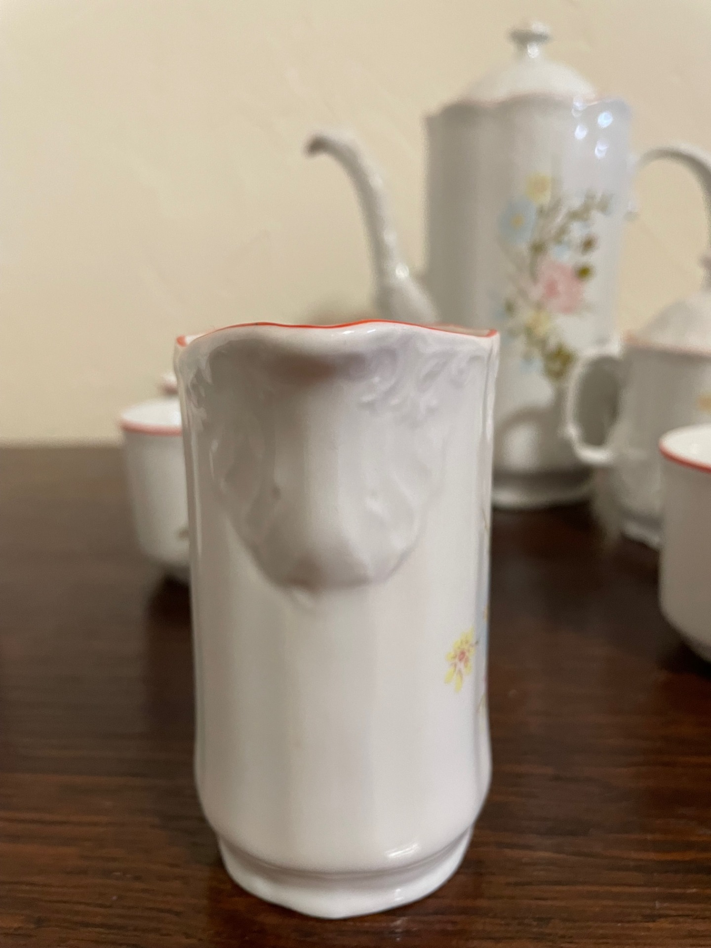 Braz and Braz kávéskészlet, hihetetlen részletek-beli megoldásokkal. A fotókon jól kivehető, hogyan fonódnak egymásba a különféle részek a testekkel. Nemcsak önmagában mintás, hanem külön virágmotívumot is megcsodálhatunk rajta.