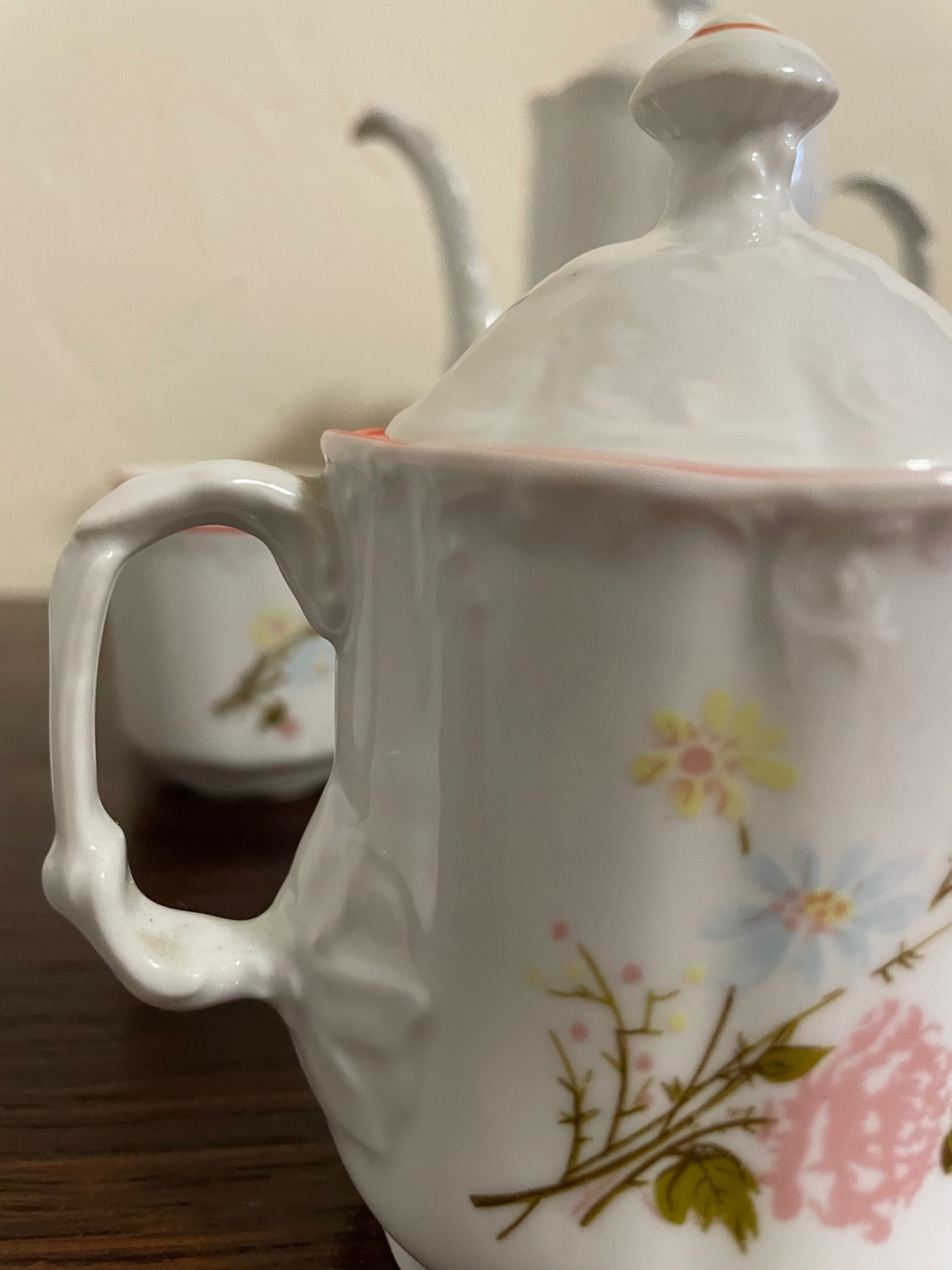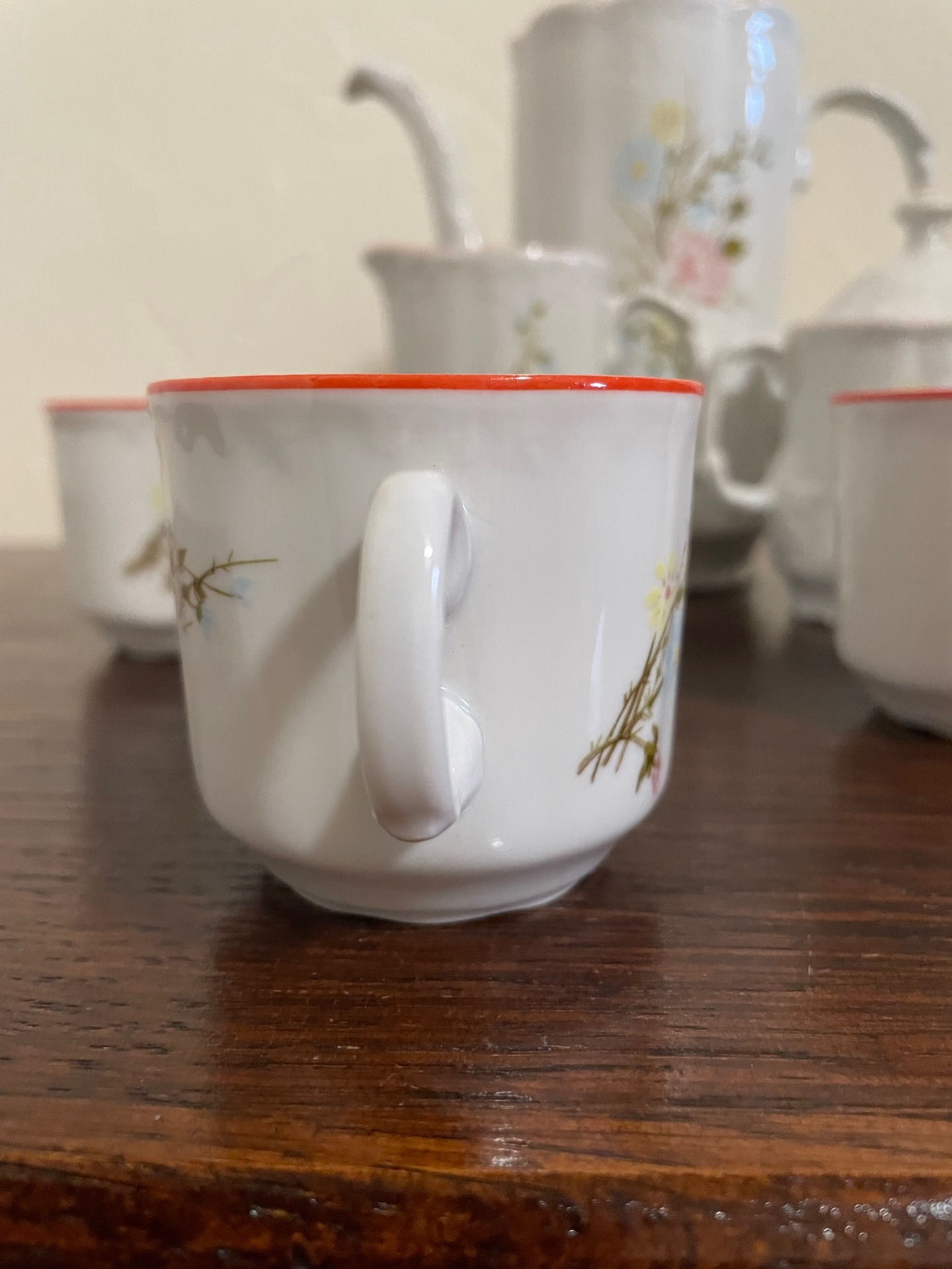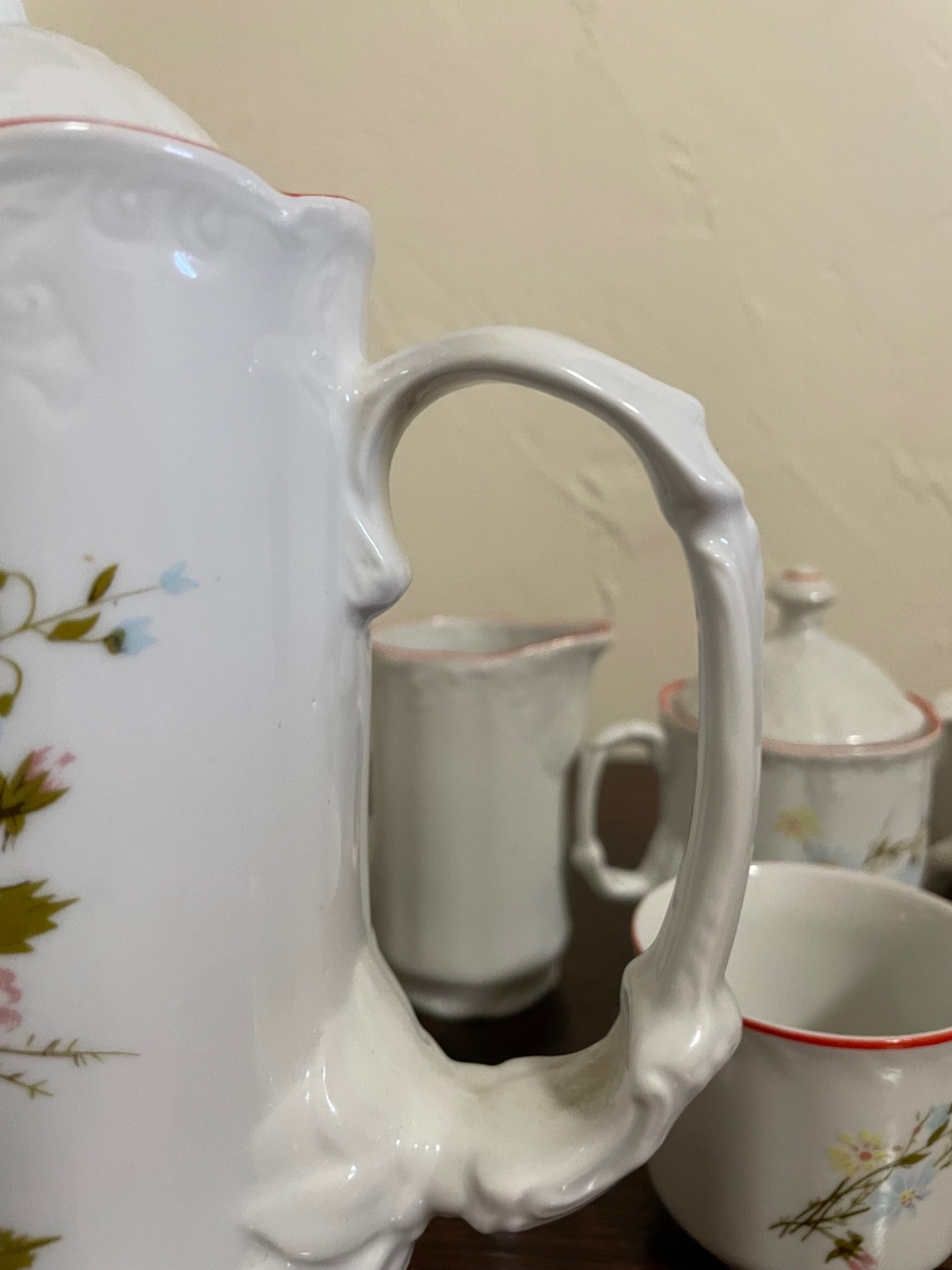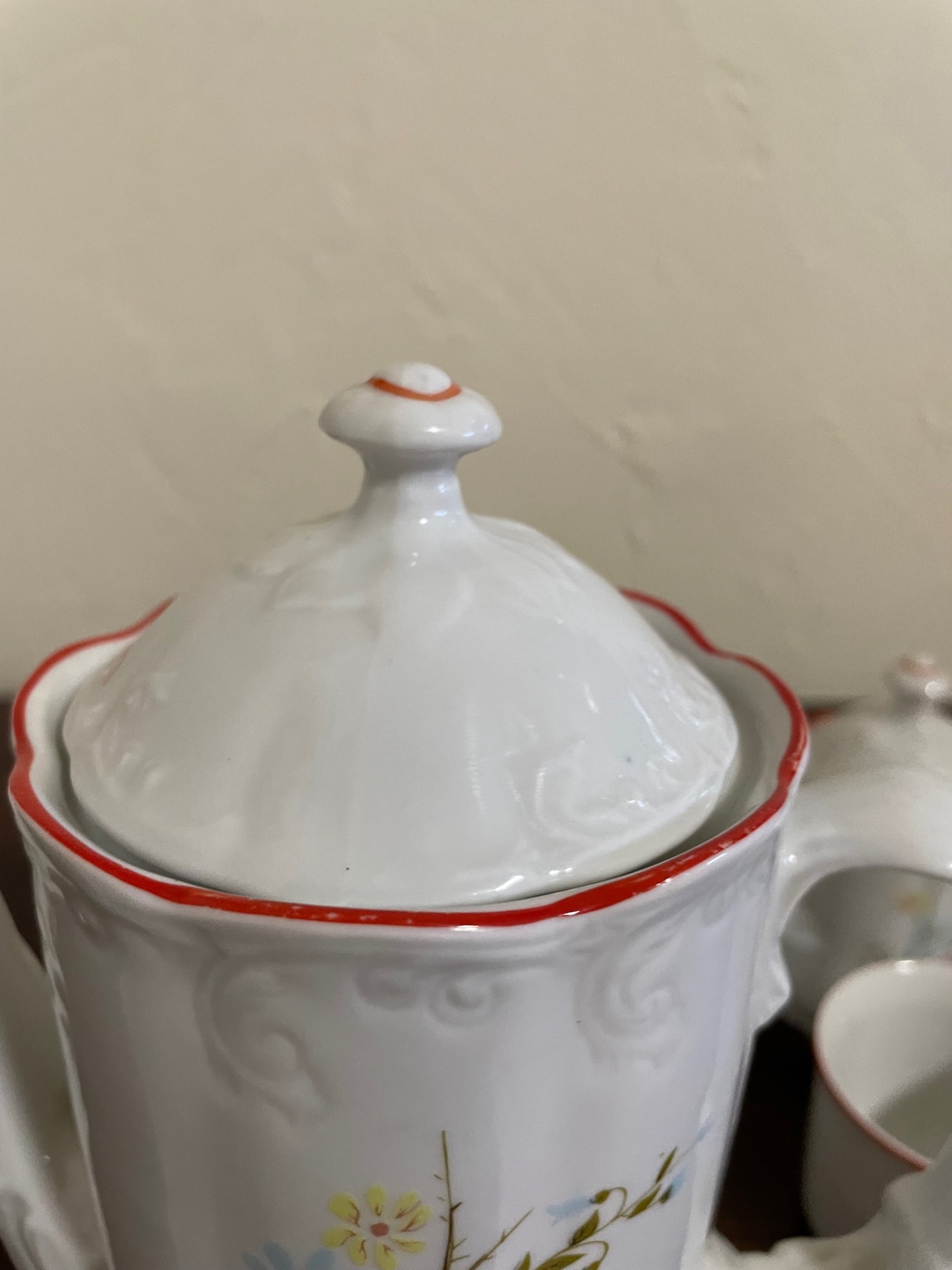 Braz and Braz kávéskészlet, hihetetlen részletek-beli megoldásokkal. A fotókon jól kivehető, hogyan fonódnak egymásba a különféle részek a testekkel. Nemcsak önmagában mintás, hanem külön virágmotívumot is megcsodálhatunk rajta.