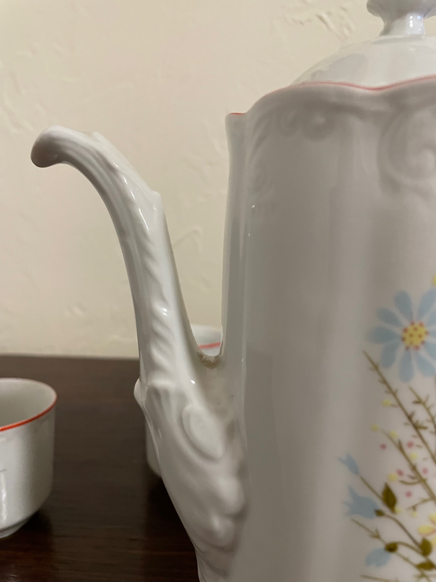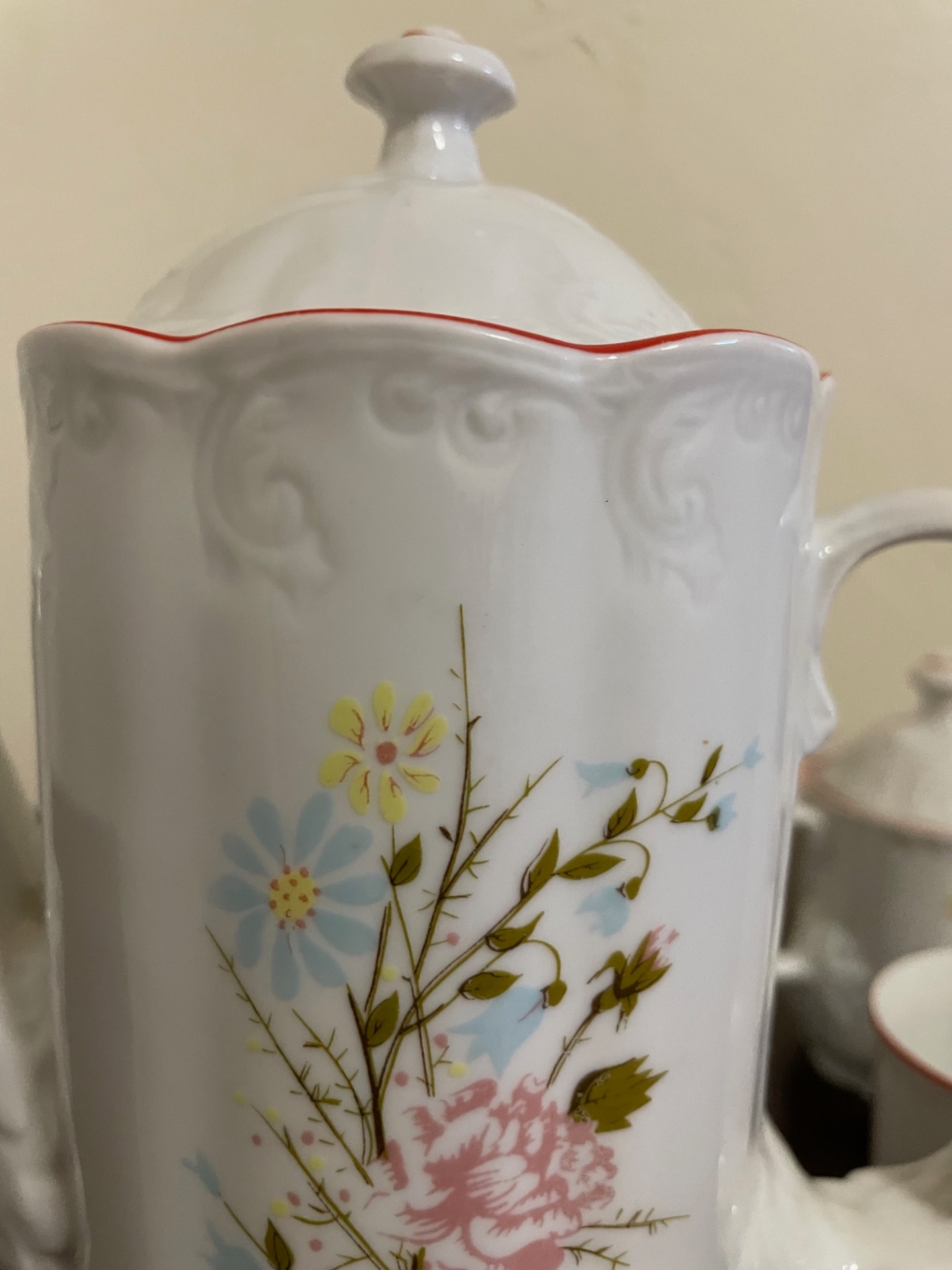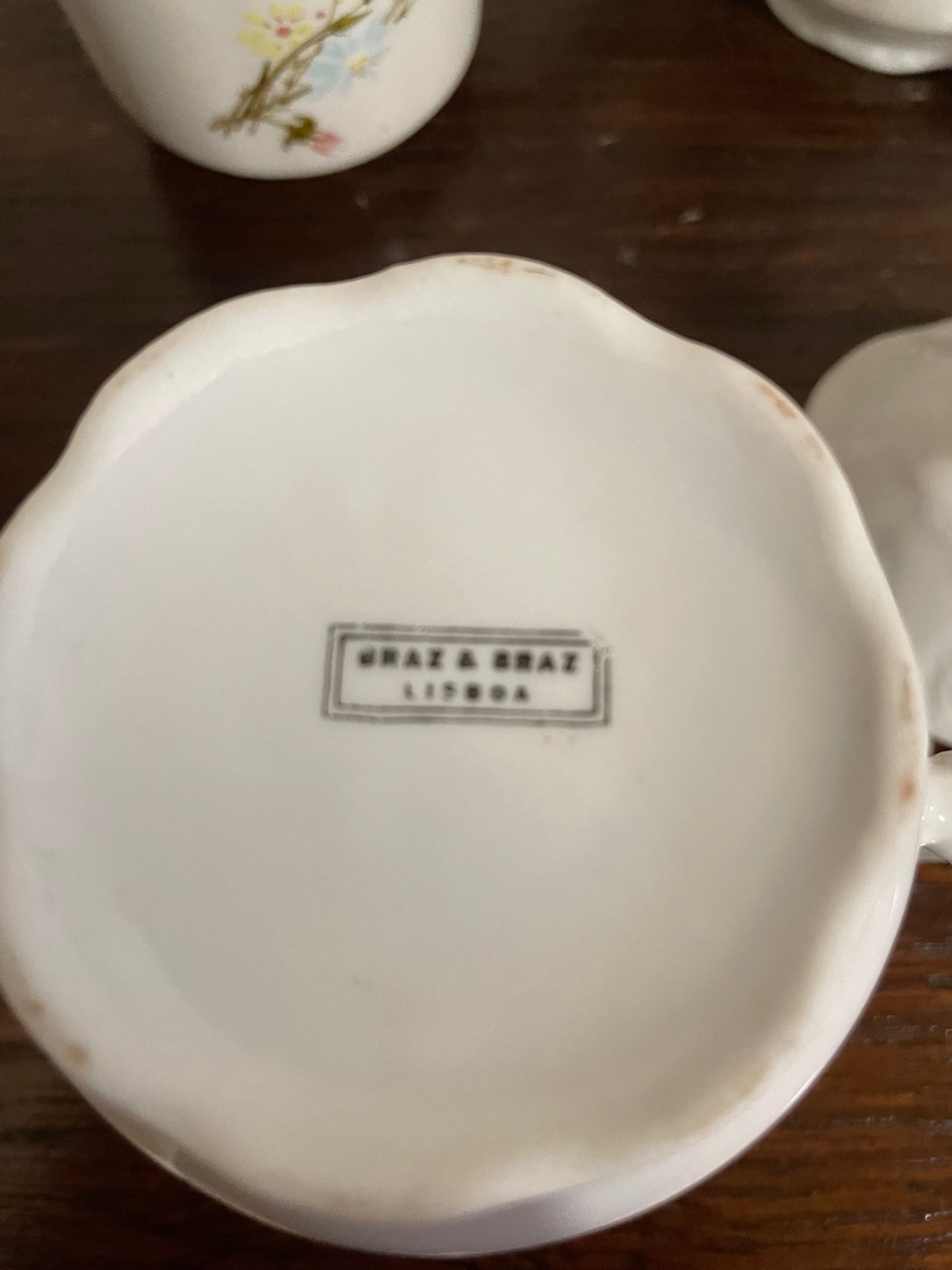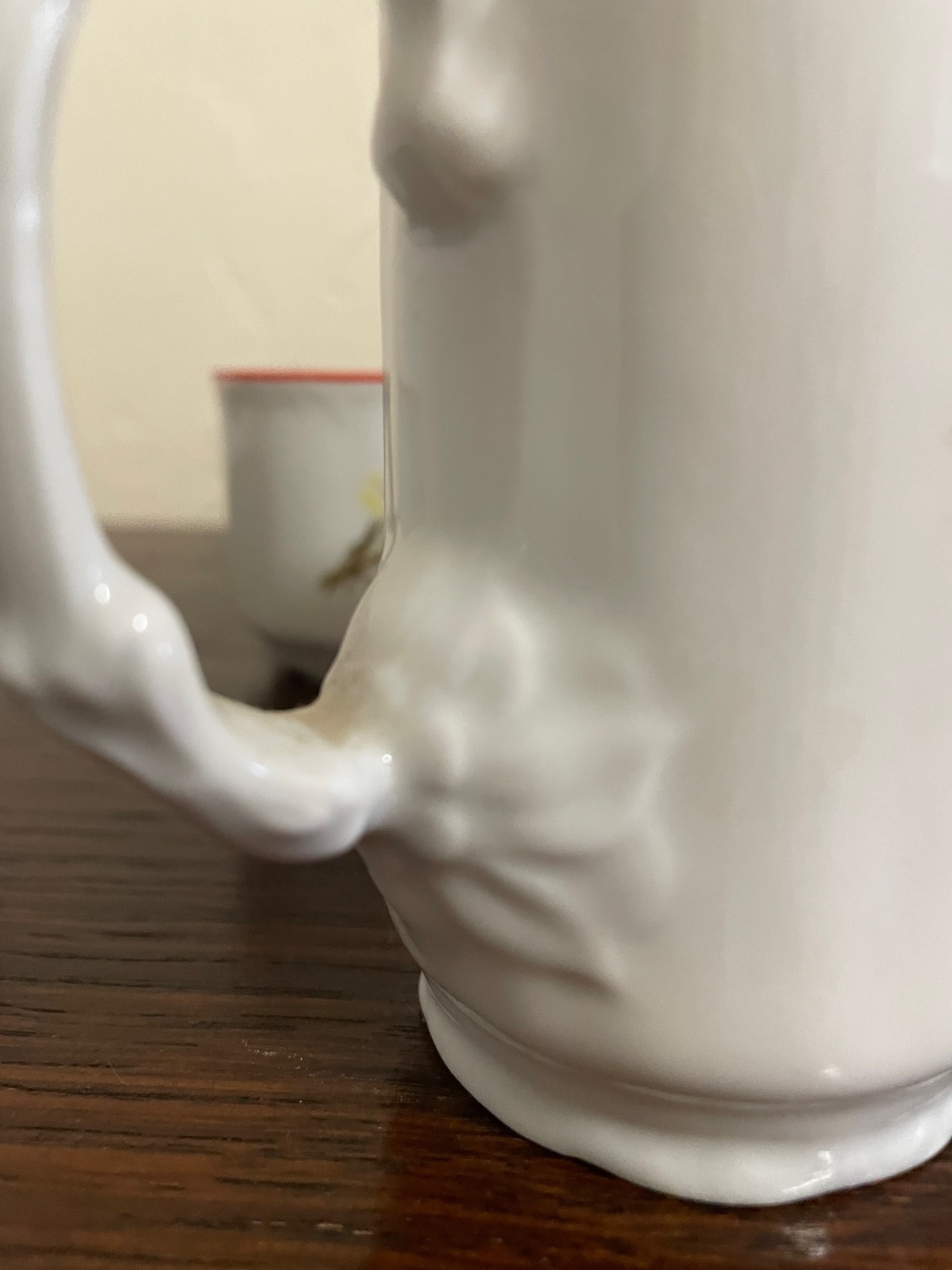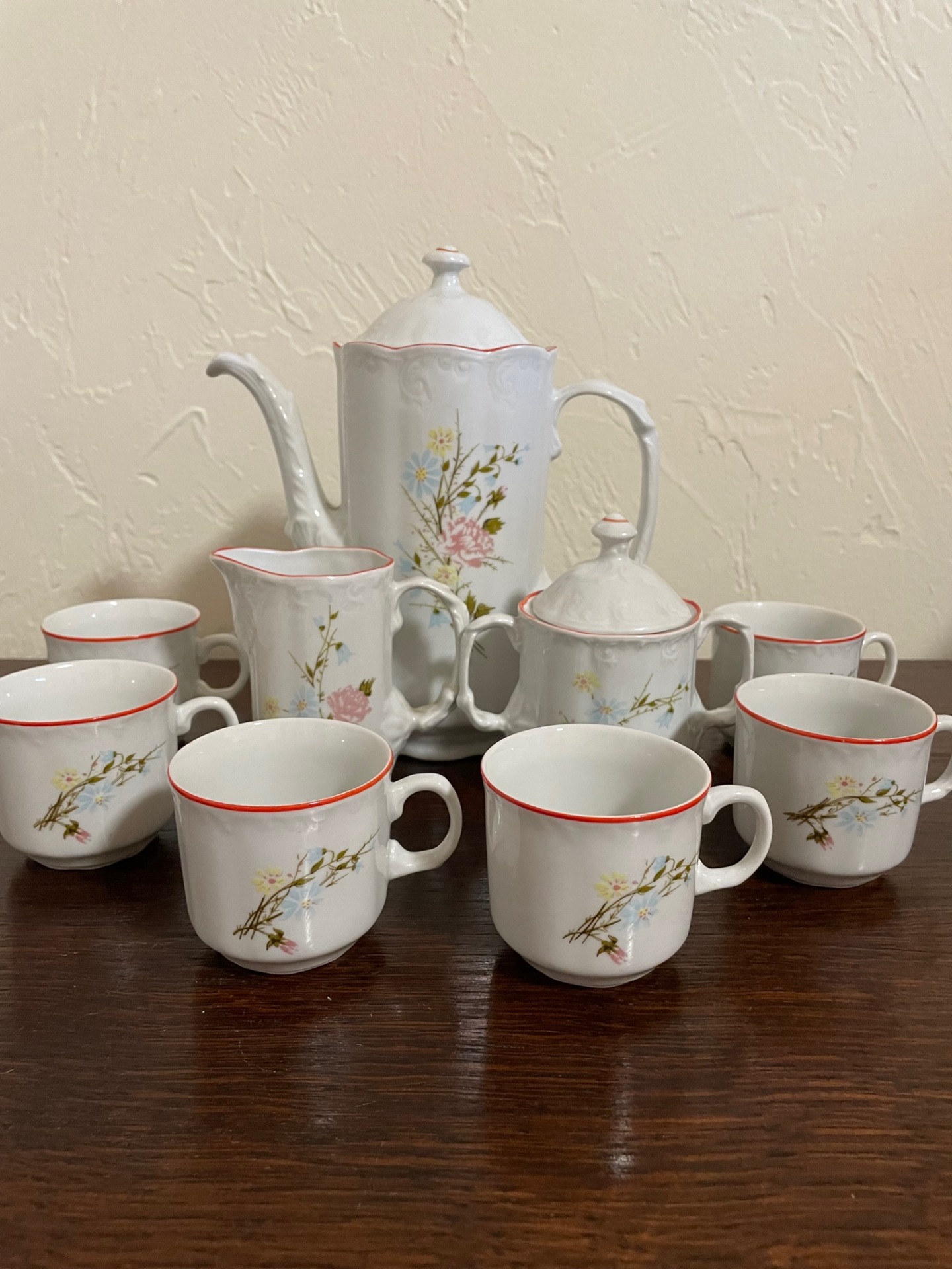 Braz and Braz kávéskészlet, hihetetlen részletek-beli megoldásokkal. A fotókon jól kivehető, hogyan fonódnak egymásba a különféle részek a testekkel. Nemcsak önmagában mintás, hanem külön virágmotívumot is megcsodálhatunk rajta.