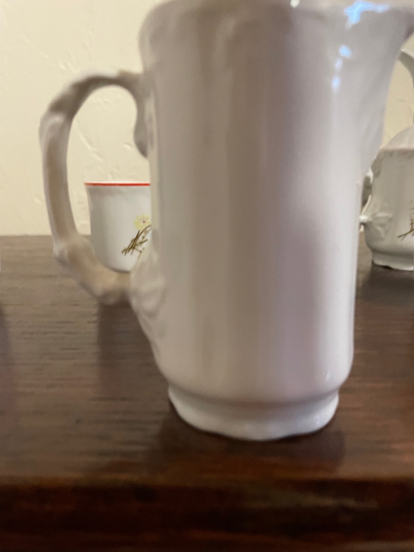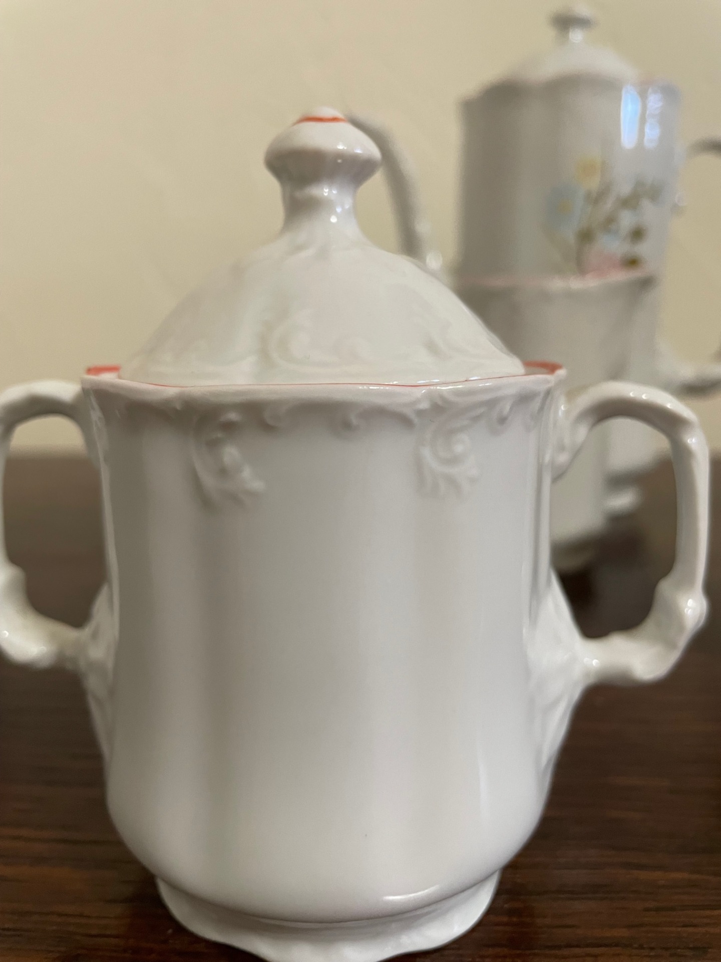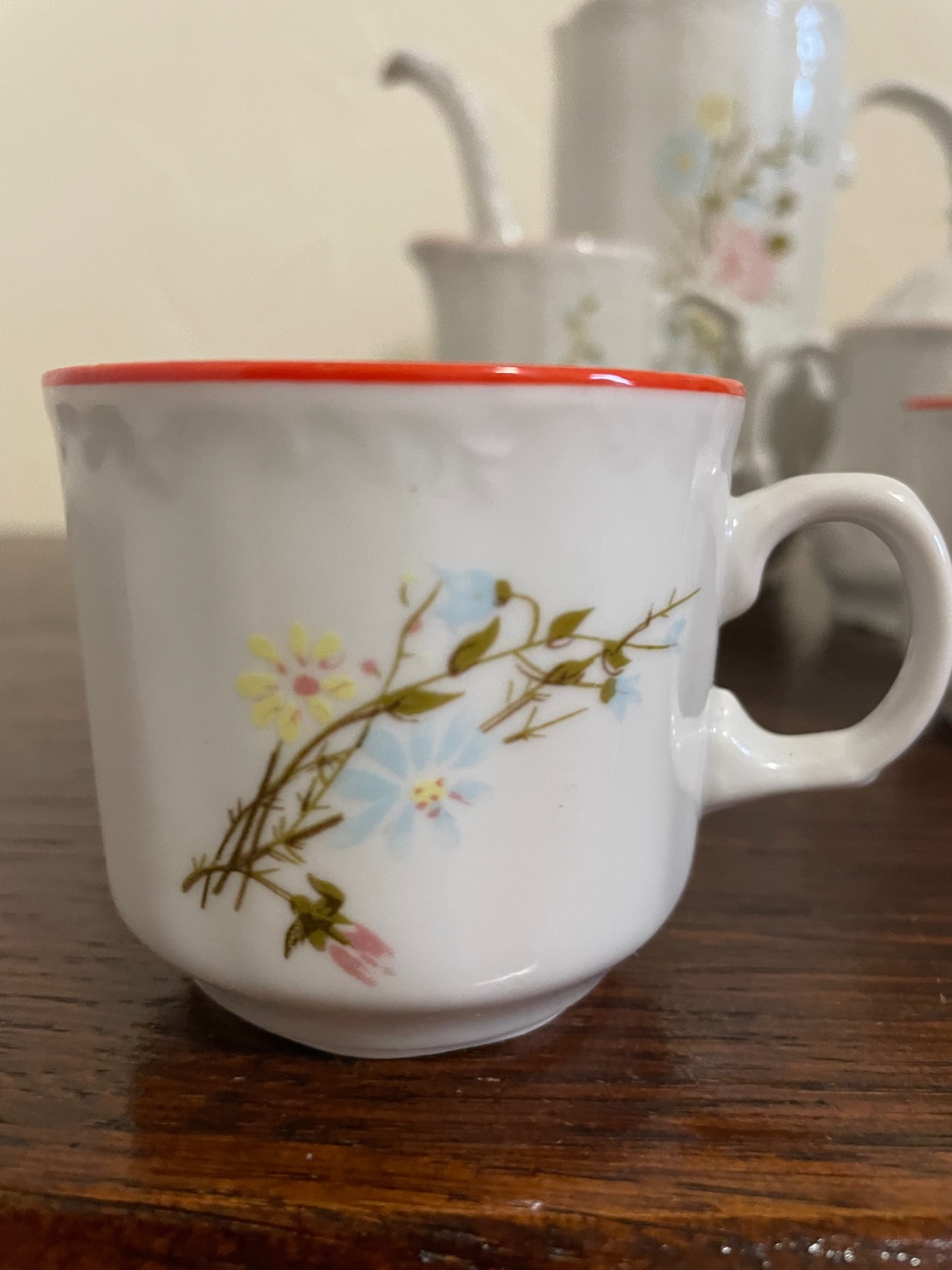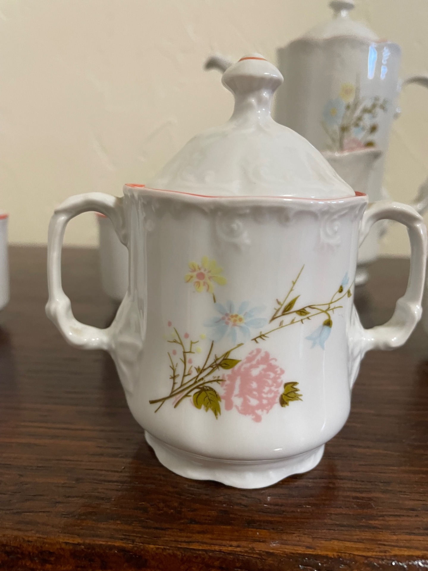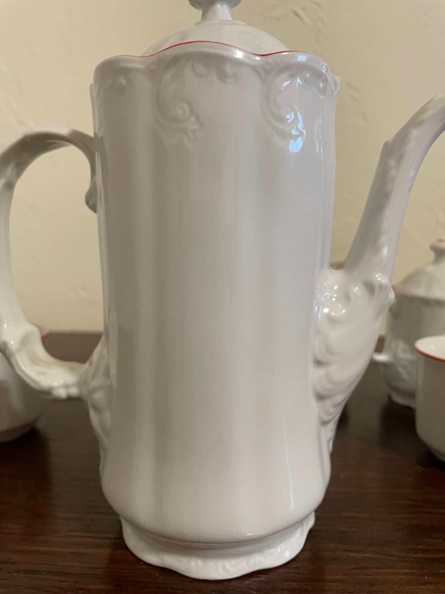 Braz and Braz kávéskészlet, hihetetlen részletek-beli megoldásokkal. A fotókon jól kivehető, hogyan fonódnak egymásba a különféle részek a testekkel. Nemcsak önmagában mintás, hanem külön virágmotívumot is megcsodálhatunk rajta.