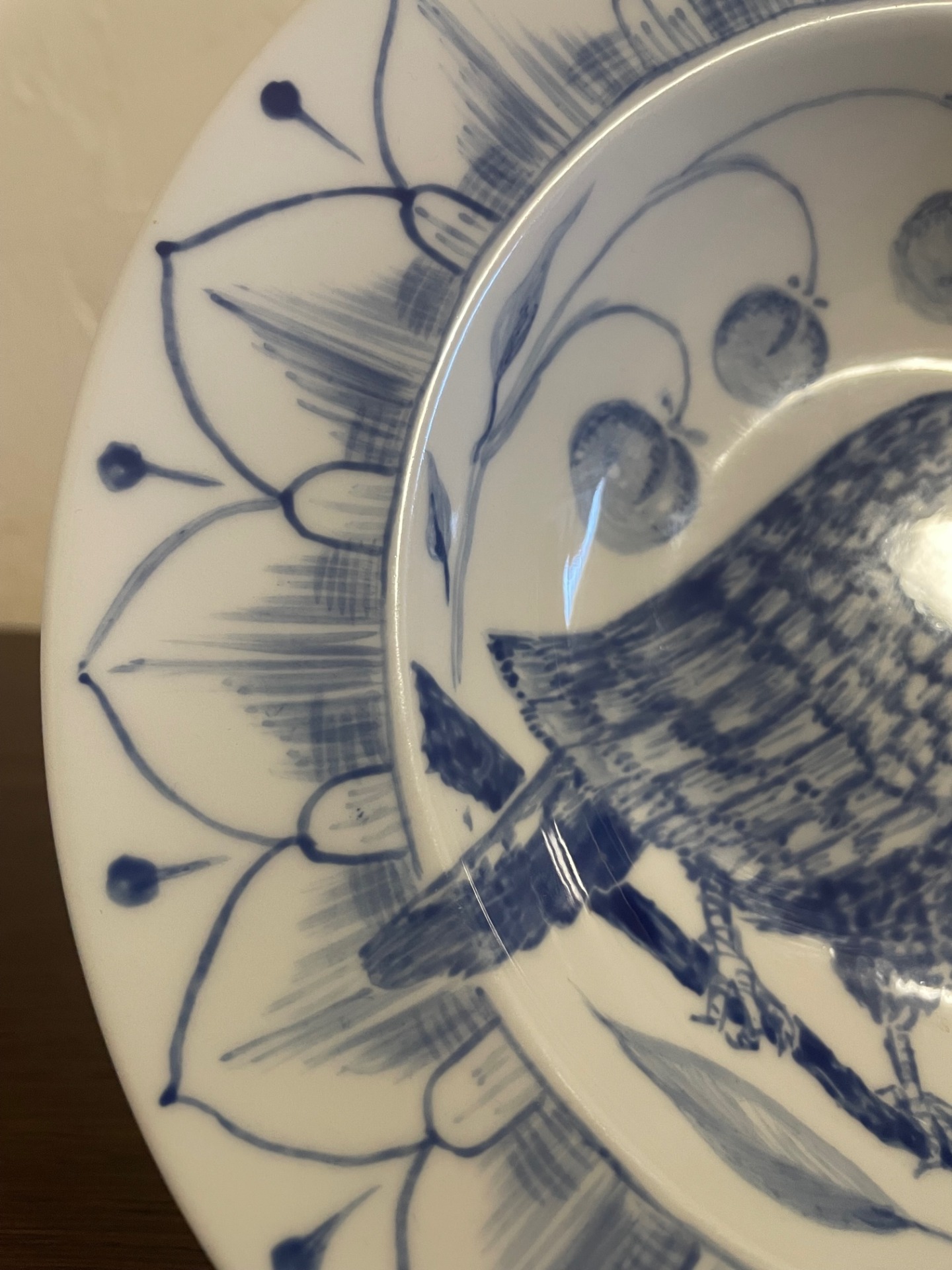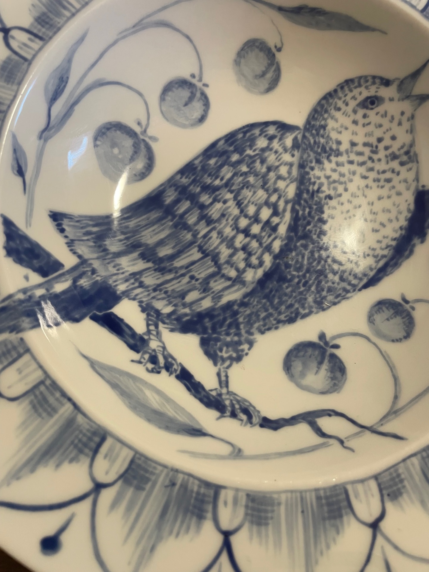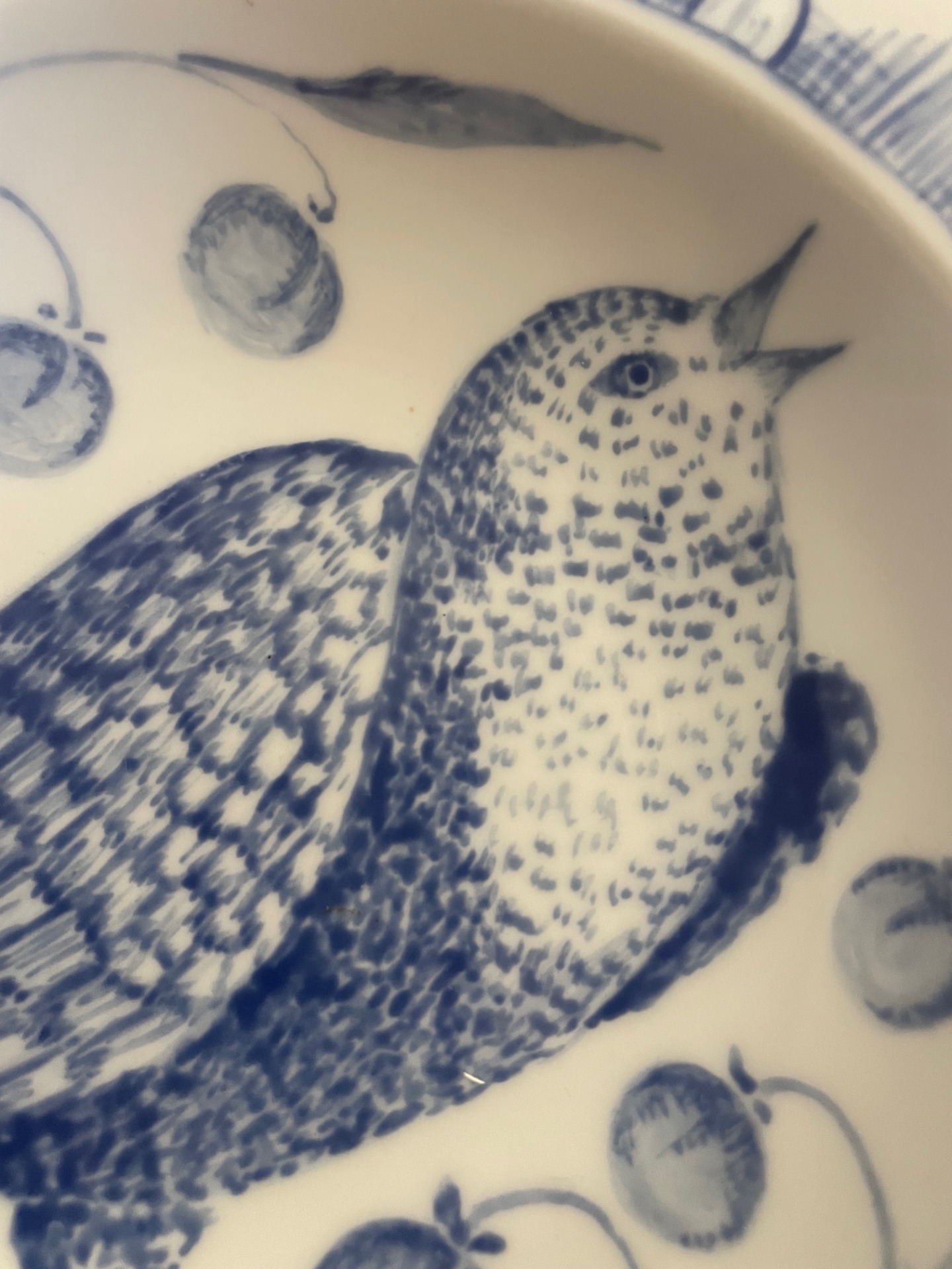 Éneklő cinegemadár, gyümölcsökkel teli ágon, kék árnyalatban ezen a porcelán falitányéron.