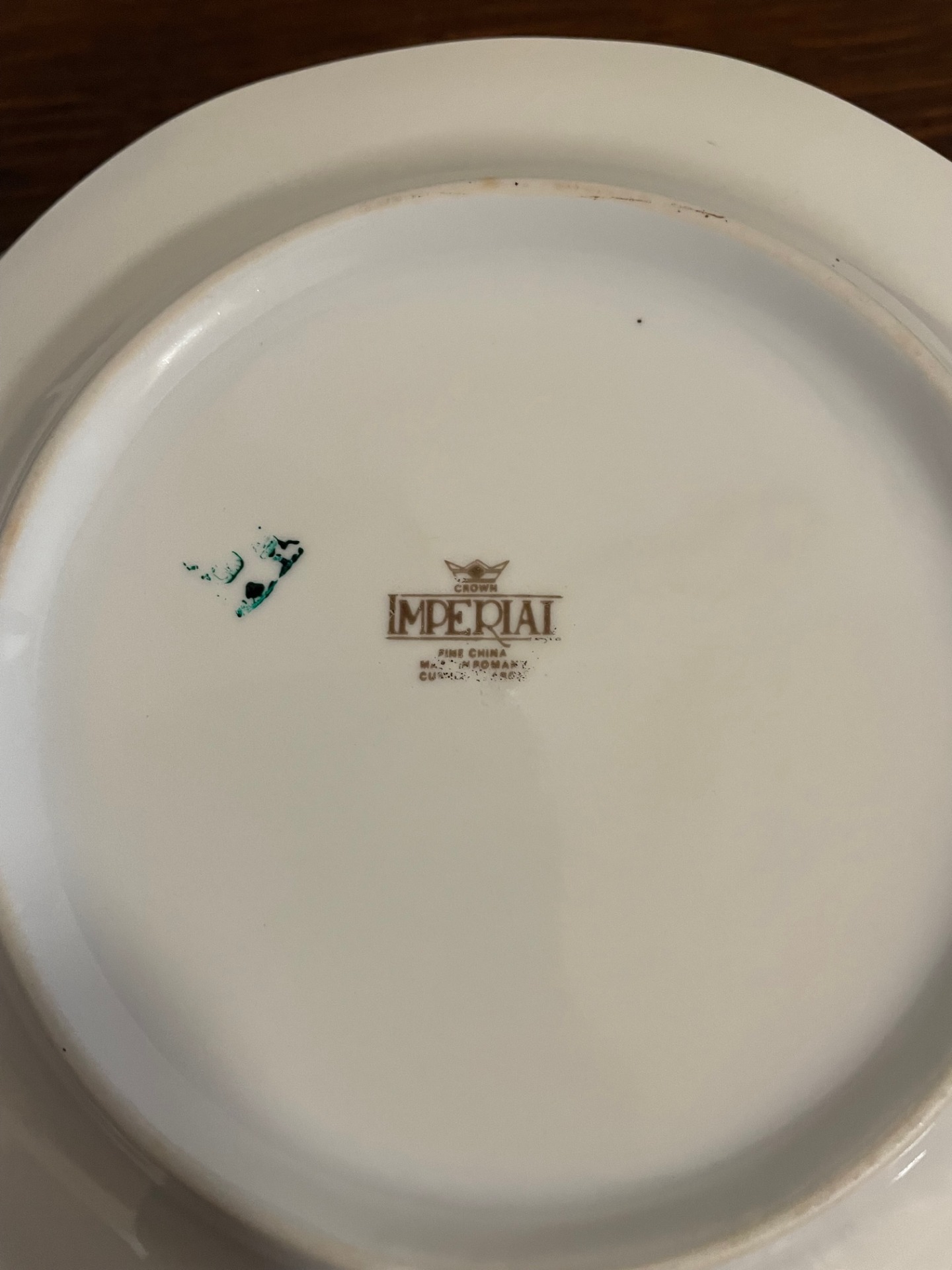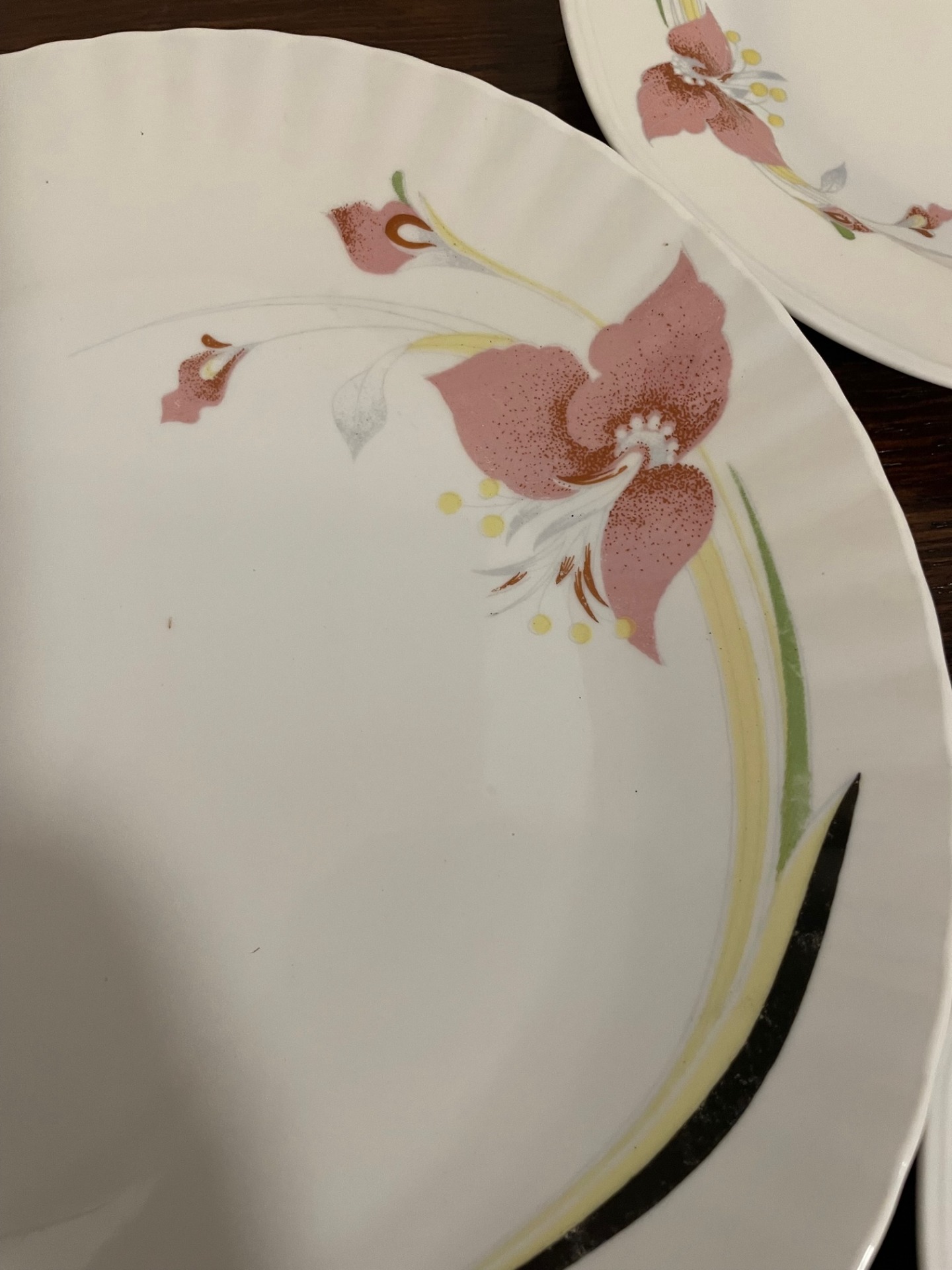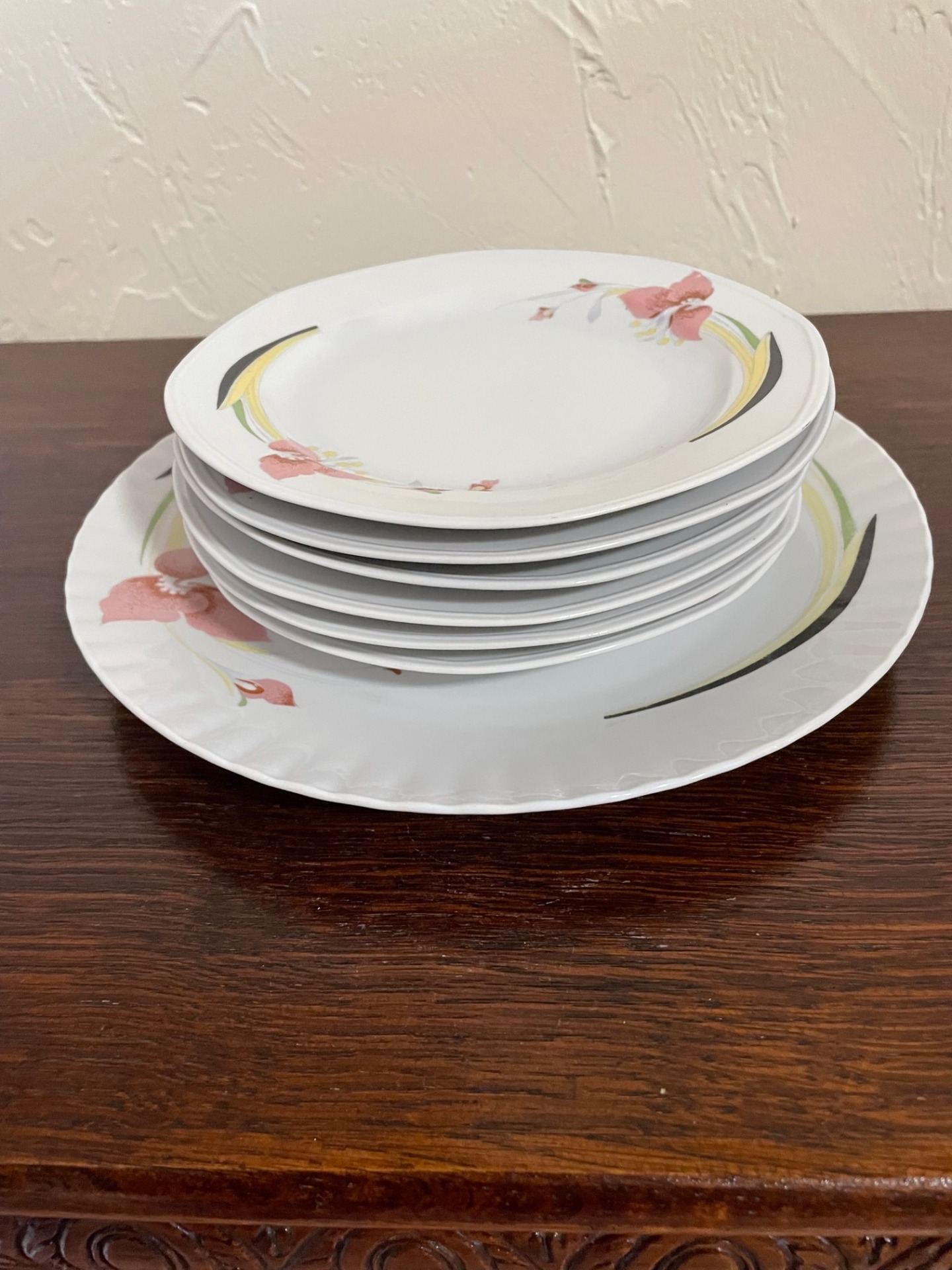 Orchidea mintás Imperial süteményes készlet. Festése egy-két tányéron, korából adódóan mattult már.