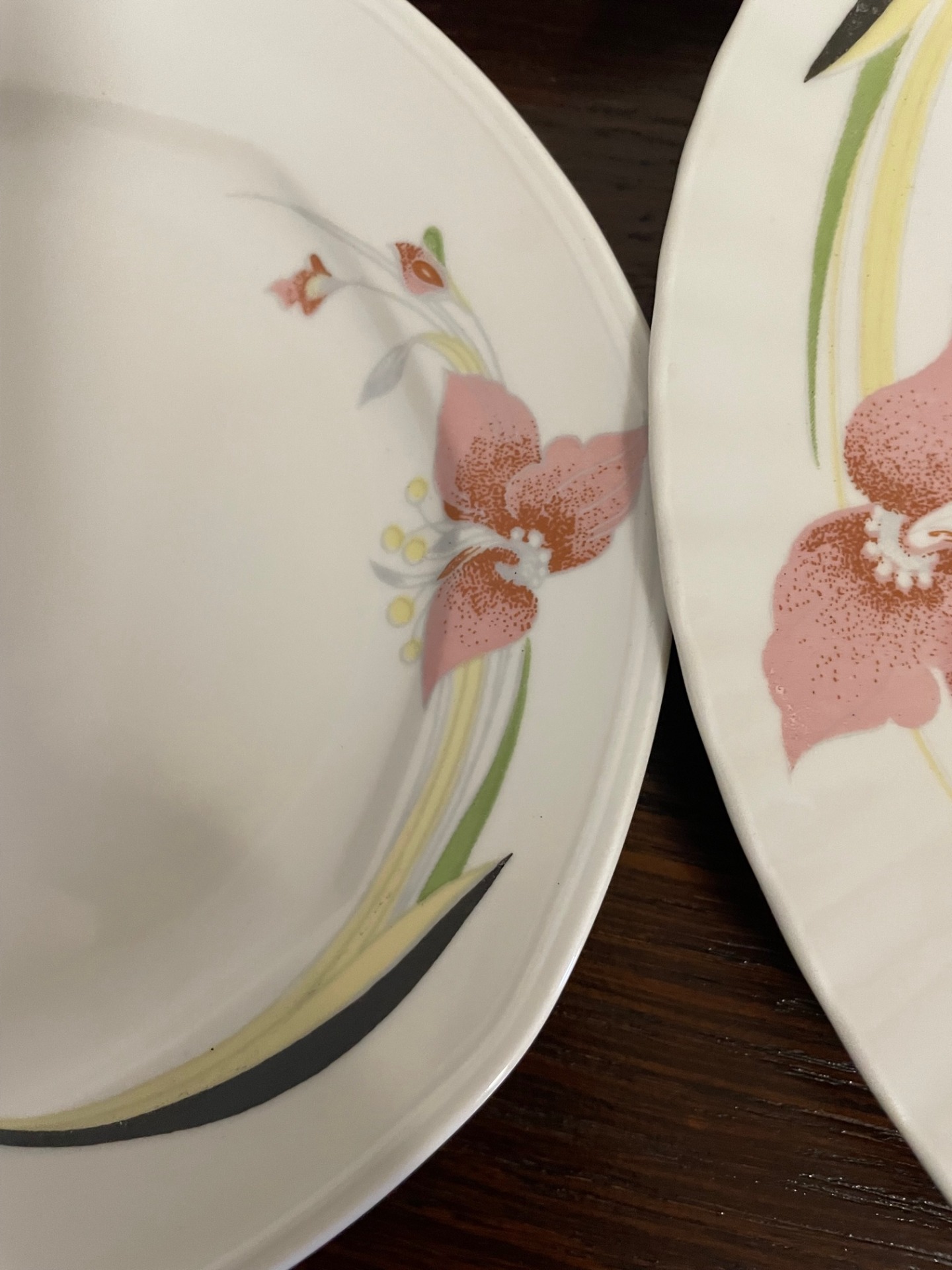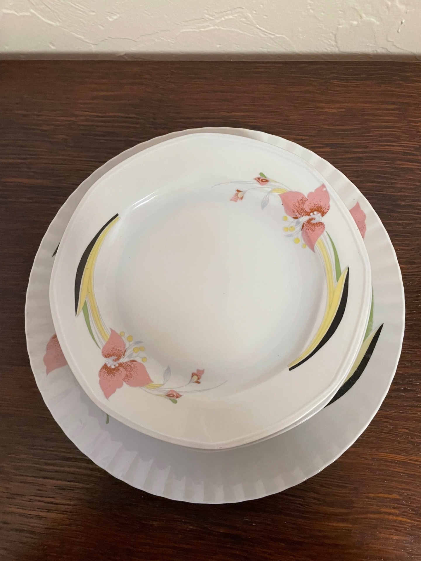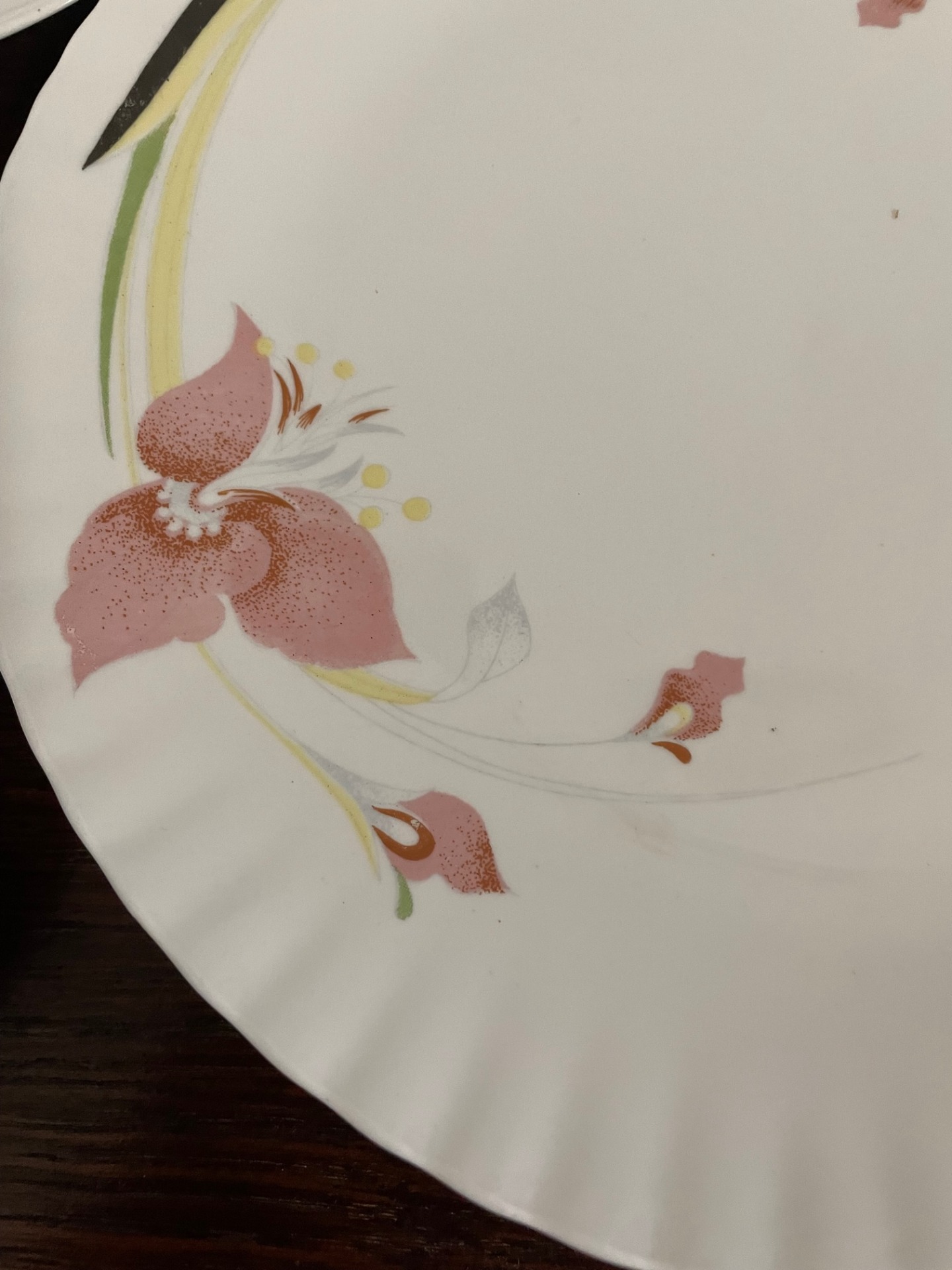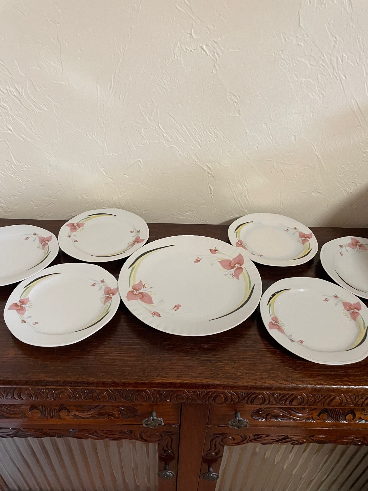 Orchidea mintás Imperial süteményes készlet. Festése egy-két tányéron, korából adódóan mattult már.