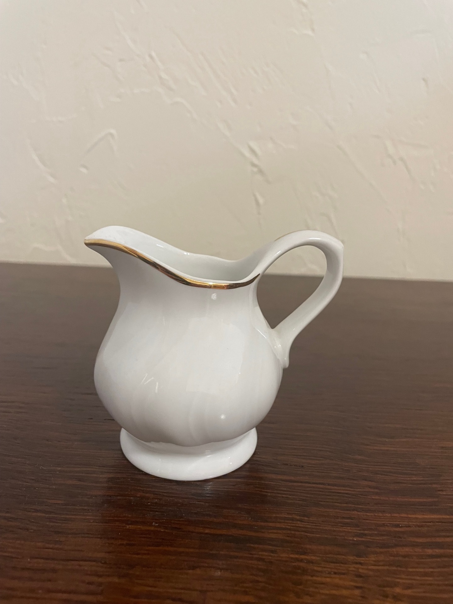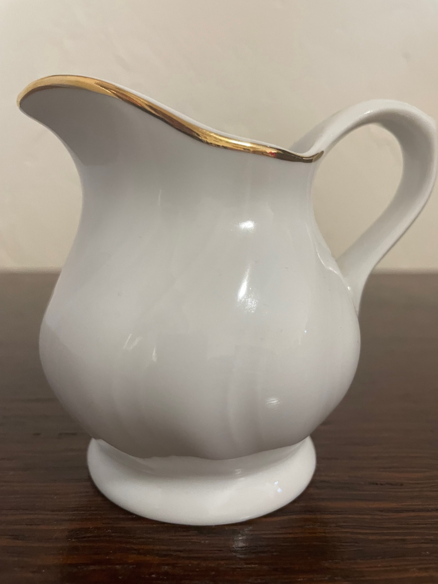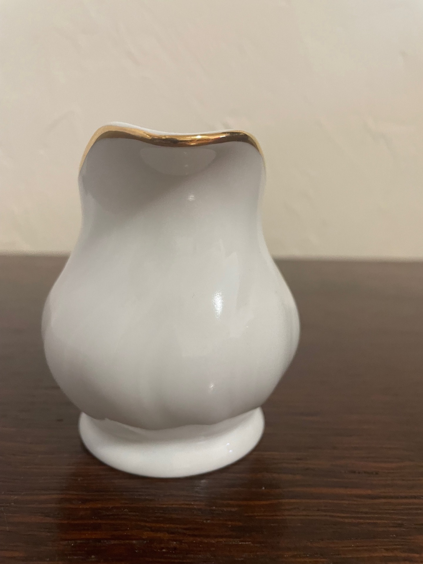 Elegáns megjelenés, nőies formák jellemzik ezt az arany szegéllyel ellátott, kis tejkiöntőt.