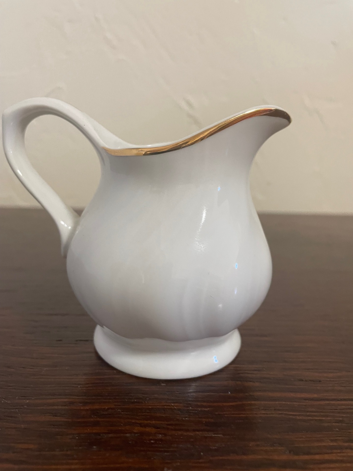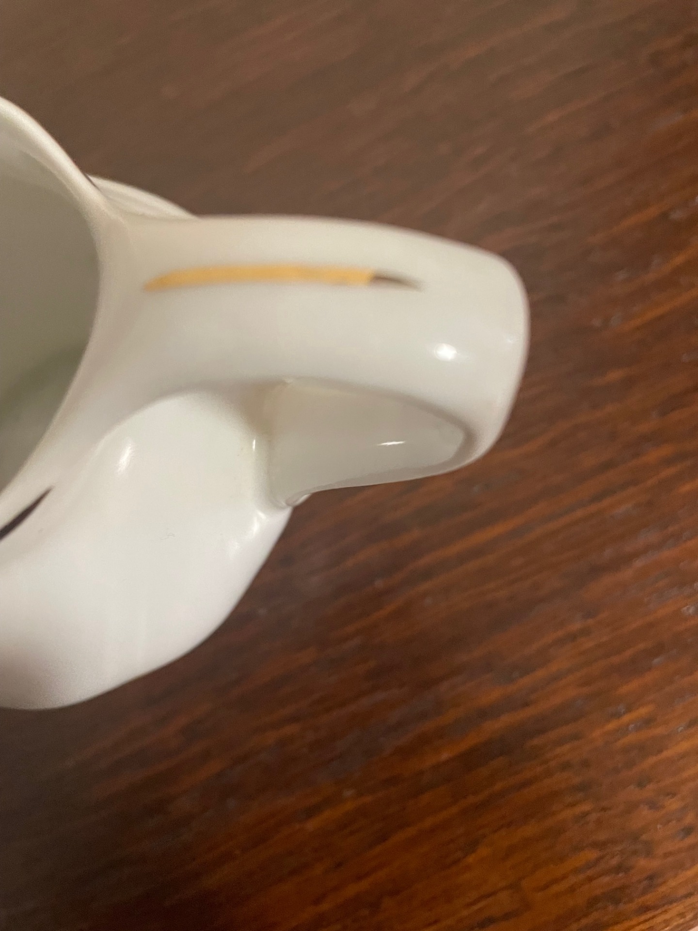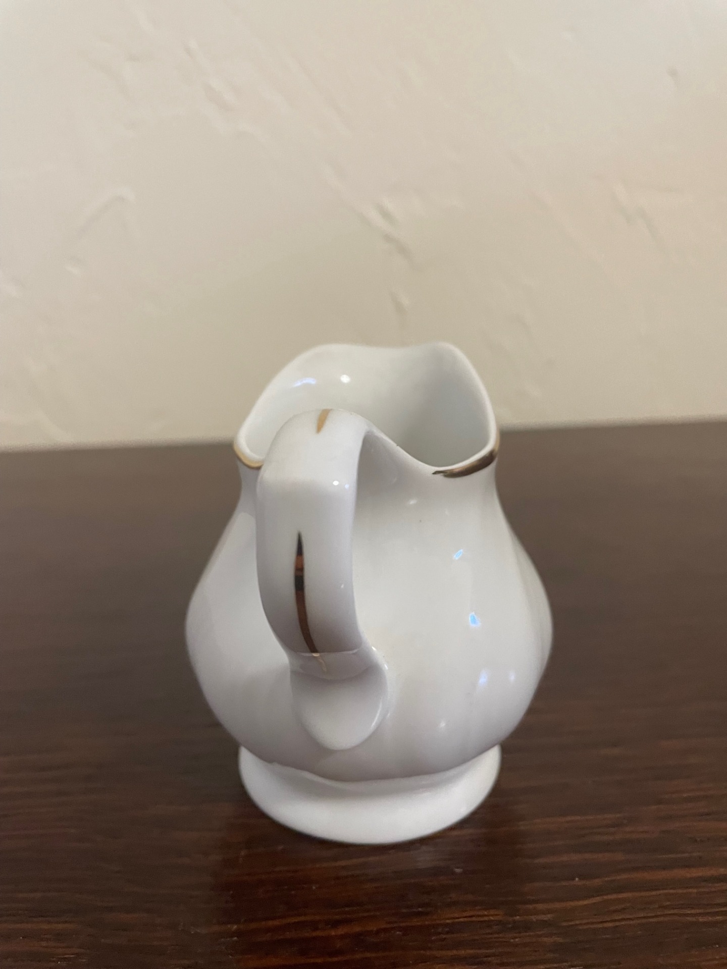 Elegáns megjelenés, nőies formák jellemzik ezt az arany szegéllyel ellátott, kis tejkiöntőt.