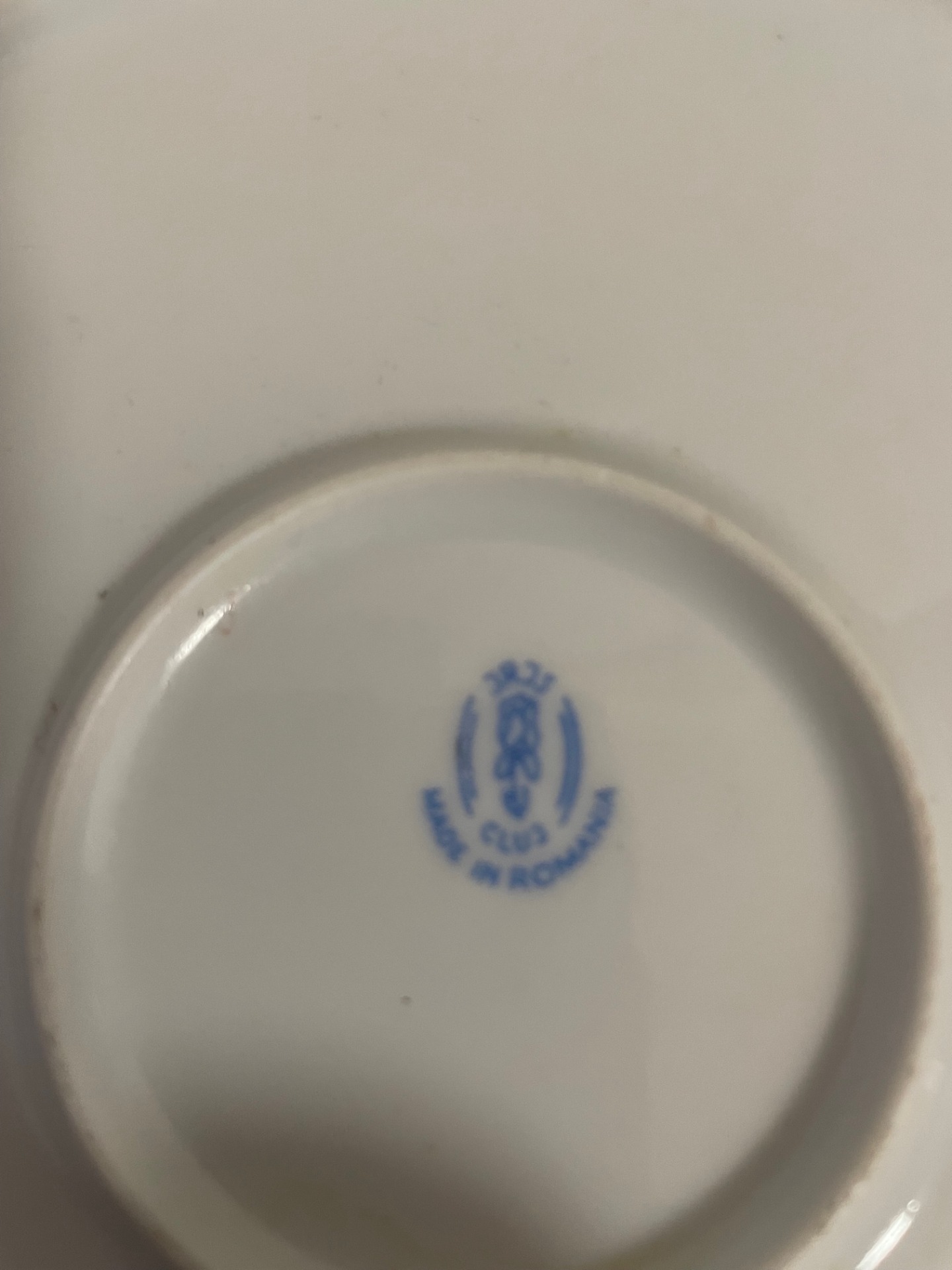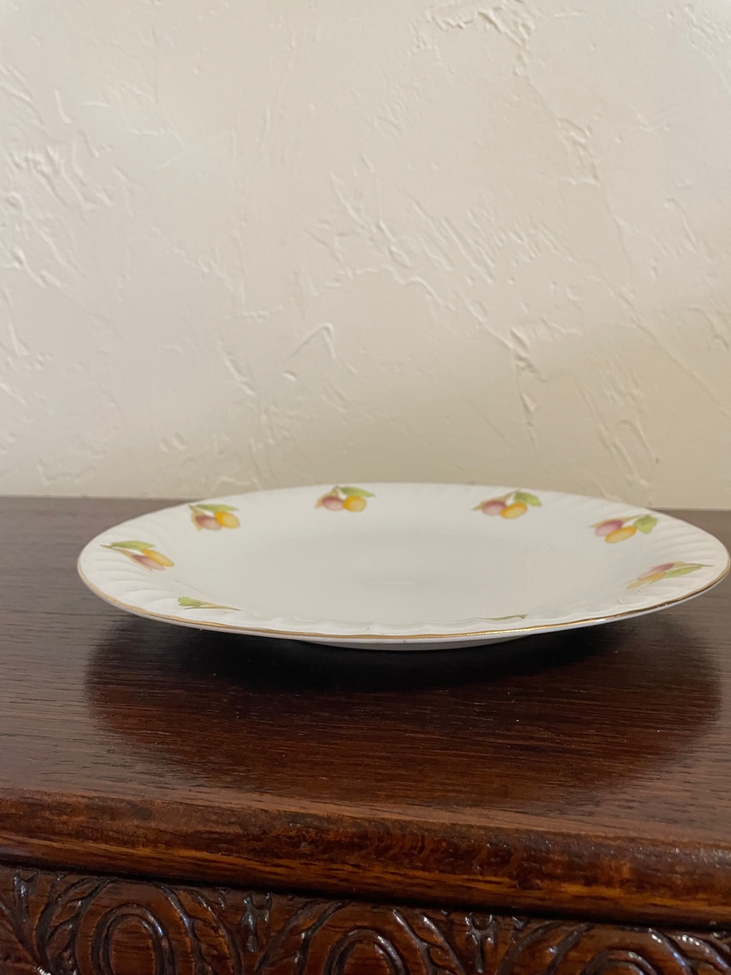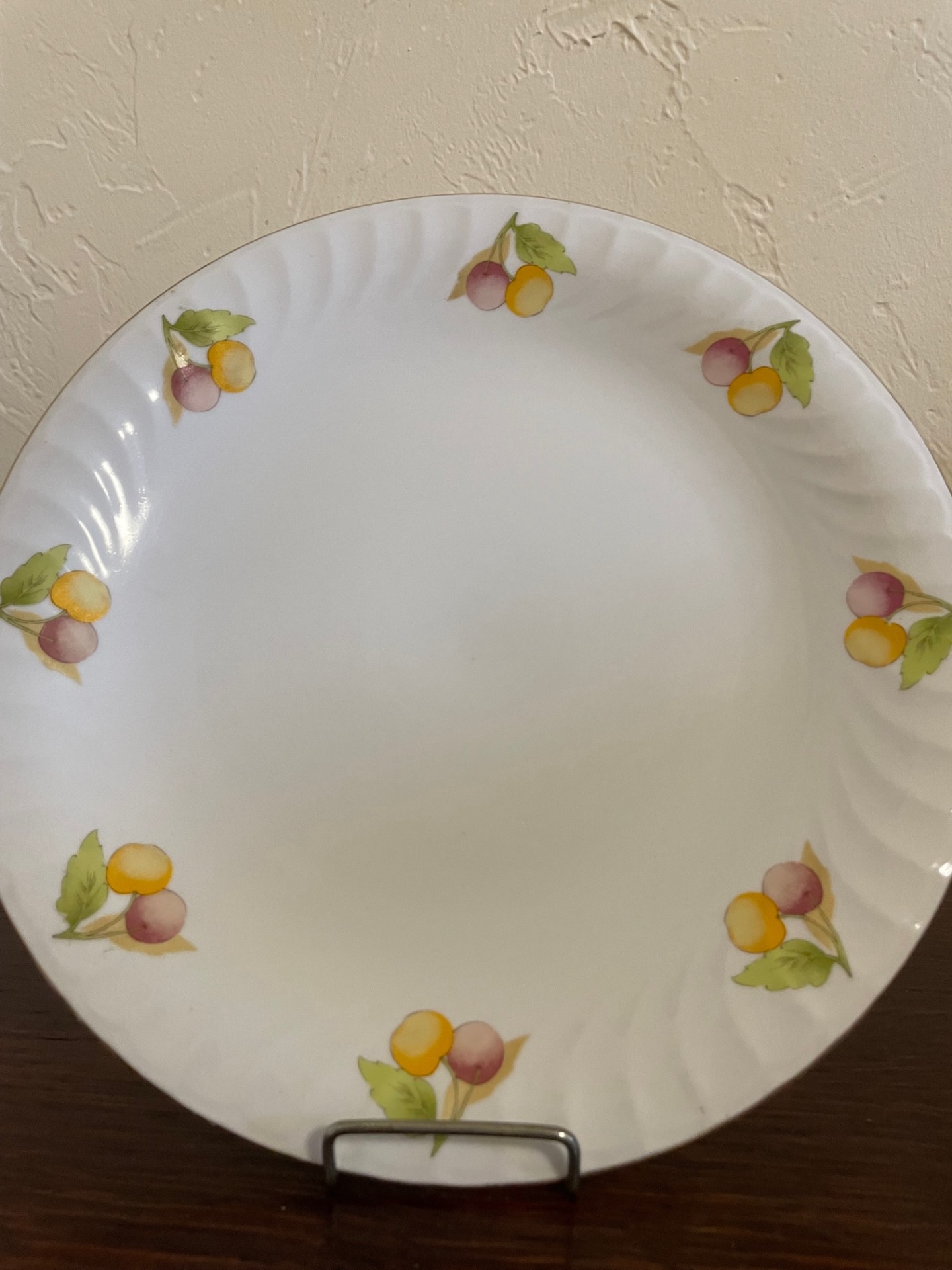 Nagyméretű, aranycsíkkal díszített, szélein páros gyümölcsökkel dekorált kínáló a Clujtól.
