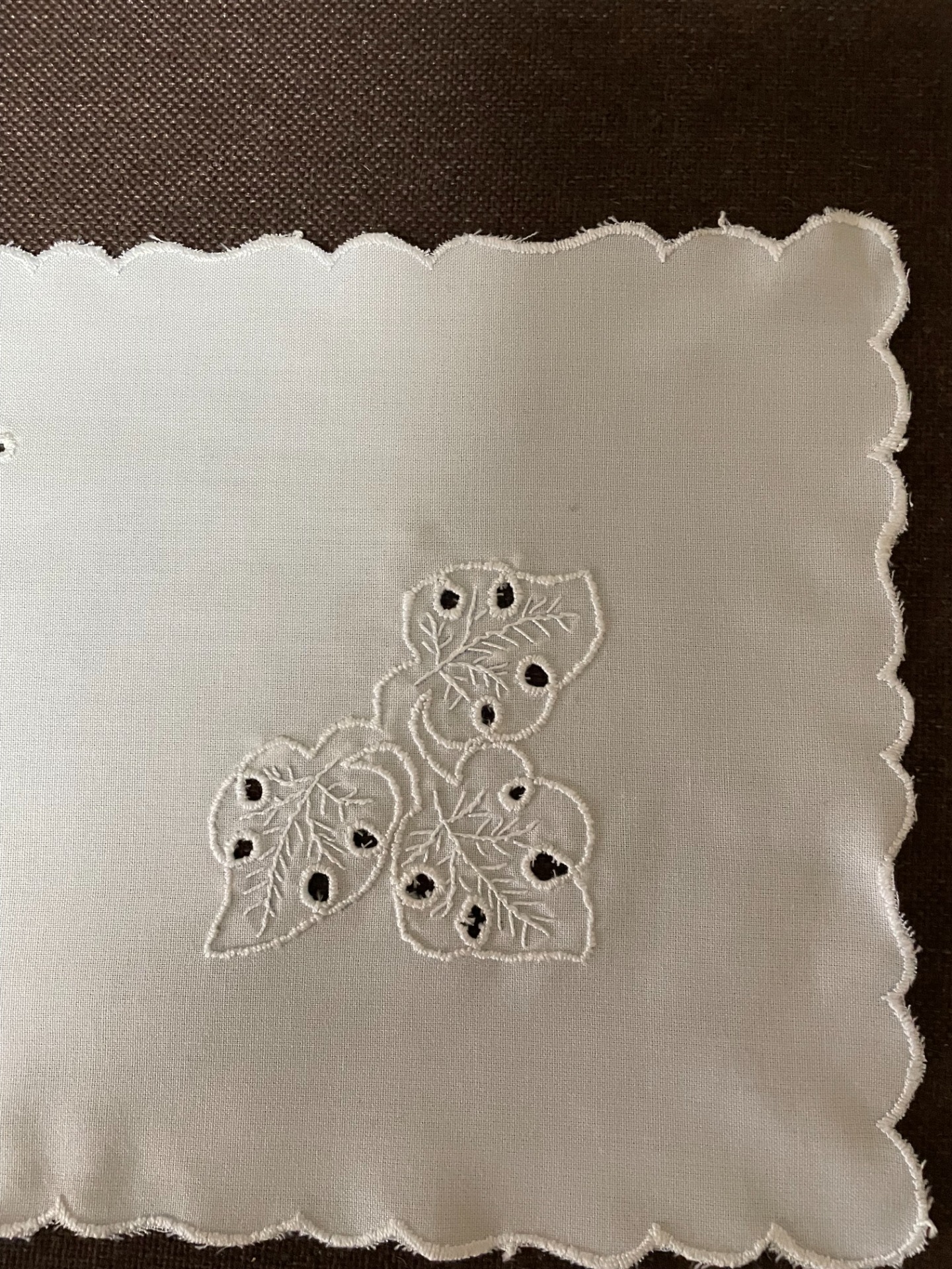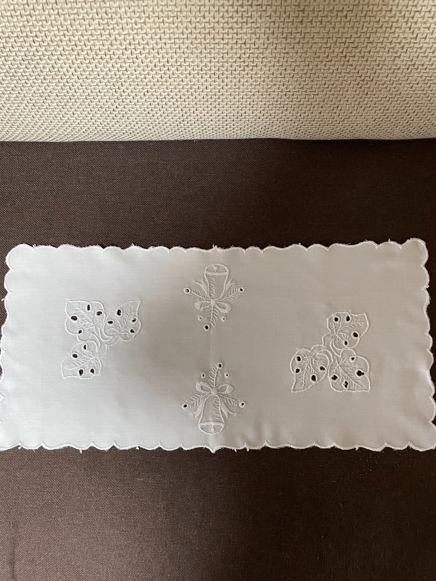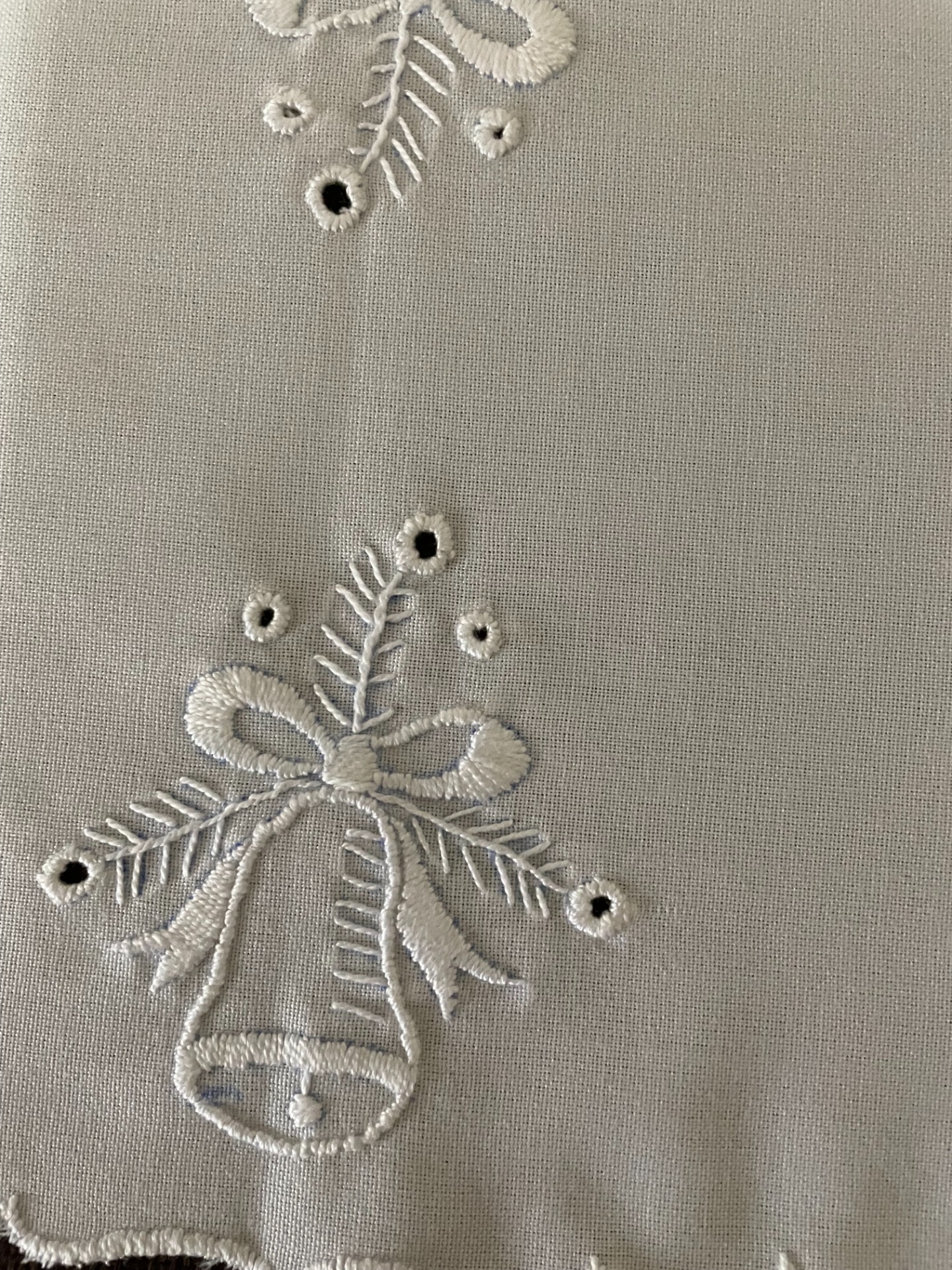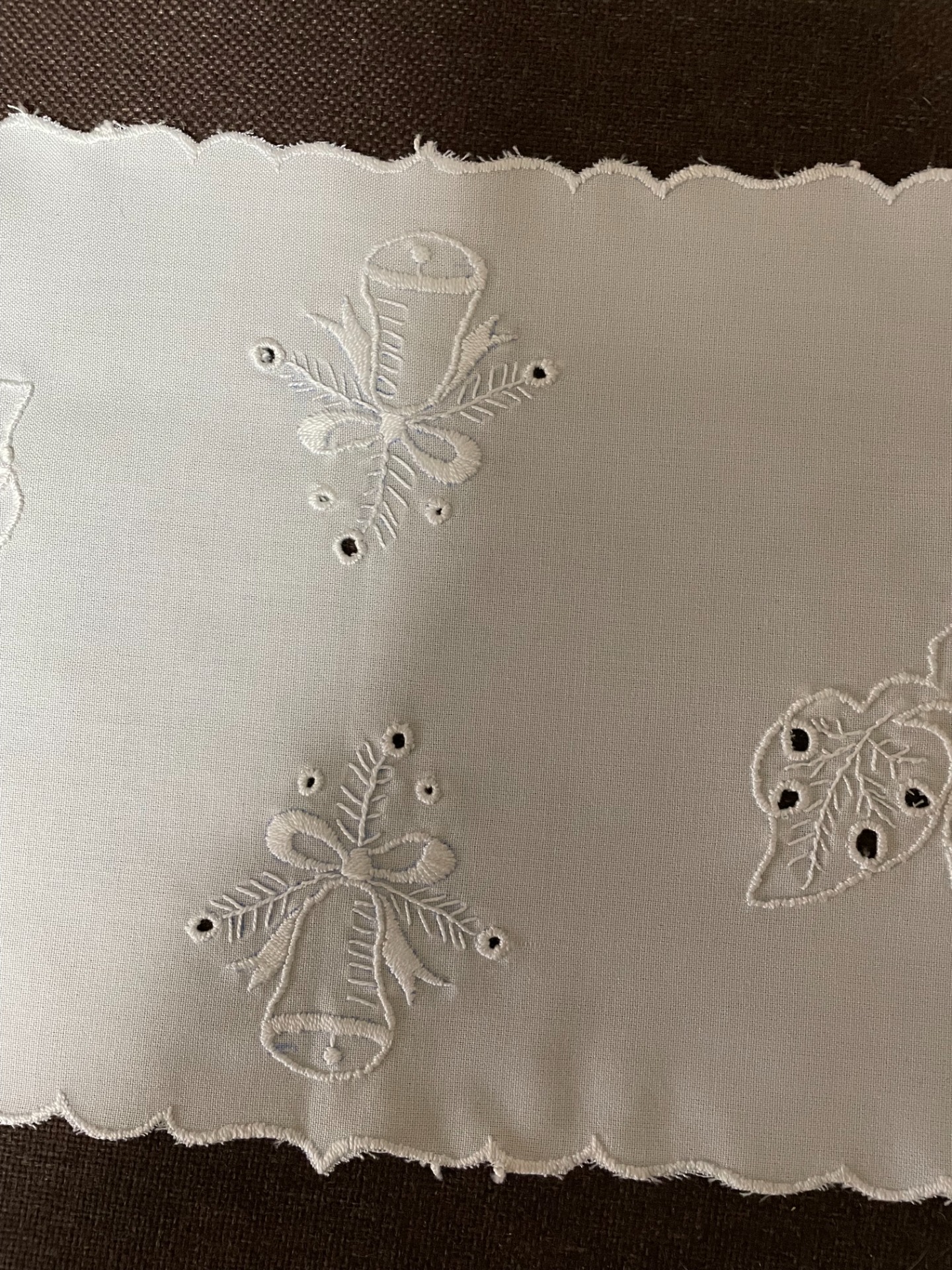 Hófehérrel készült, karácsonyi futóterítő, lukhímzéssel.
