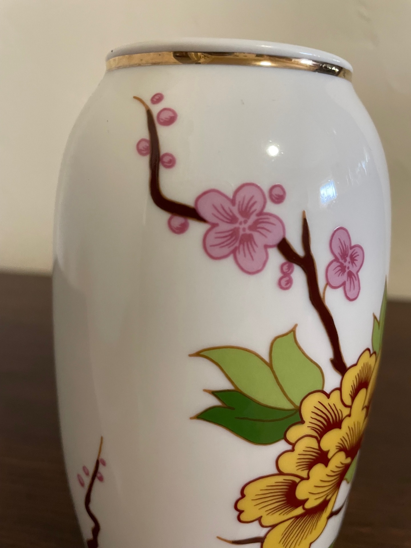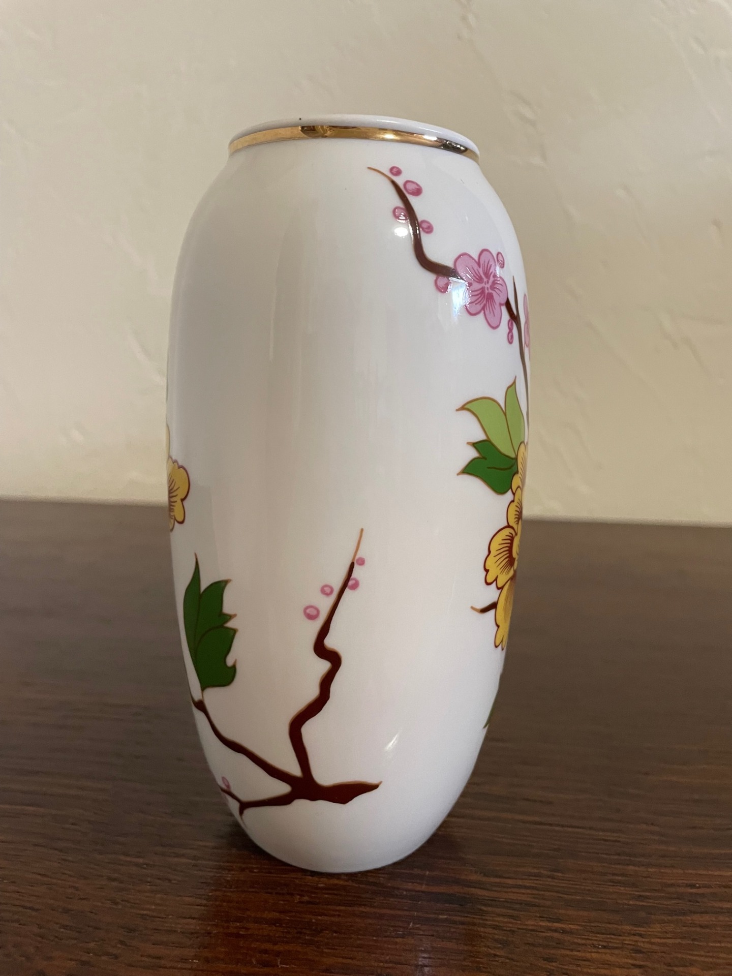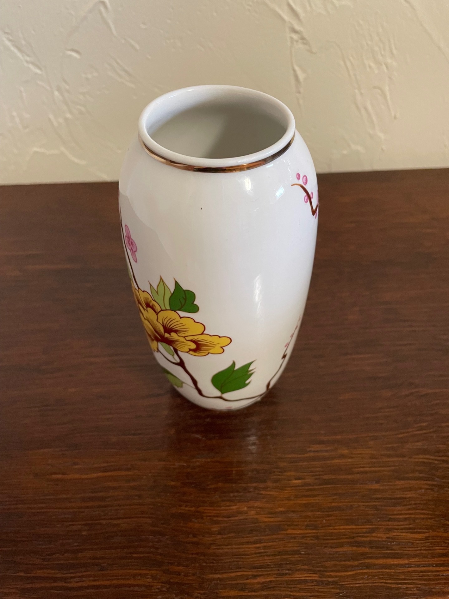 Ritka mintás, kis méretű váza Hollóházáról. Matricás, a váza szájánál arany tükörcsík látható.
