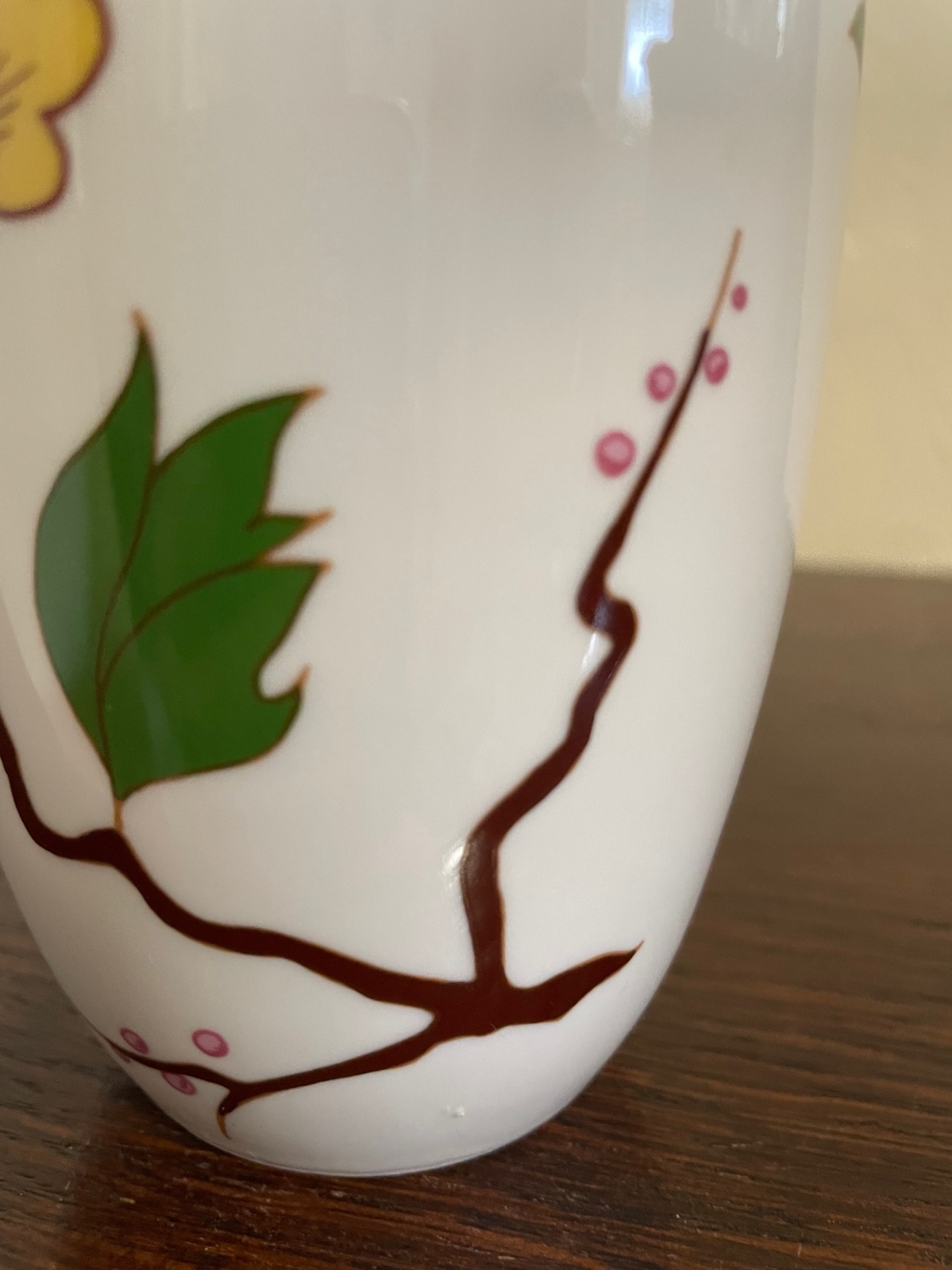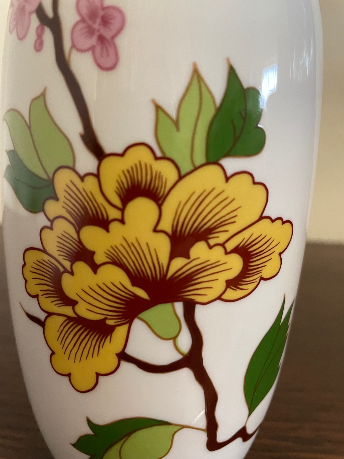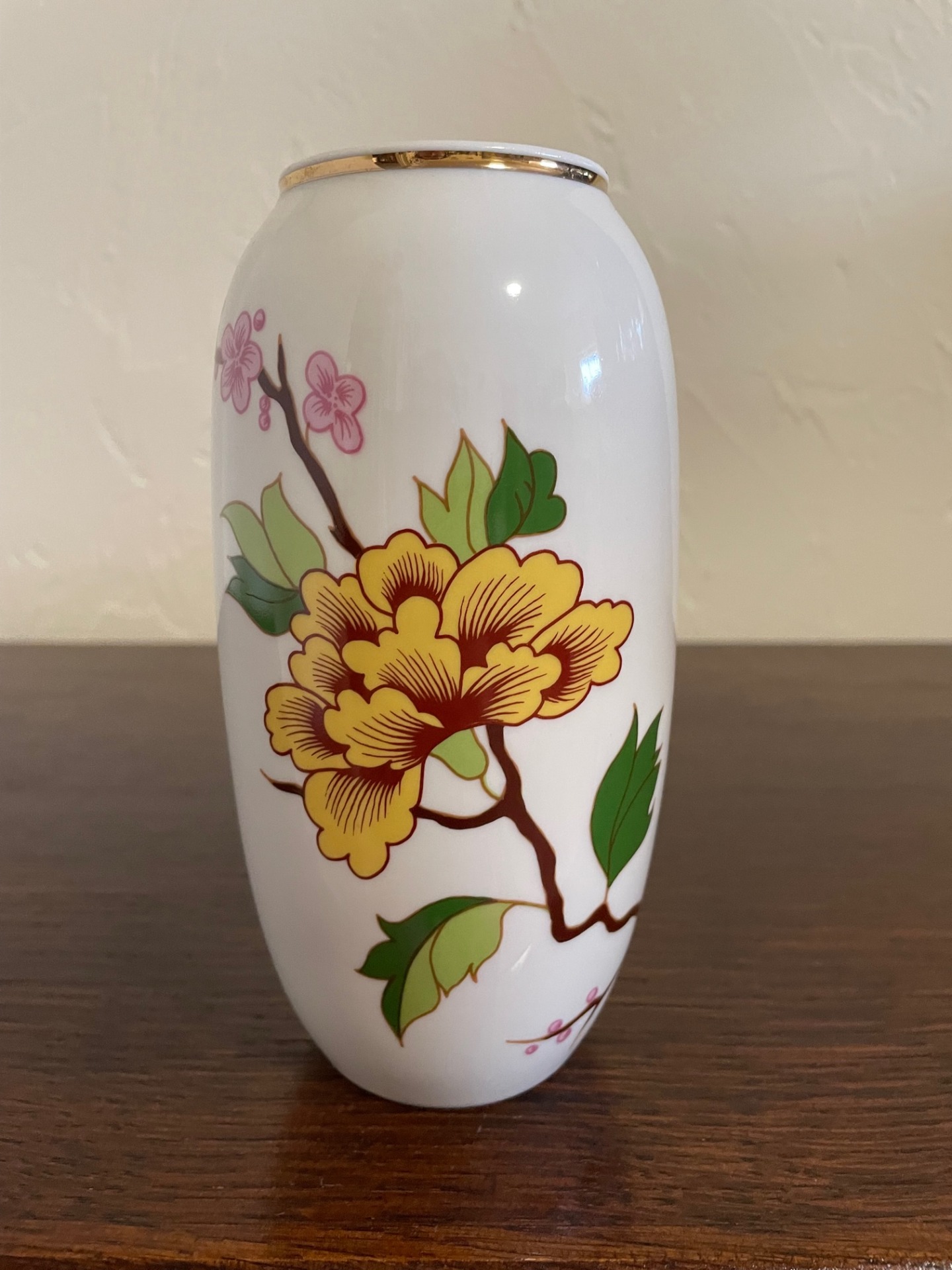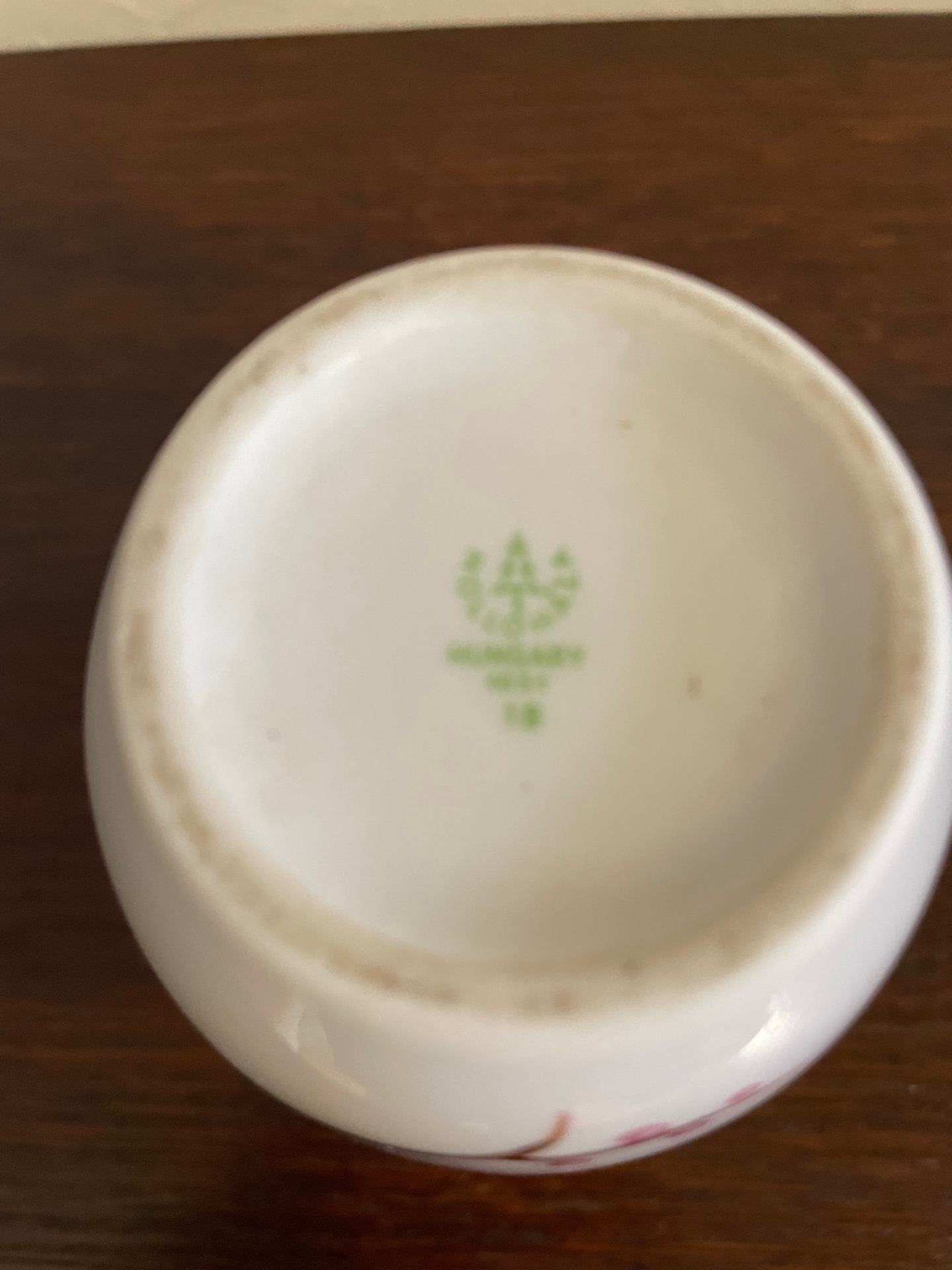 Ritka mintás, kis méretű váza Hollóházáról. Matricás, a váza szájánál arany tükörcsík látható.