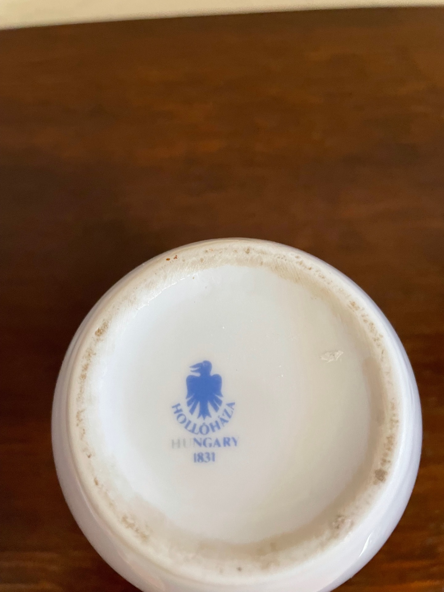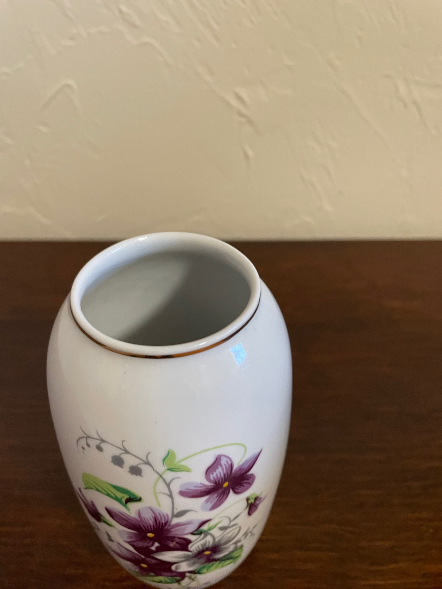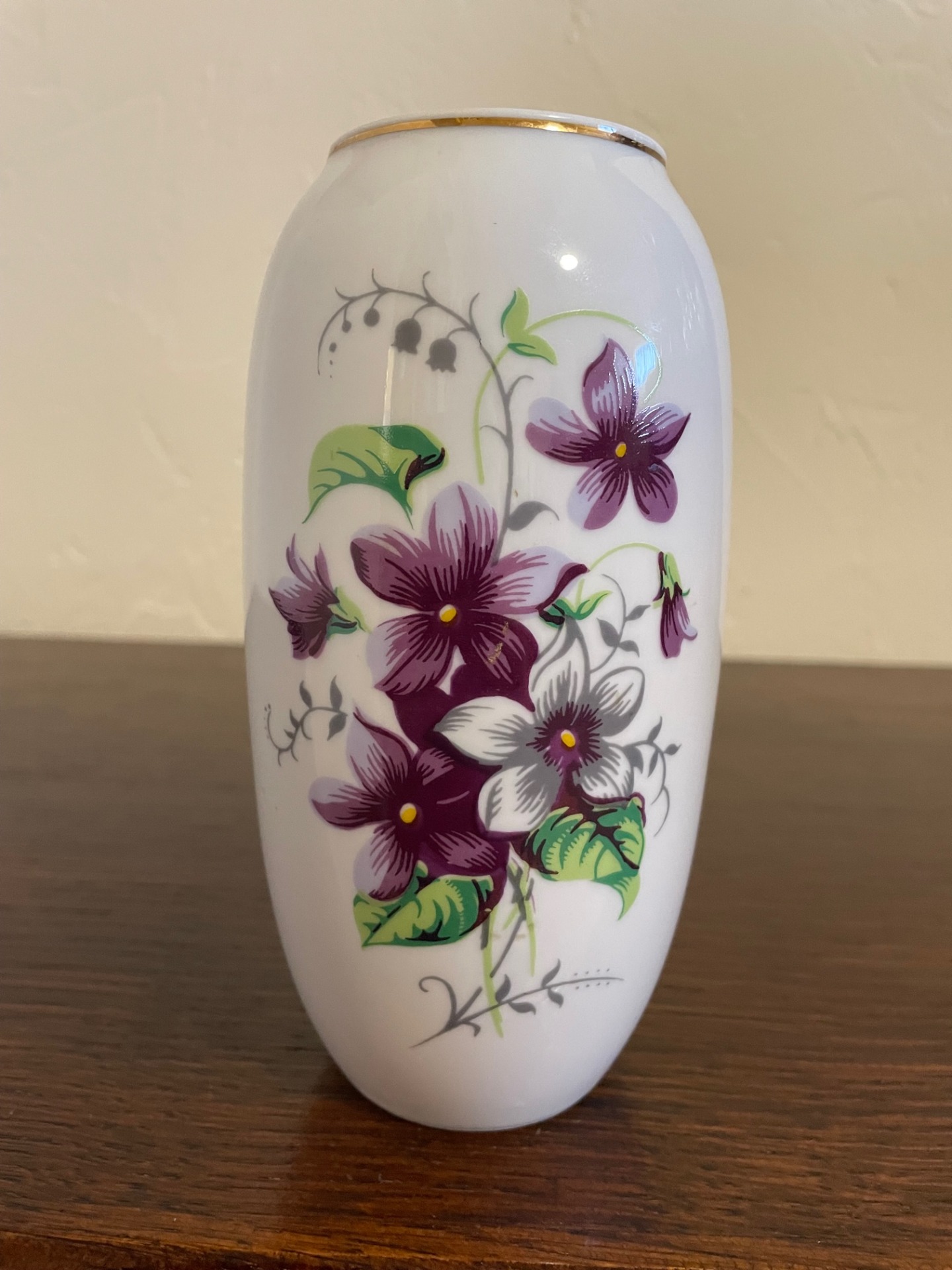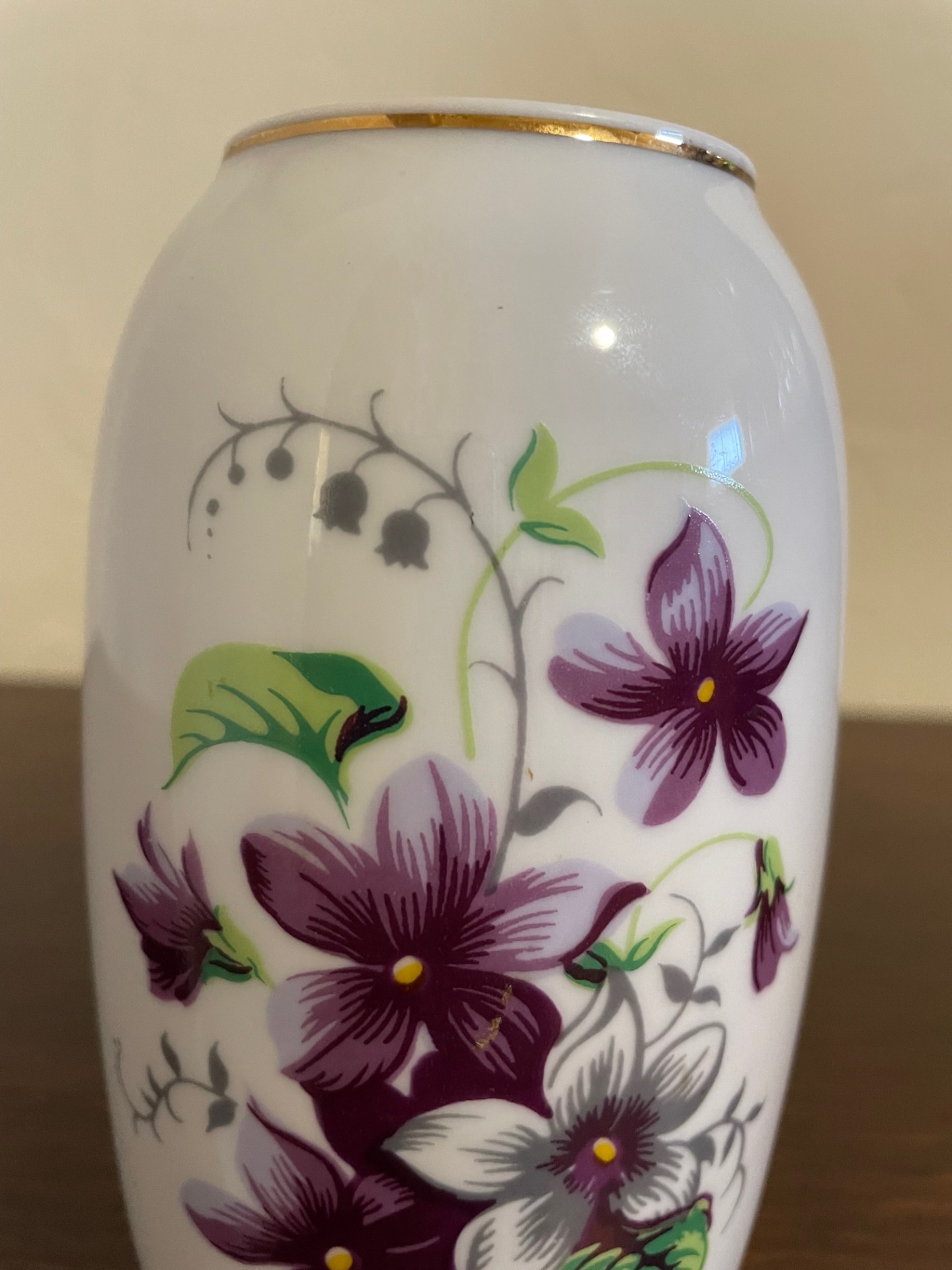 Ibolya mintás kis méretű váza, Hollóházáról. A váza szájánál dekor aranycsík látható.