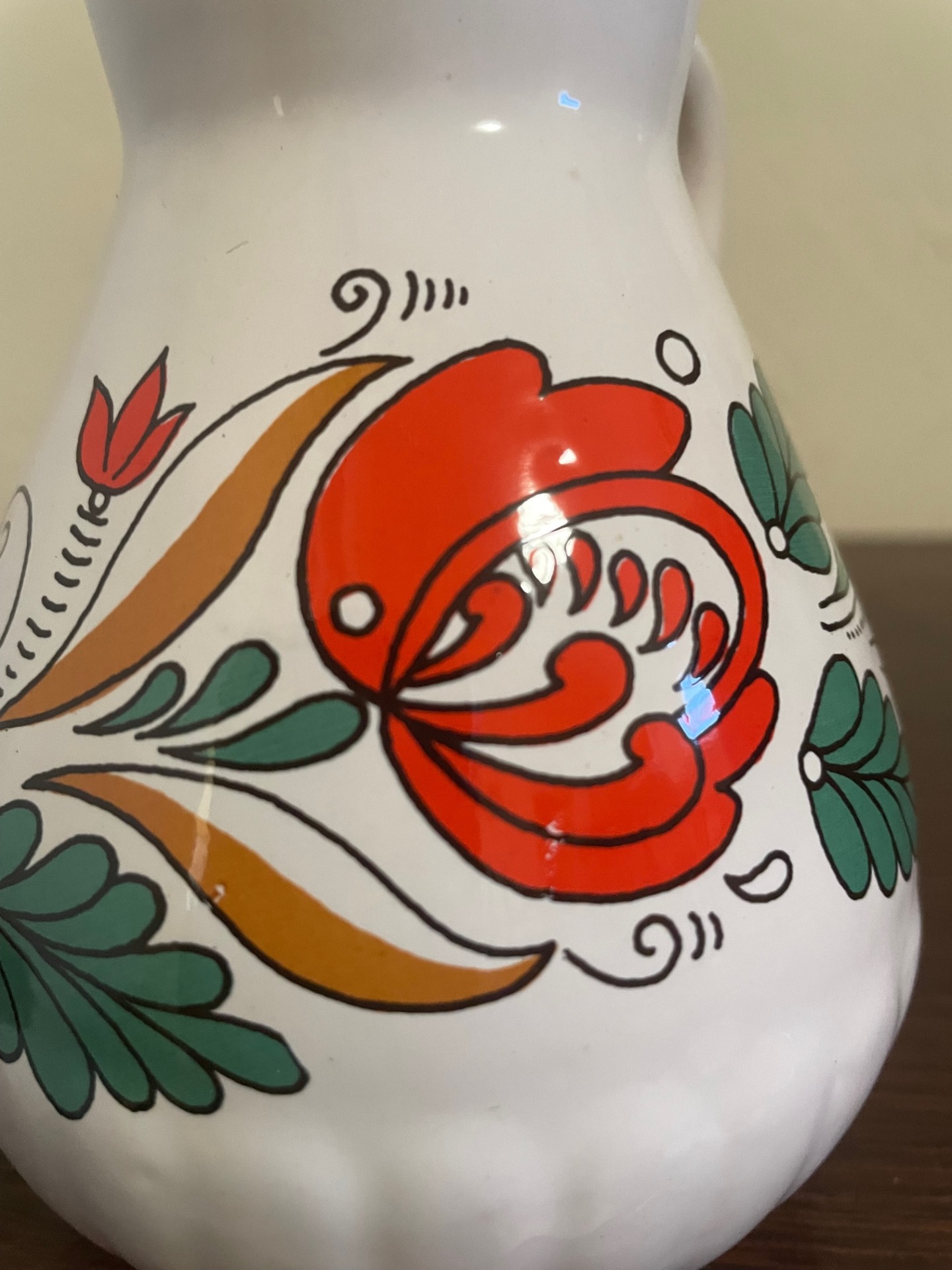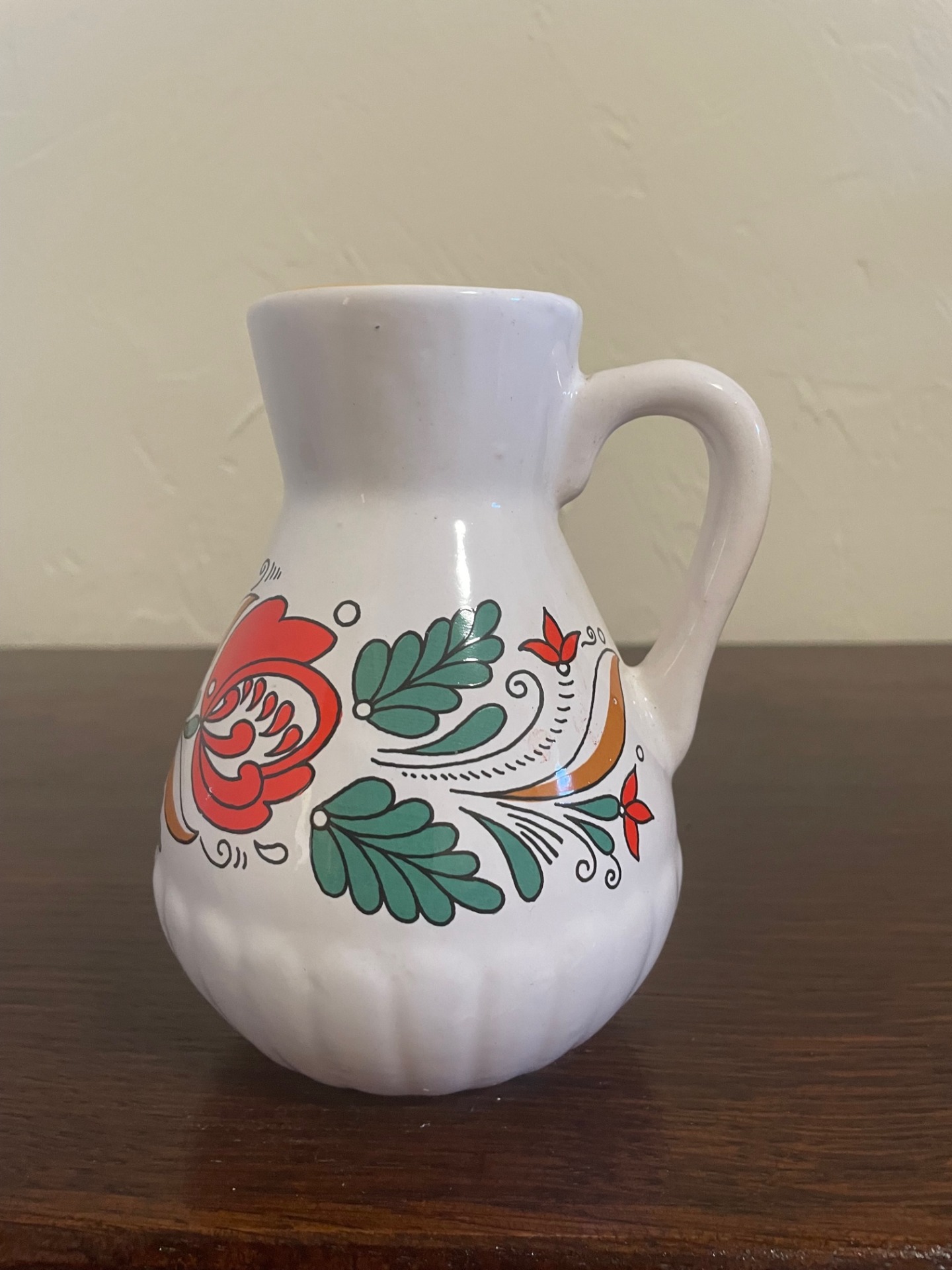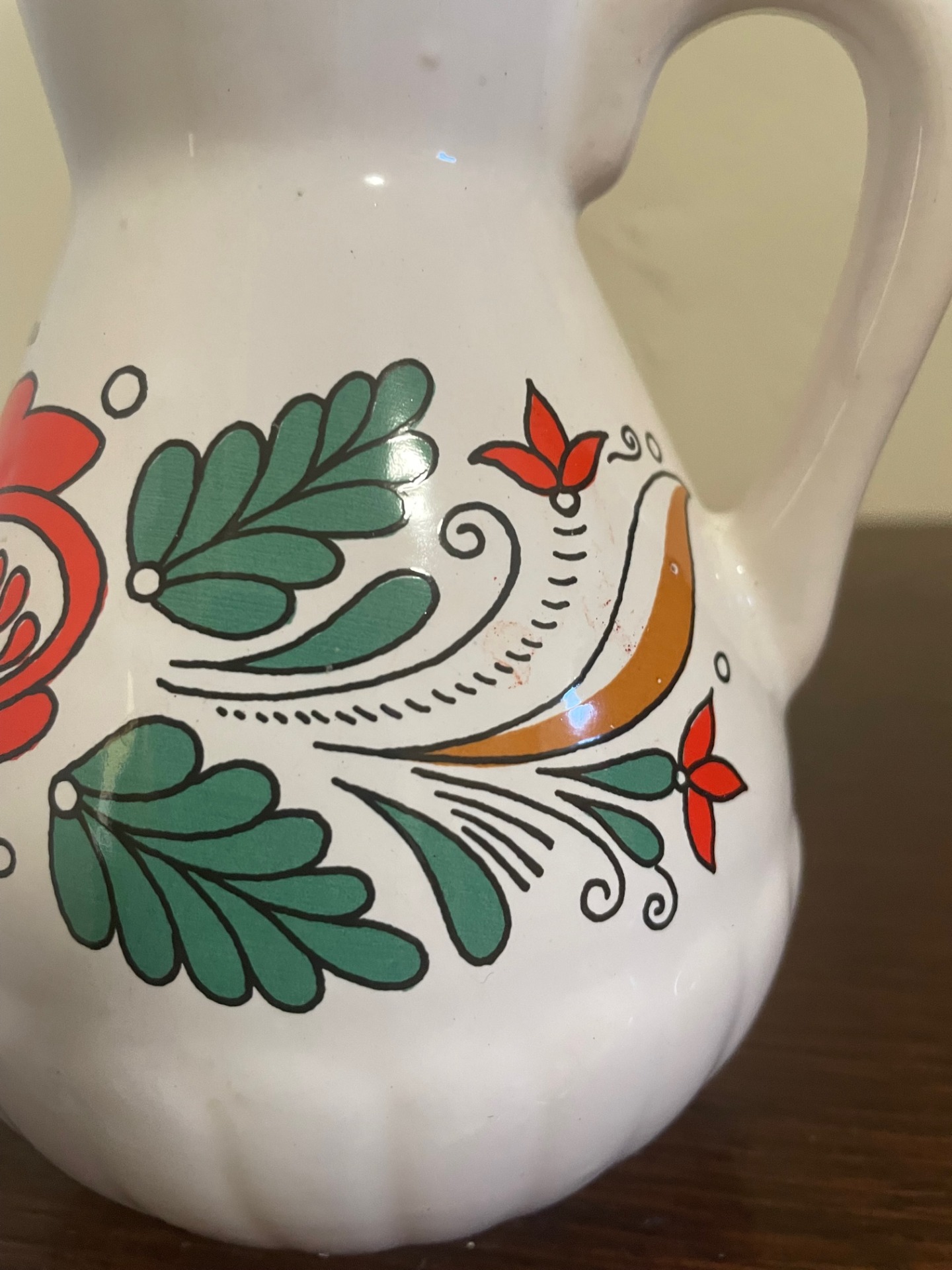 Fehér máza alapon tölgyfaleveles - rózsás népi mintasorral ellátott, önmagában is mintás kerámia bokály.