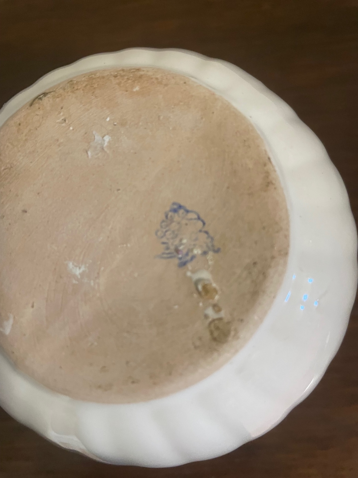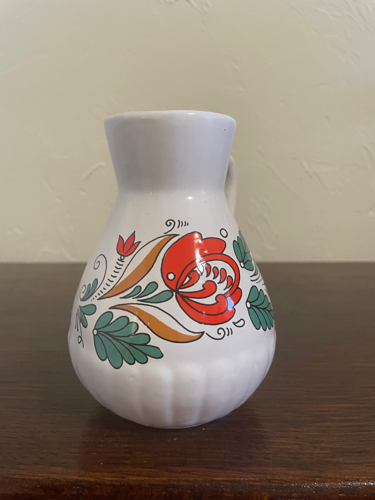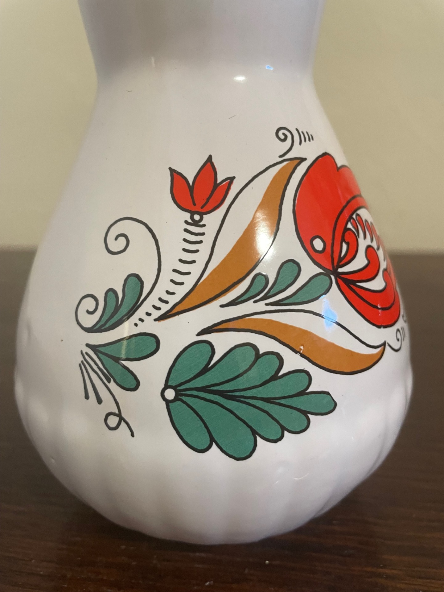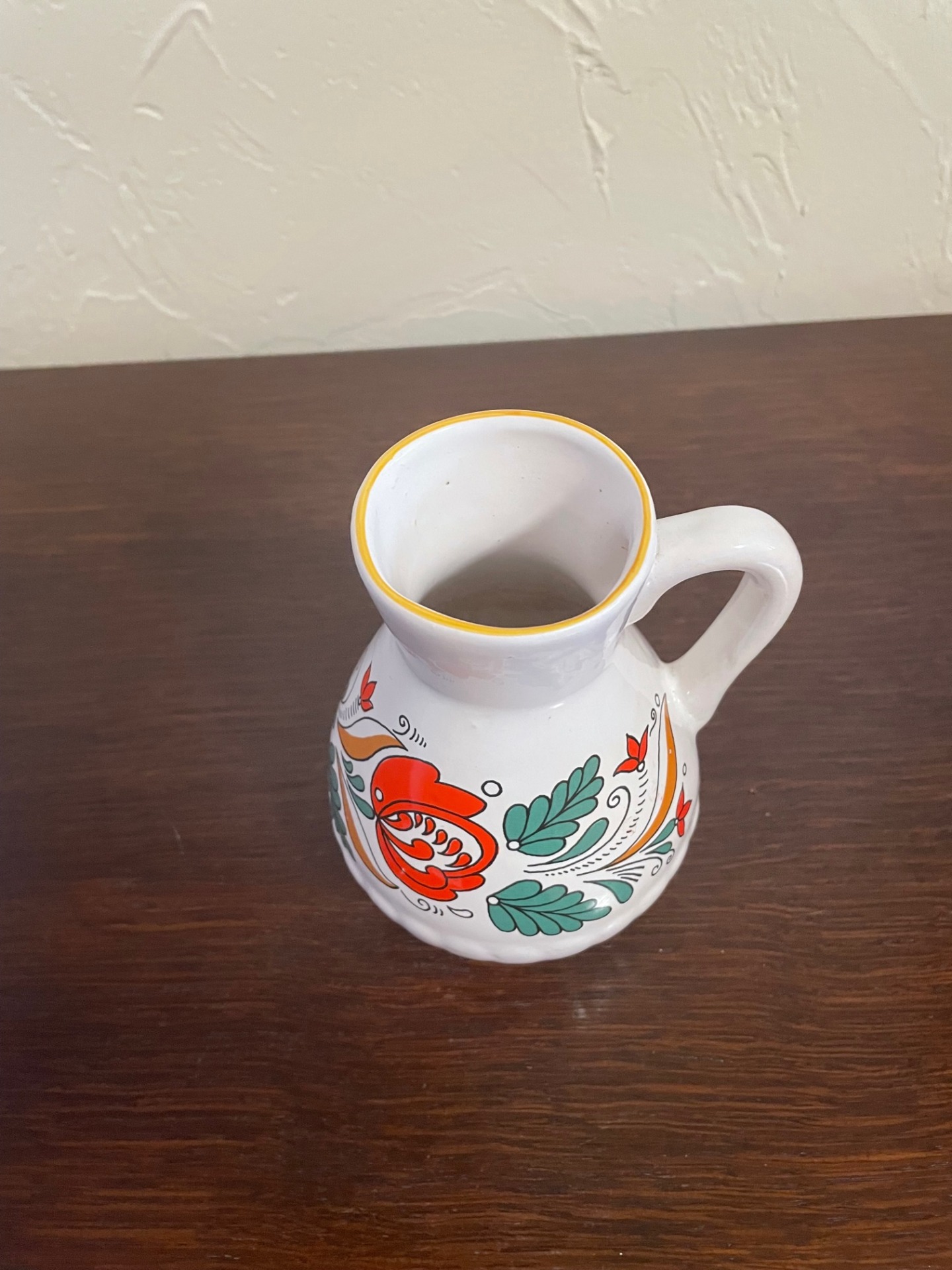 Fehér máza alapon tölgyfaleveles - rózsás népi mintasorral ellátott, önmagában is mintás kerámia bokály.