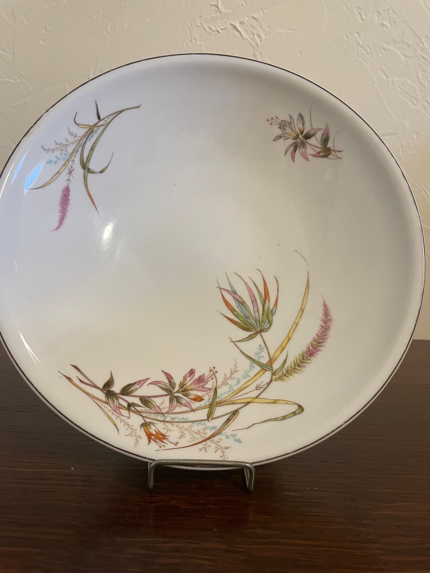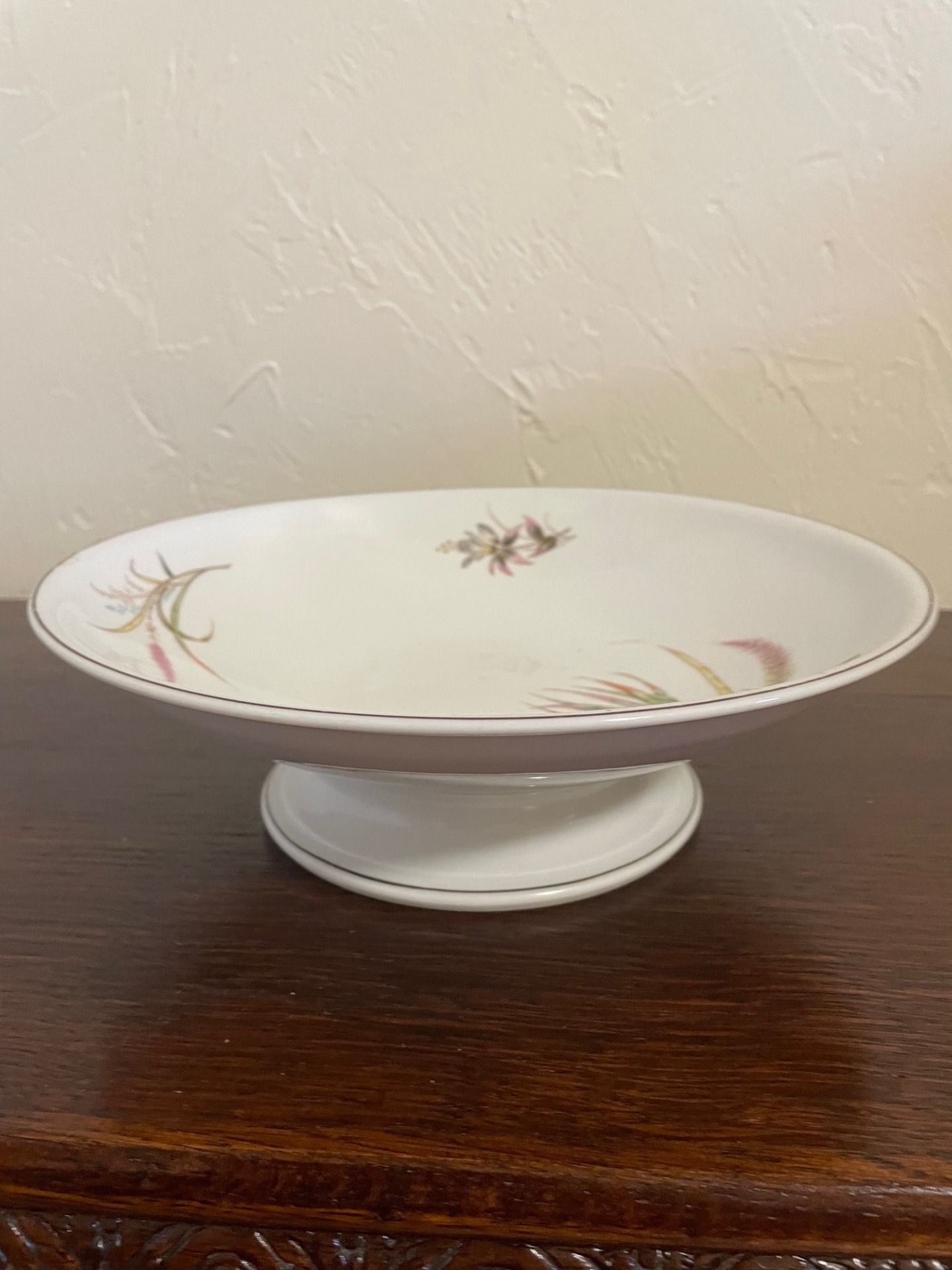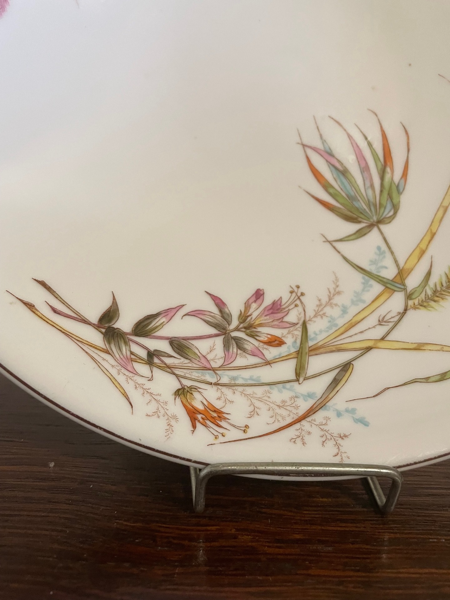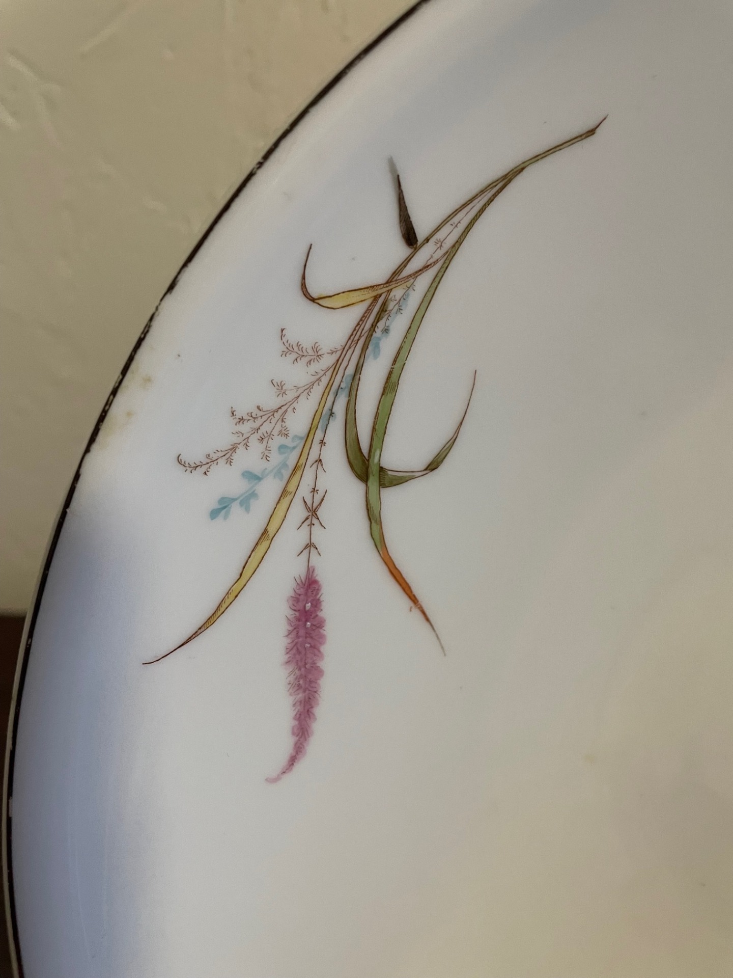 Mezei virágokkal, a kínáló peremén aranycsíkkal díszítette Láng Mihály porcelánfestő ezt az emeletes kínálót.