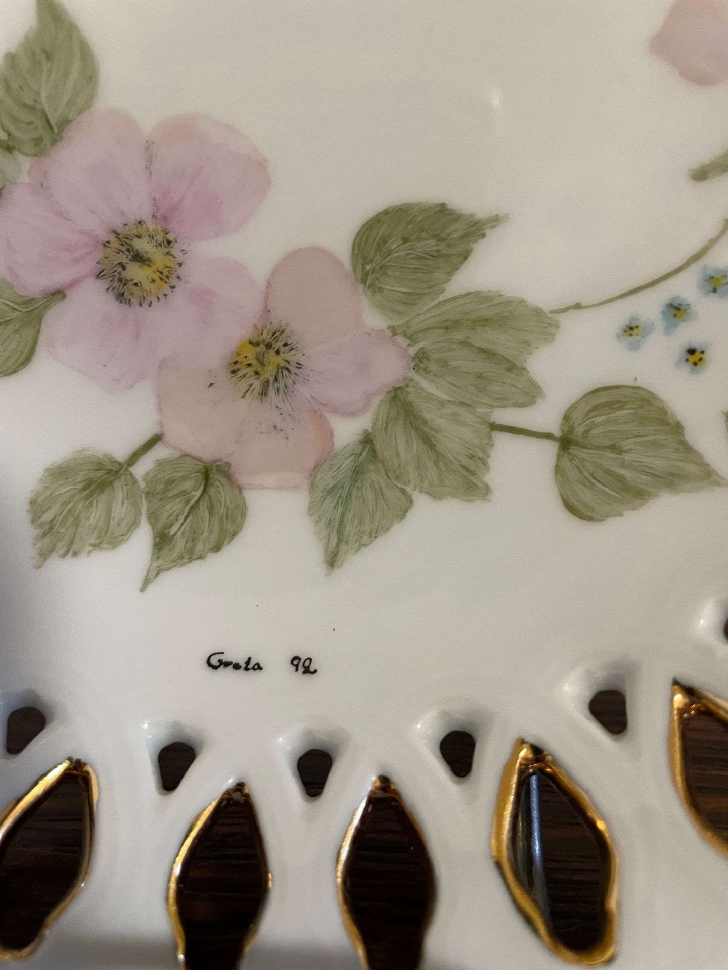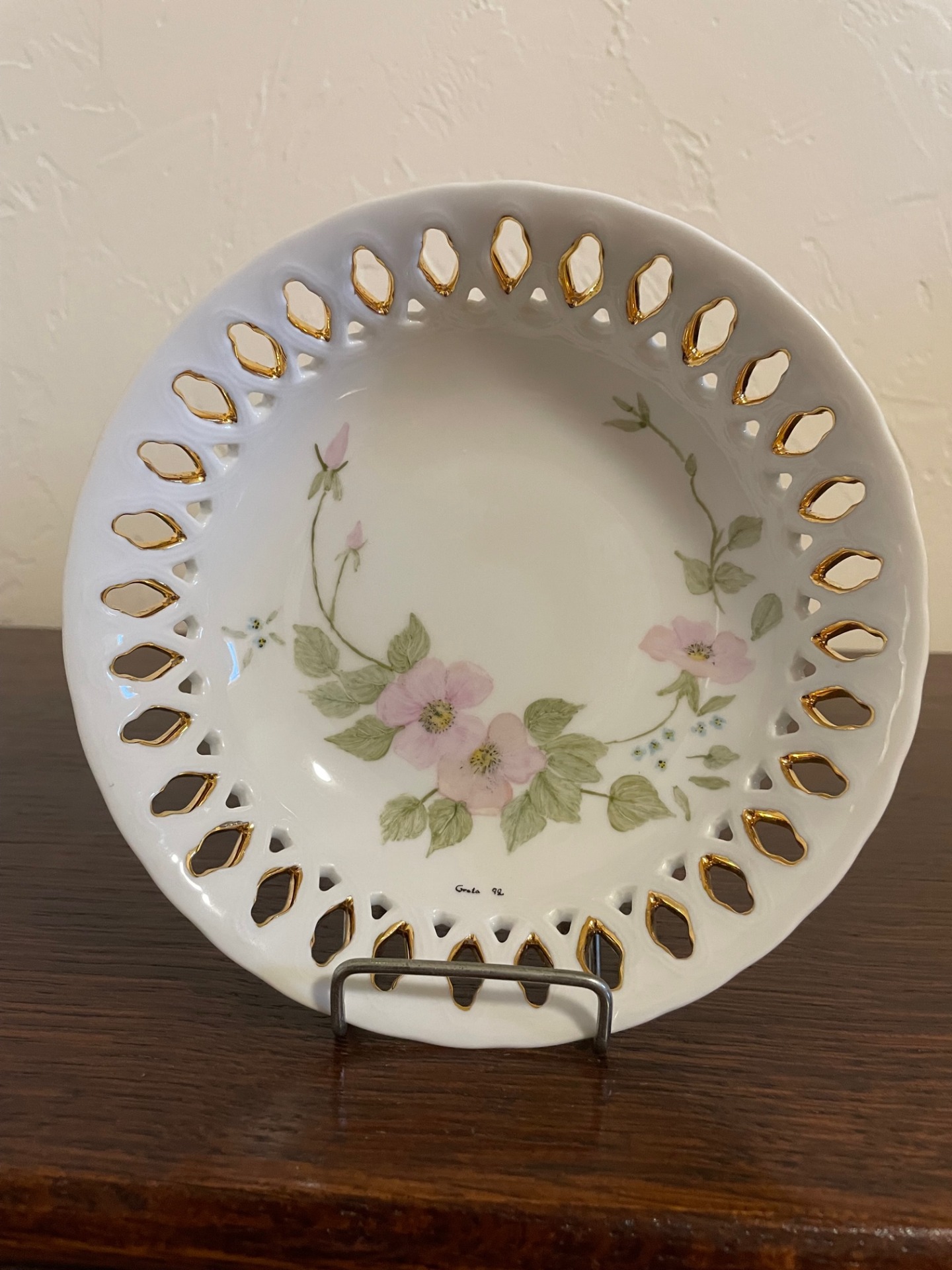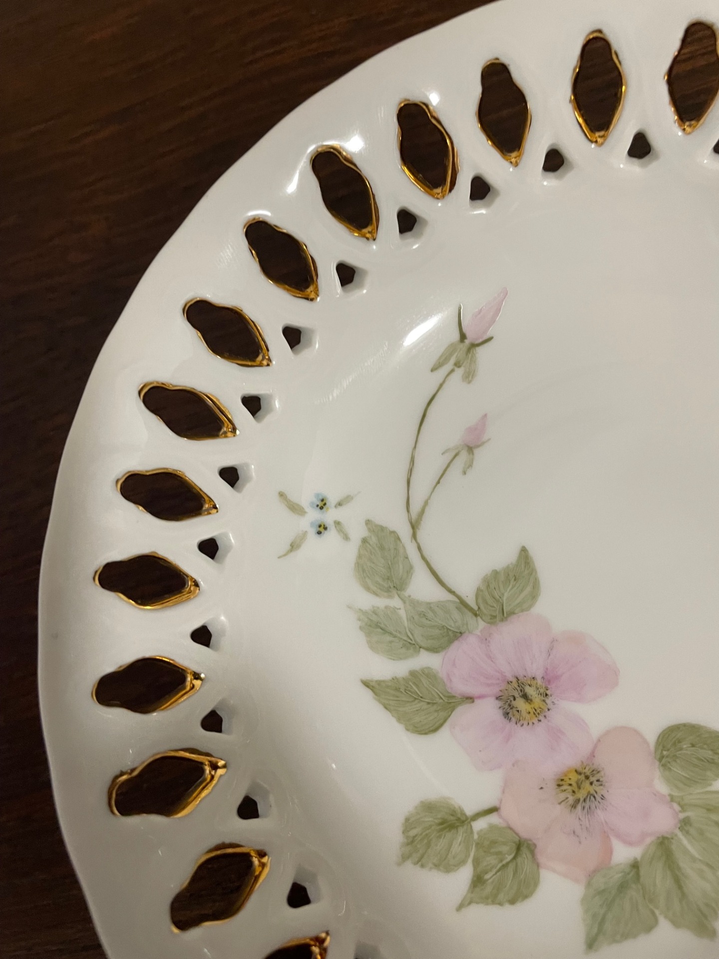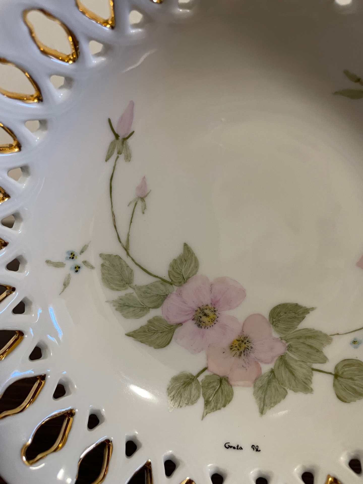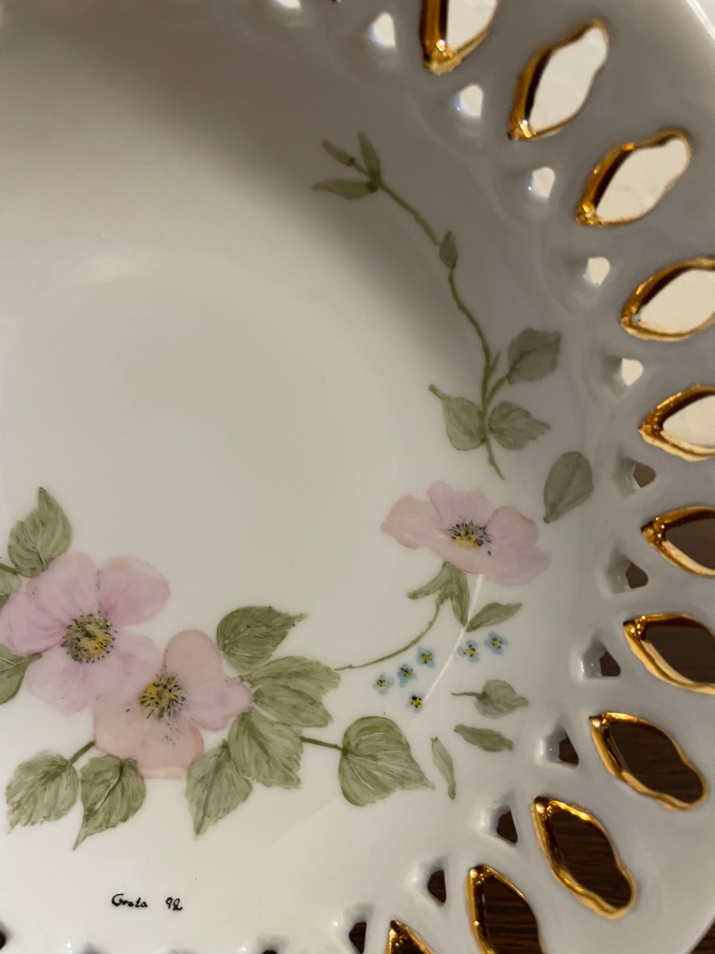 Mályvavirágos, áttört dísztányér. Különlegessége: az azsúrban belülről látható az aranyozás.