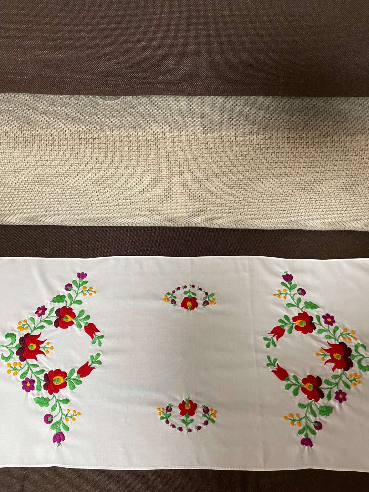 Matyó futó terítő, gömb formába forduló virágokkal.