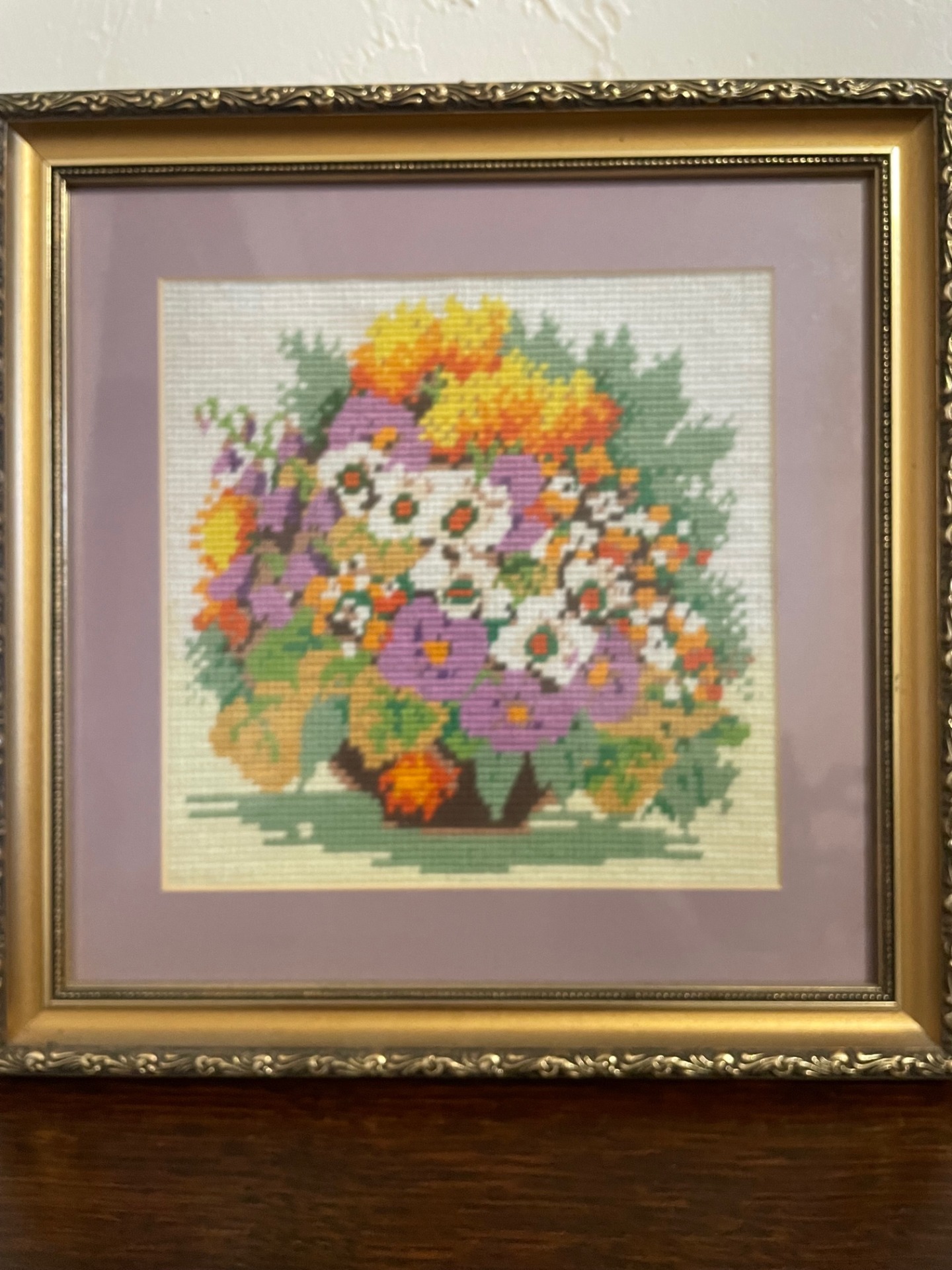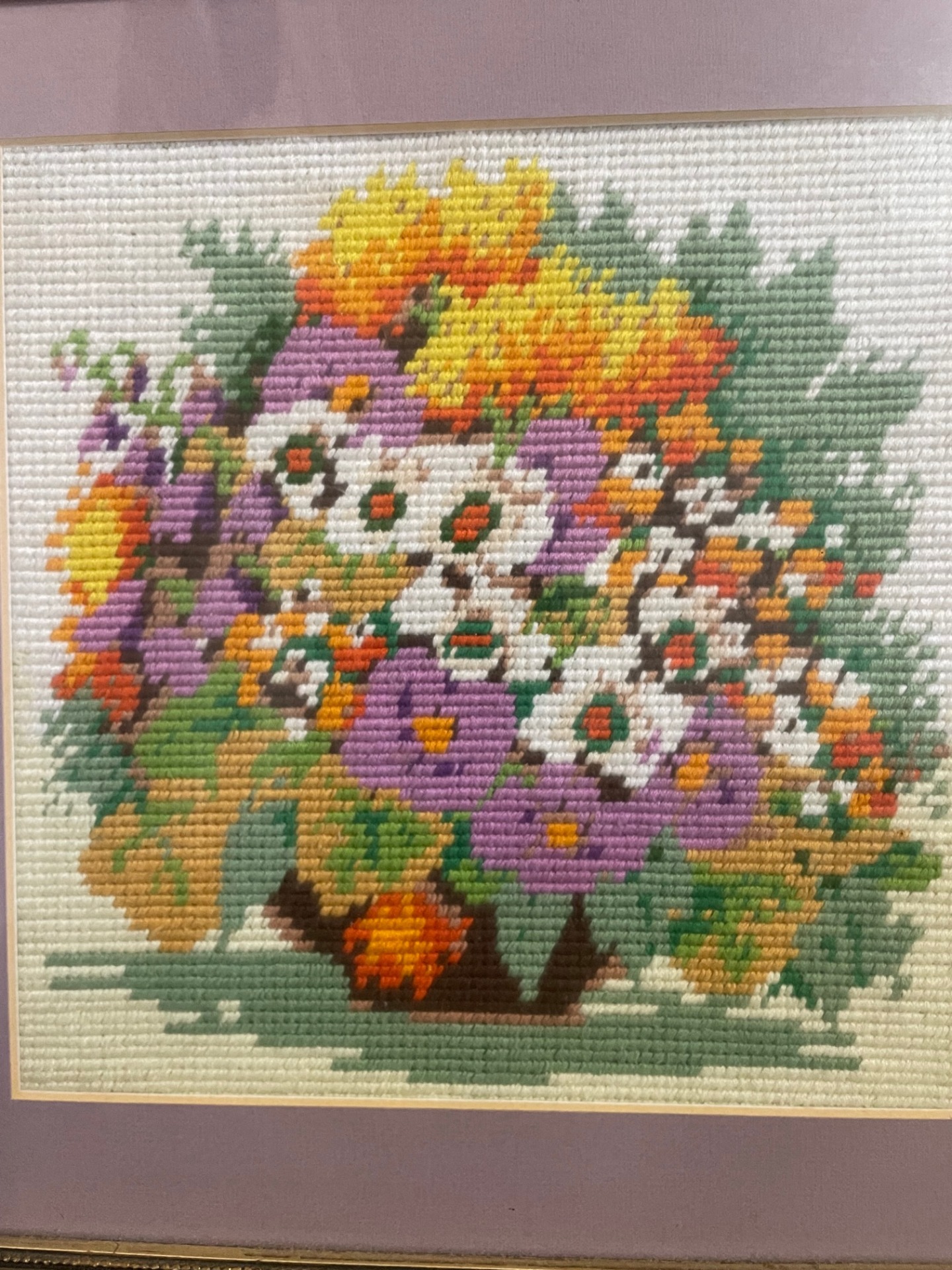 Goblen technikával hímezett virág-csendélet, mezei virágokból - falikép.