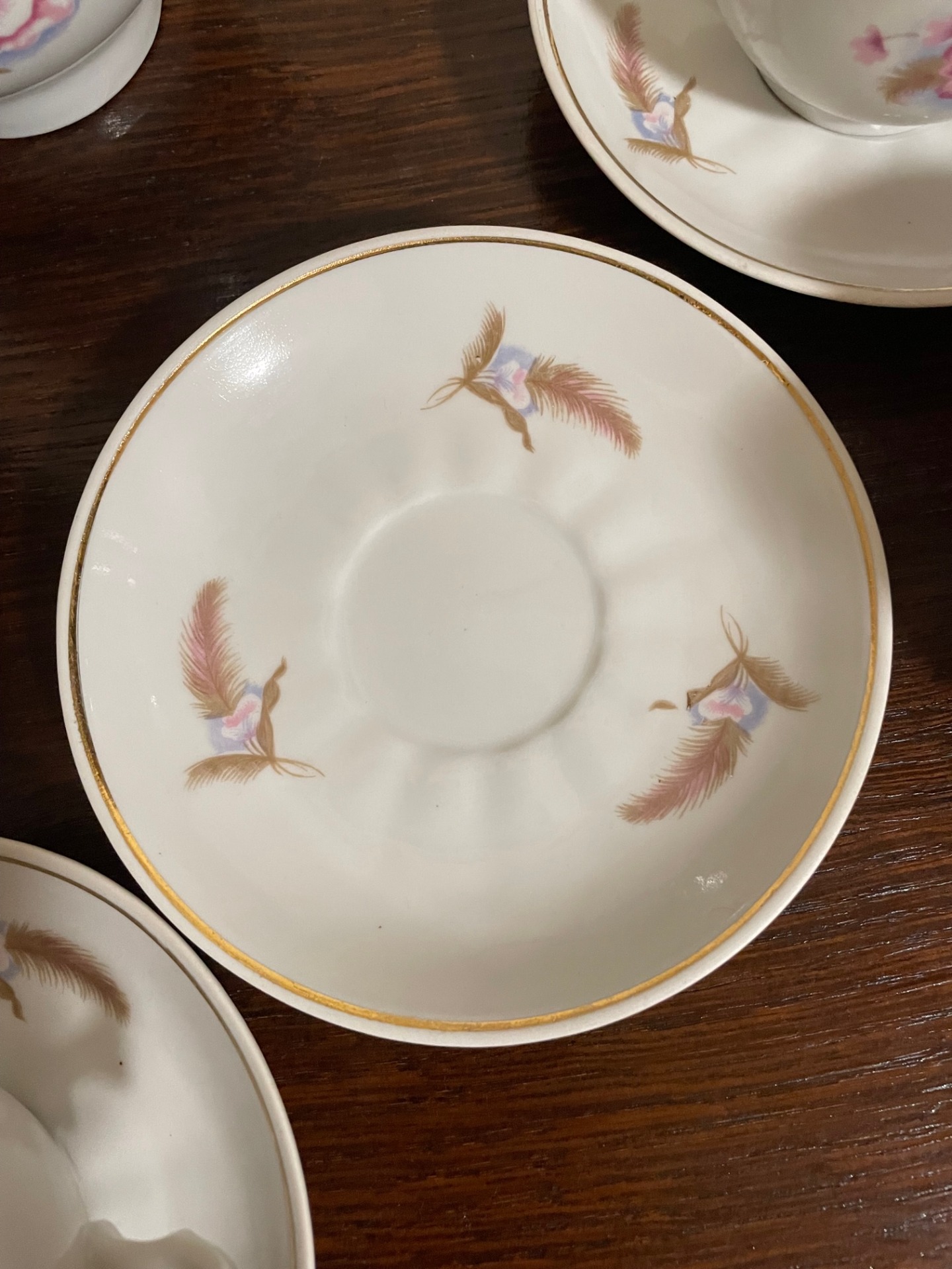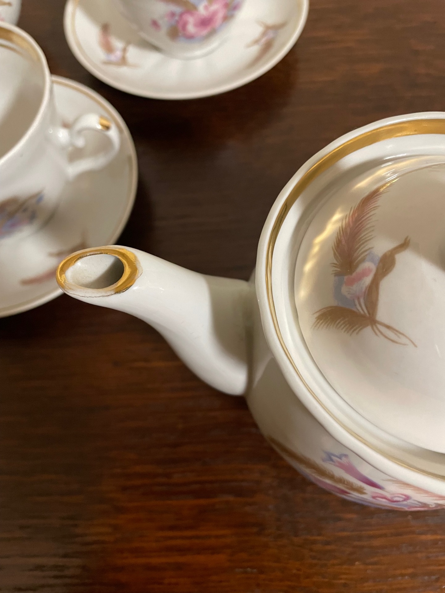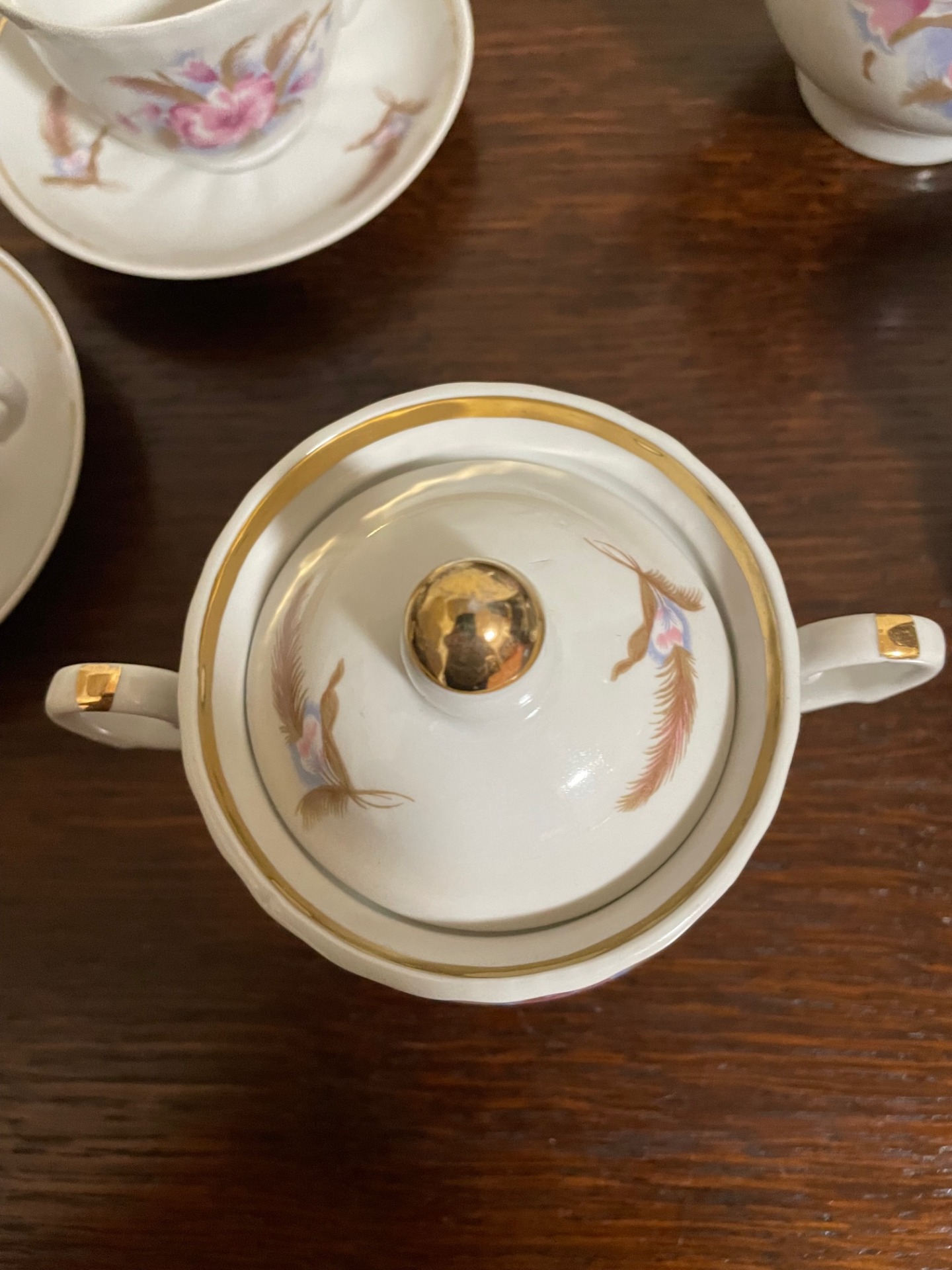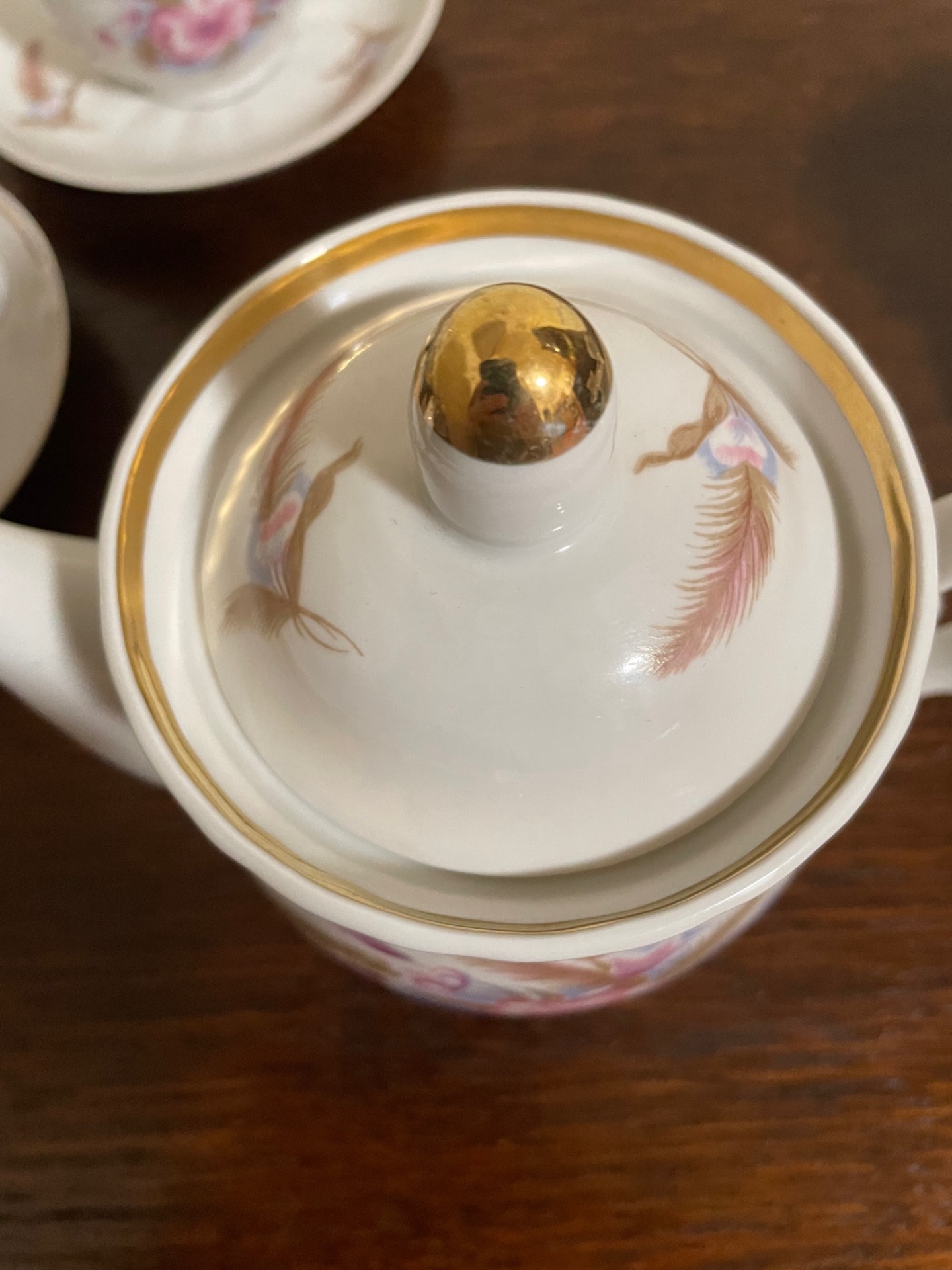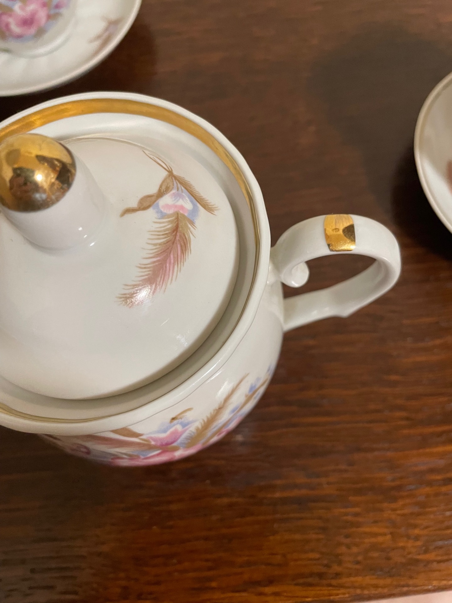 A virágok és a tollak a csészék és a kiöntők mindkét oldalán, a pávatollak a kistányérokon, és a kiöntők fedelén láthatók. A csészék belső peremén egy vastag és egy vékony aranycsík. a kiöntők pereménél vastag aranycsík, a kiöntők fedelén arany-kalap található.