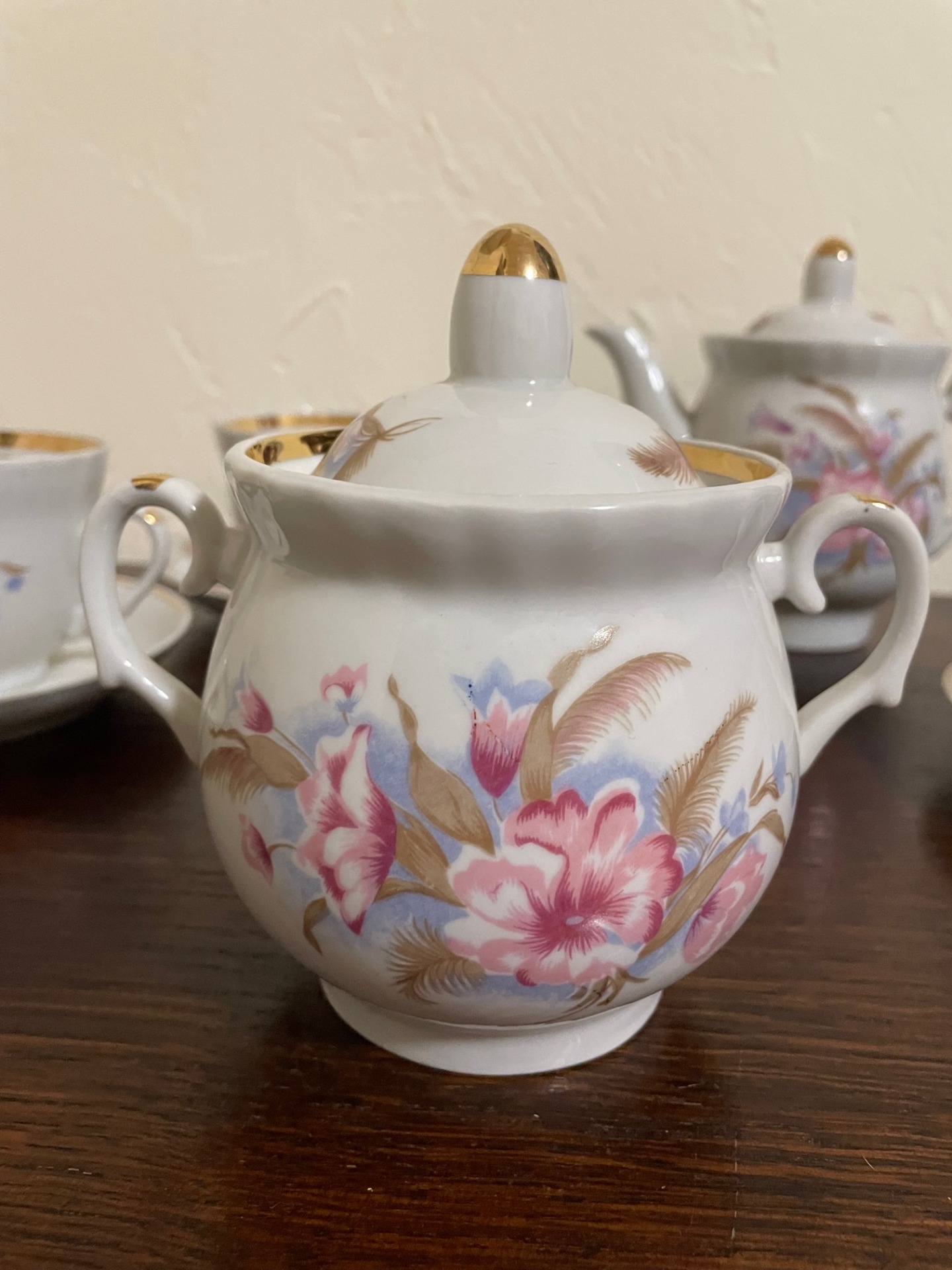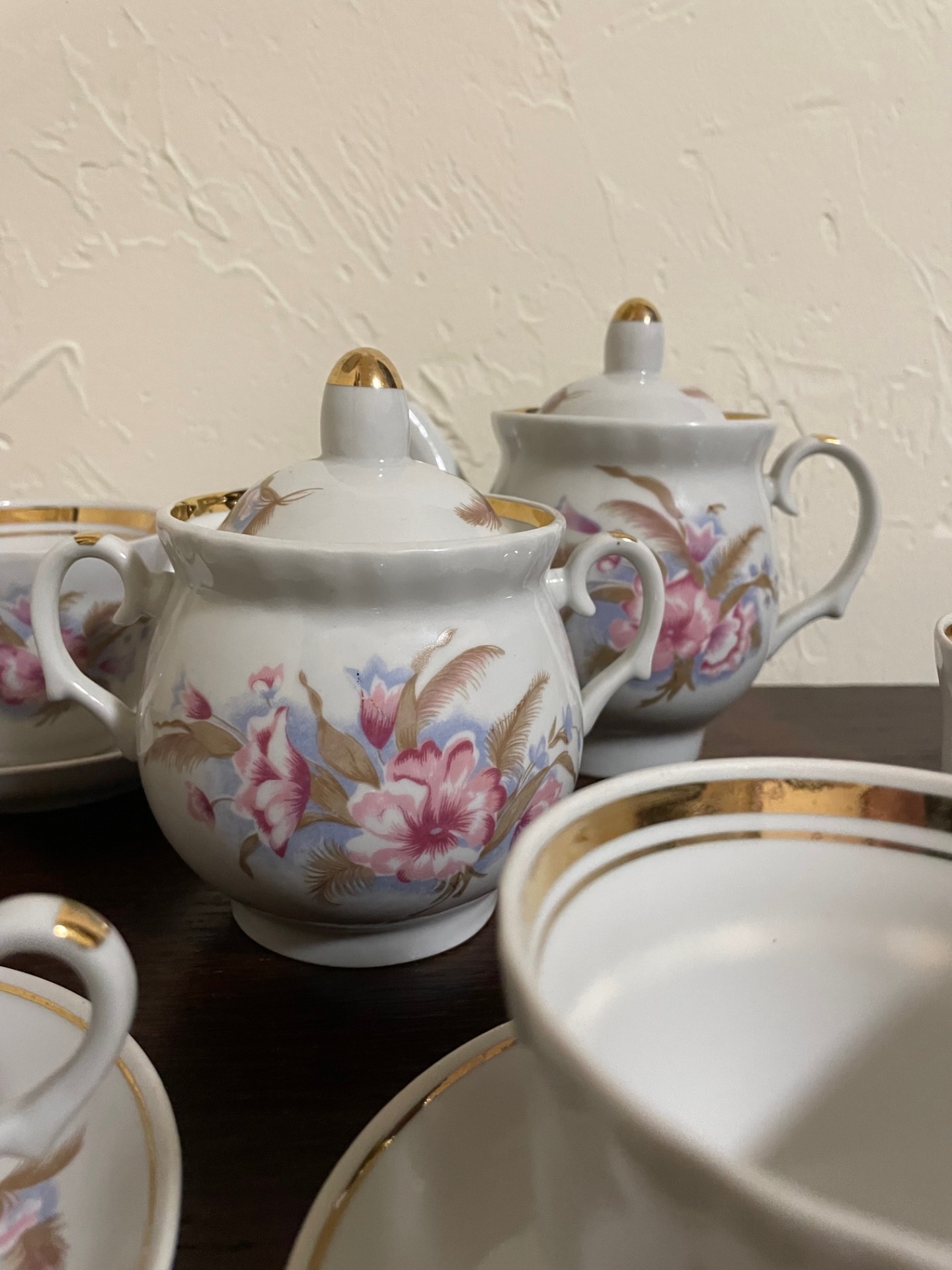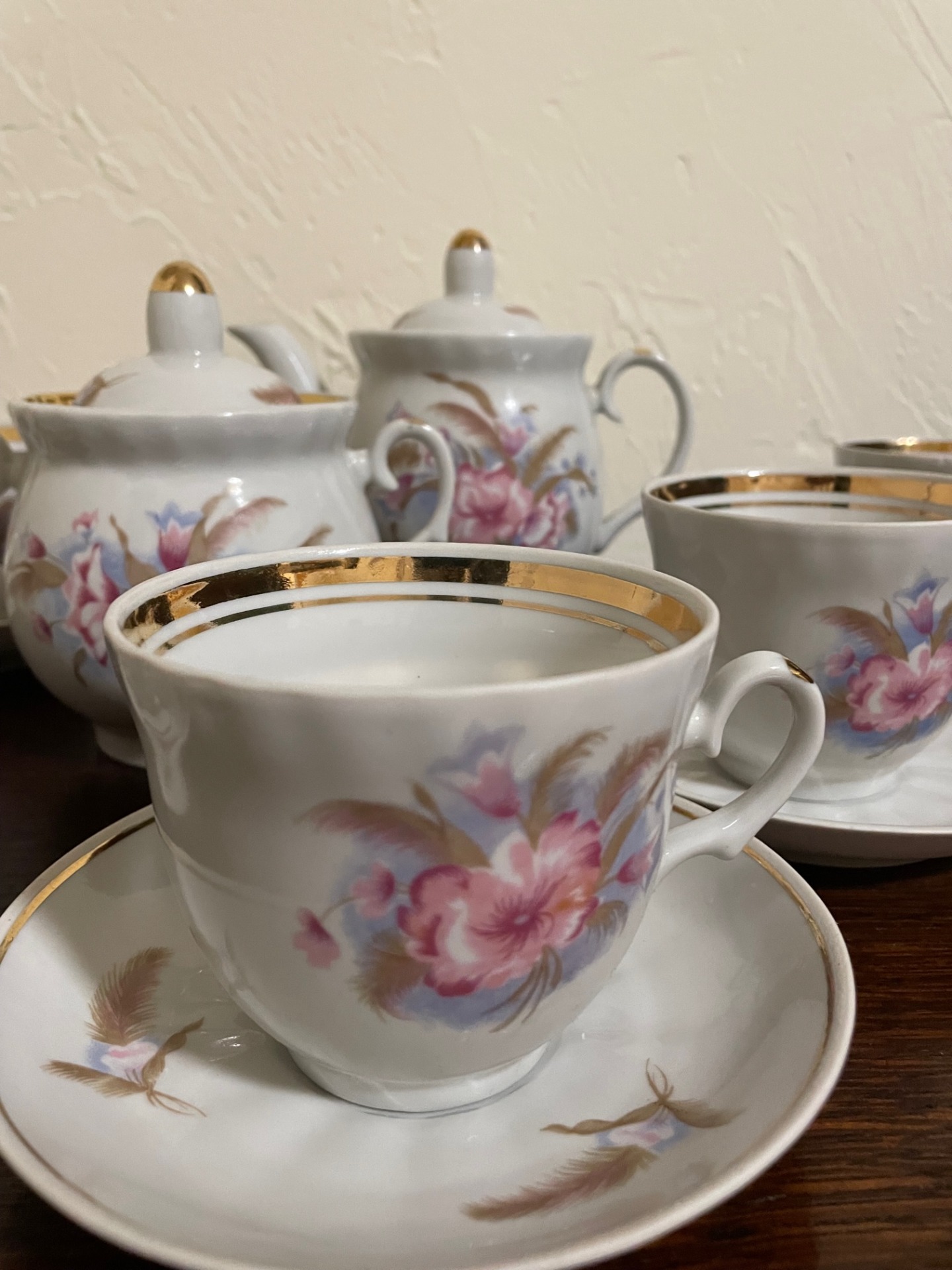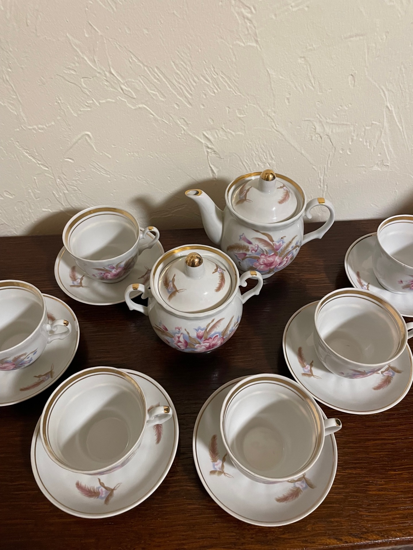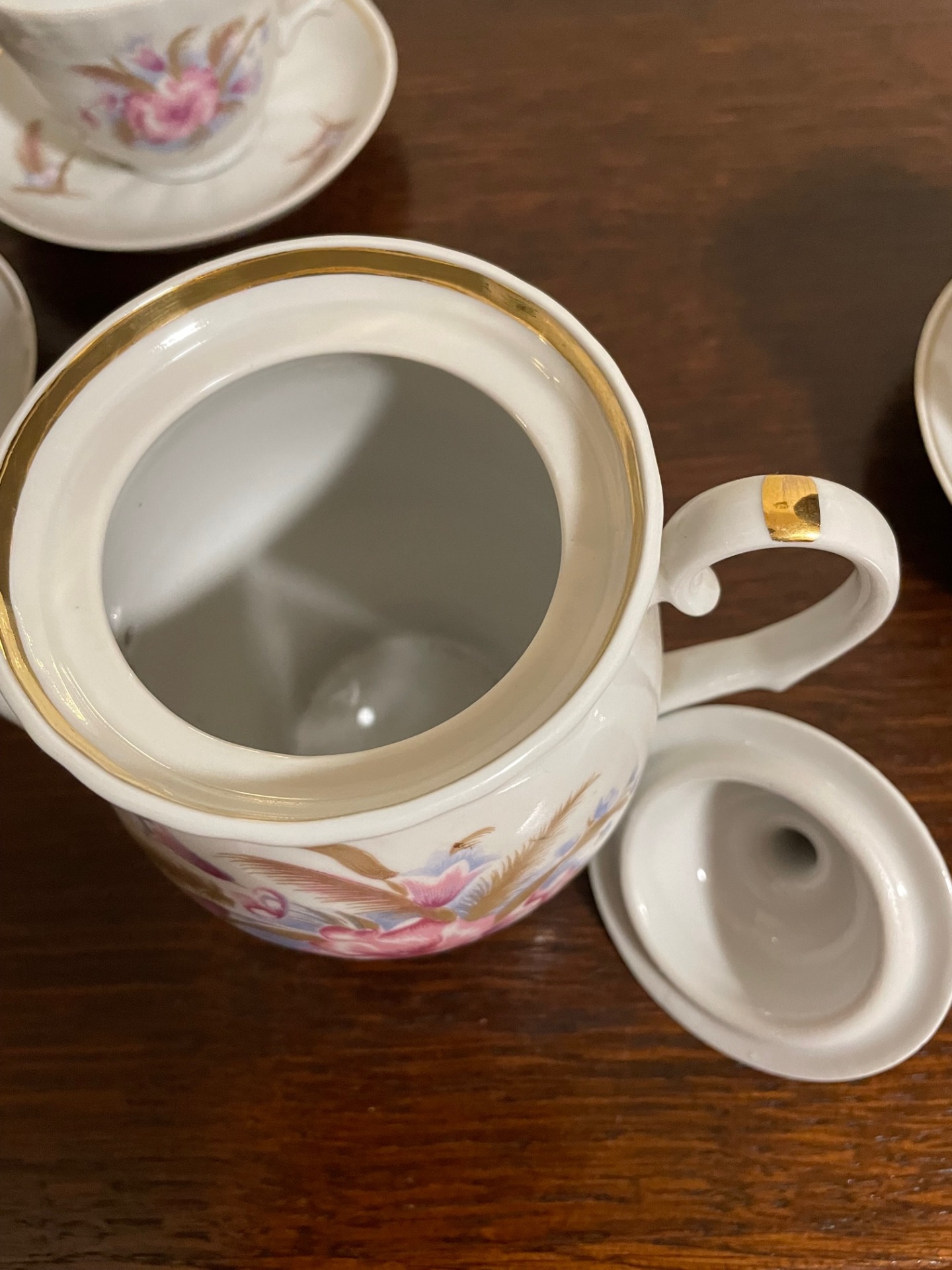 A virágok és a tollak a csészék és a kiöntők mindkét oldalán, a pávatollak a kistányérokon, és a kiöntők fedelén láthatók. A csészék belső peremén egy vastag és egy vékony aranycsík. a kiöntők pereménél vastag aranycsík, a kiöntők fedelén arany-kalap található.