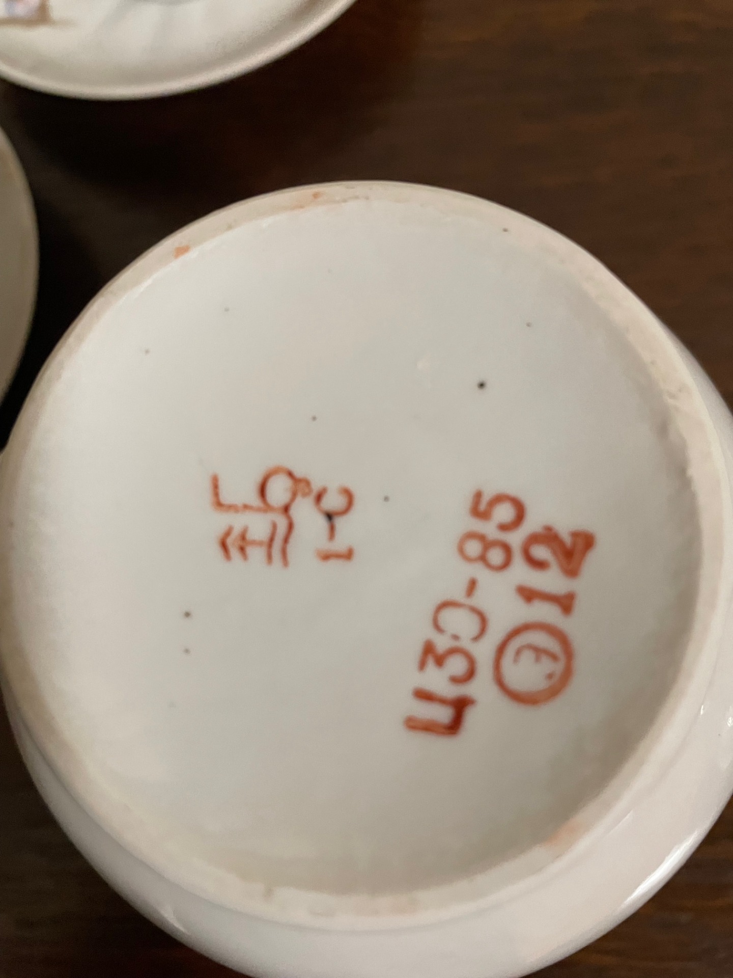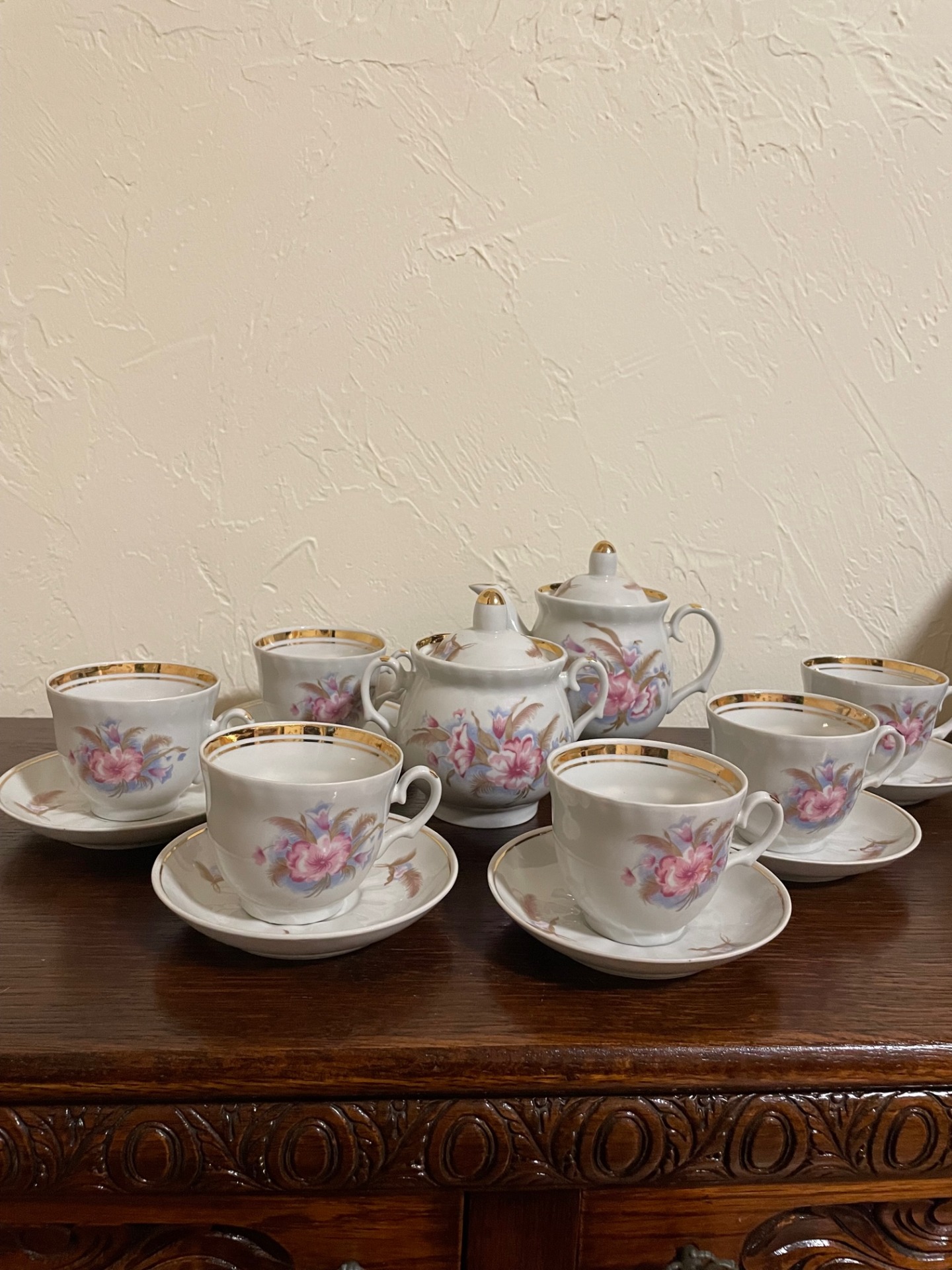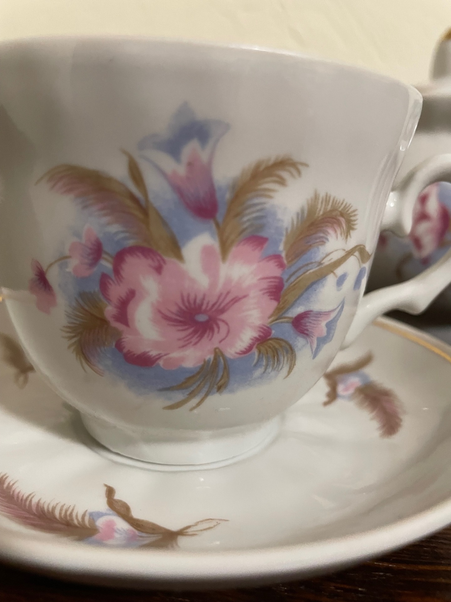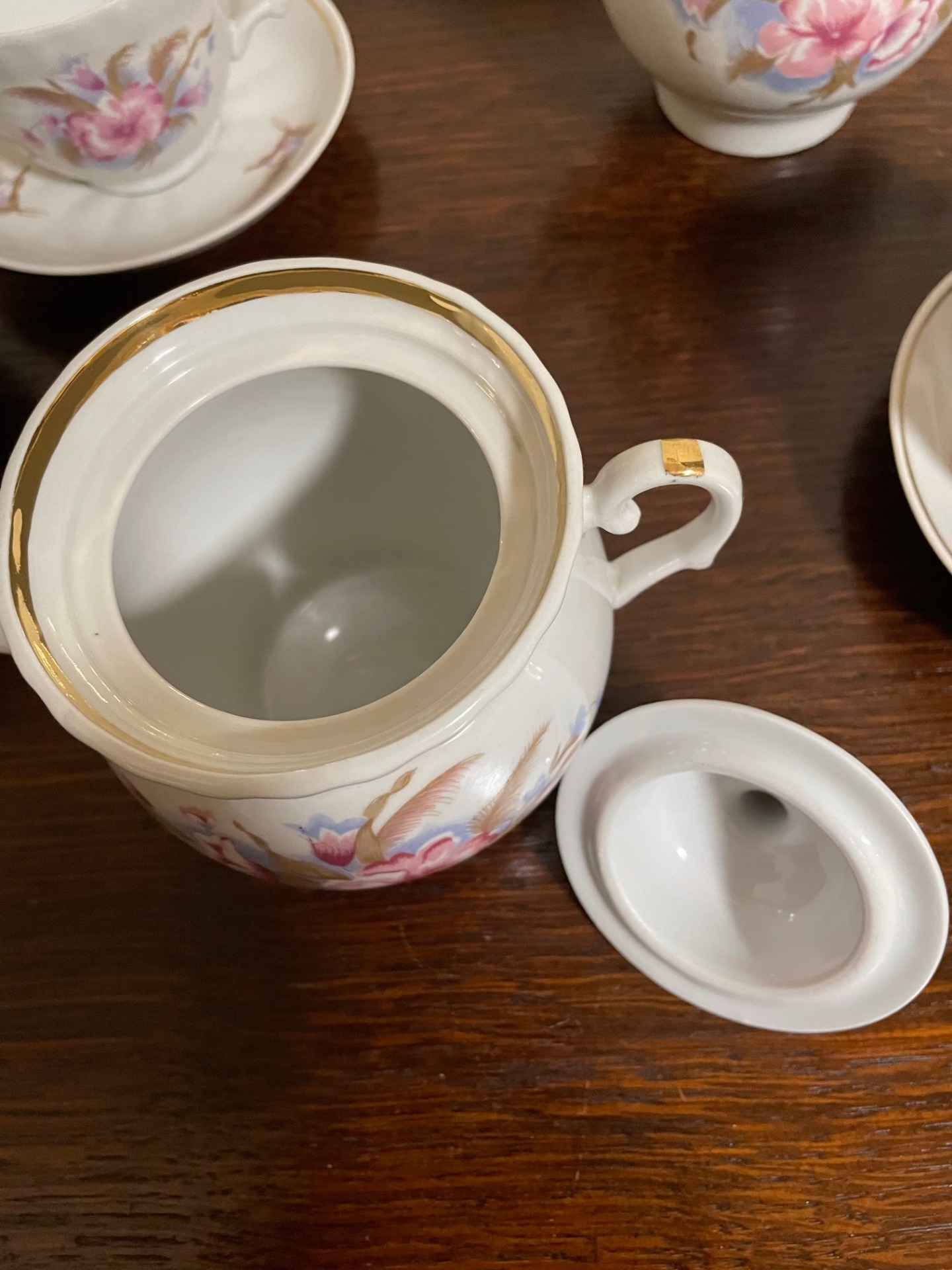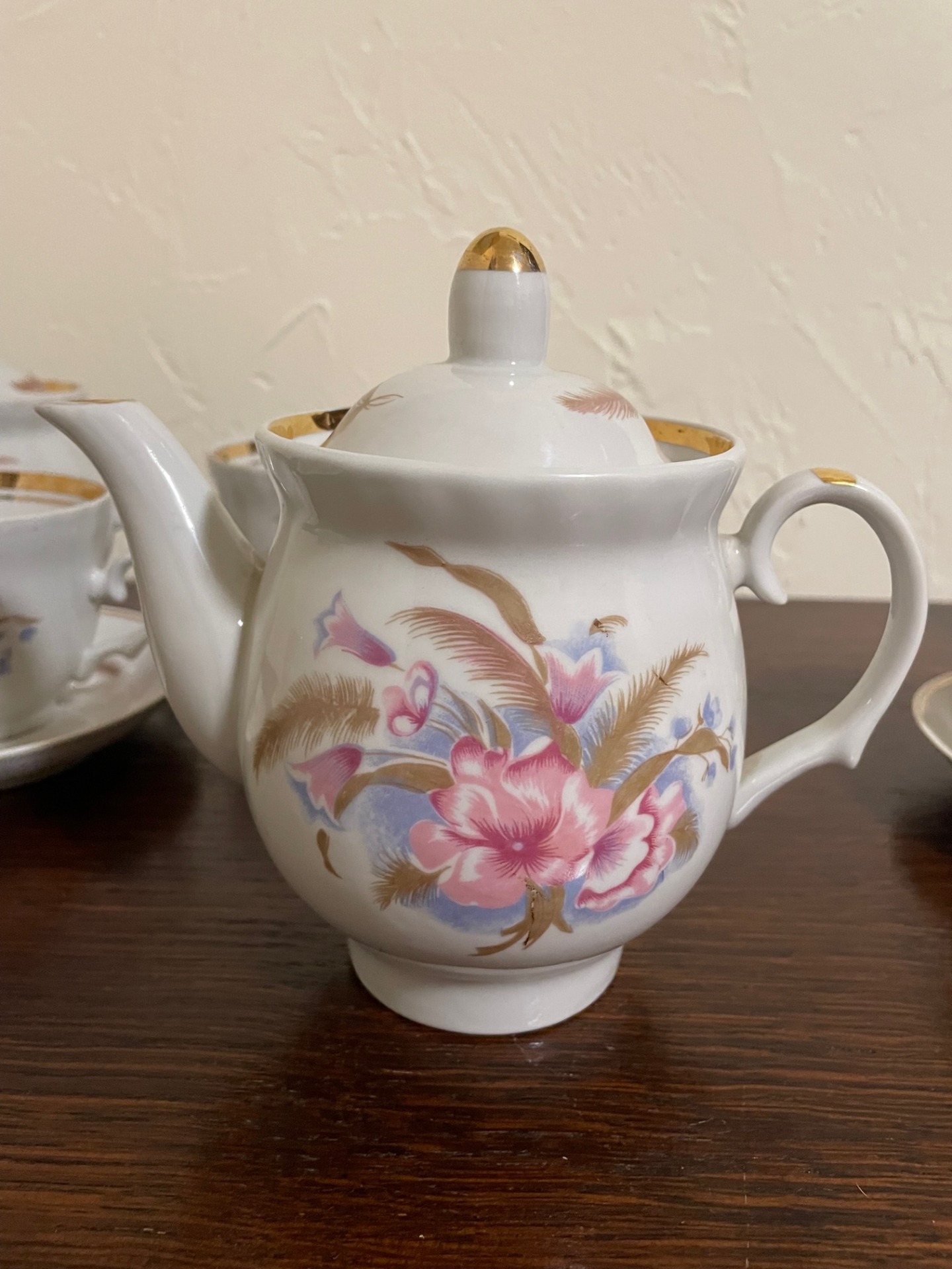 A virágok és a tollak a csészék és a kiöntők mindkét oldalán, a pávatollak a kistányérokon, és a kiöntők fedelén láthatók. A csészék belső peremén egy vastag és egy vékony aranycsík. a kiöntők pereménél vastag aranycsík, a kiöntők fedelén arany-kalap található.
