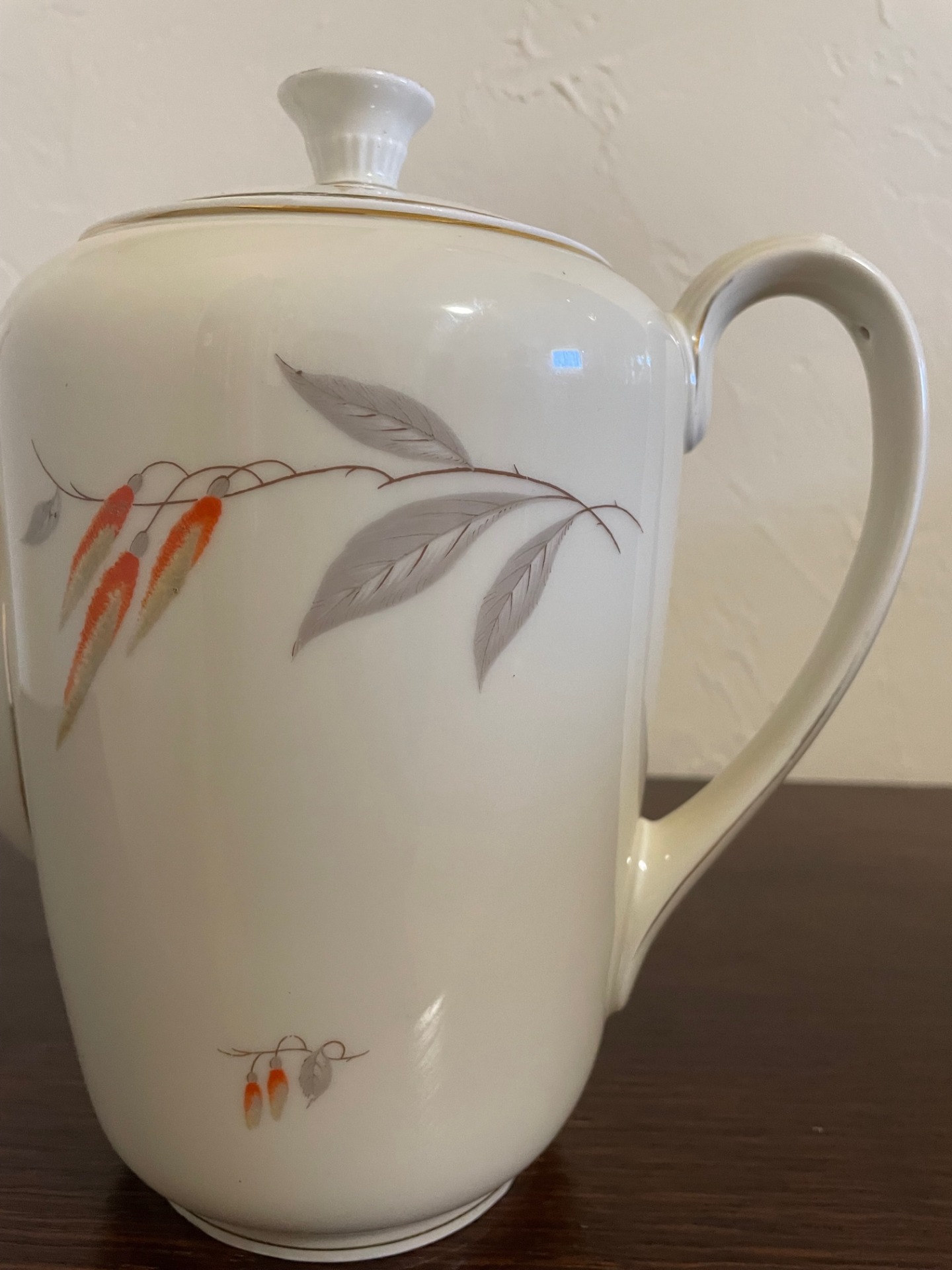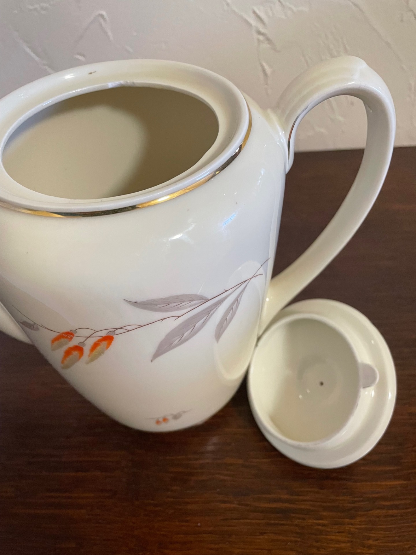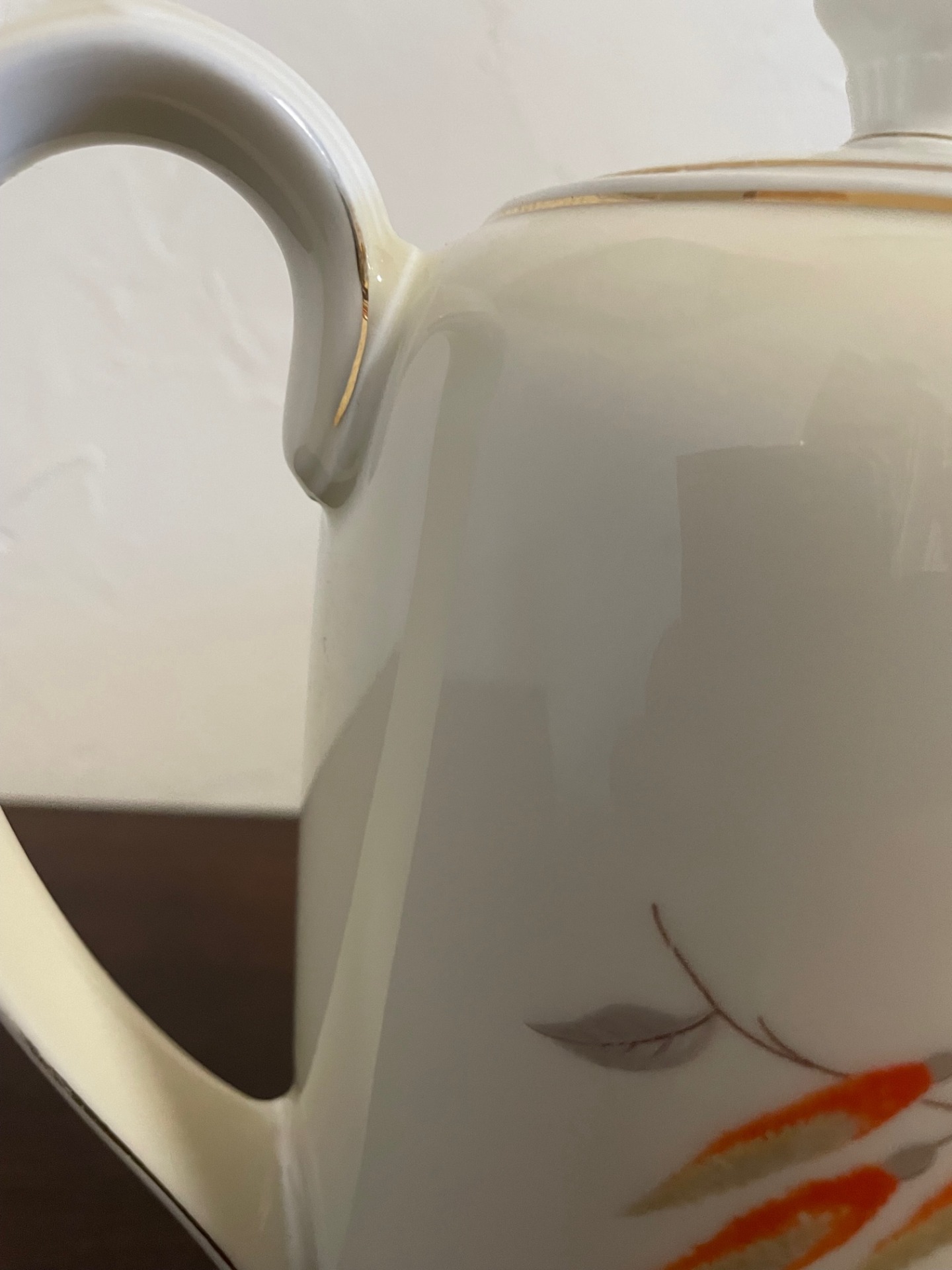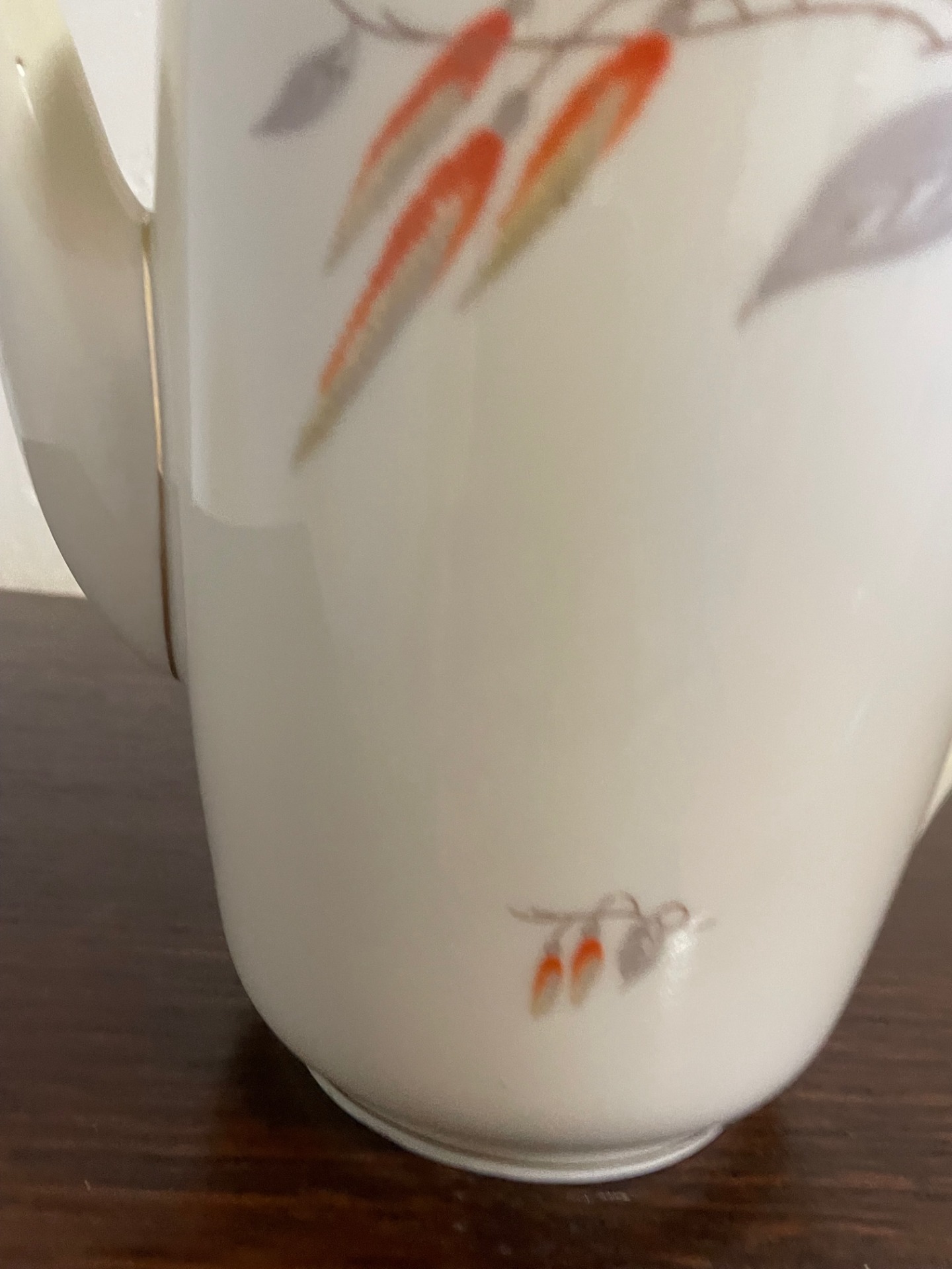 Krém színű alapon körbefutó paprikavirág díszíti ezt a Bavaria gyár fennállásának 50. évfordulójára készült teáskannát.
