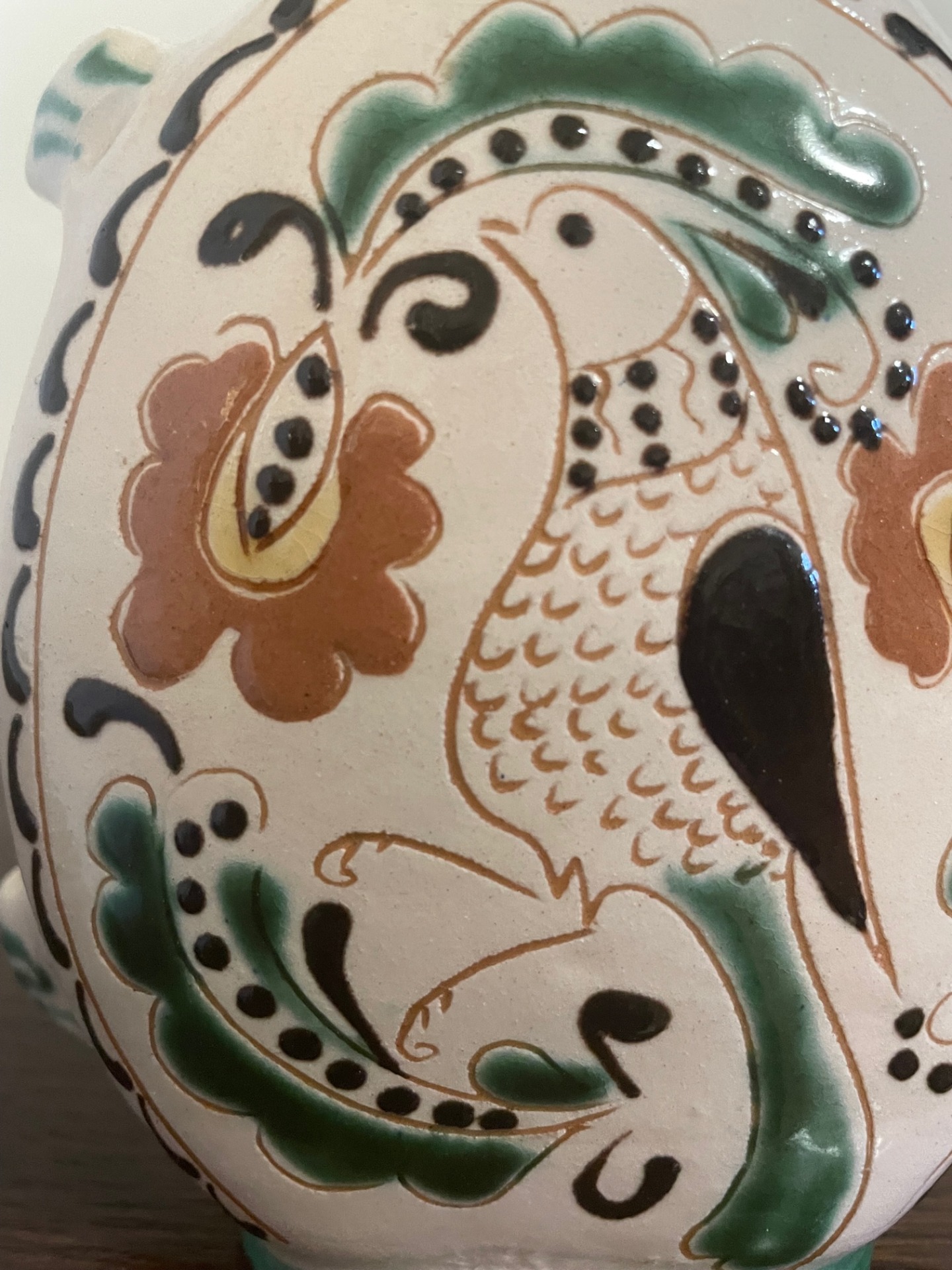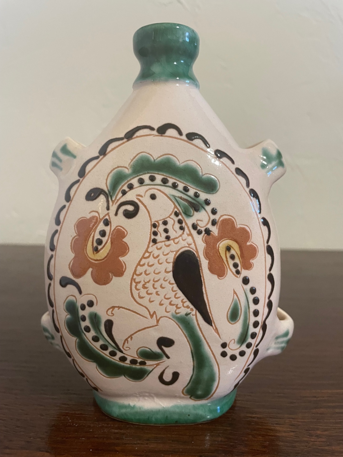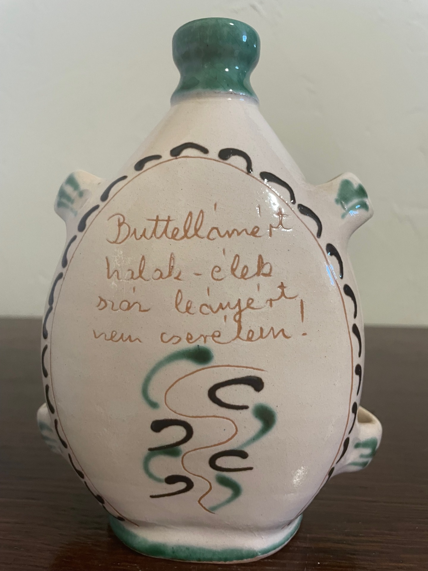 Övre akasztható, kézzel korongozott, páva mintás, felíratos butella. Hátán a felírat: