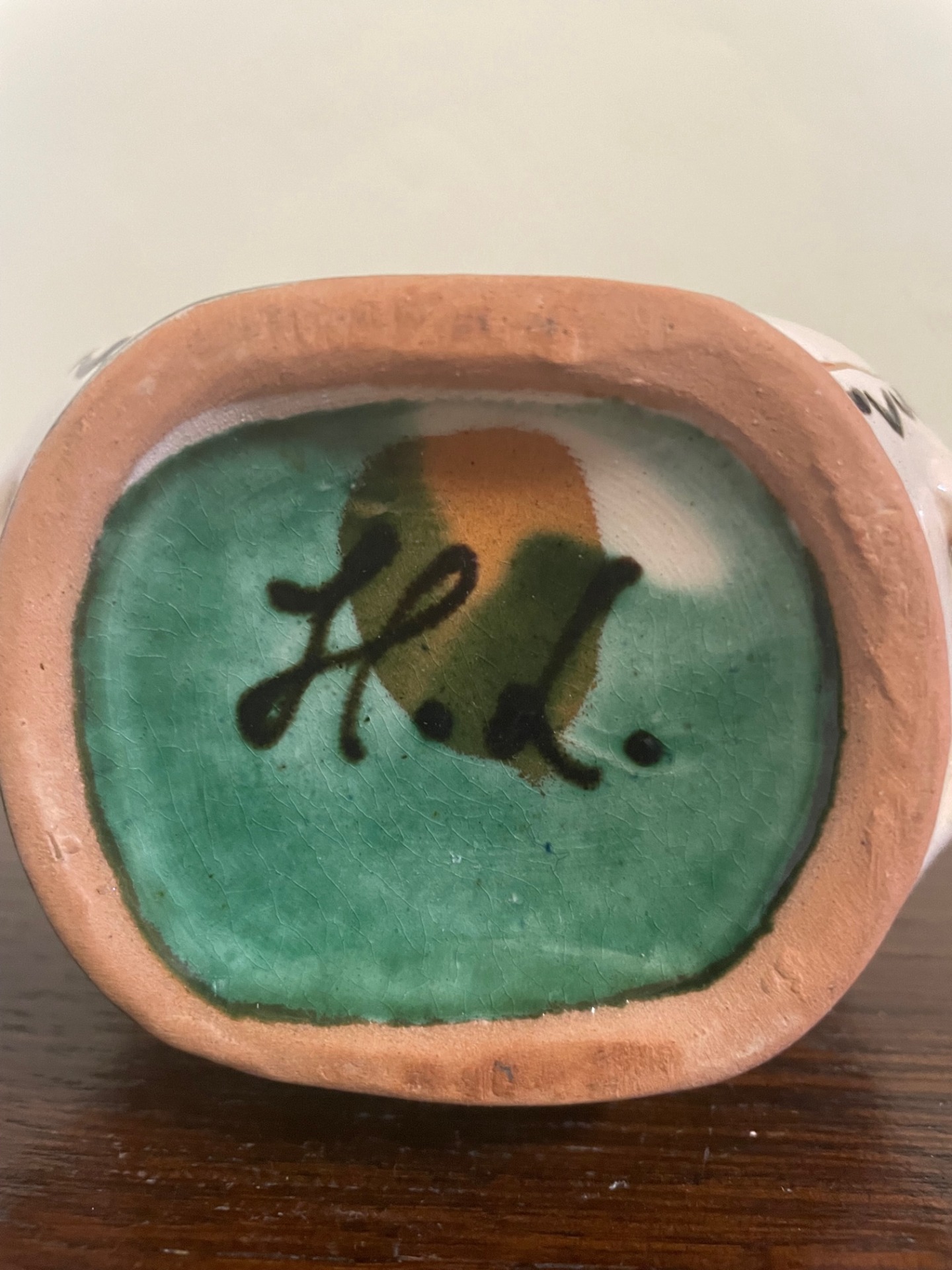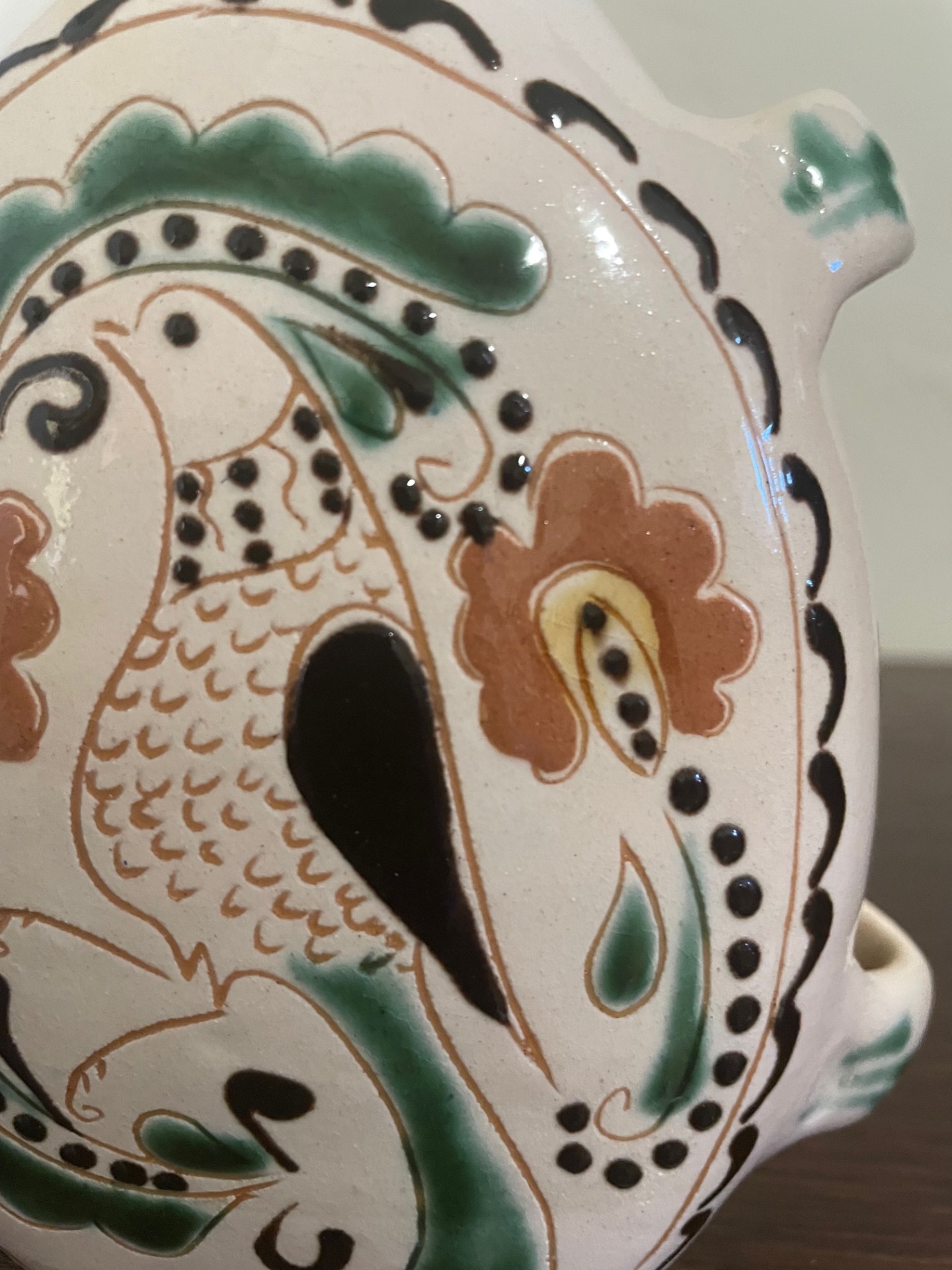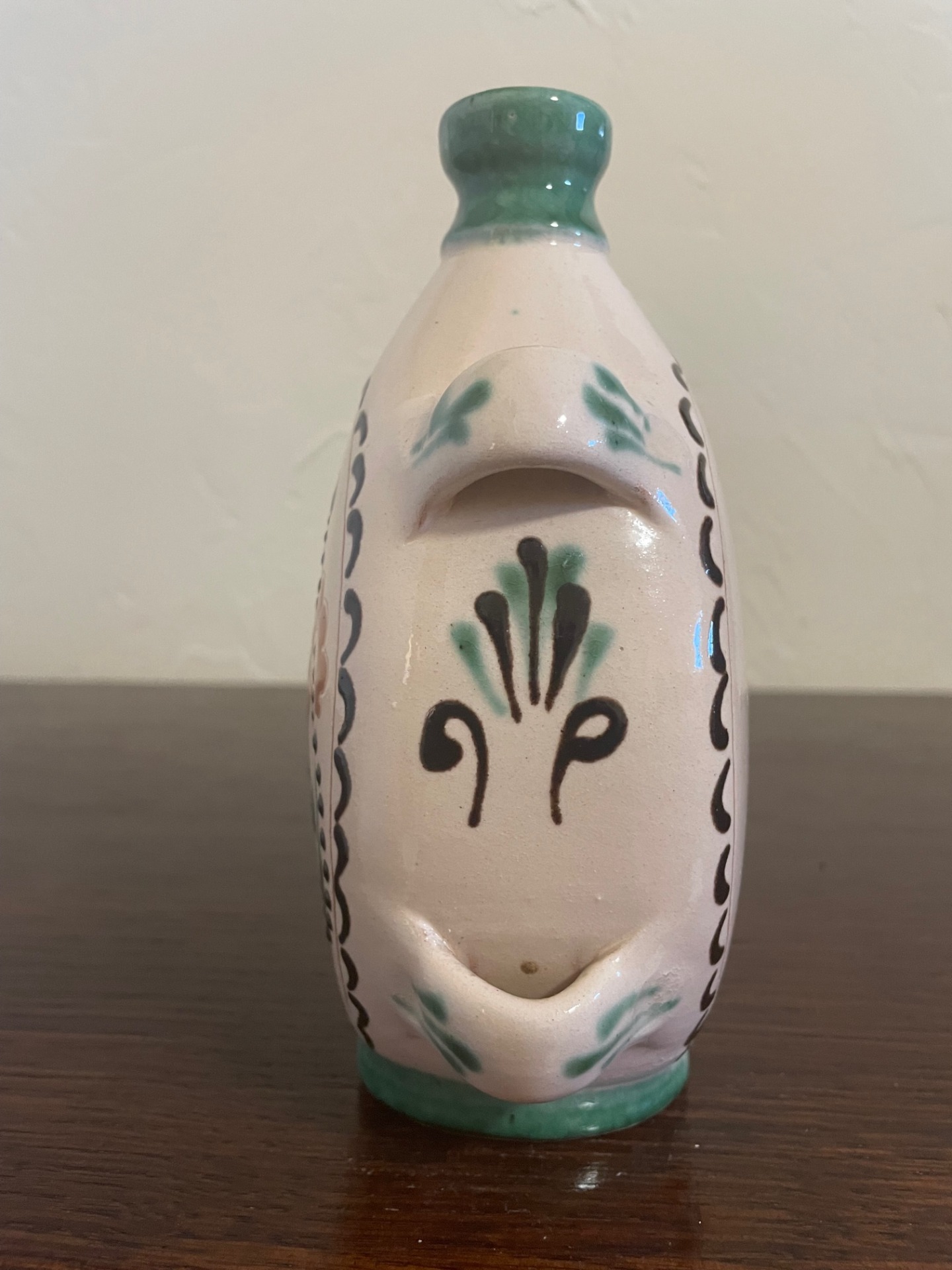 Övre akasztható, kézzel korongozott, páva mintás, felíratos butella. Hátán a felírat: