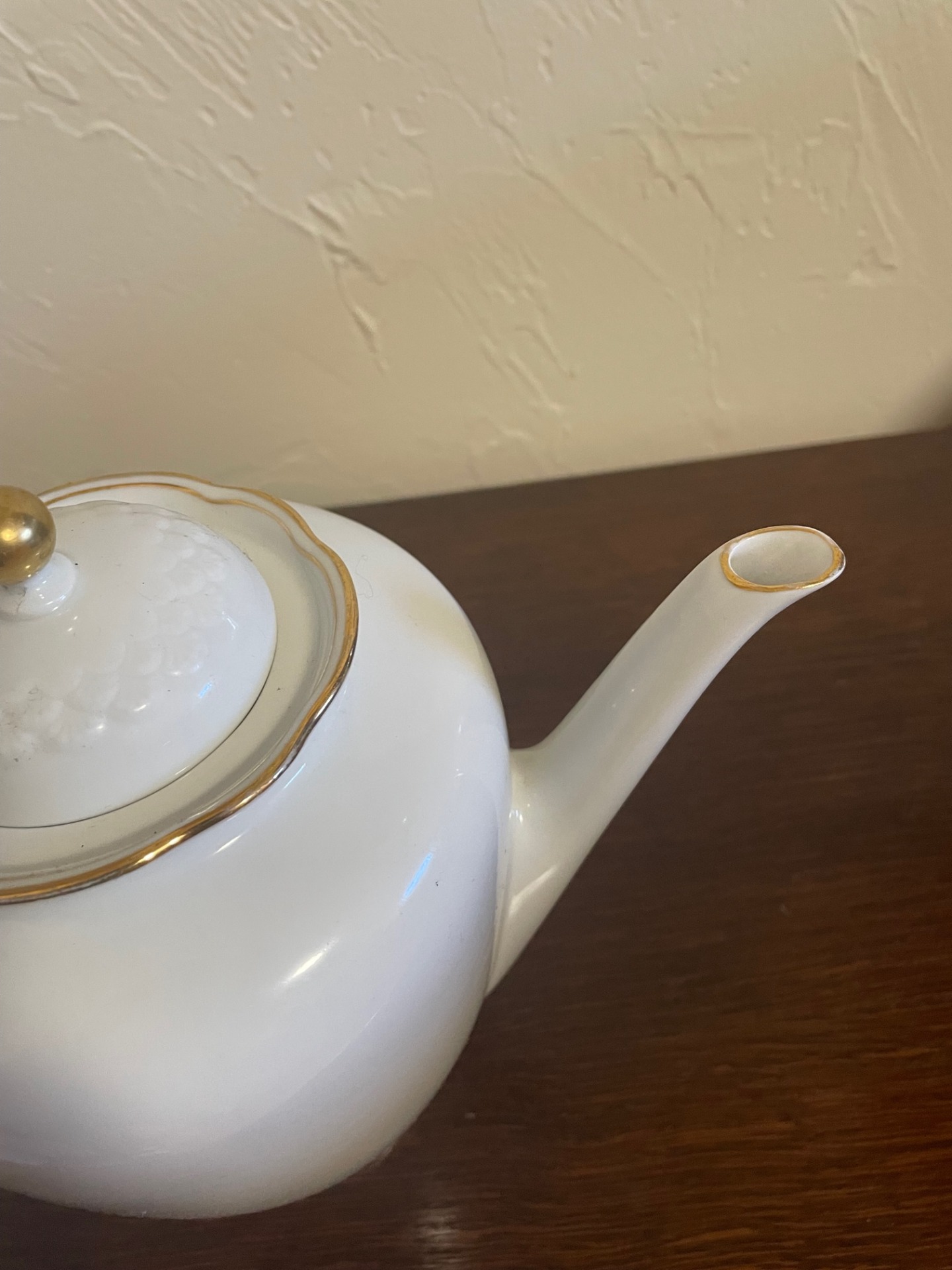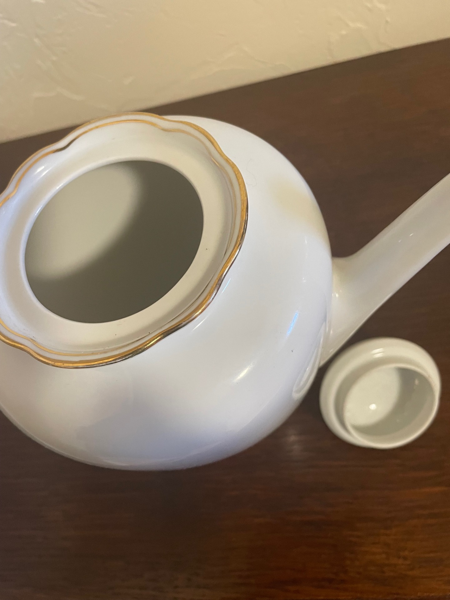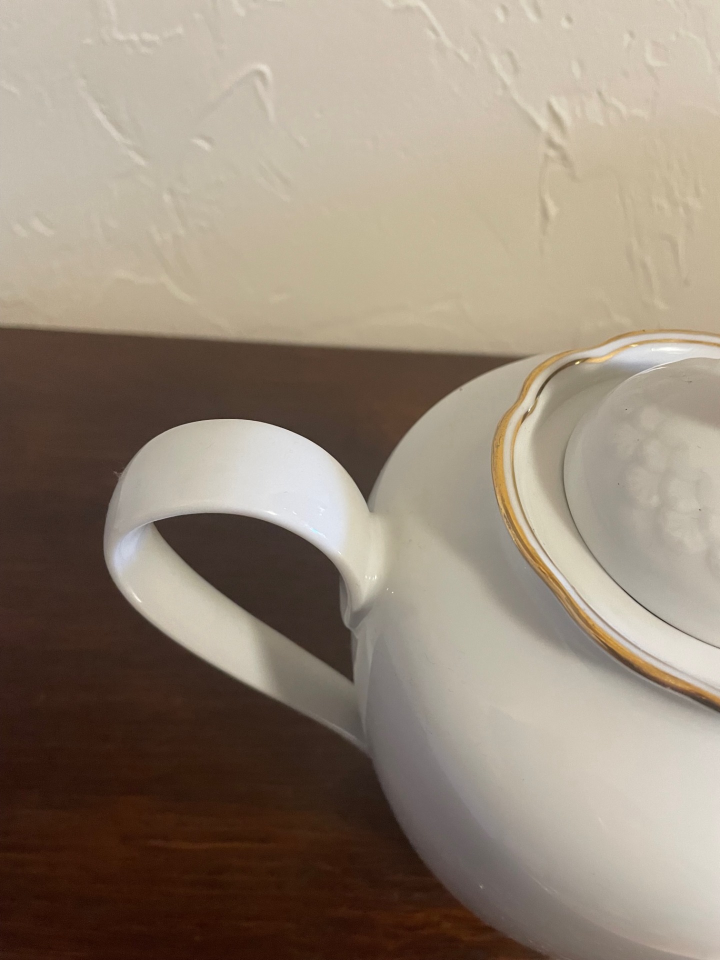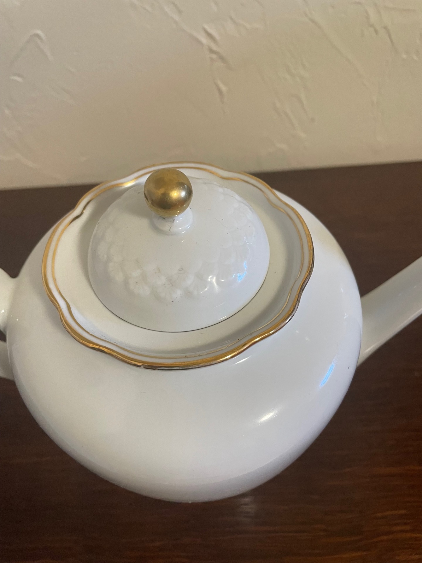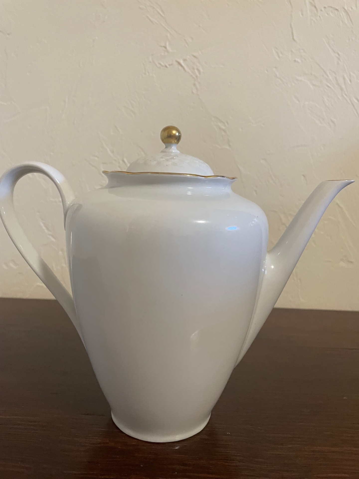 Hófehér, letisztult elegancia jellemzi ezt a megjelenésében is tekintélyt parancsoló teáskannát. Morcosságát a felül lévő, aranyozott szélű, virág formájú feltöltő-nyílás töri meg. Az arany-szegélyek végigfutnak a kanna fülének két oldalán, és a kiöntő nyílás peremén is.