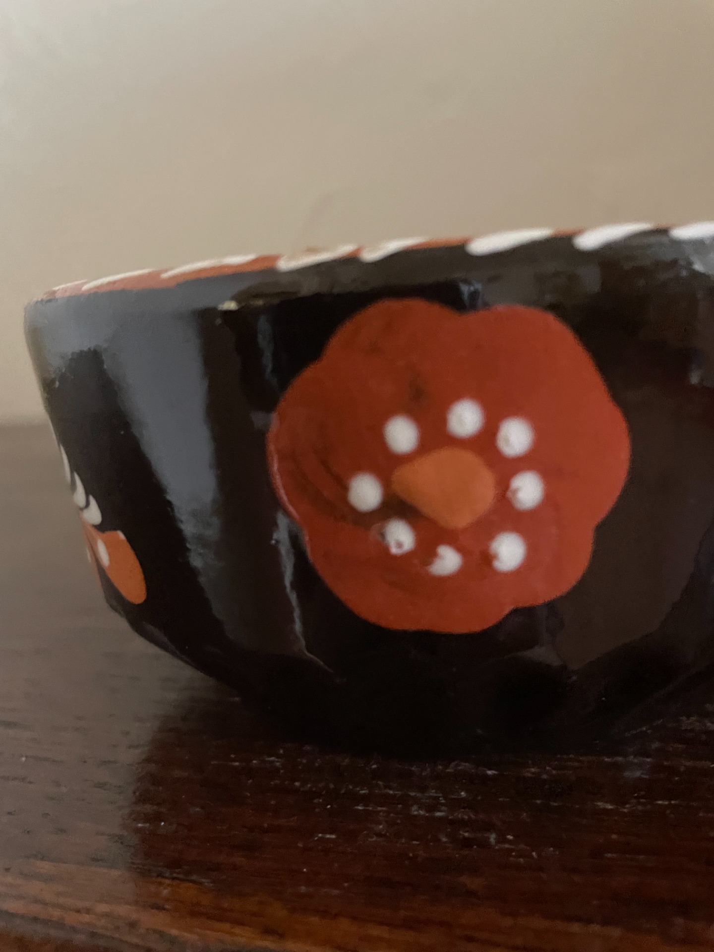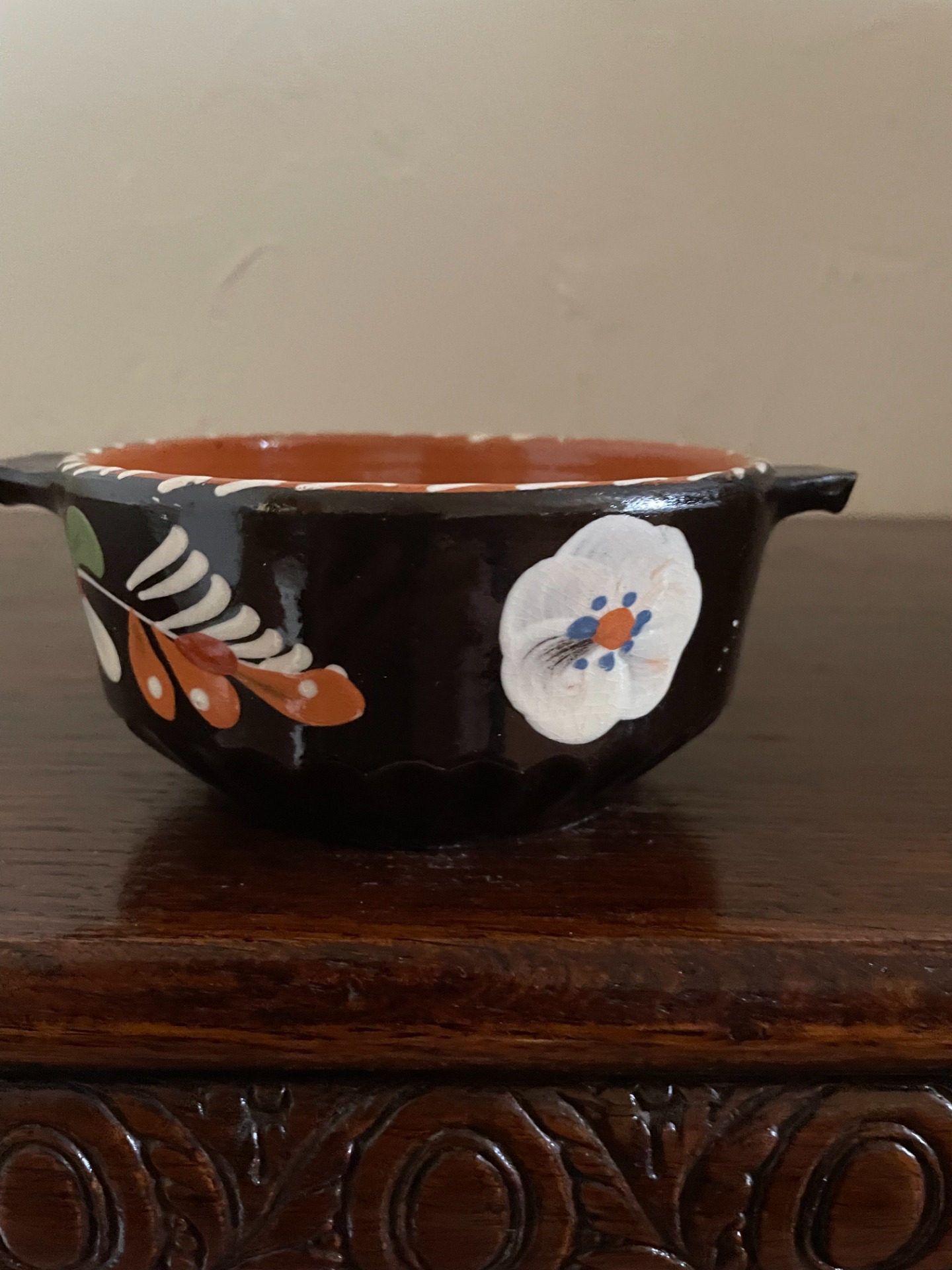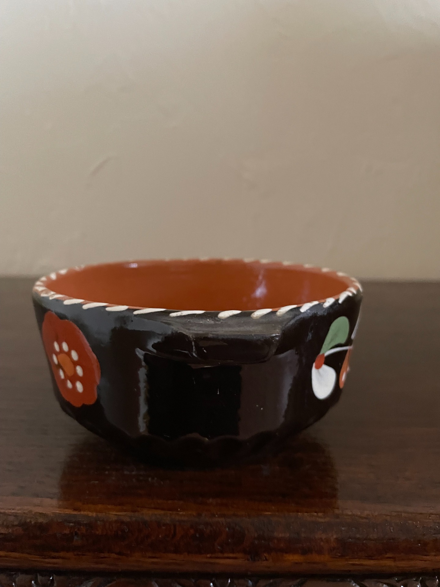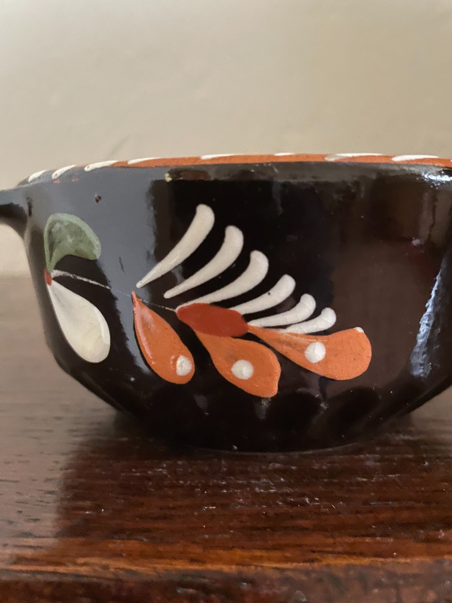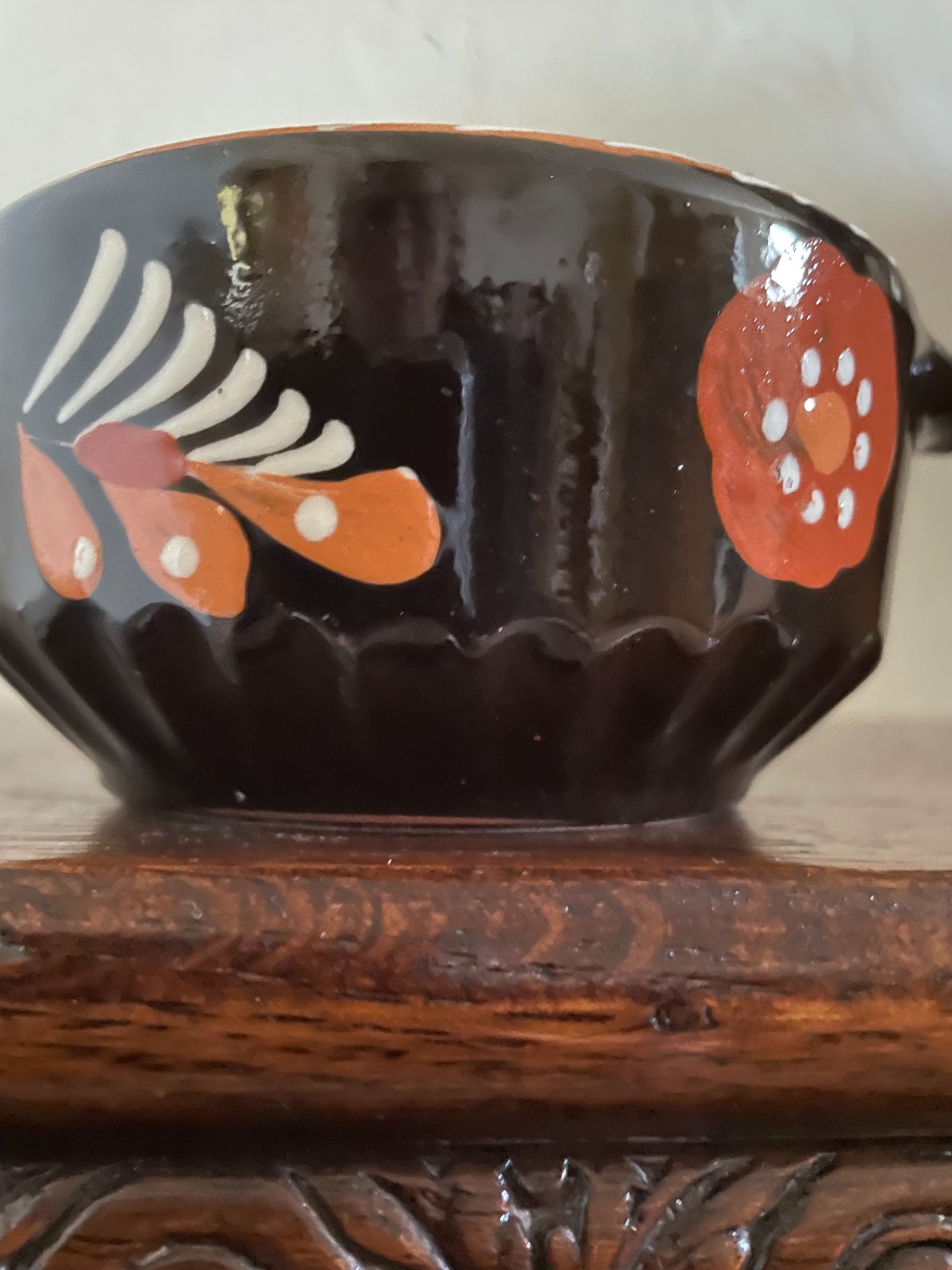 Sárospataki leveses csésze, kis fülekkel, egyik oldalán fehér-, másik oldalán vörös virággal.