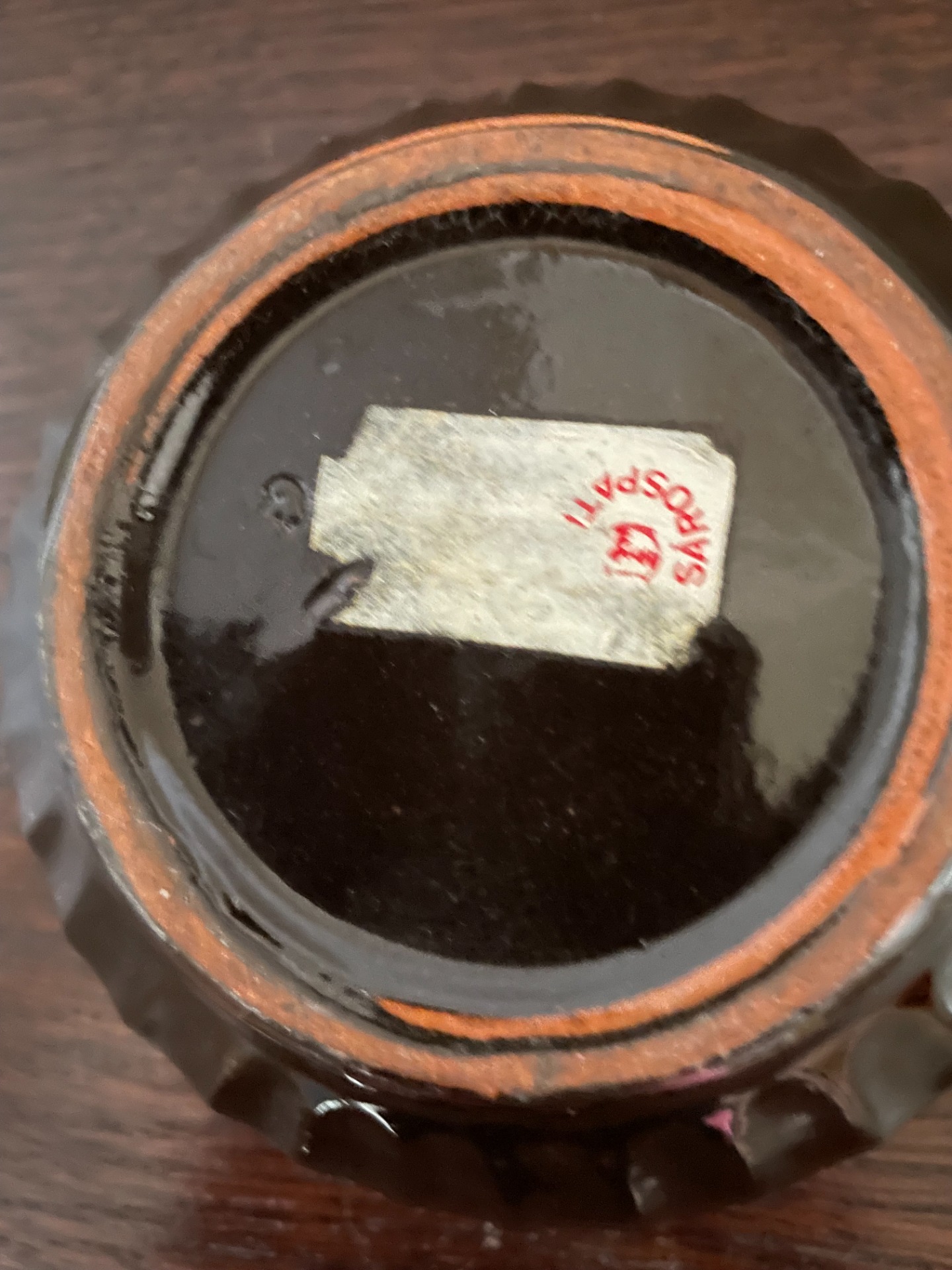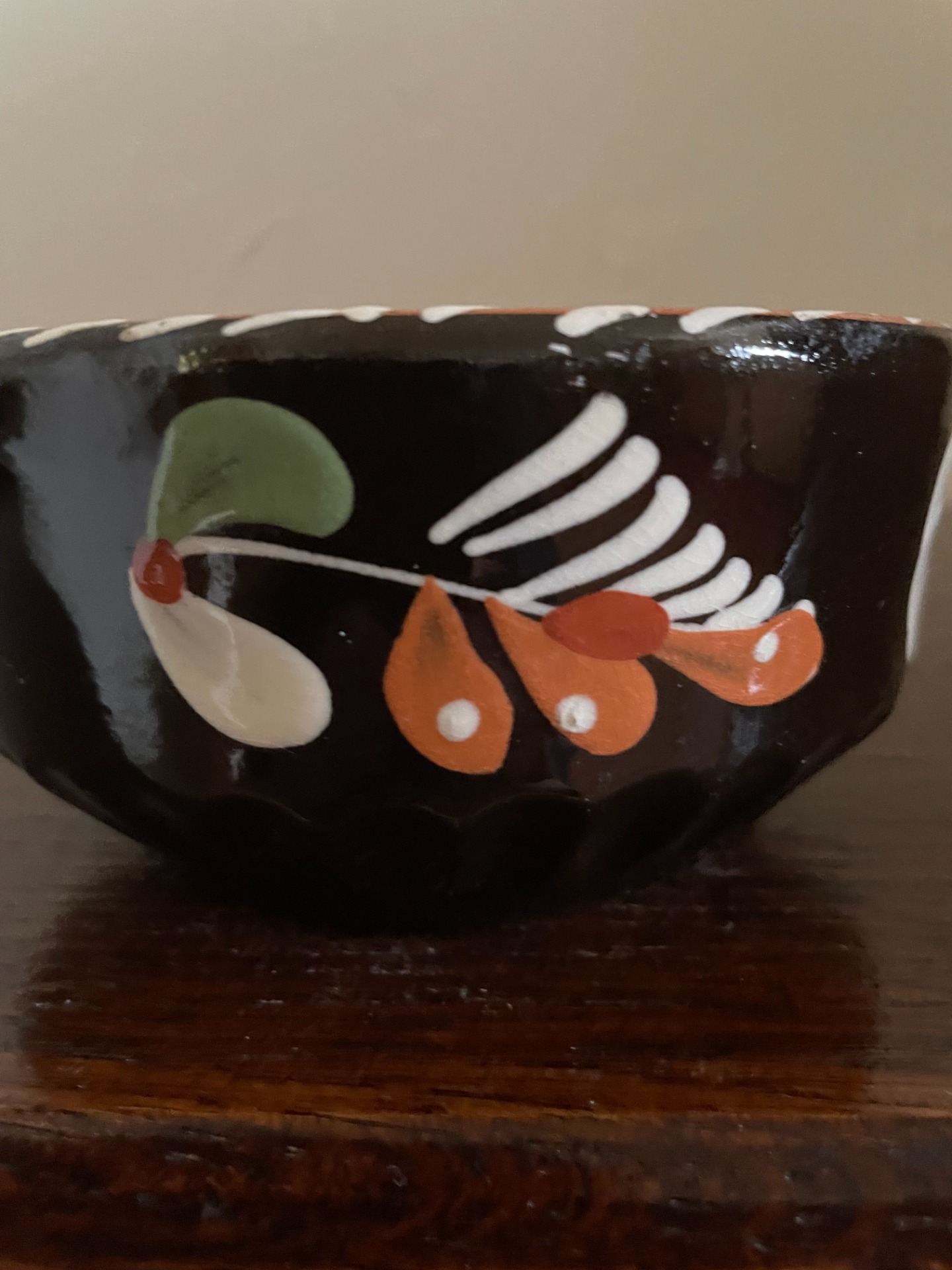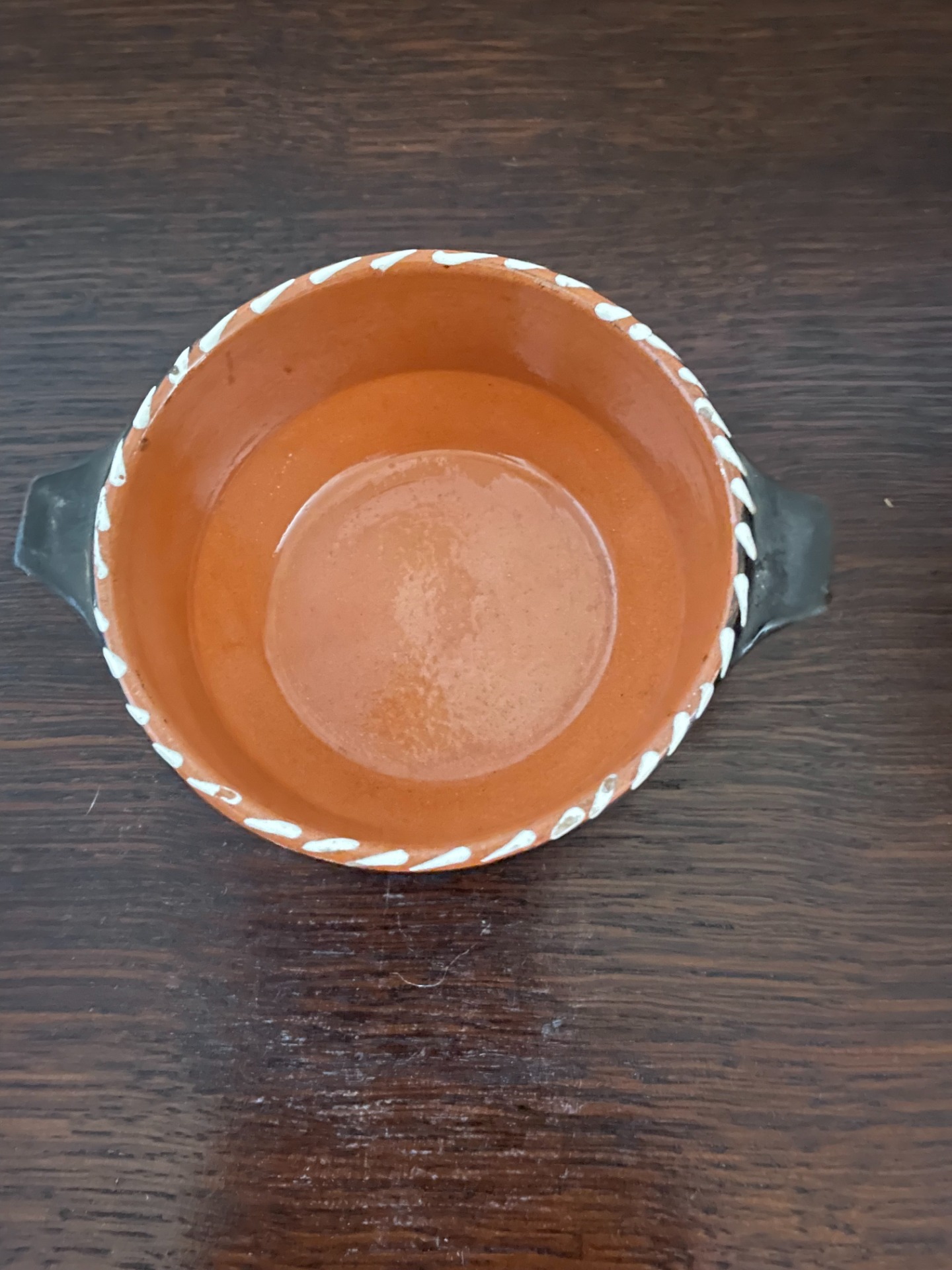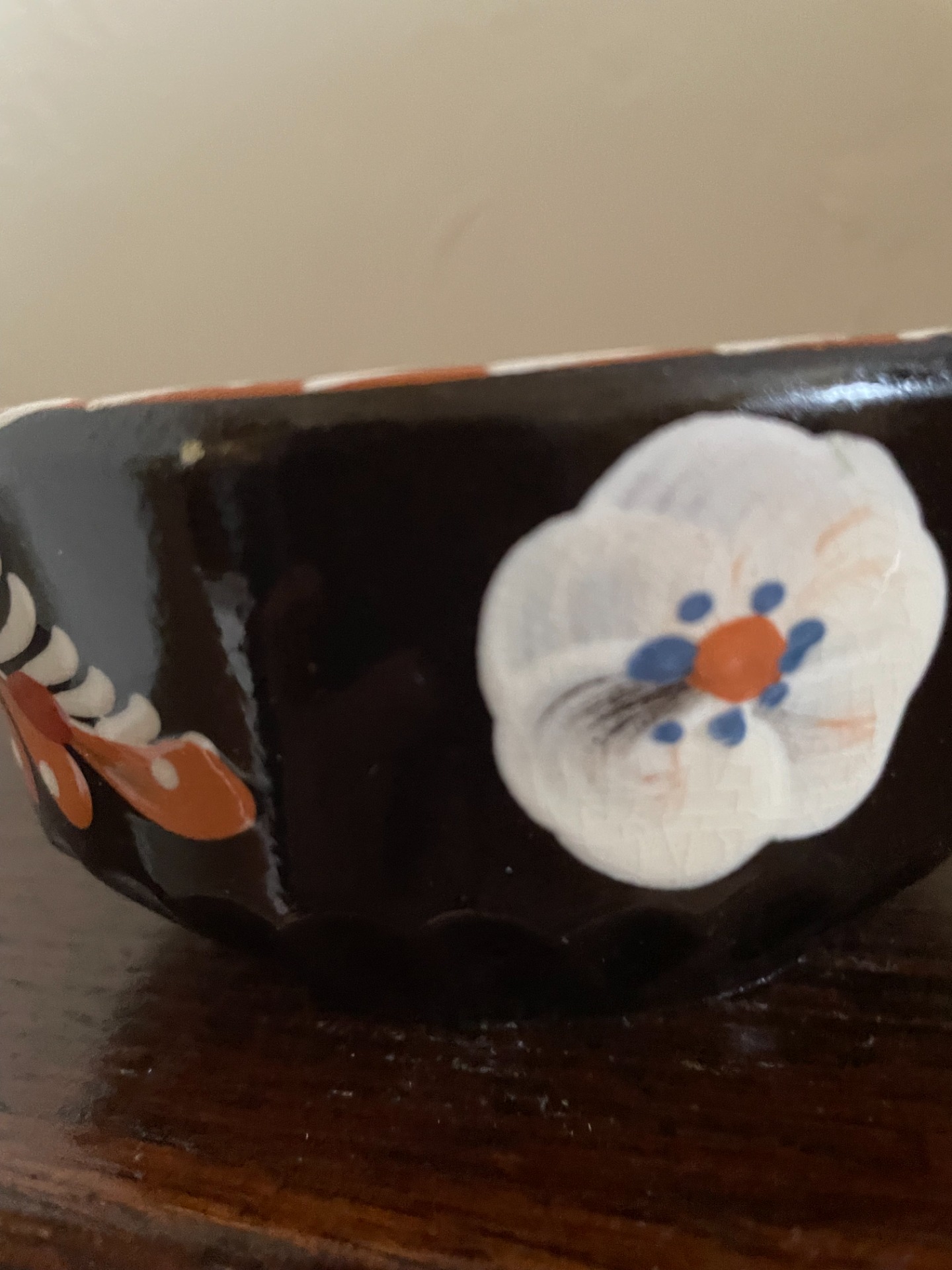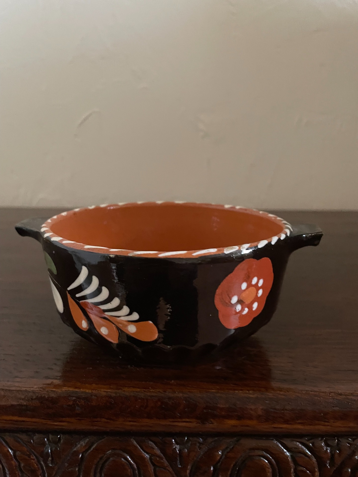 Sárospataki leveses csésze, kis fülekkel, egyik oldalán fehér-, másik oldalán vörös virággal.