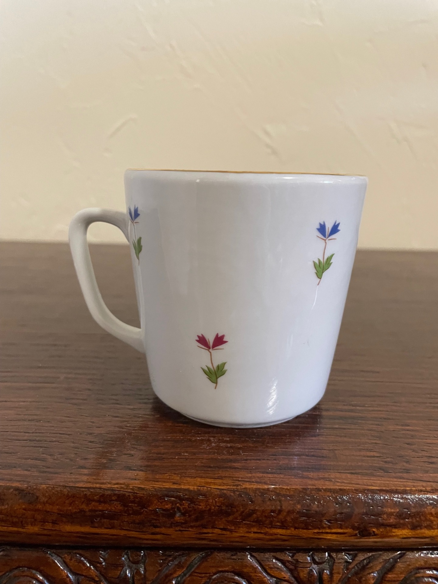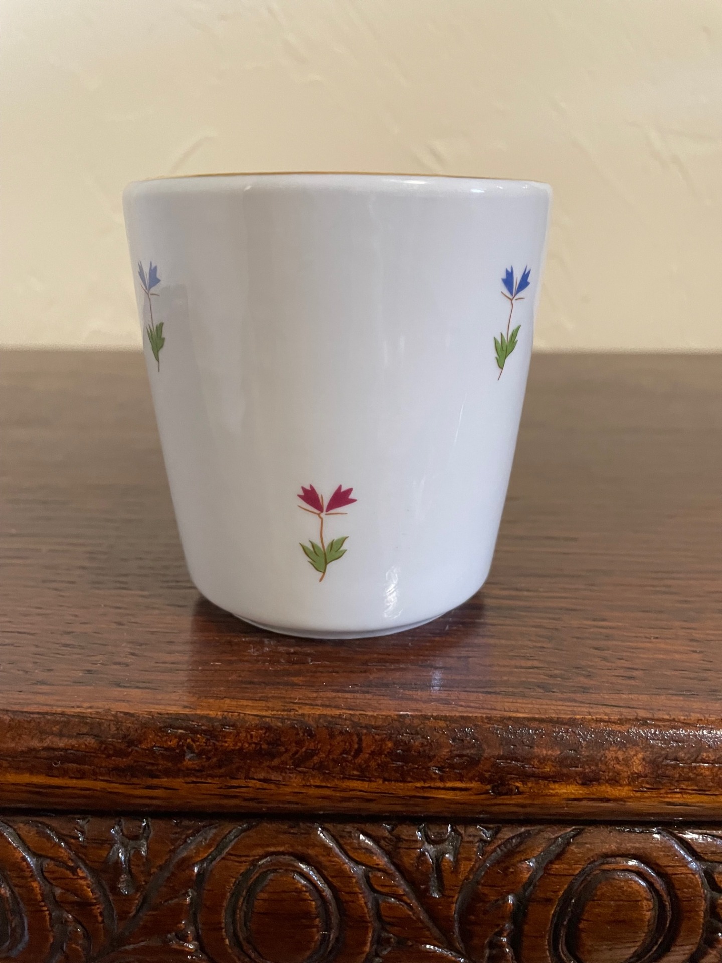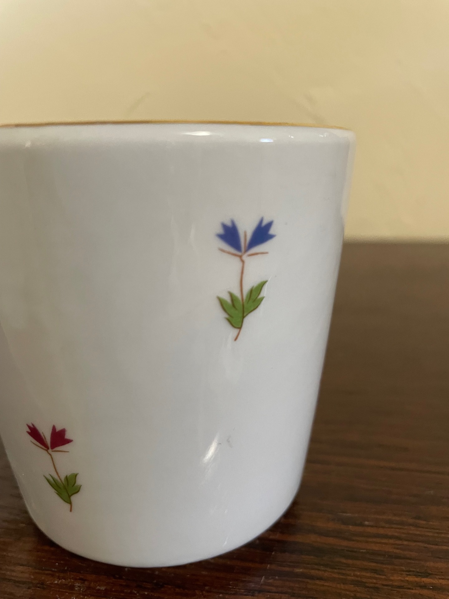 Kék és piros apró szegfűminta fut körbe ezen a kb. 2,5 dl-es űrtartalmú csészén.