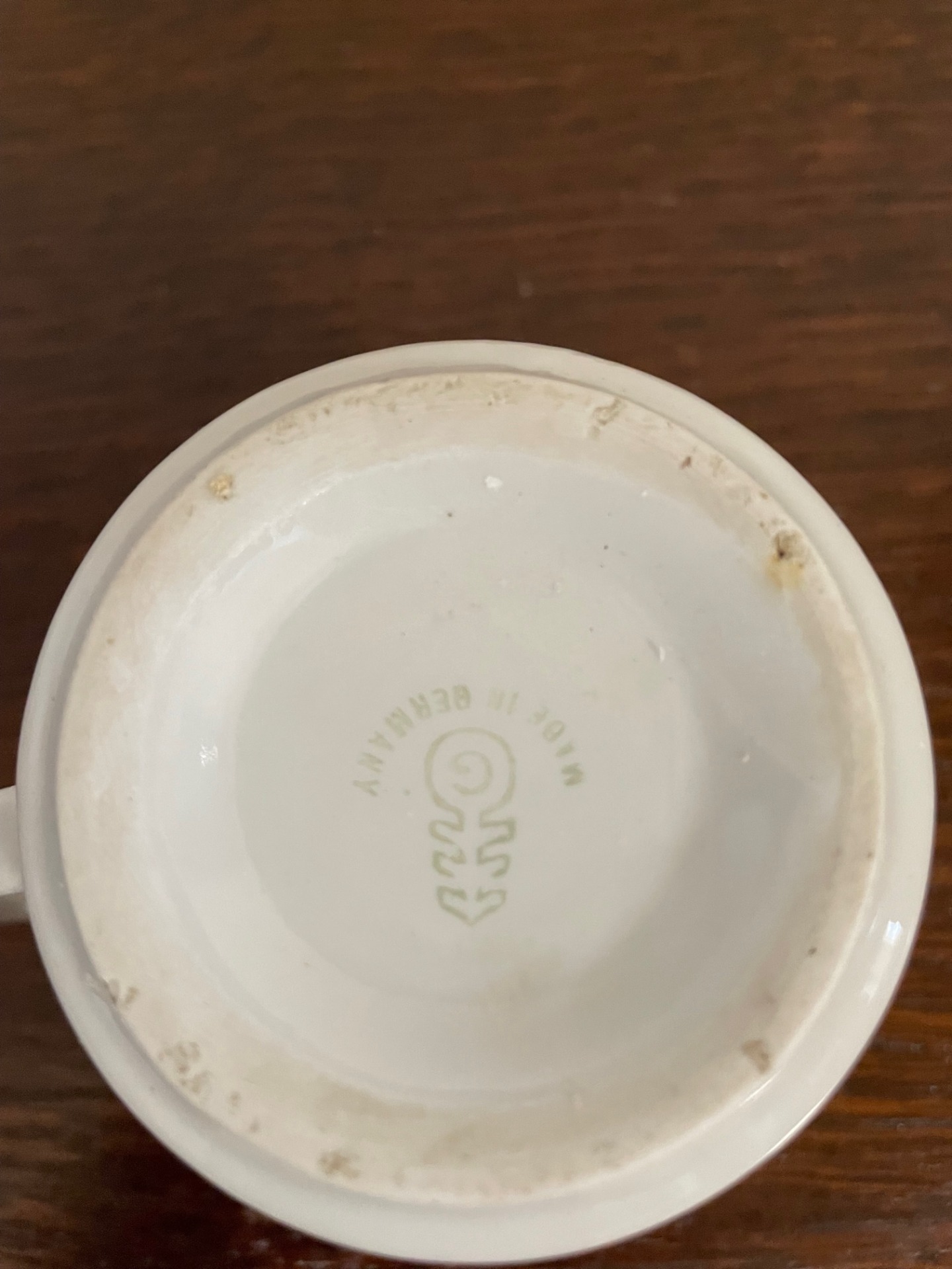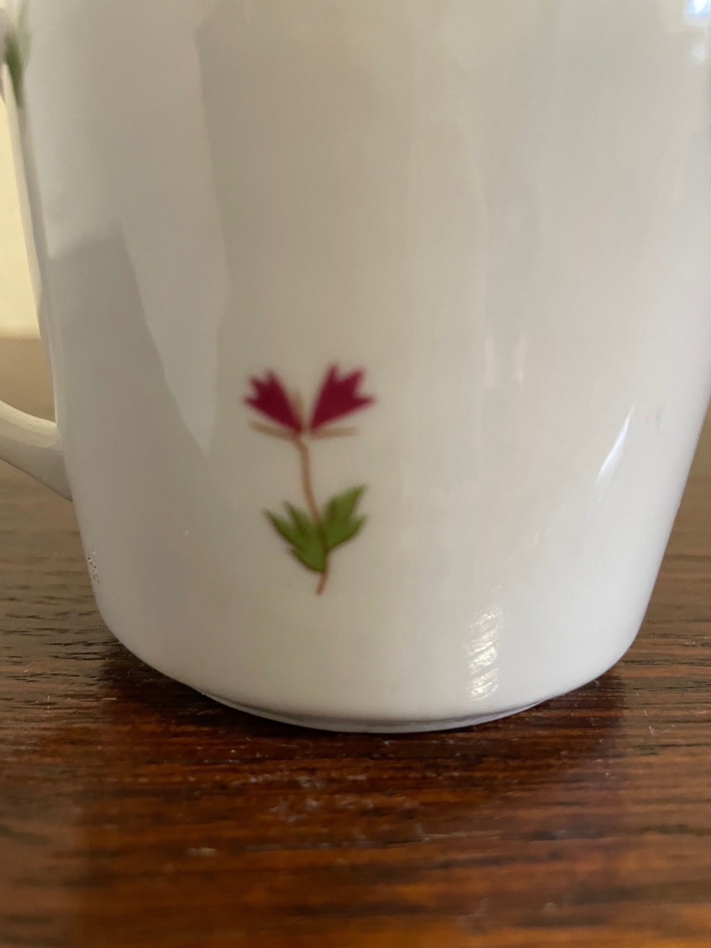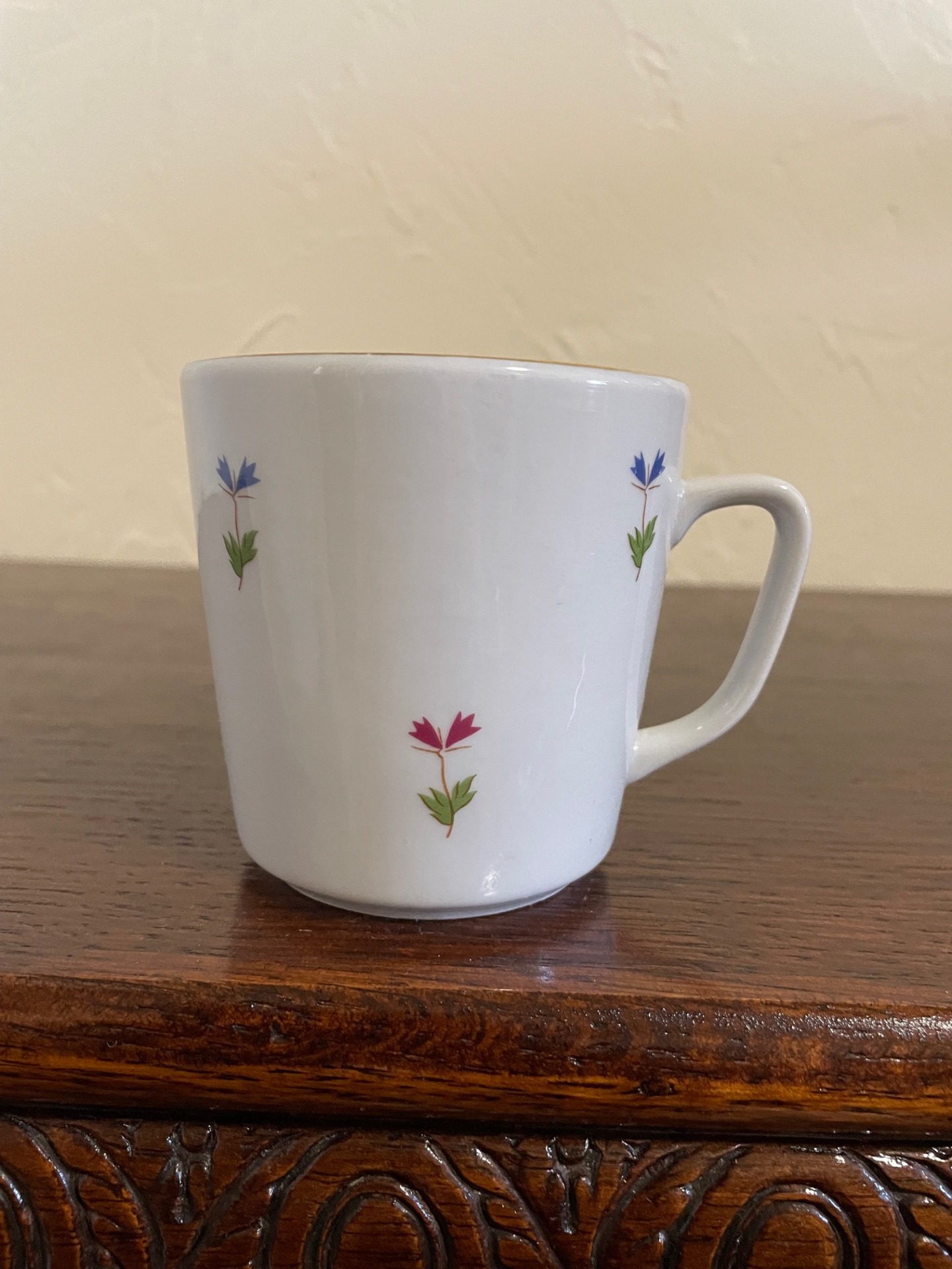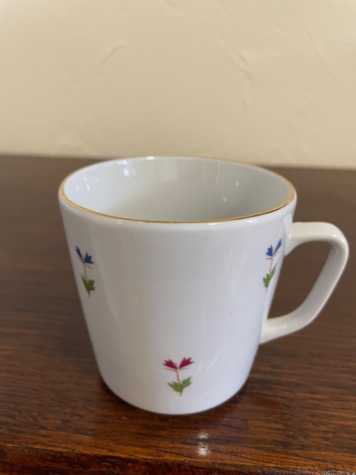 Kék és piros apró szegfűminta fut körbe ezen a kb. 2,5 dl-es űrtartalmú csészén.