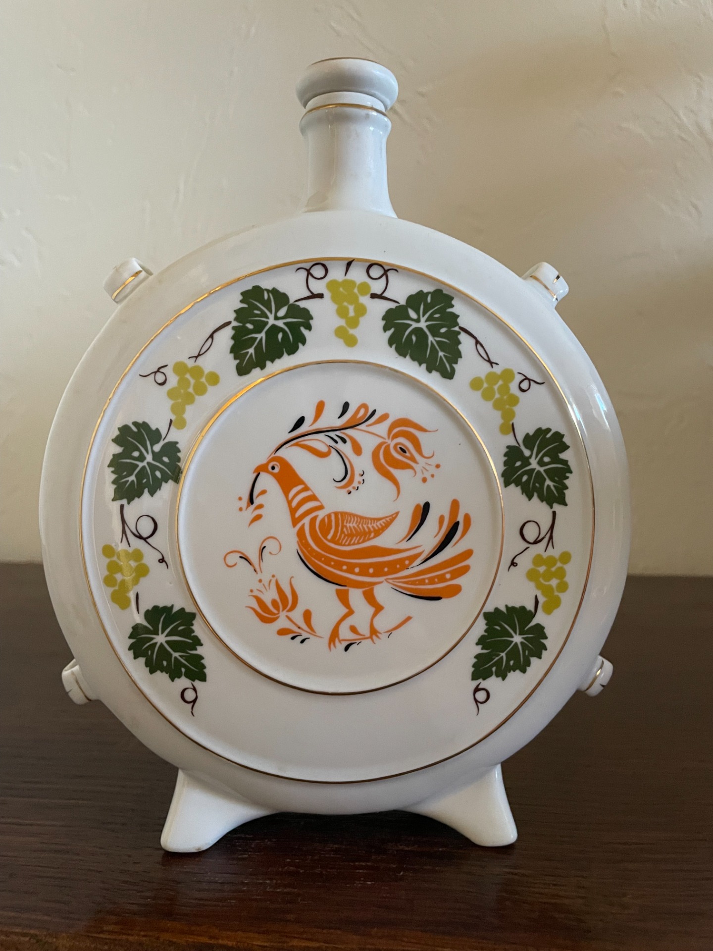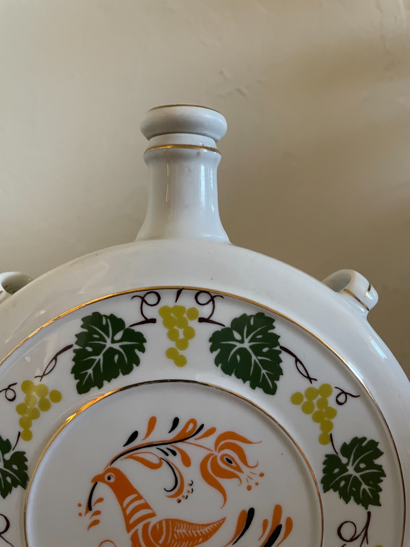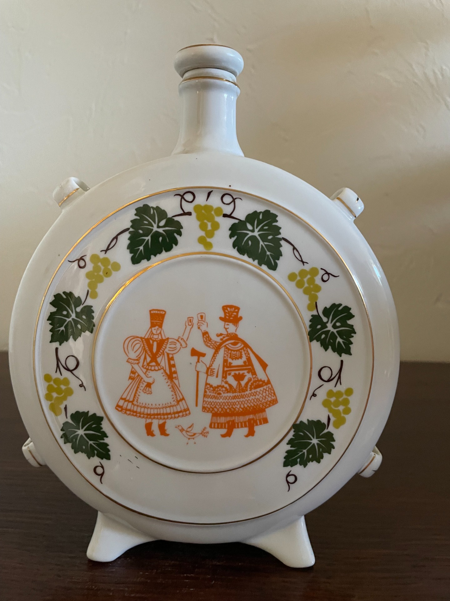 A butella egyik oldalán mulatozó, népviseletbe öltözött ifjú pár, a másik oldalán egy páva, csőrében babérággal látható. A központi minták körül indával dúsított szőlőlevelek láthatók, arannyal is körbeszőve. Porcelánkupakkal. Falra akasztható.