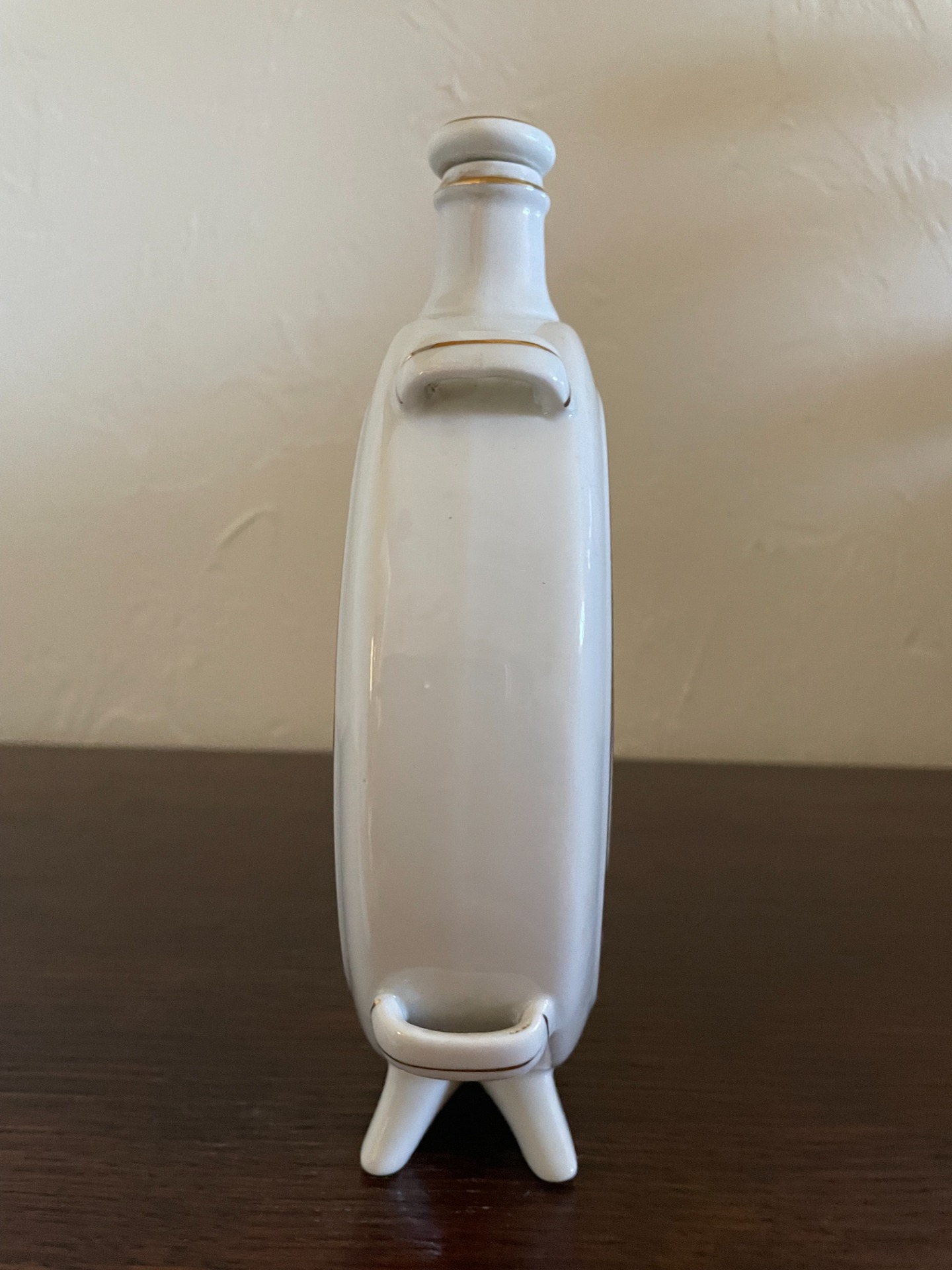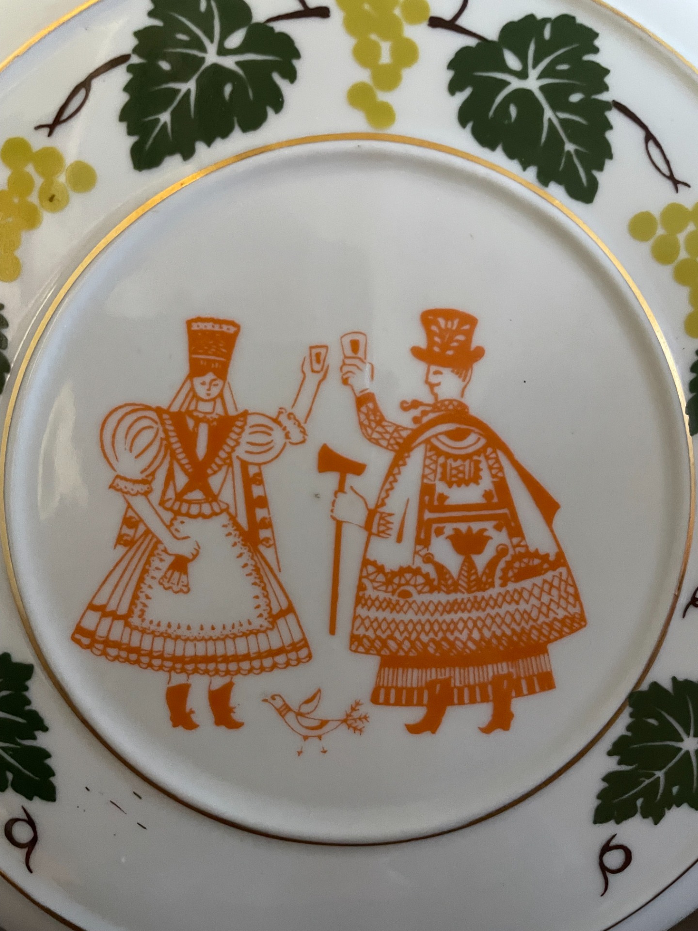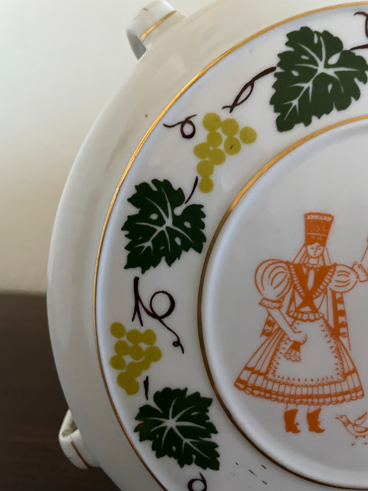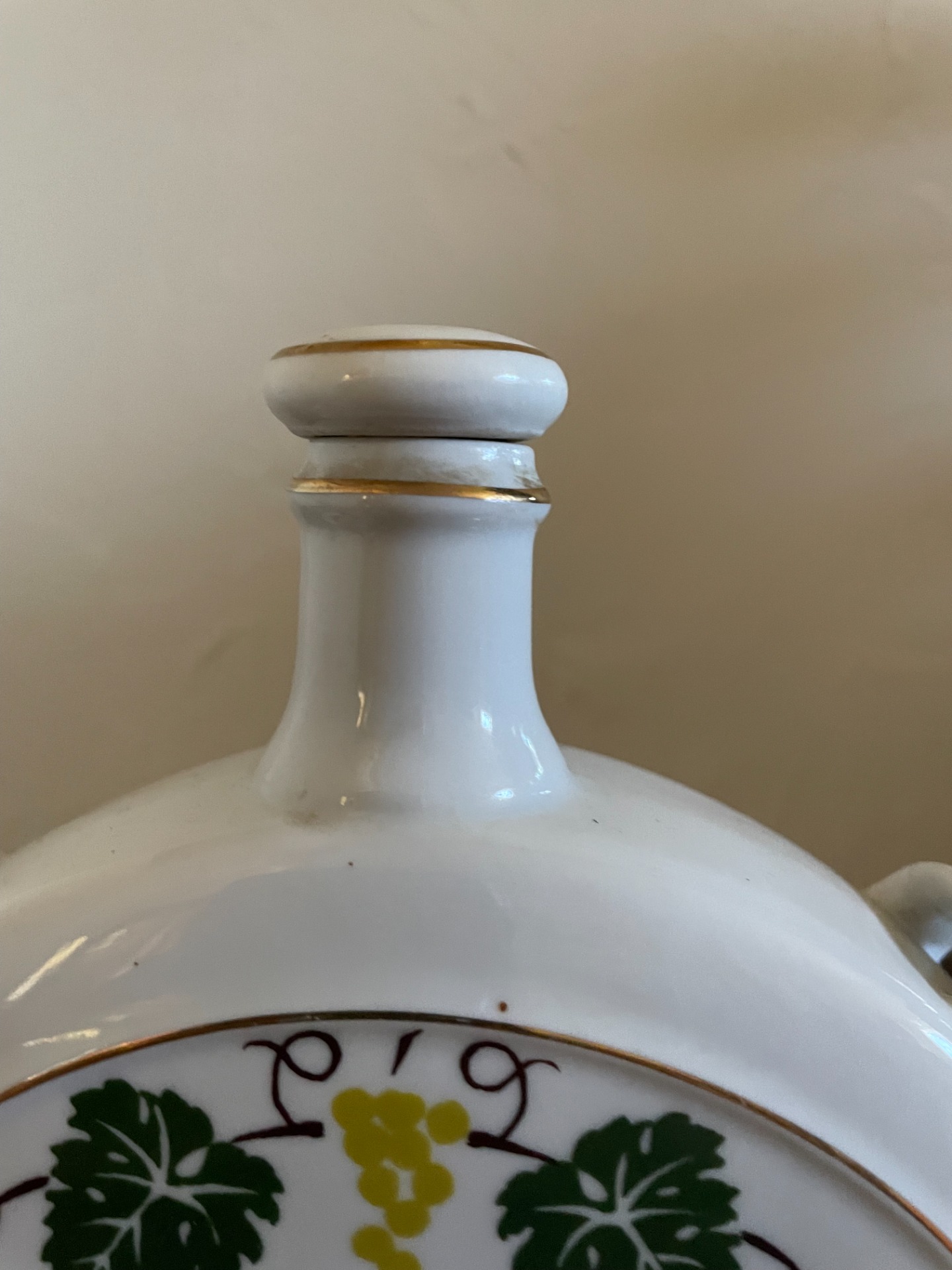 A butella egyik oldalán mulatozó, népviseletbe öltözött ifjú pár, a másik oldalán egy páva, csőrében babérággal látható. A központi minták körül indával dúsított szőlőlevelek láthatók, arannyal is körbeszőve. Porcelánkupakkal. Falra akasztható.