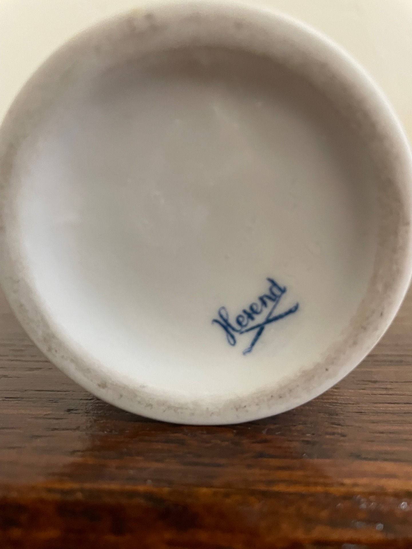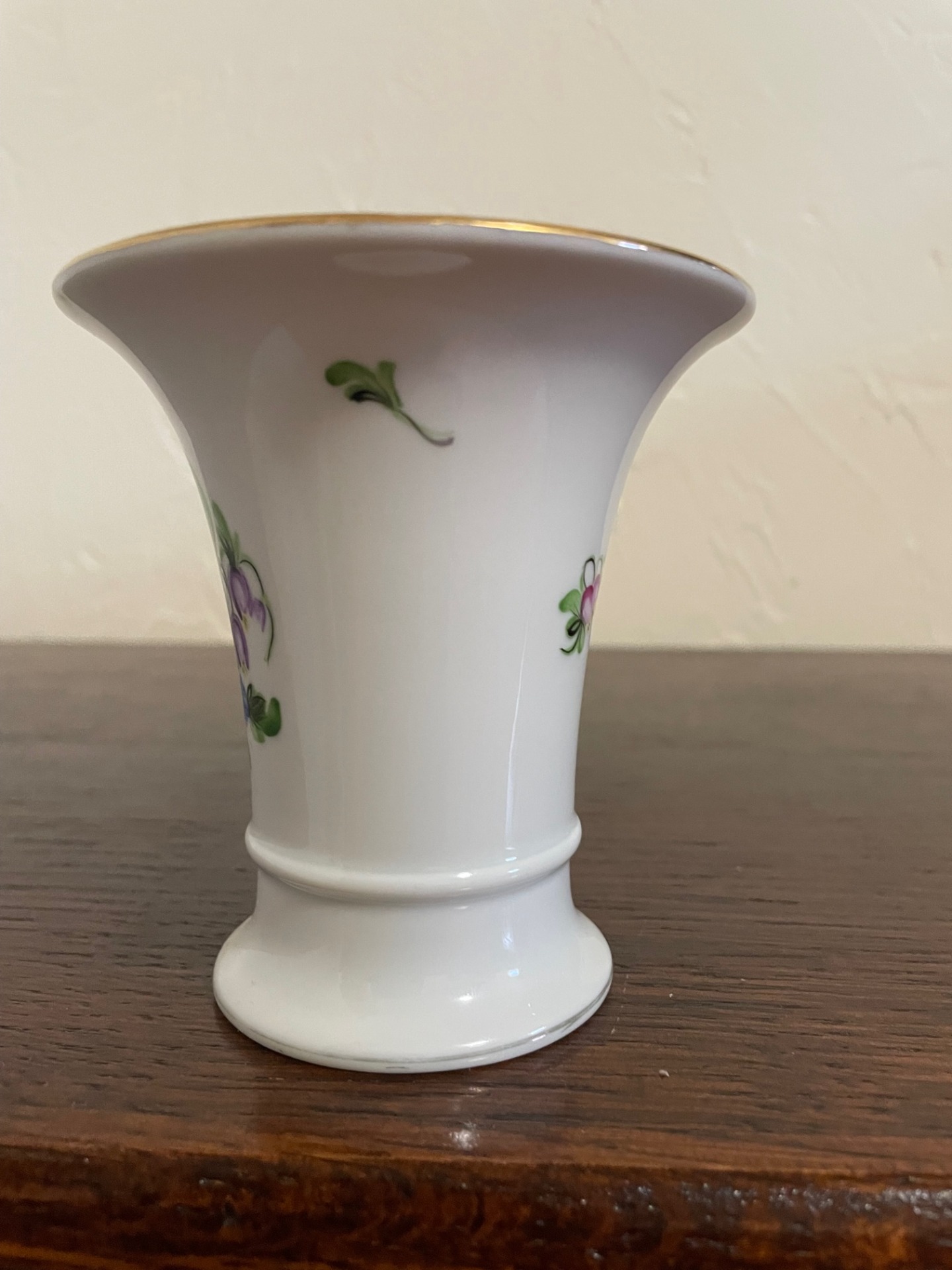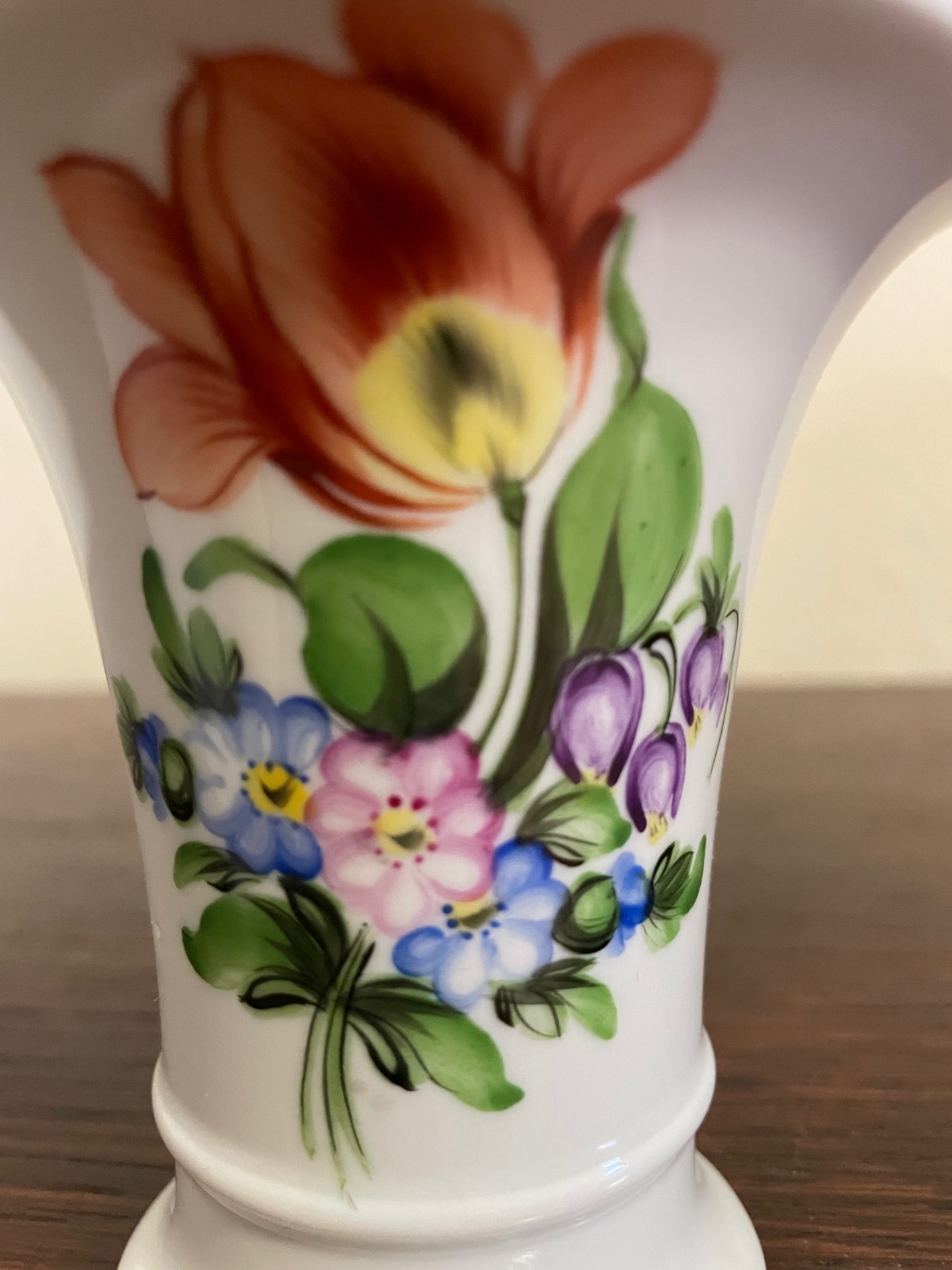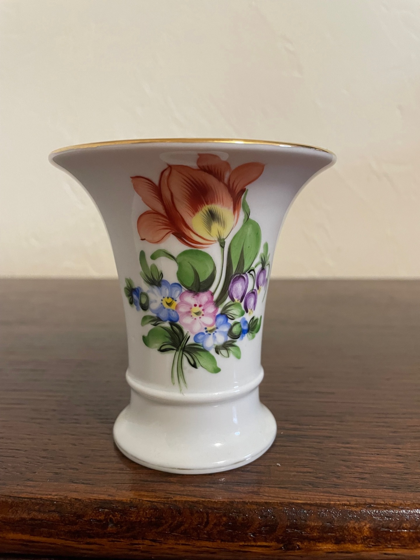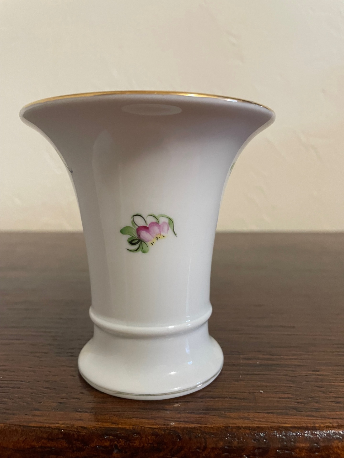 A Herendihez képest nemesen egyszerű darab, mindössze egyetlen dús, és több pici, ritkás mintával. A váza szájának peremén körbefutó aranycsík.