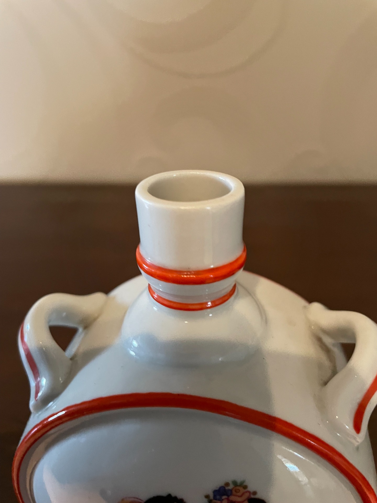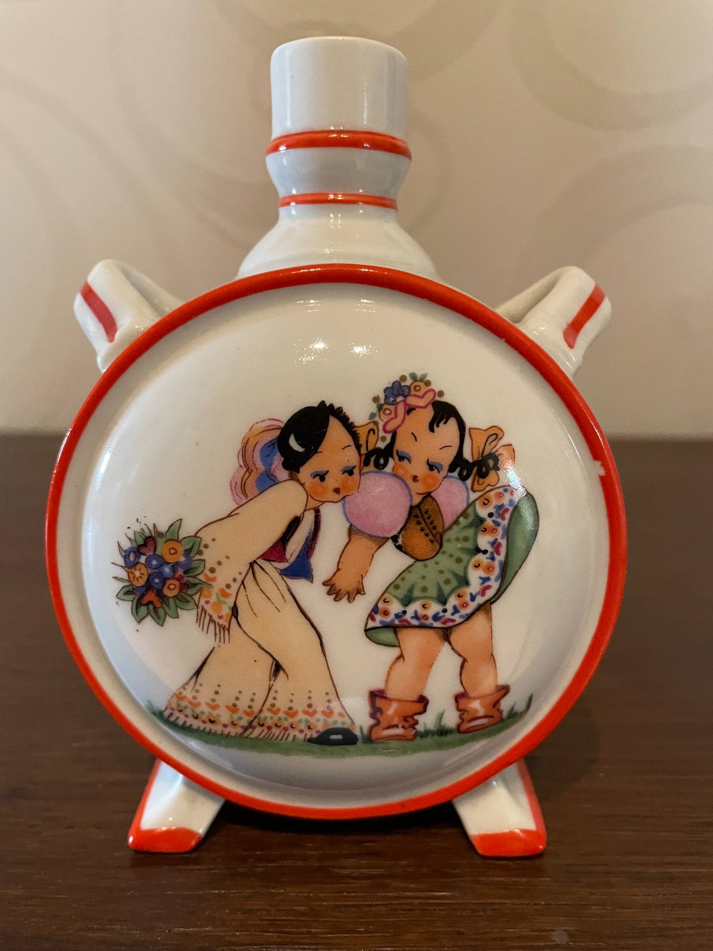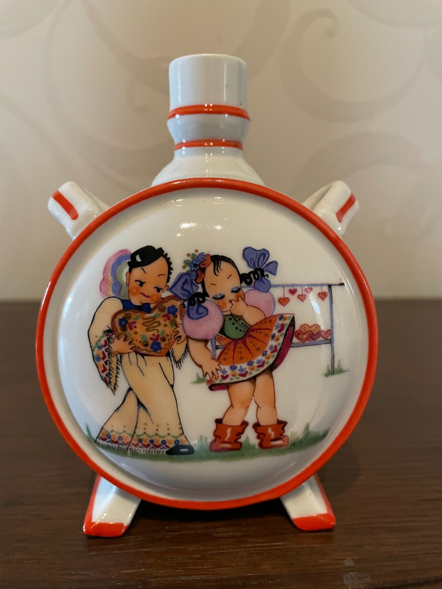A butella mindkét oldalán egy-egy huncut, udvarlós jelenet látható ezen a Zsolnay butellán.