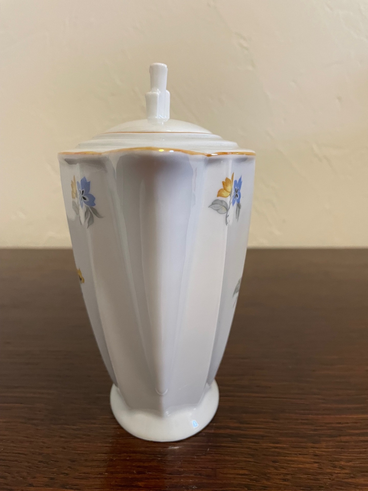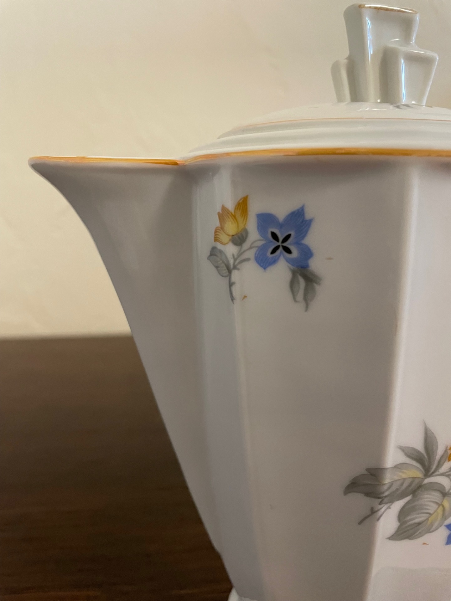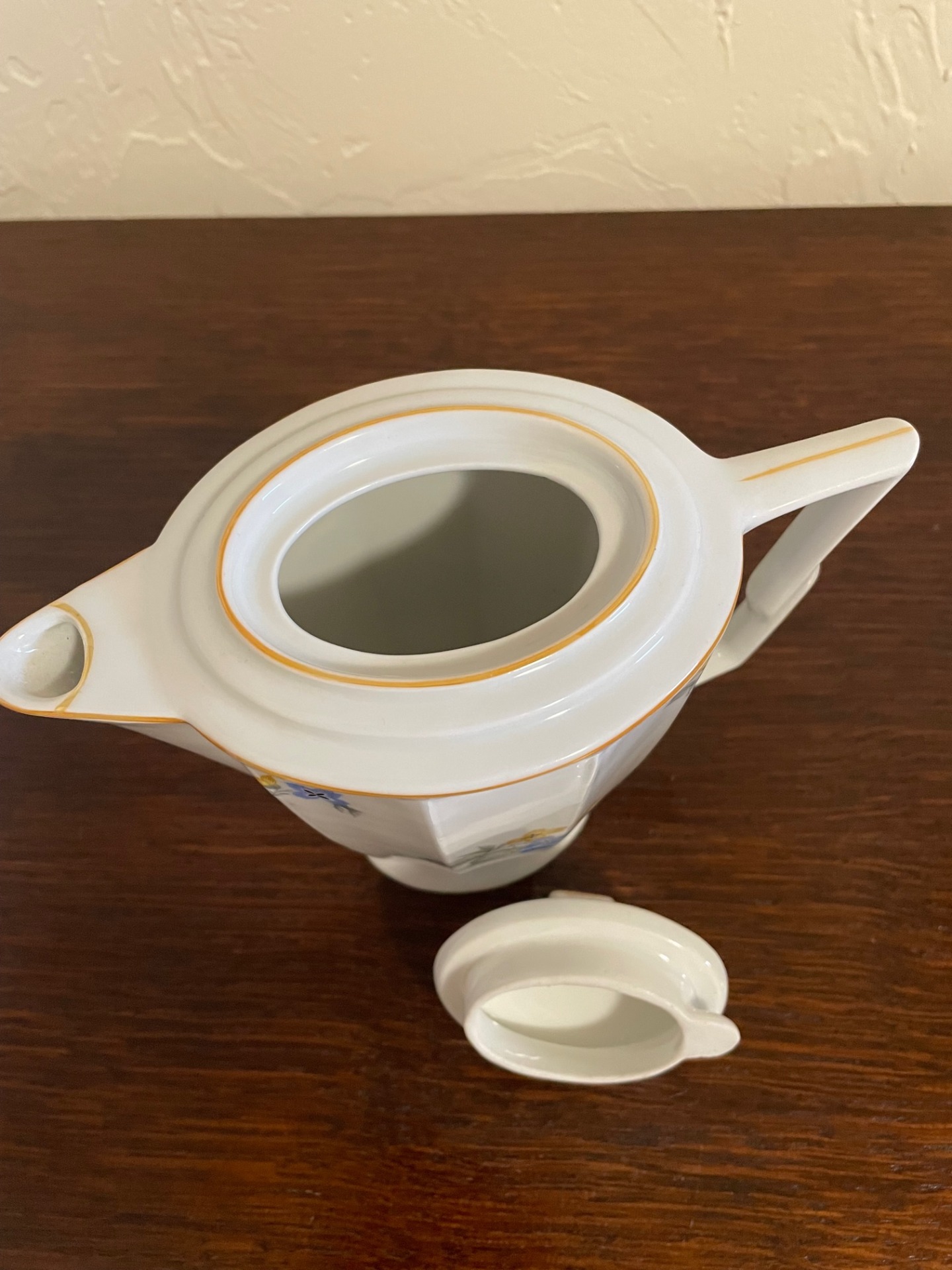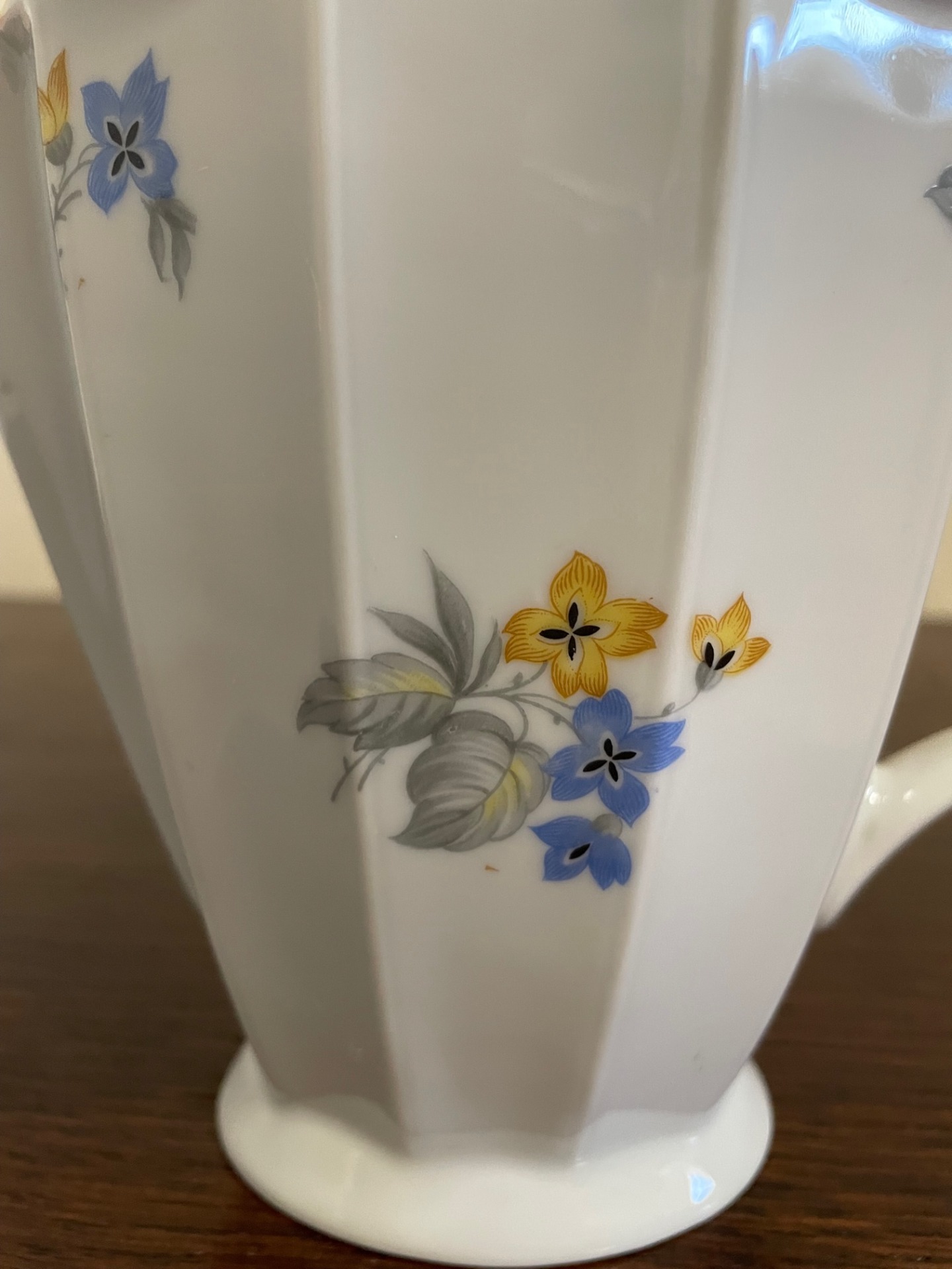 Art Decora jellemző forma, különleges fül és fedőfogó megoldással, kék-sárga apró virágokkal. A sárga dekorcsík a fül felső részén, és a kanna felső peremén végigfut.