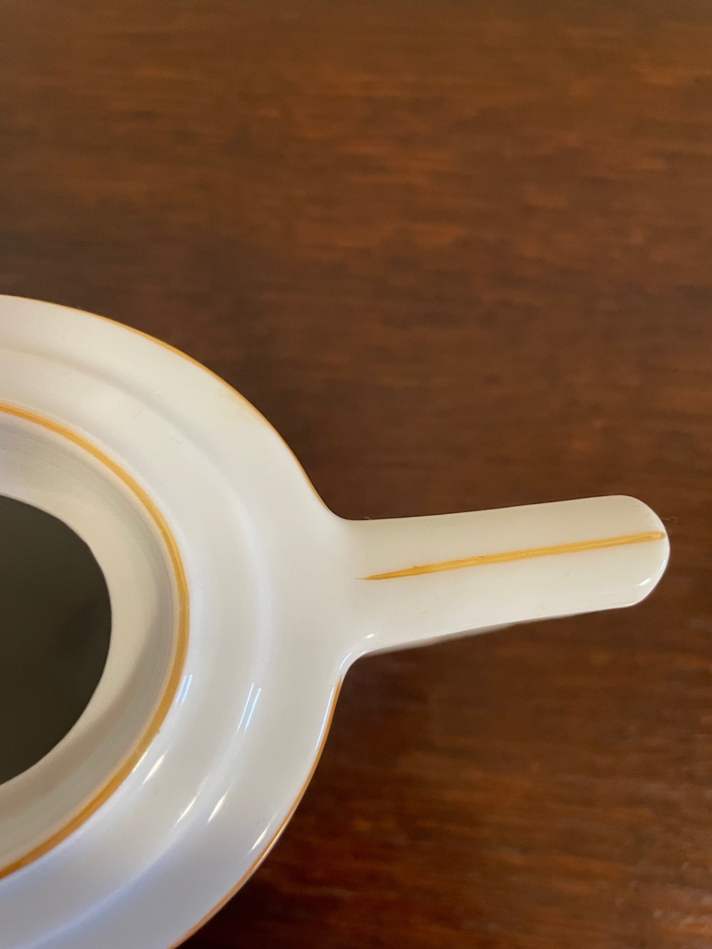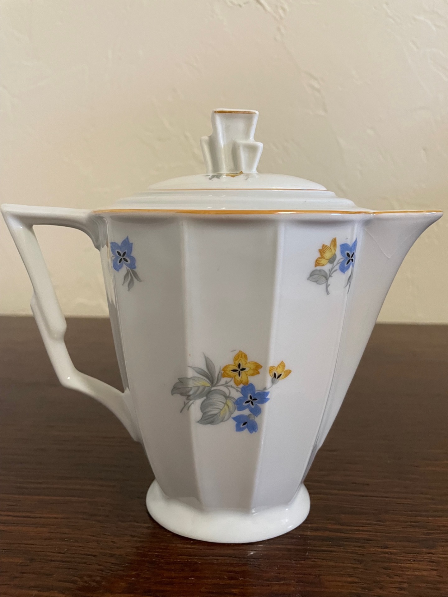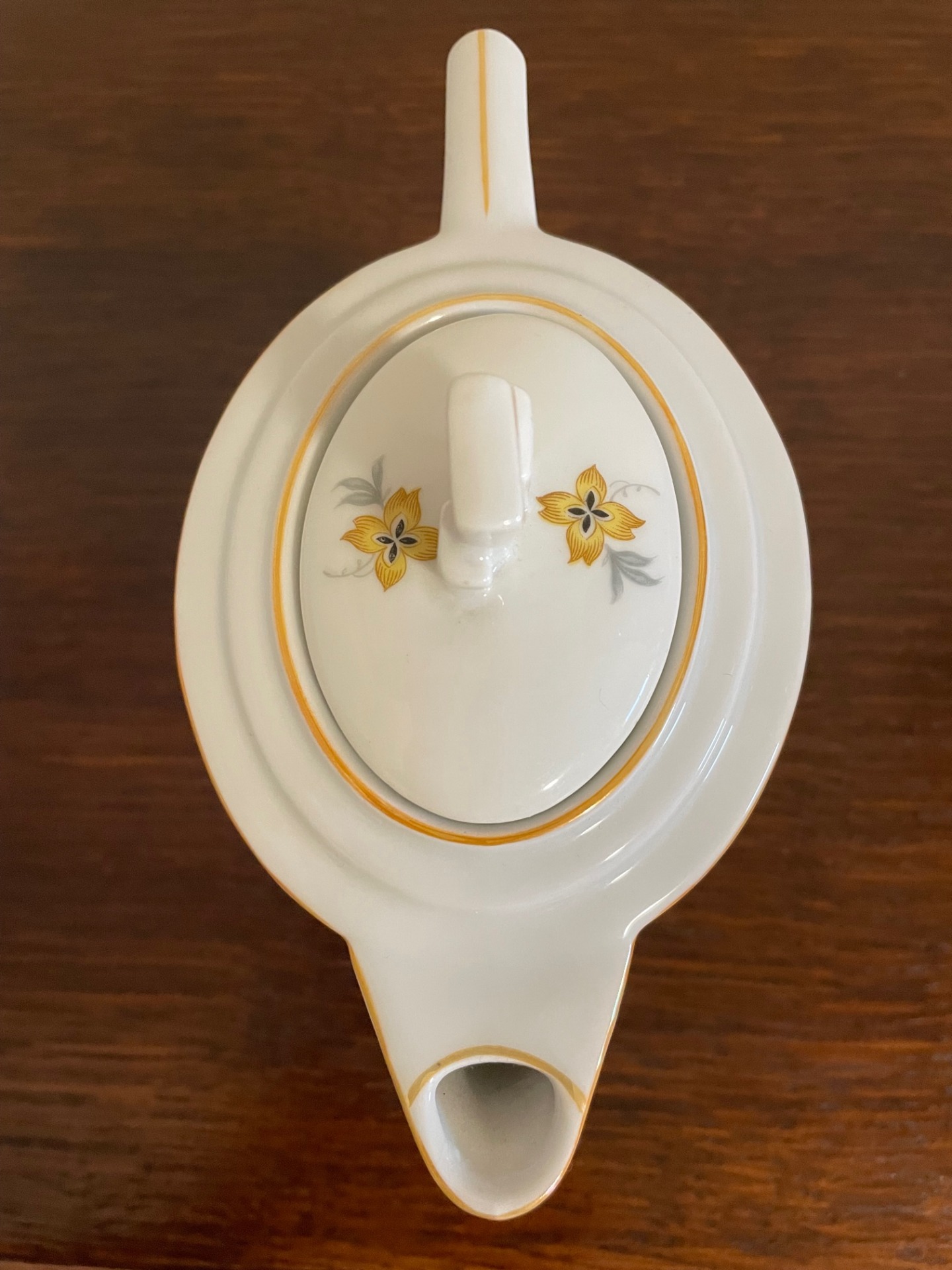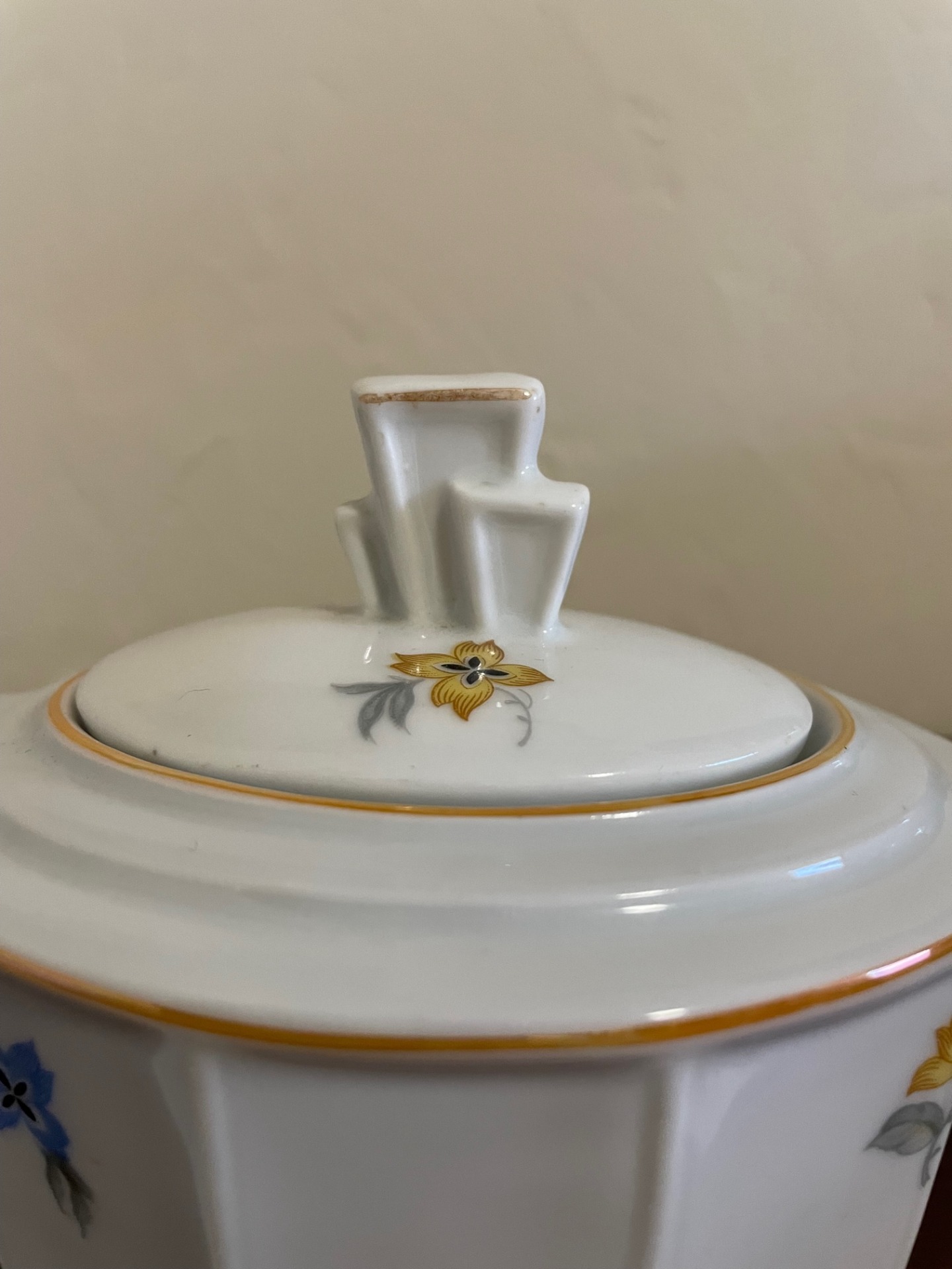 Art Decora jellemző forma, különleges fül és fedőfogó megoldással, kék-sárga apró virágokkal. A sárga dekorcsík a fül felső részén, és a kanna felső peremén végigfut.