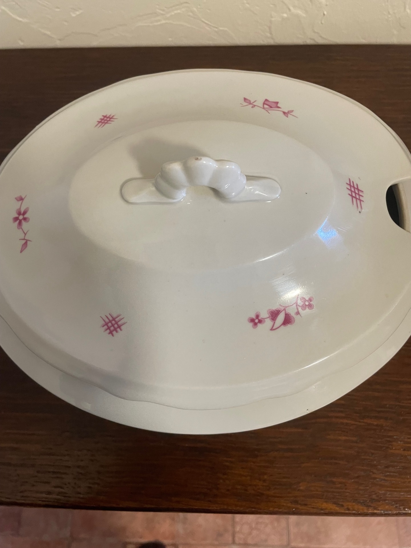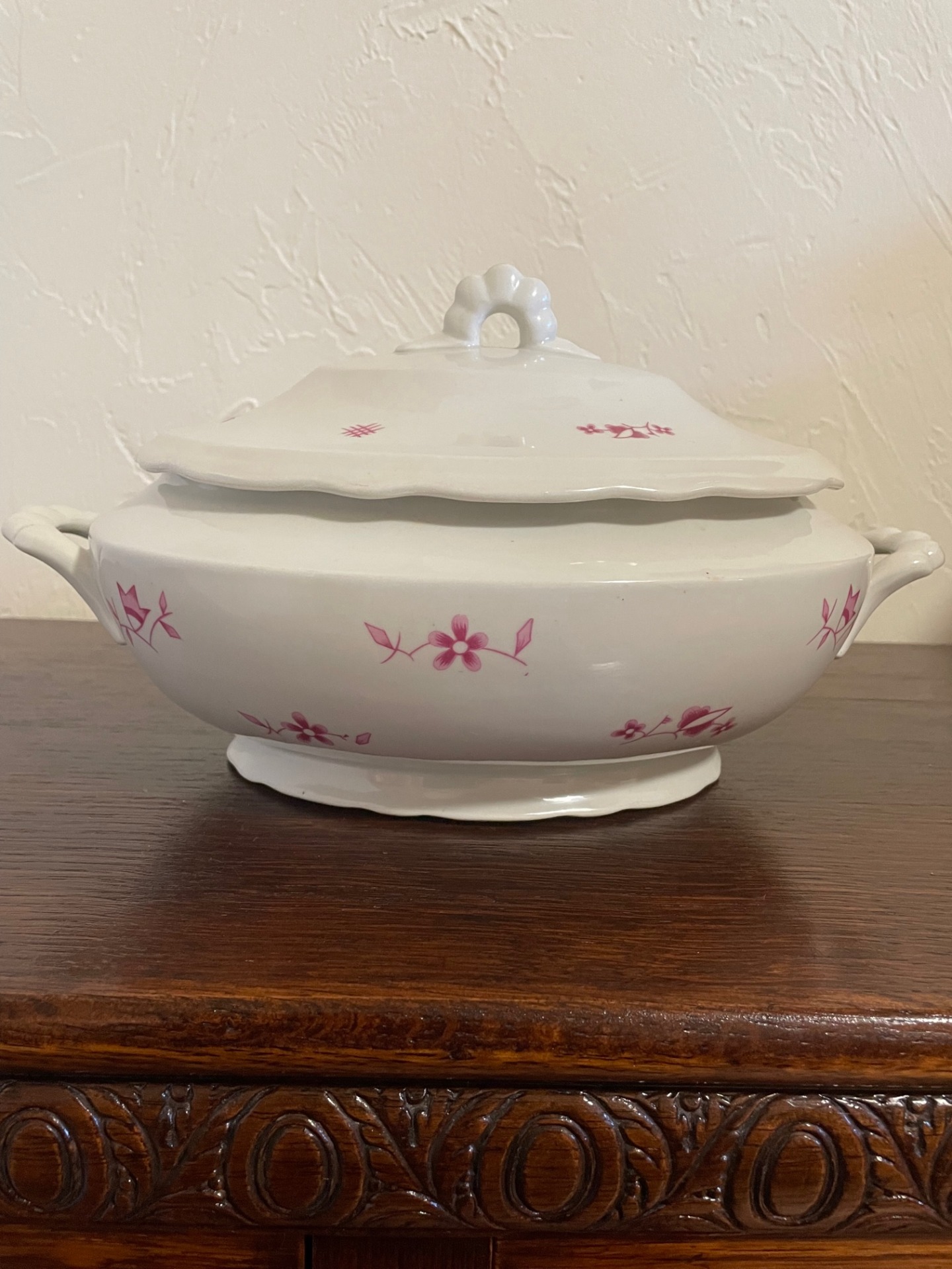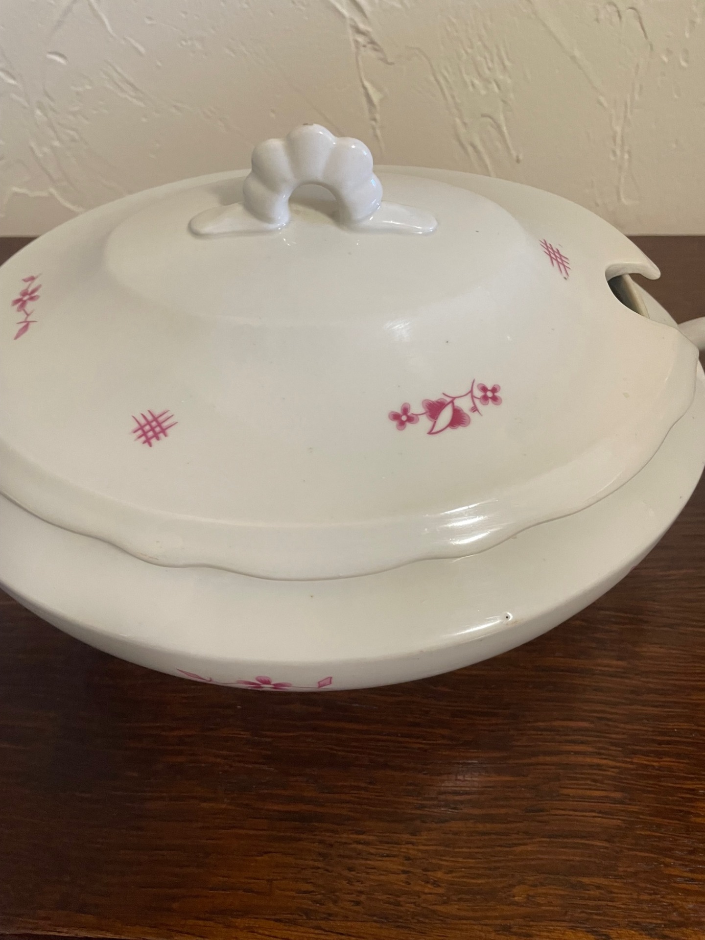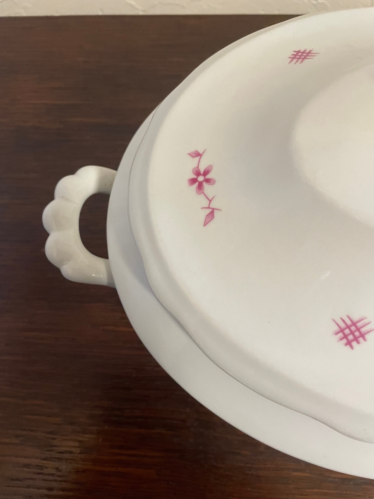Kis, pirosas-rózsaszín virágokkal díszített, Zsolnay leves tál az 50 -es évekből.