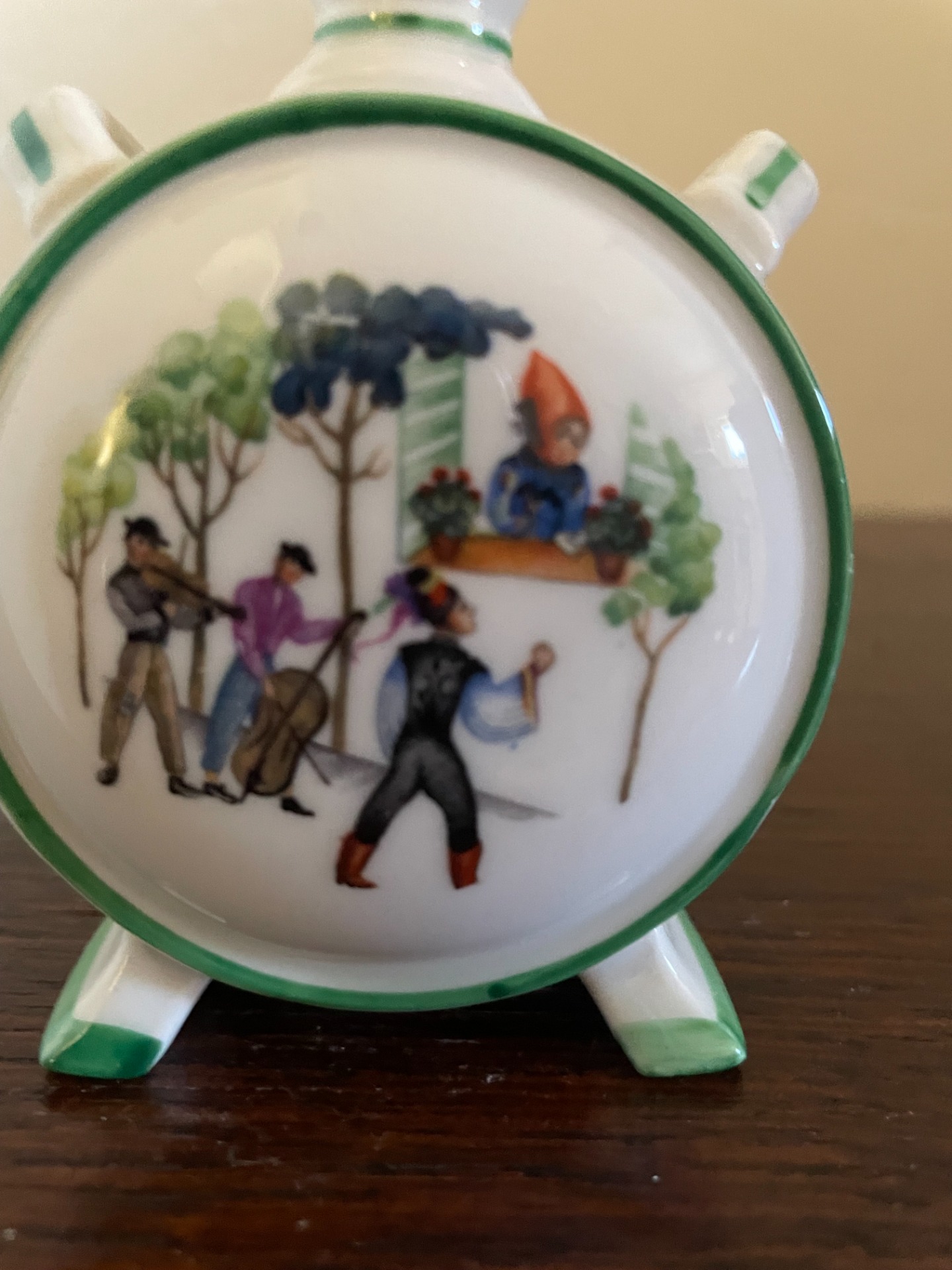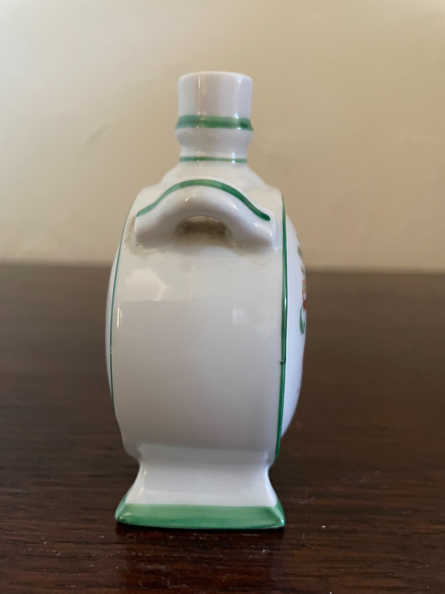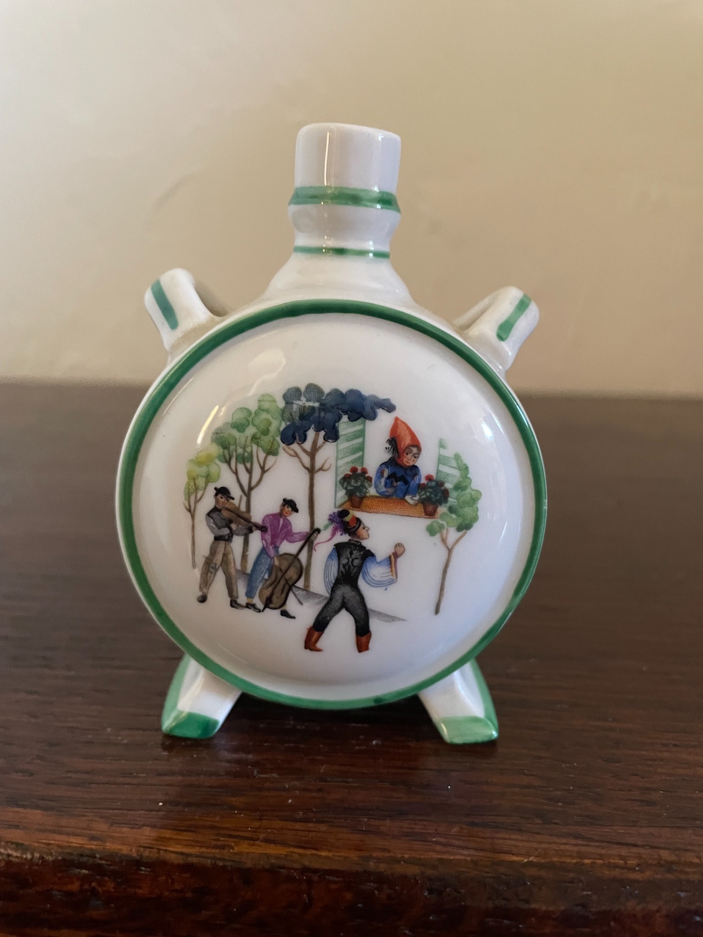 Egyik oldalán szernádos jelent, másik oldalán népi motívum látható ezen a Zsolnay mini-butellán.