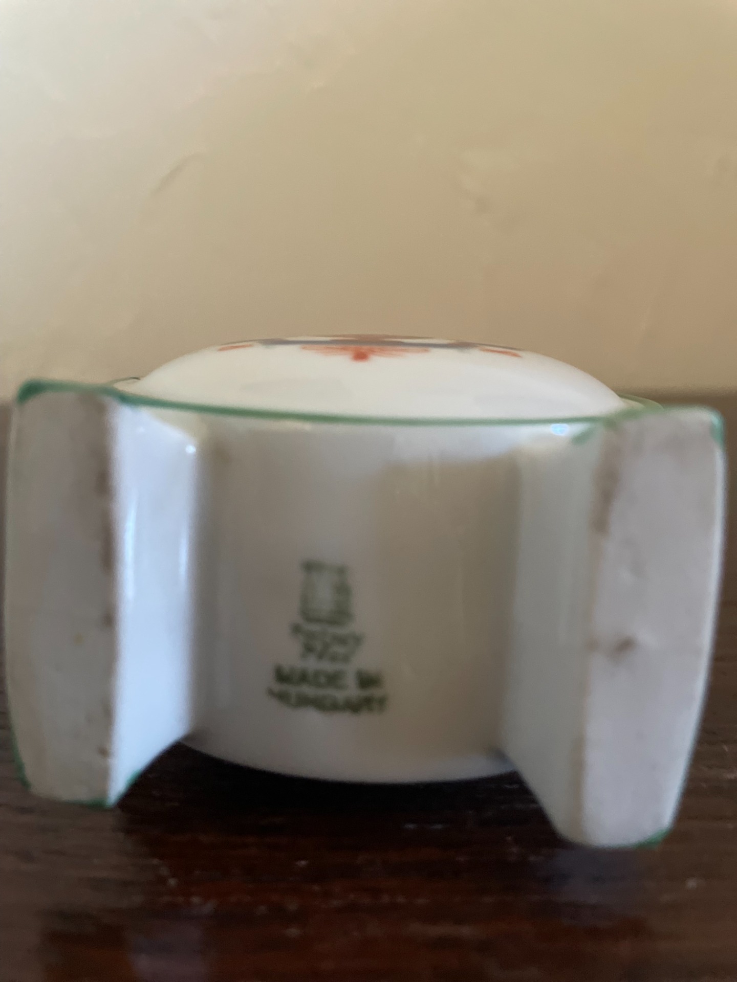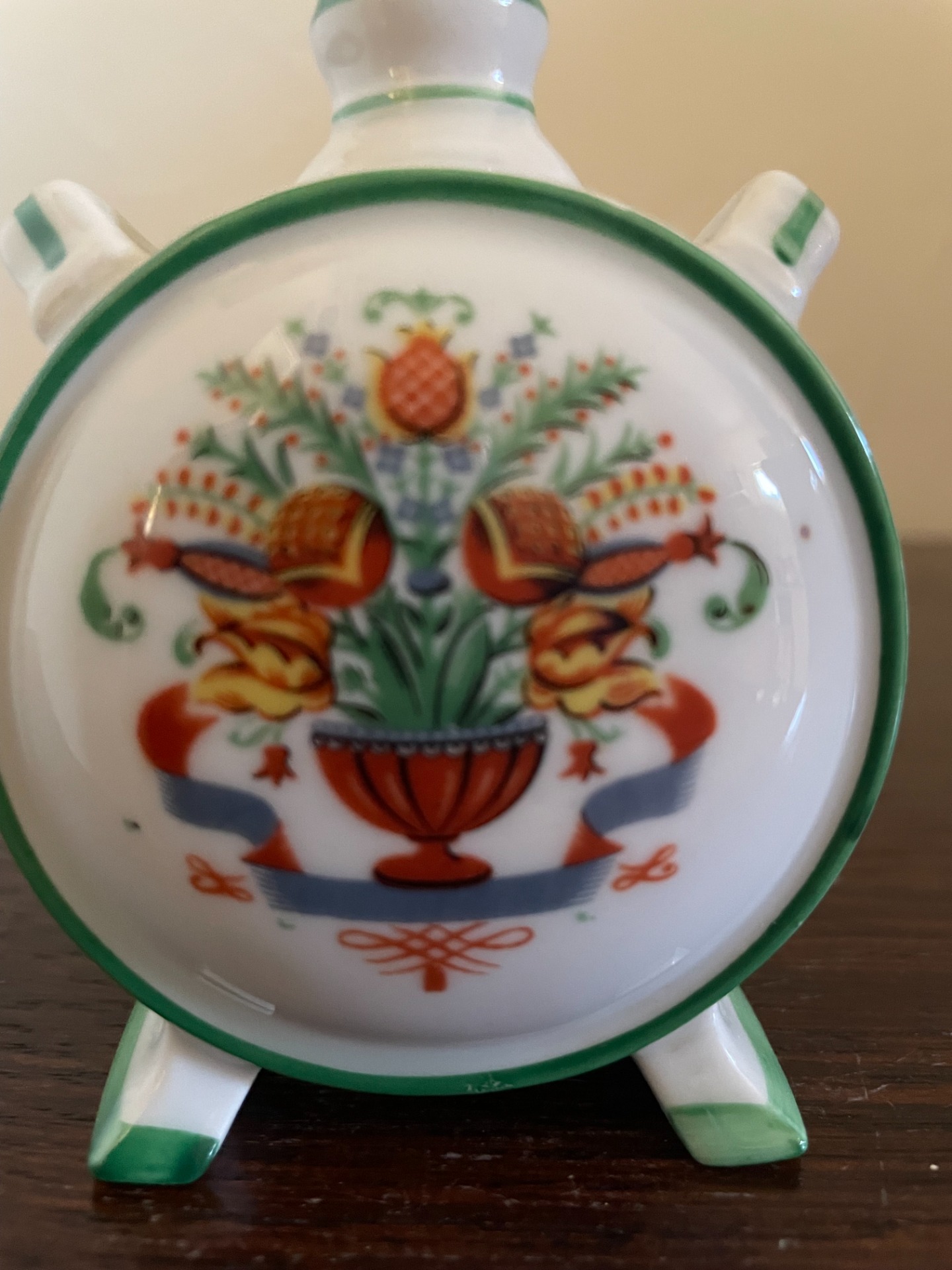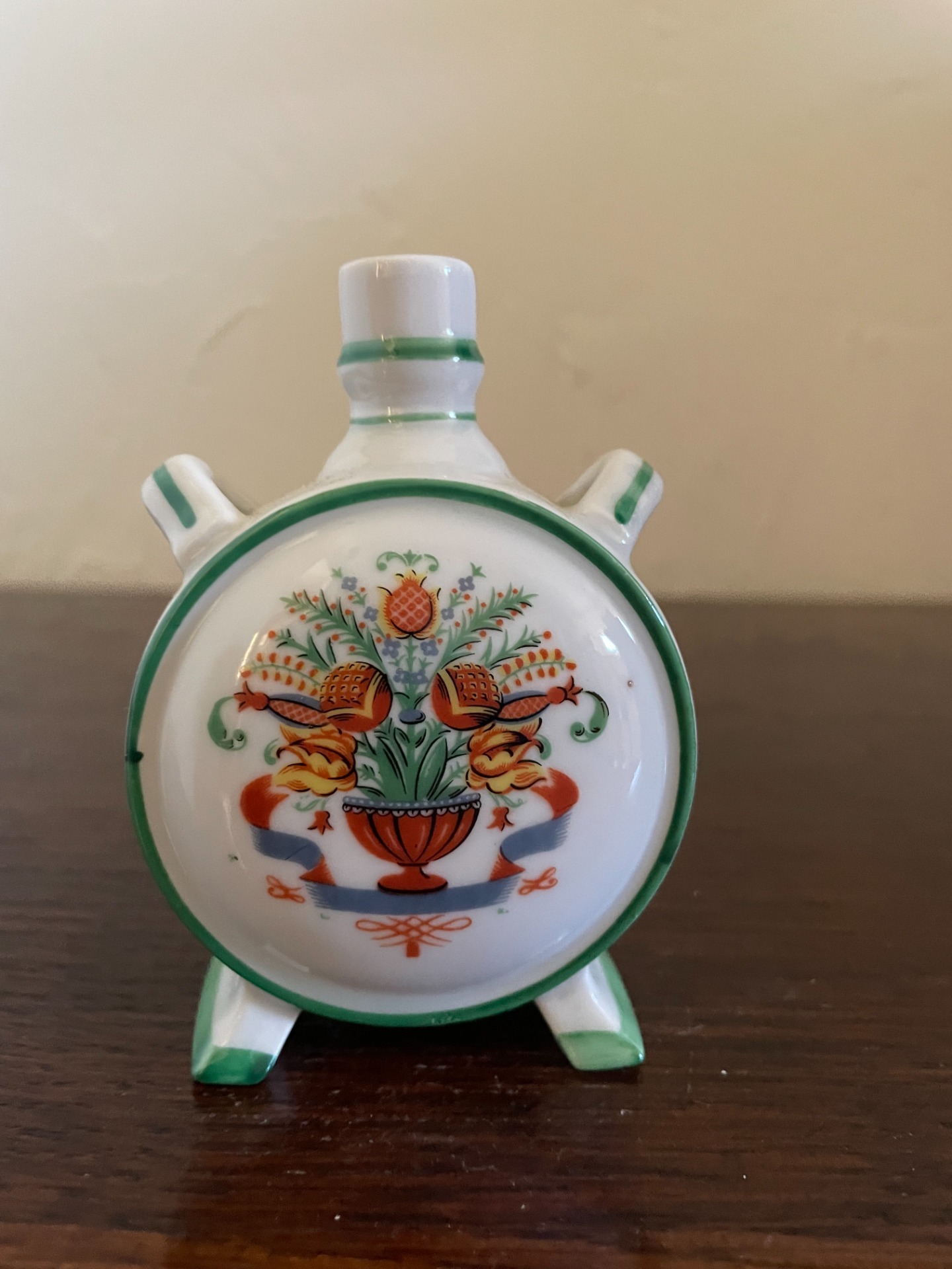 Egyik oldalán szernádos jelent, másik oldalán népi motívum látható ezen a Zsolnay mini-butellán.